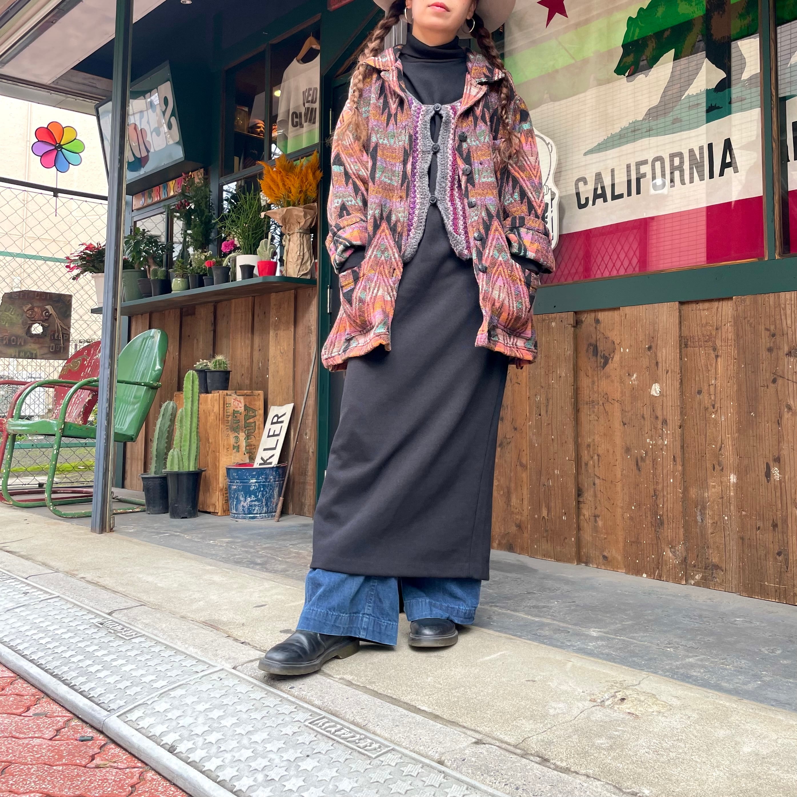 割とコンパクトめなサイズ感でバランスの取りやすい一枚です。左右で絶妙な色の違いがあったり、キラッとしたボタンが使われていたりハンドメイド感が良いですね。