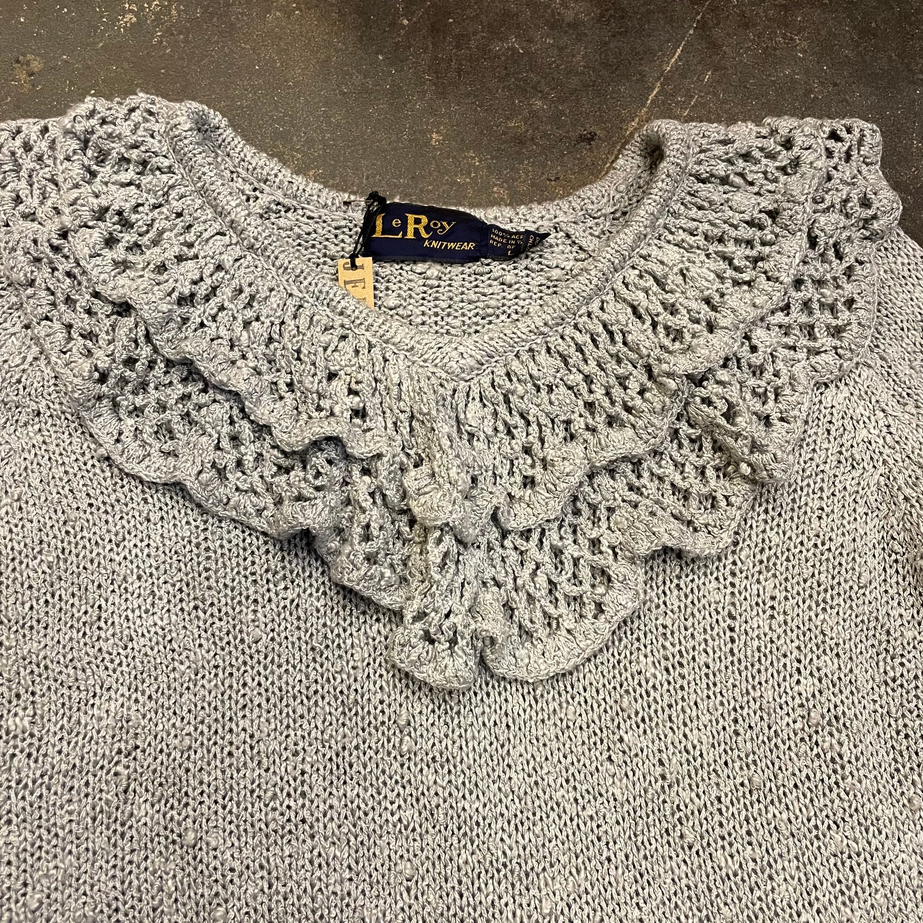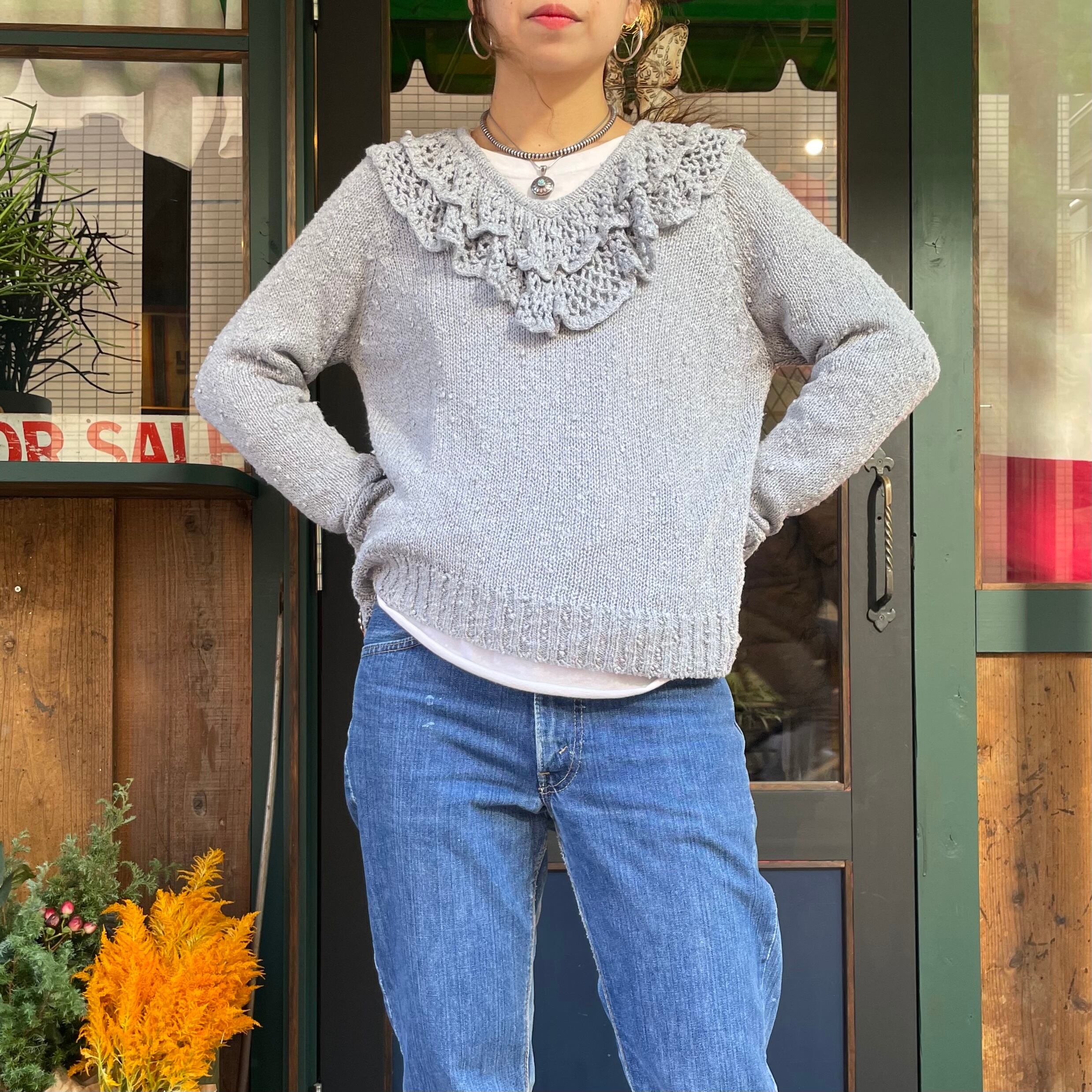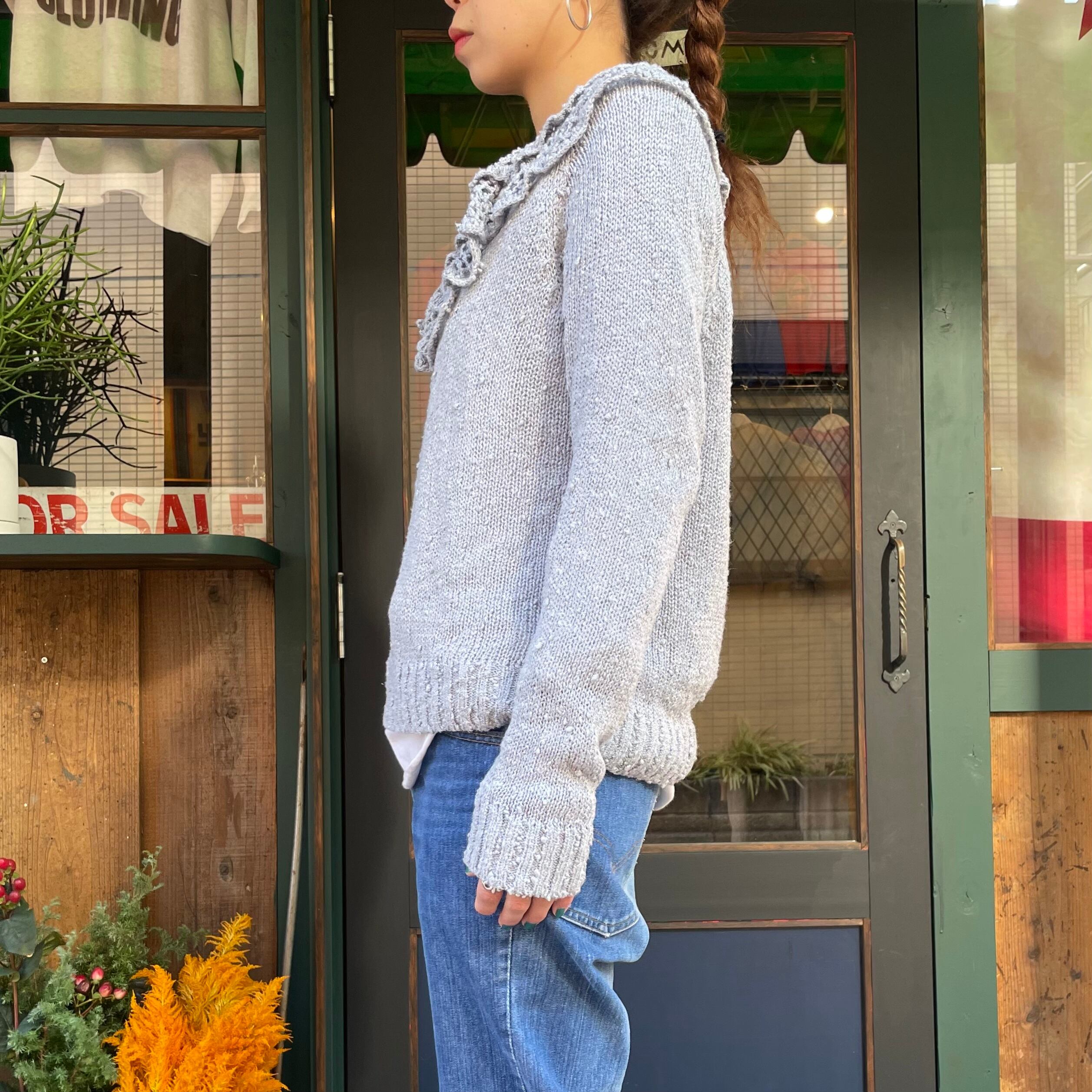 襟ぐりのフリルがかわいいアクリルニットセーターです。