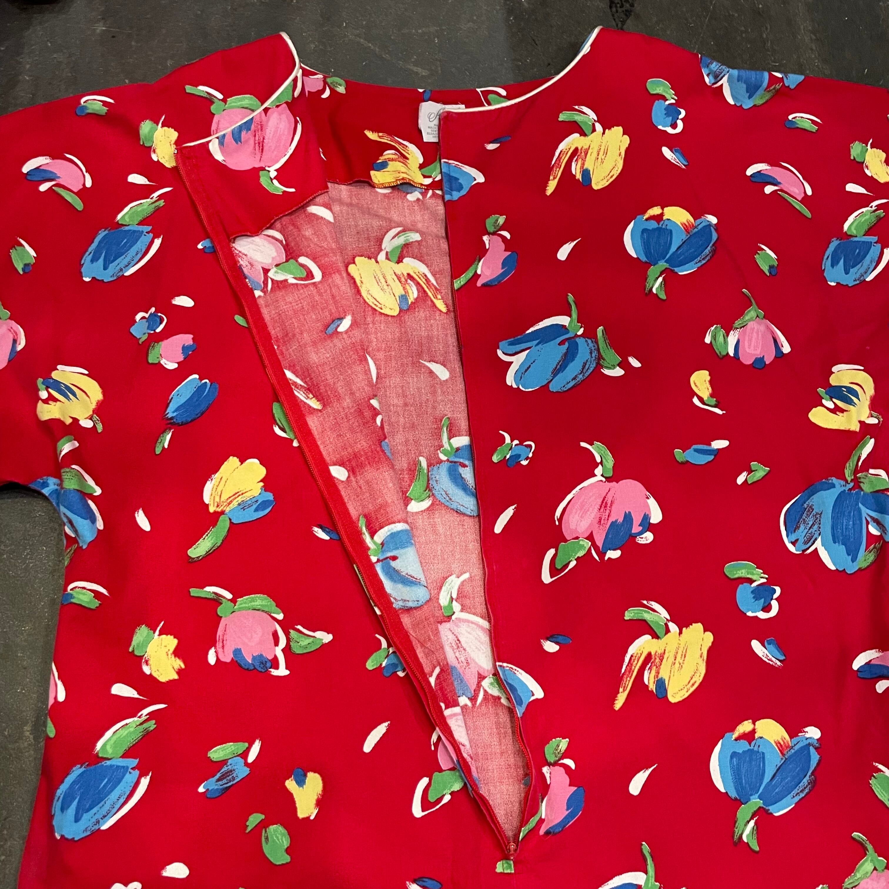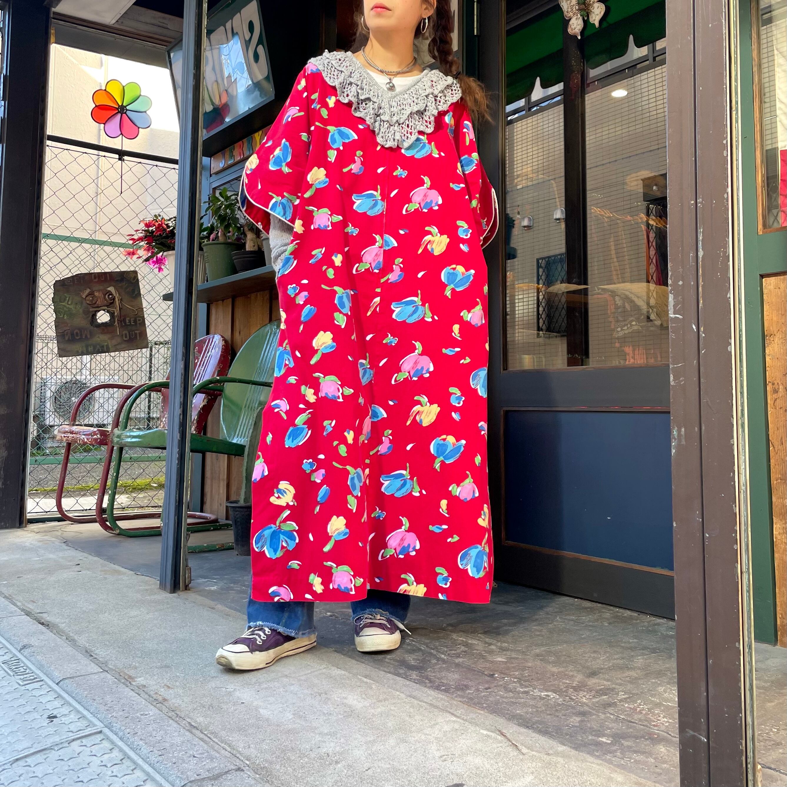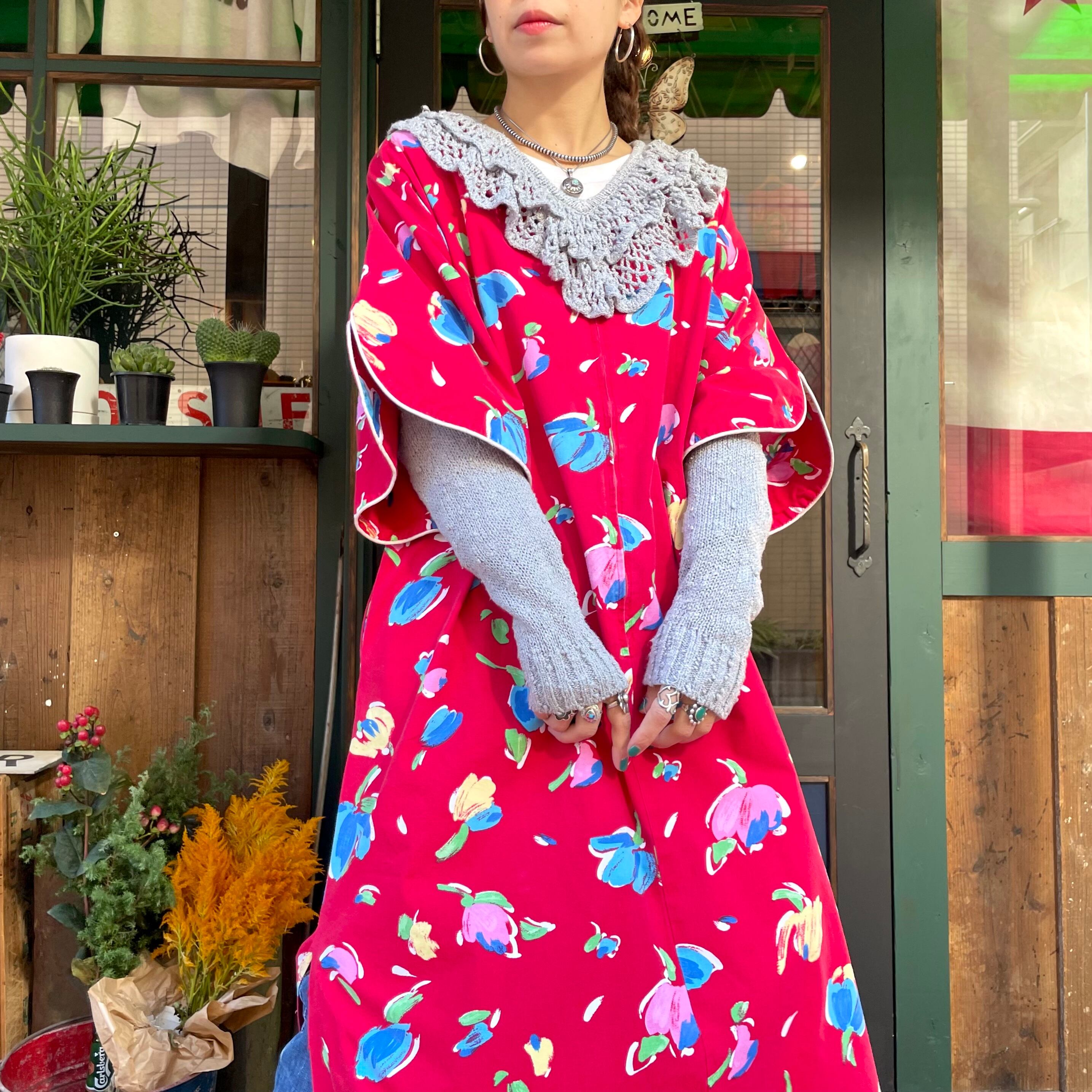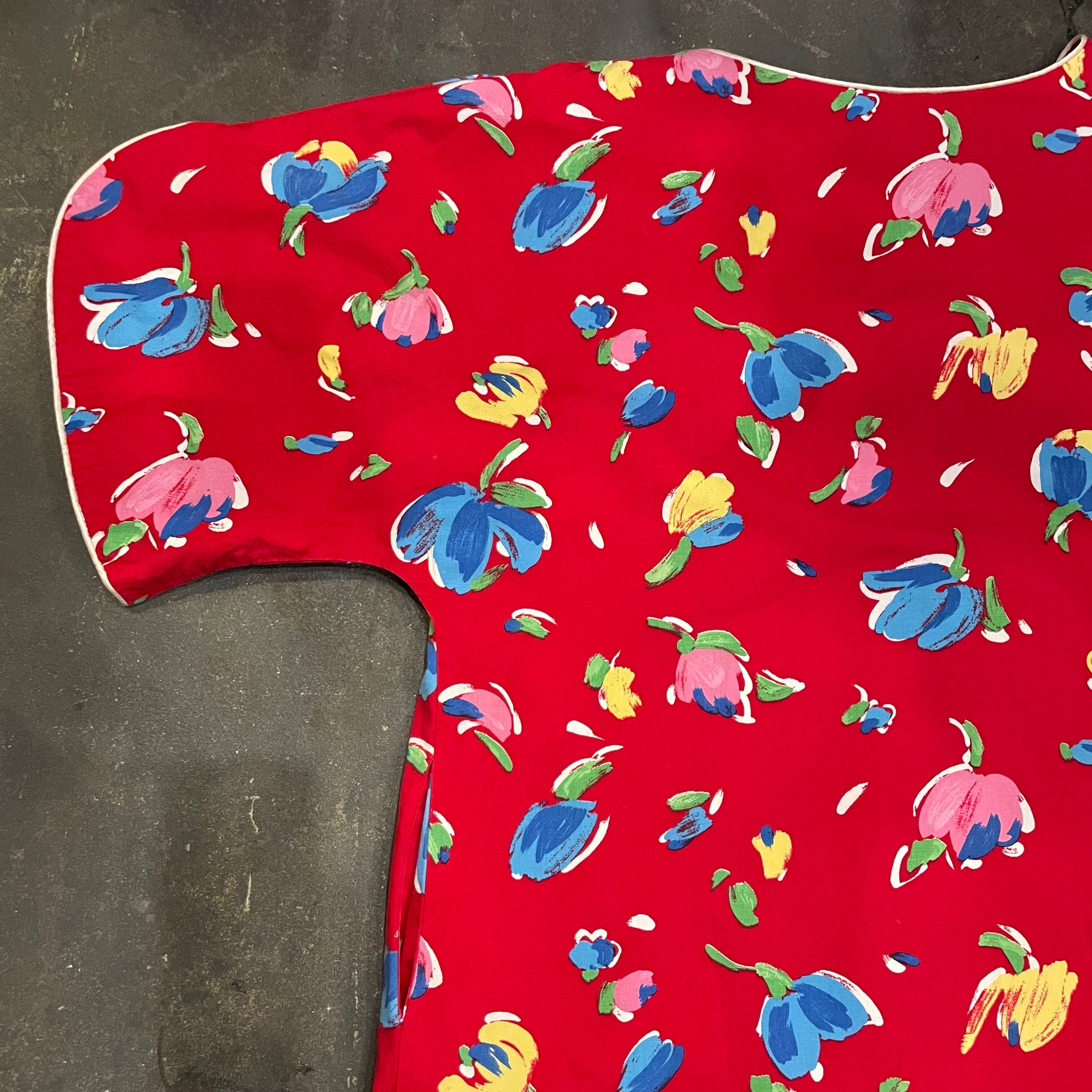 赤地にチューリップのようなお花の柄がかわいいワンピースです。