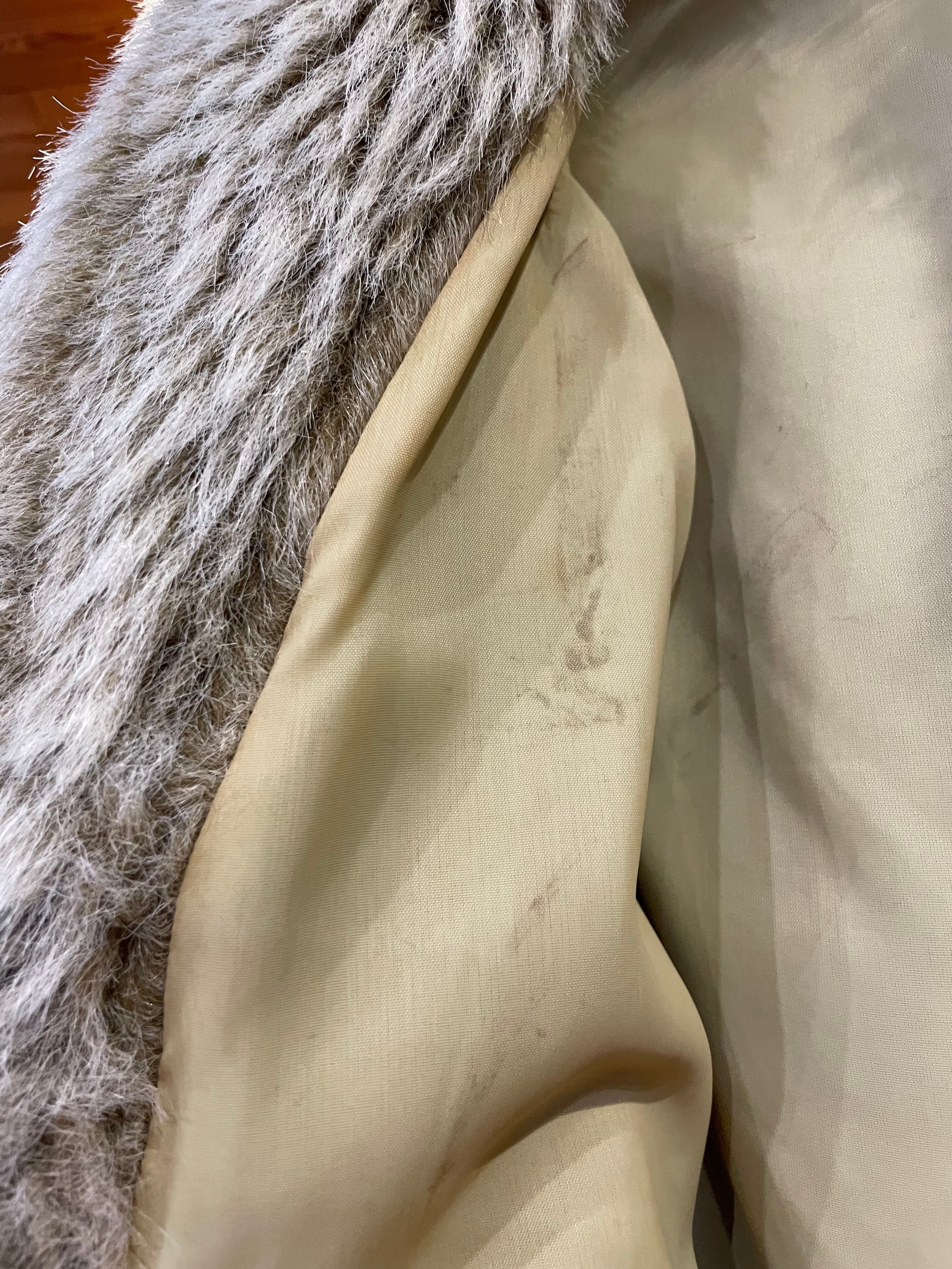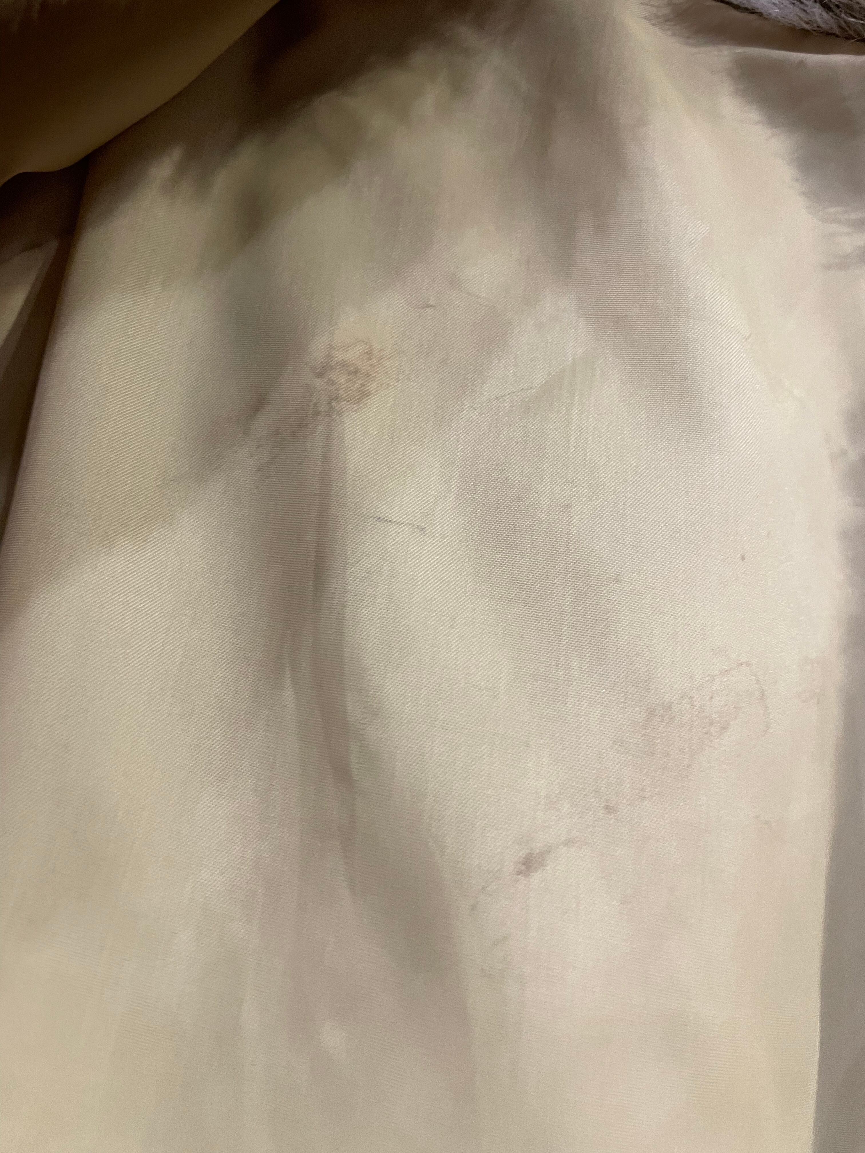 裏地に傷やシミがございます。表地に目立った傷や汚れは見受けられませんが、毛の寝ている箇所や擦れ等使用感のある商品です。