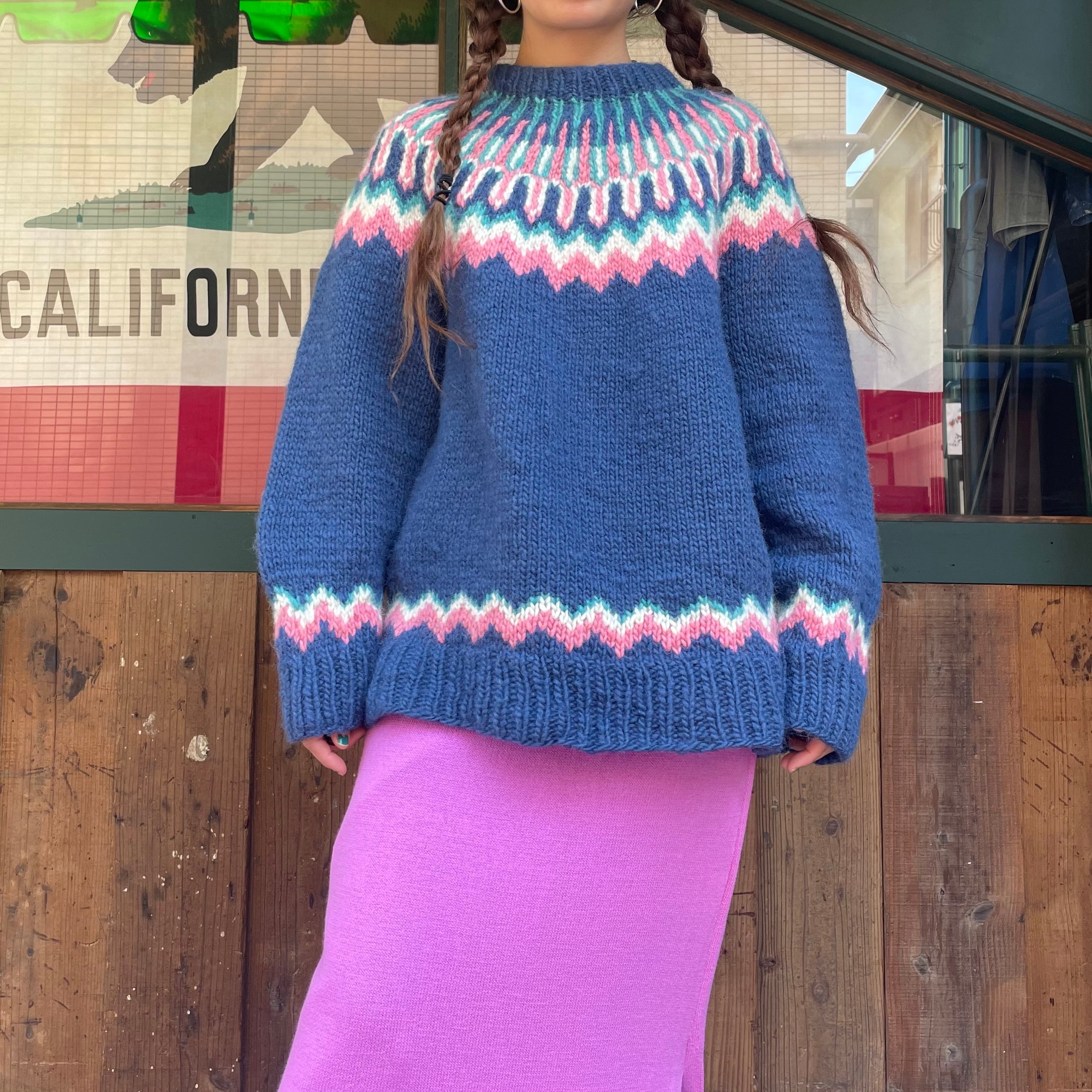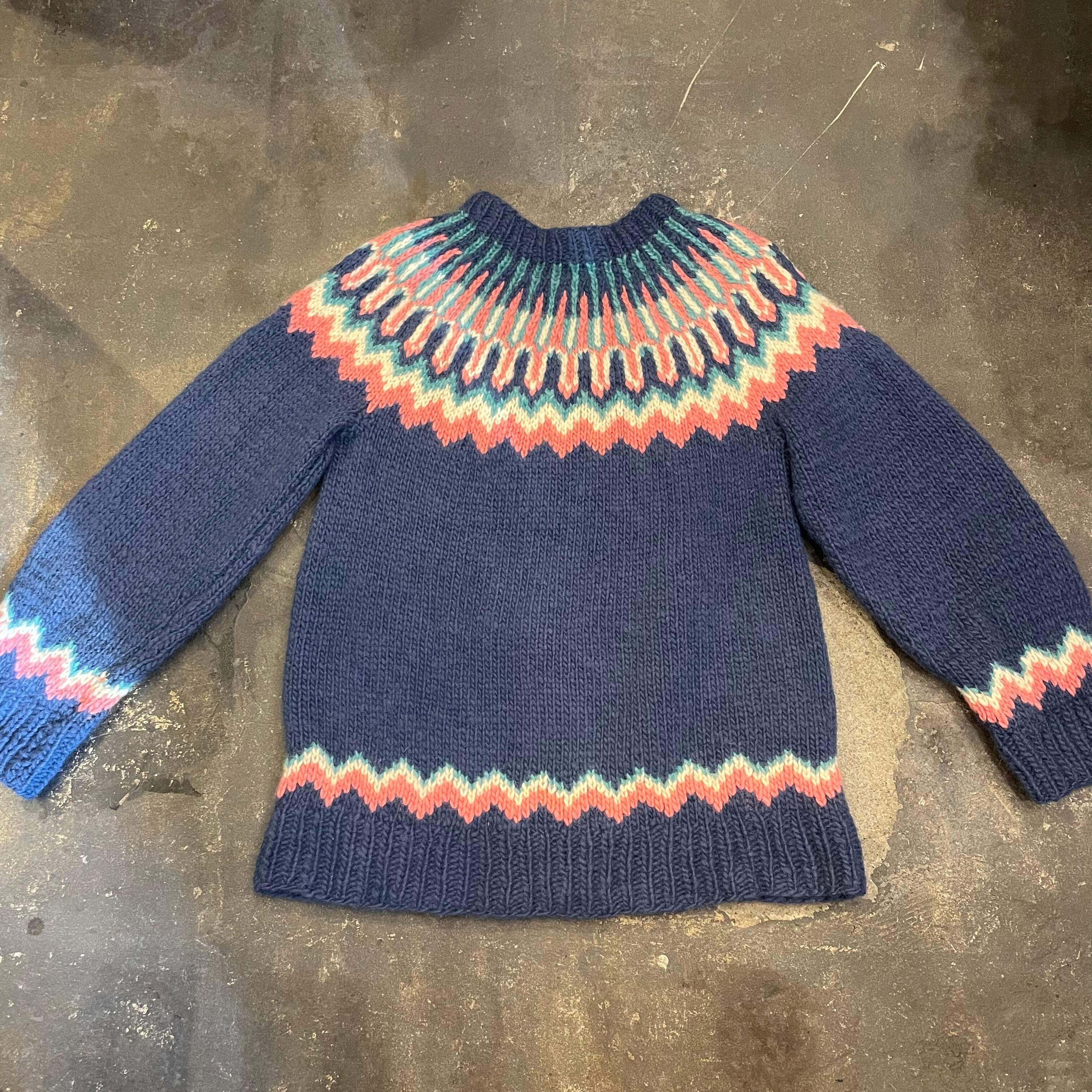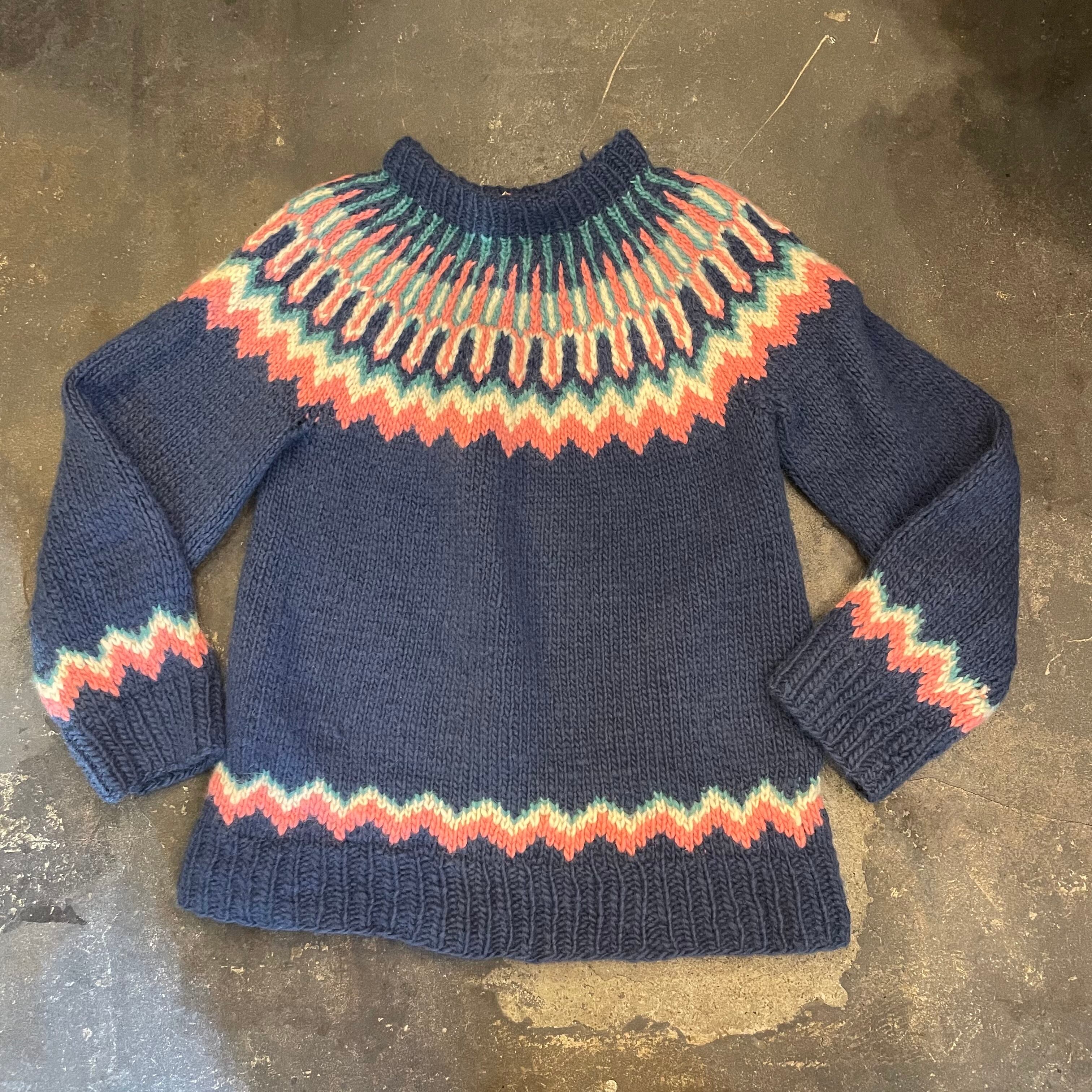 ノルディックな雰囲気の模様がかわいい手編みのセーターです。