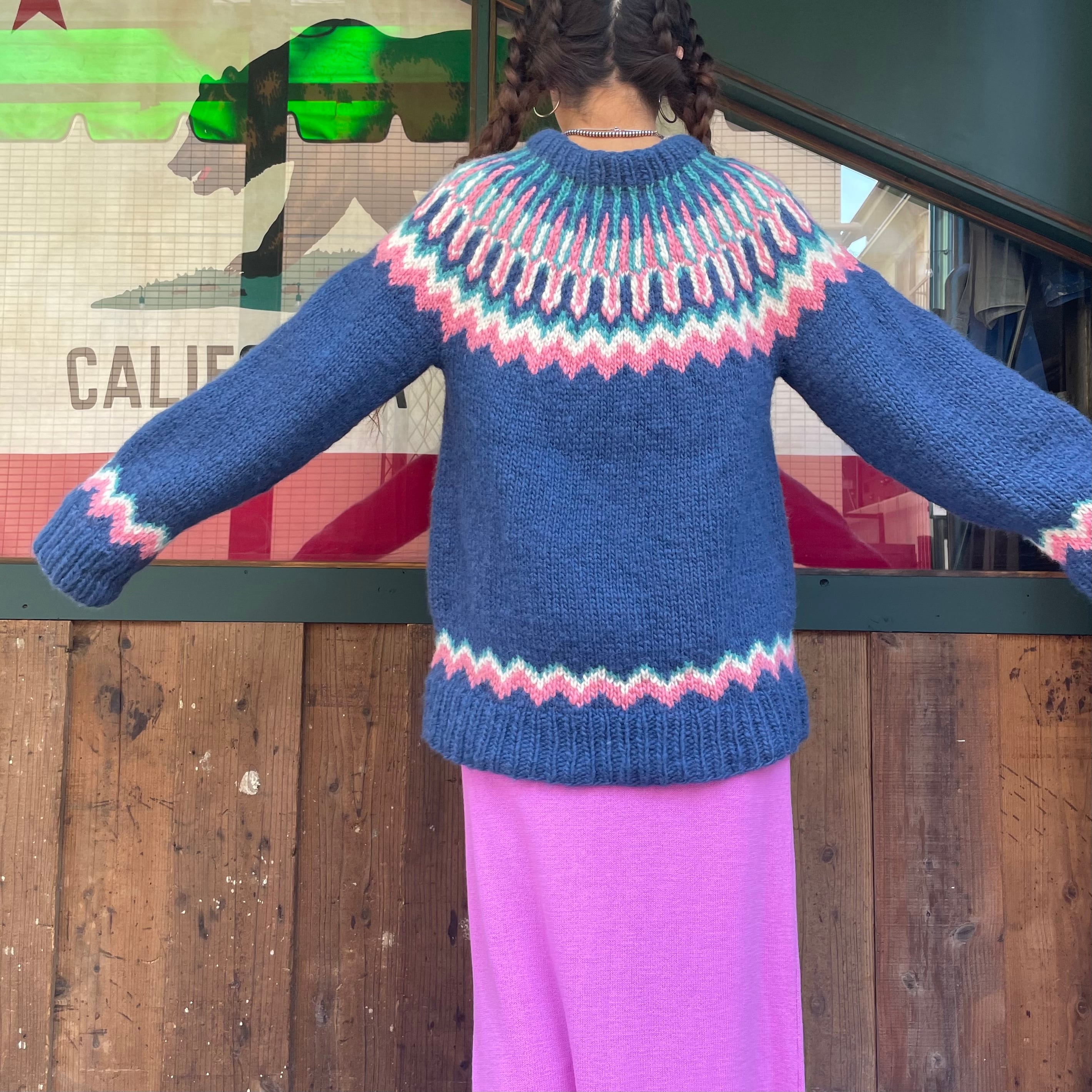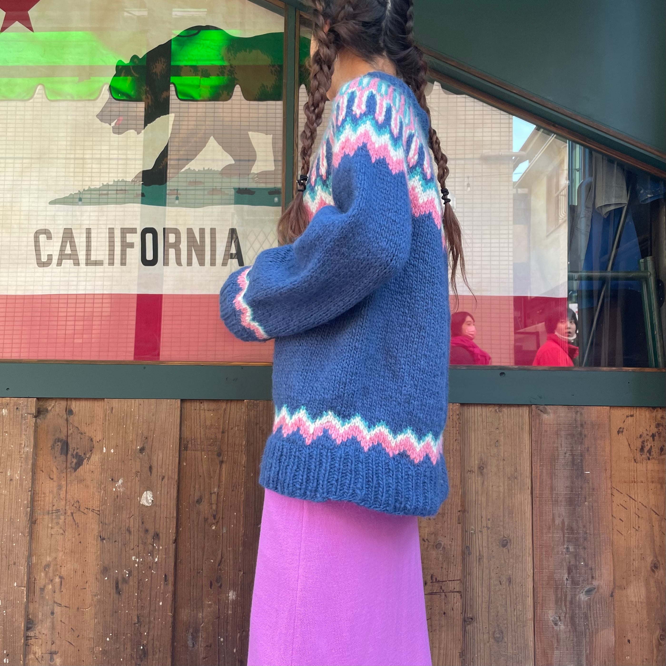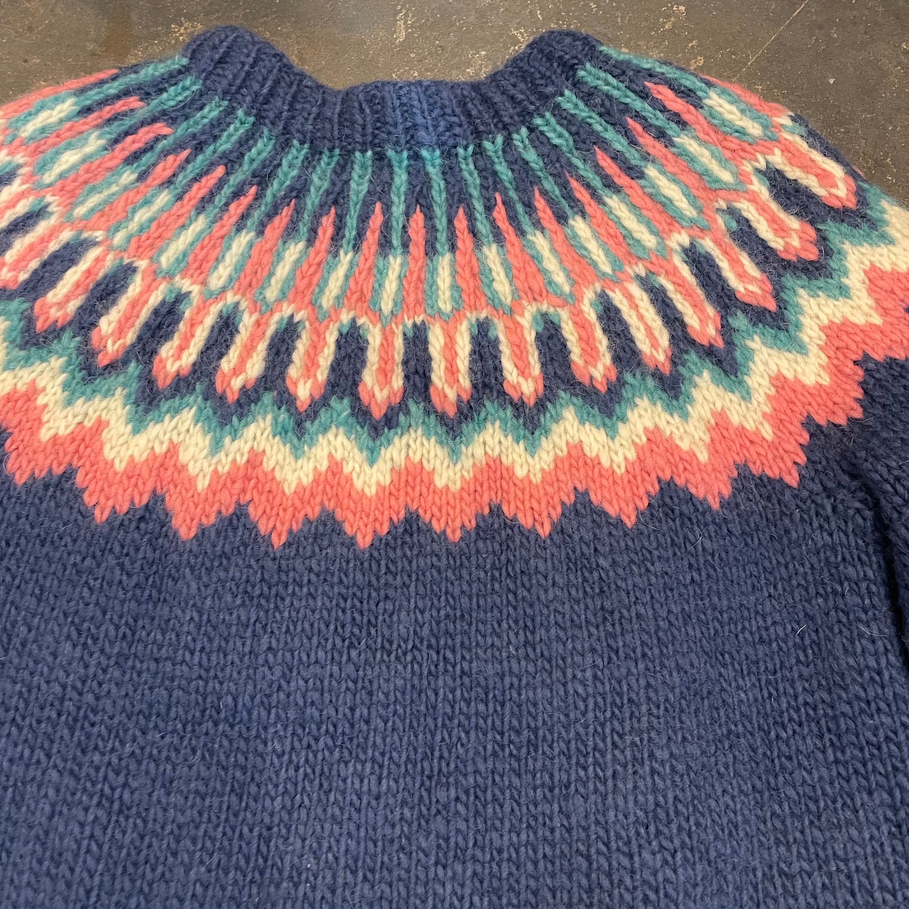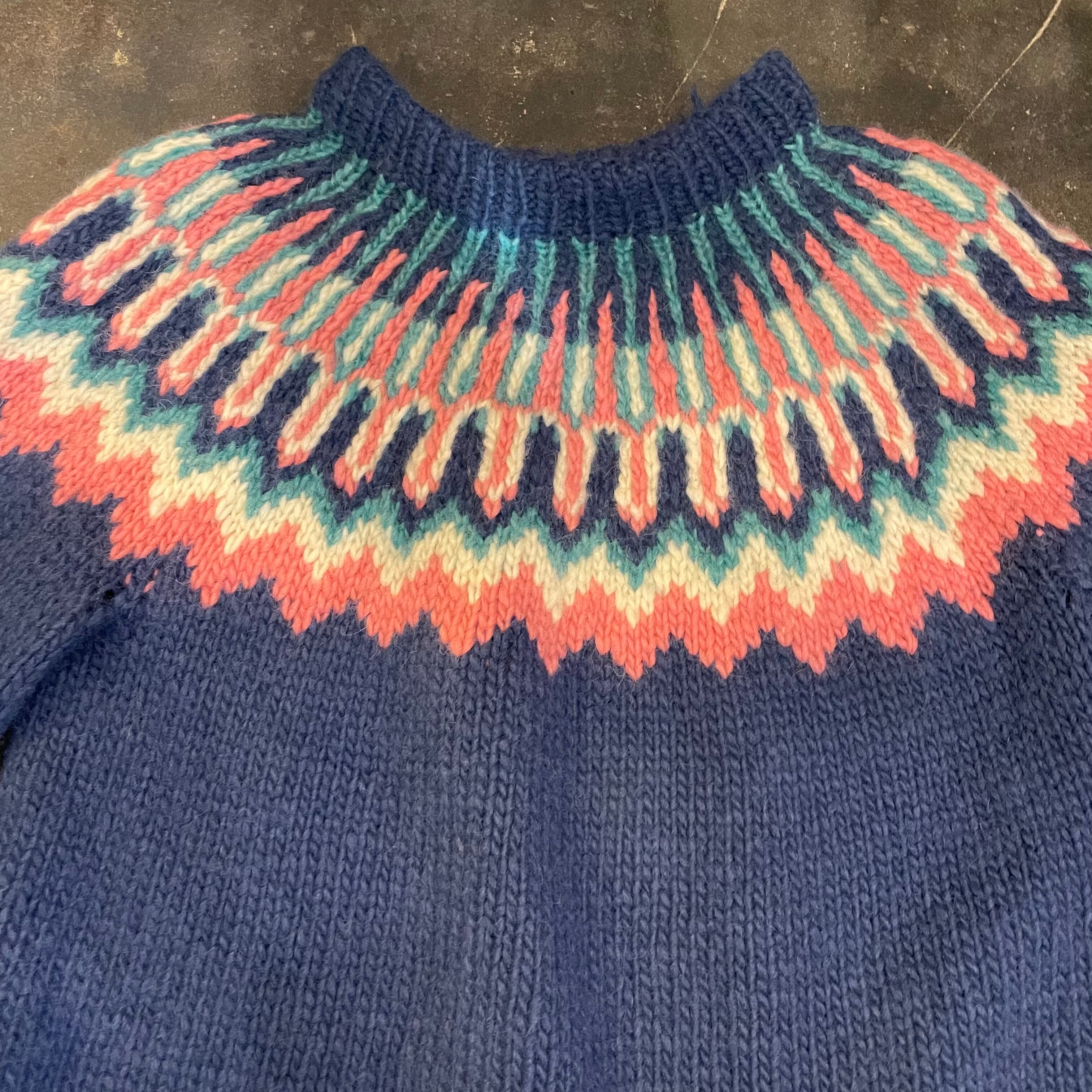 ノルディックな雰囲気の模様がかわいい手編みのセーターです。