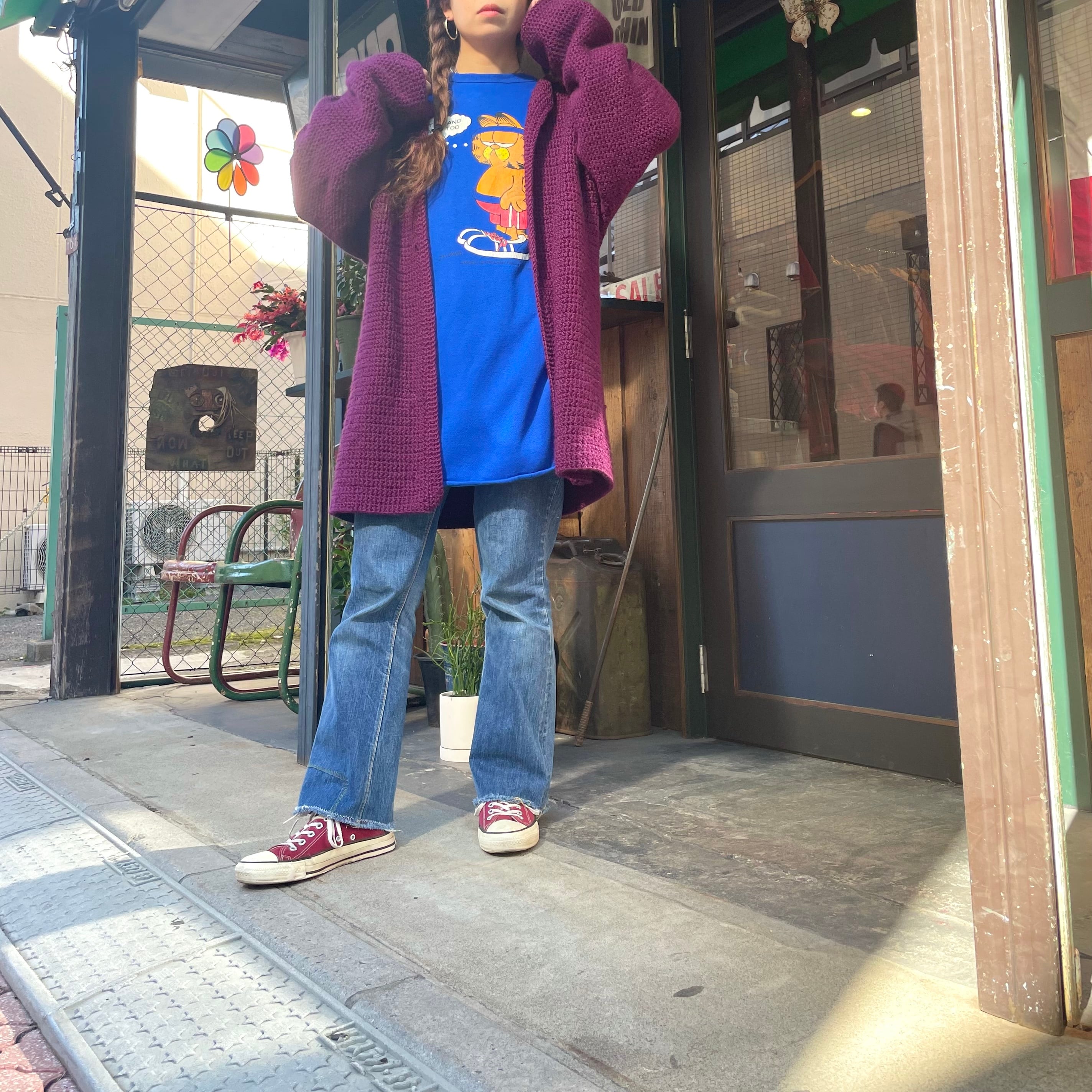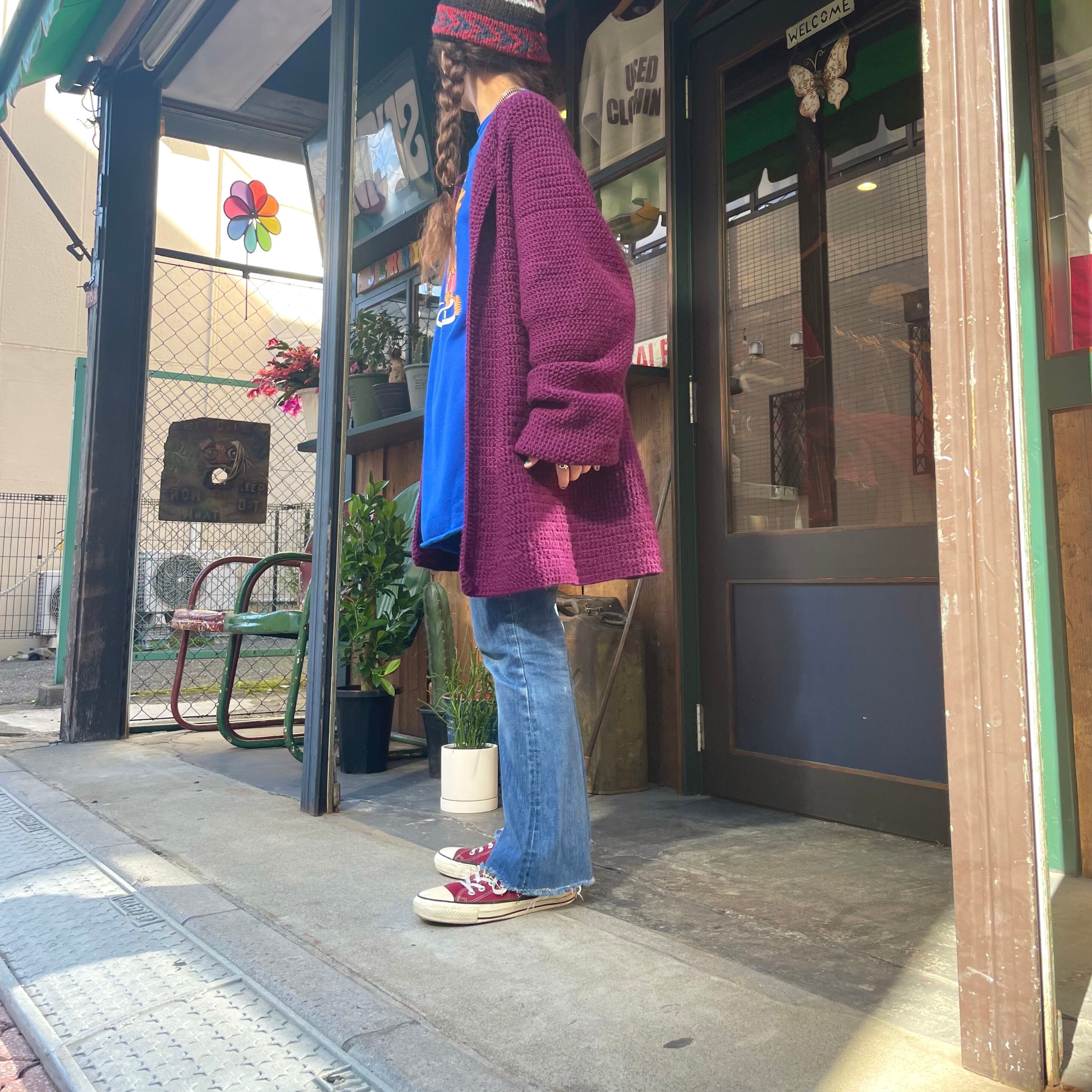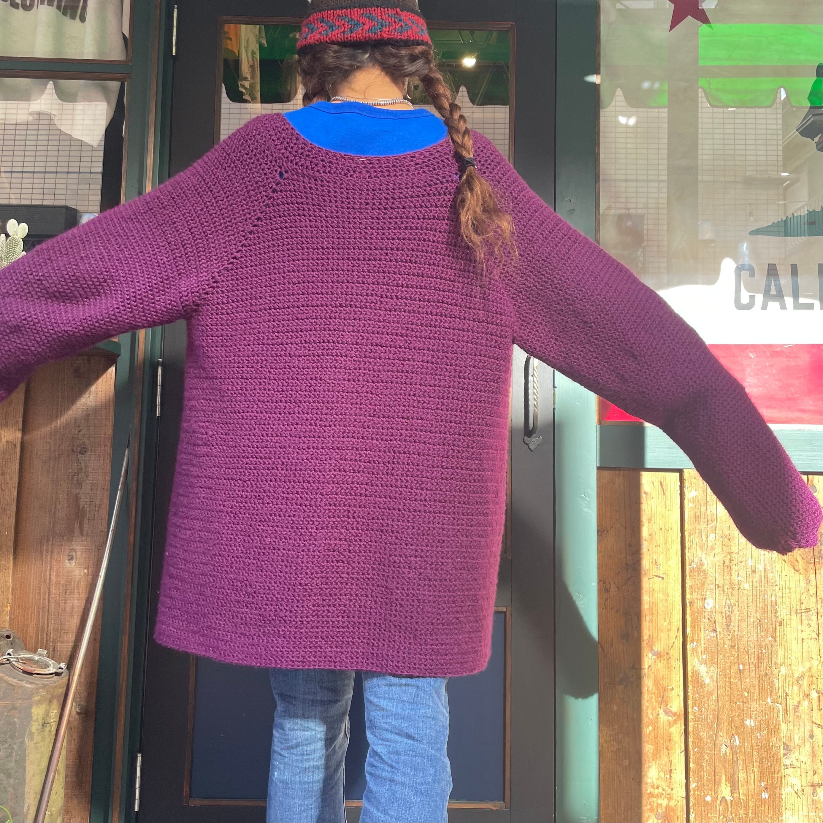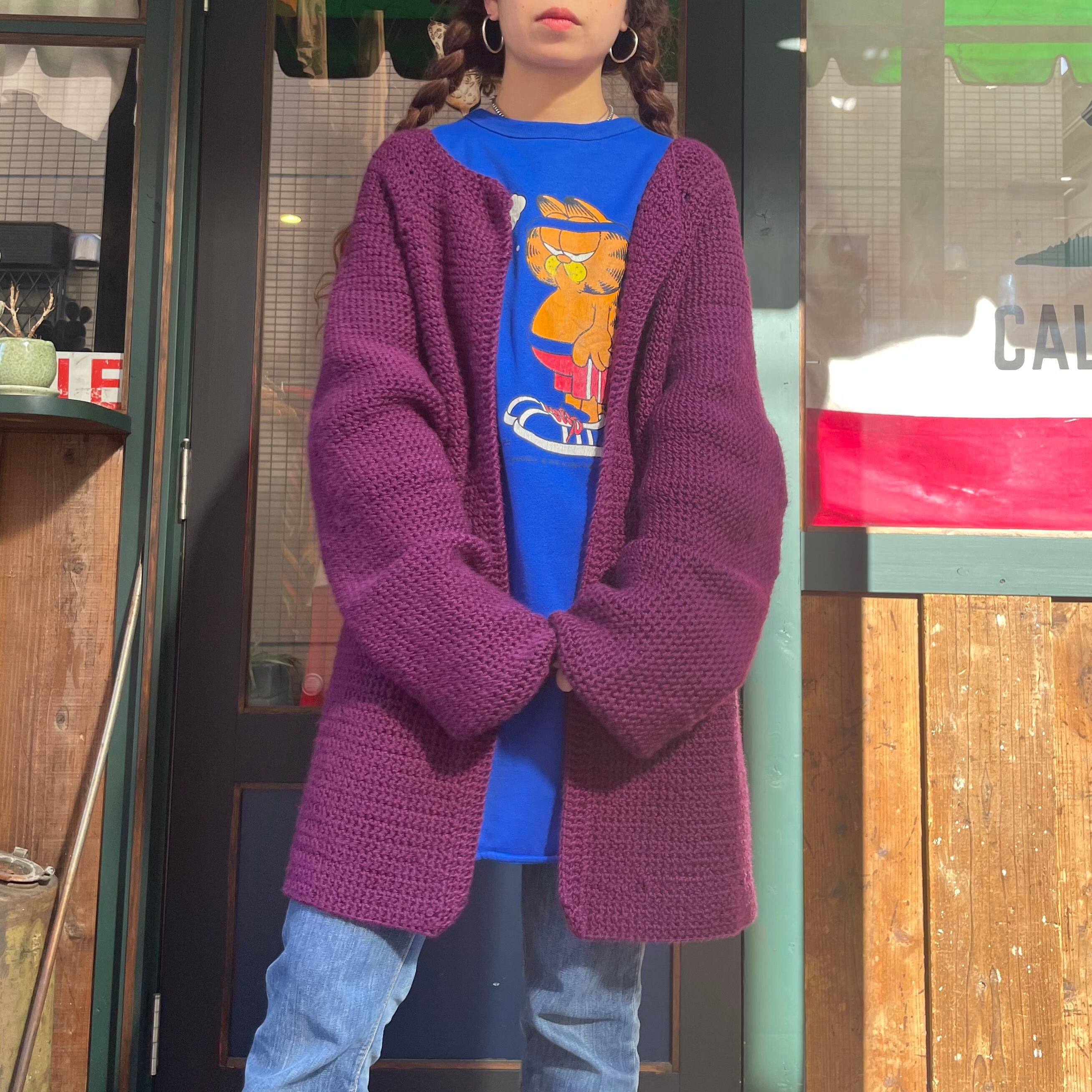 深い紫色のかなり大きいサイズ感がかわいいカーディガンです。