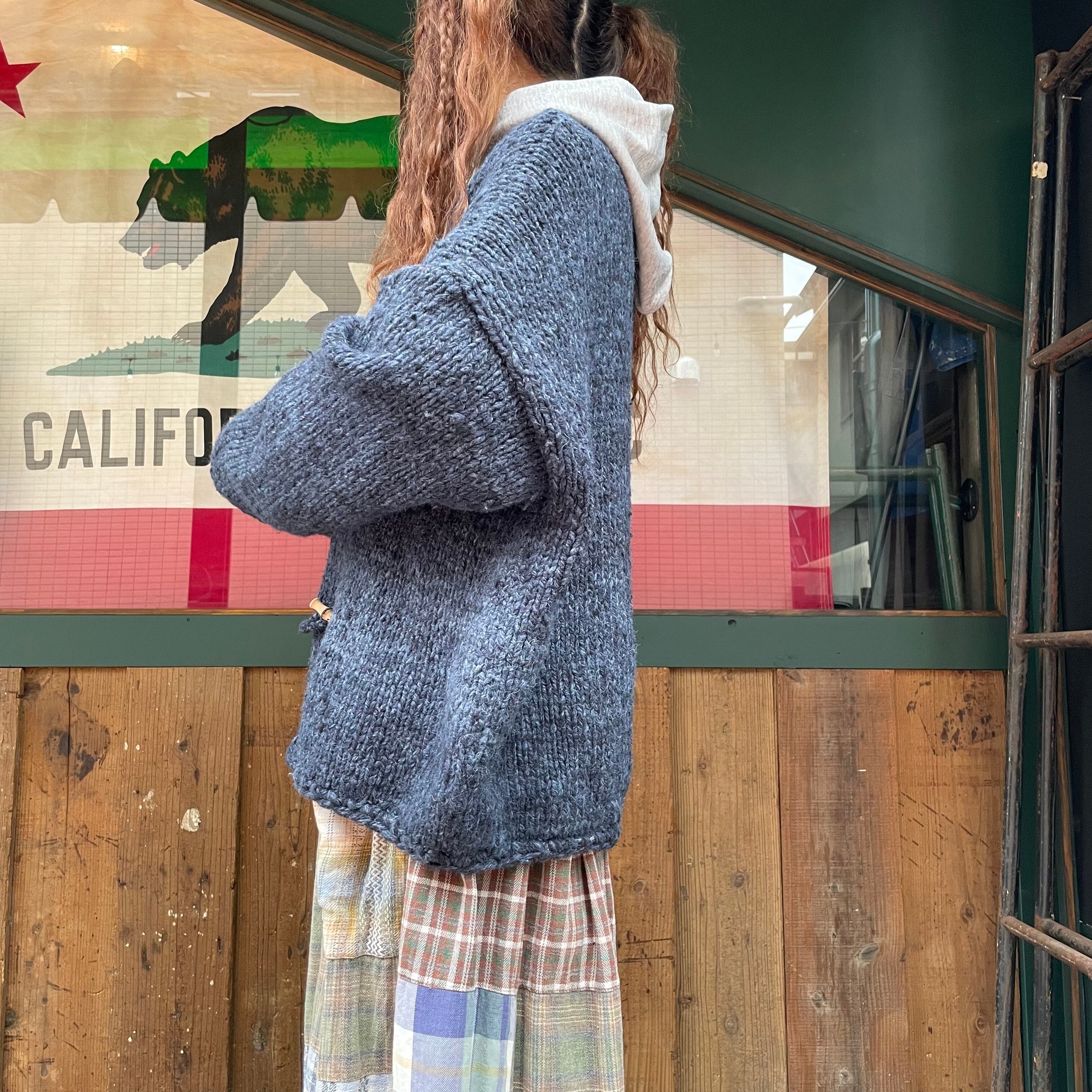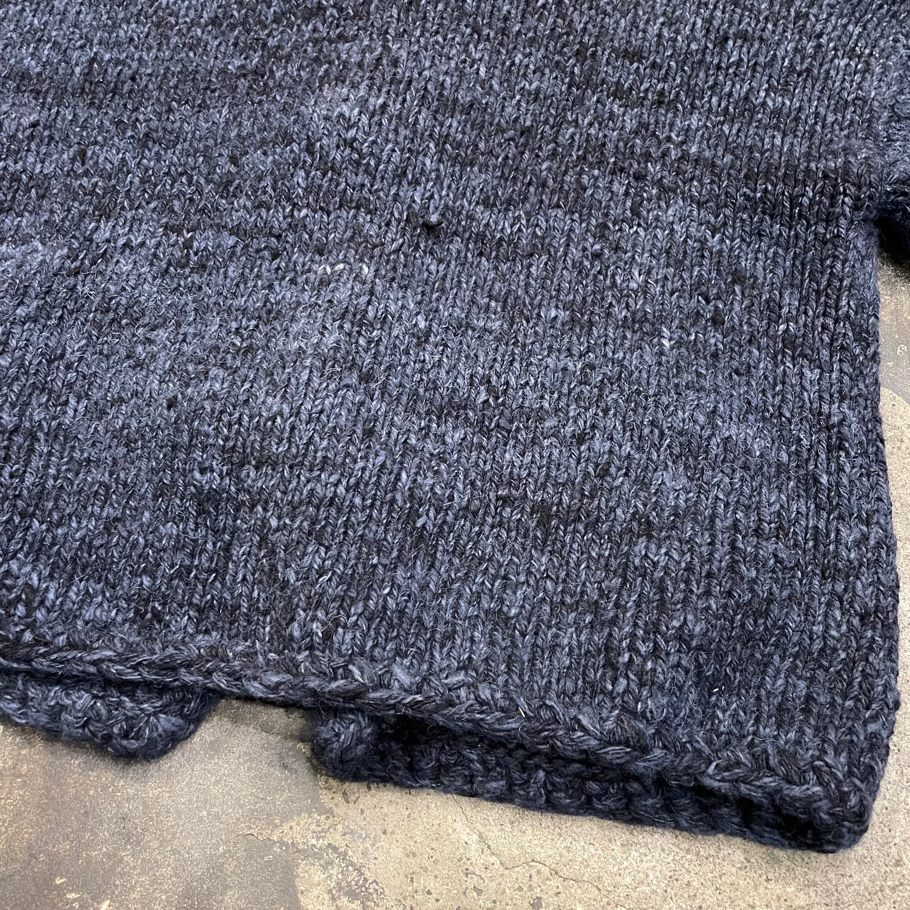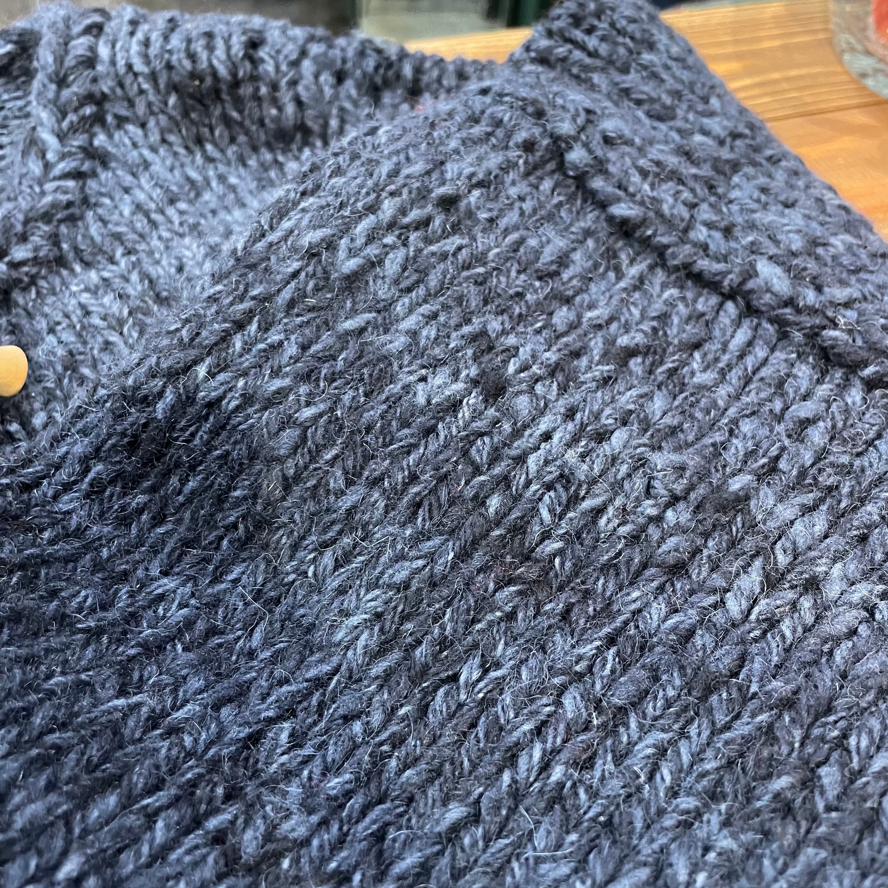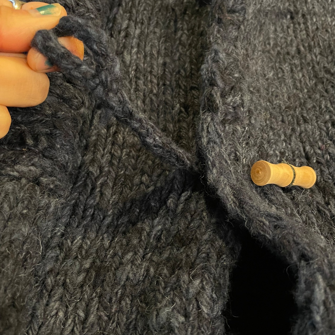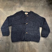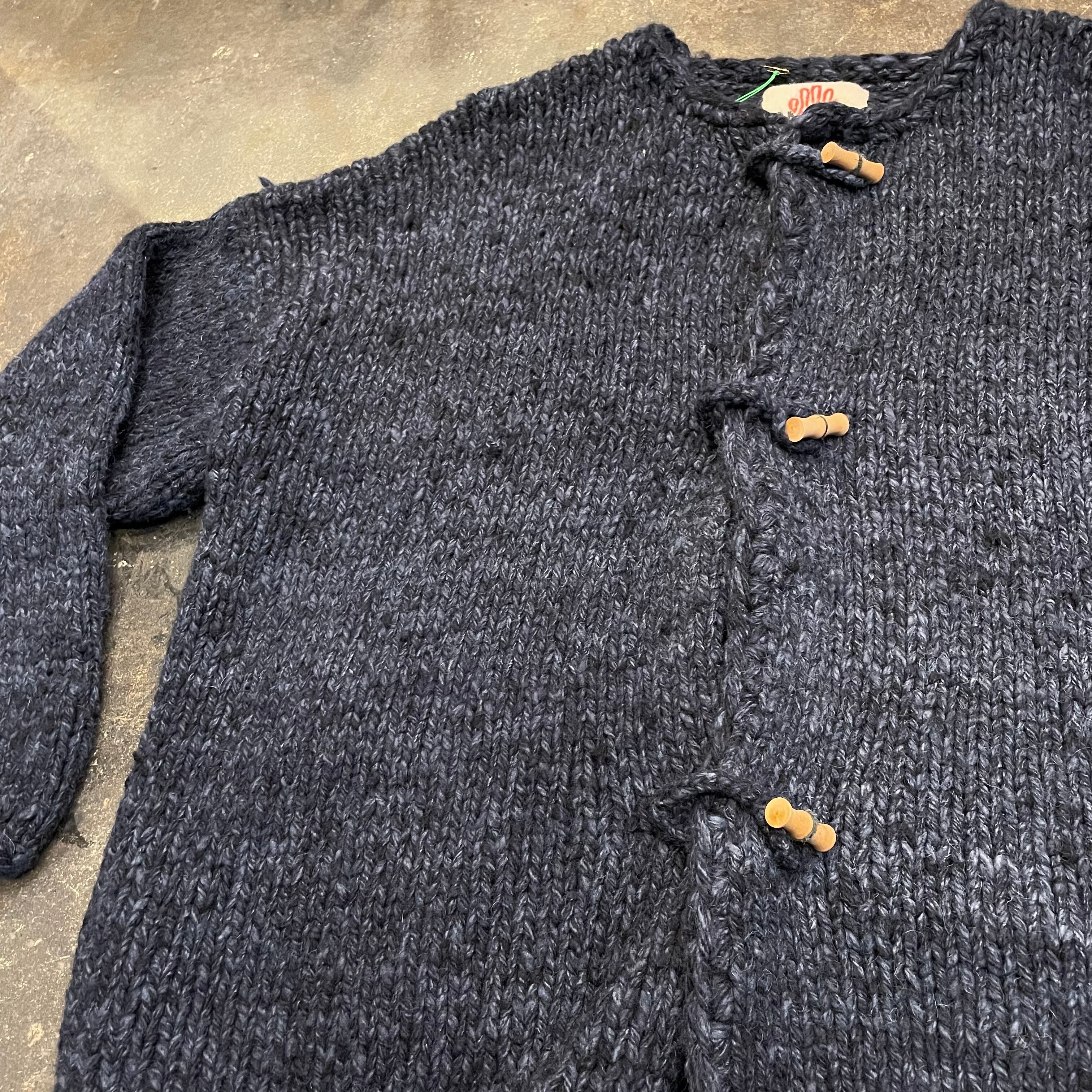 ハンドニットブランドAMANOのカーディガンです。ネイビーでとてもシンプルですが、不思議な形のトグルボタンが付いていて、それを紐状に編まれた部分で引っかける面白い作りです。