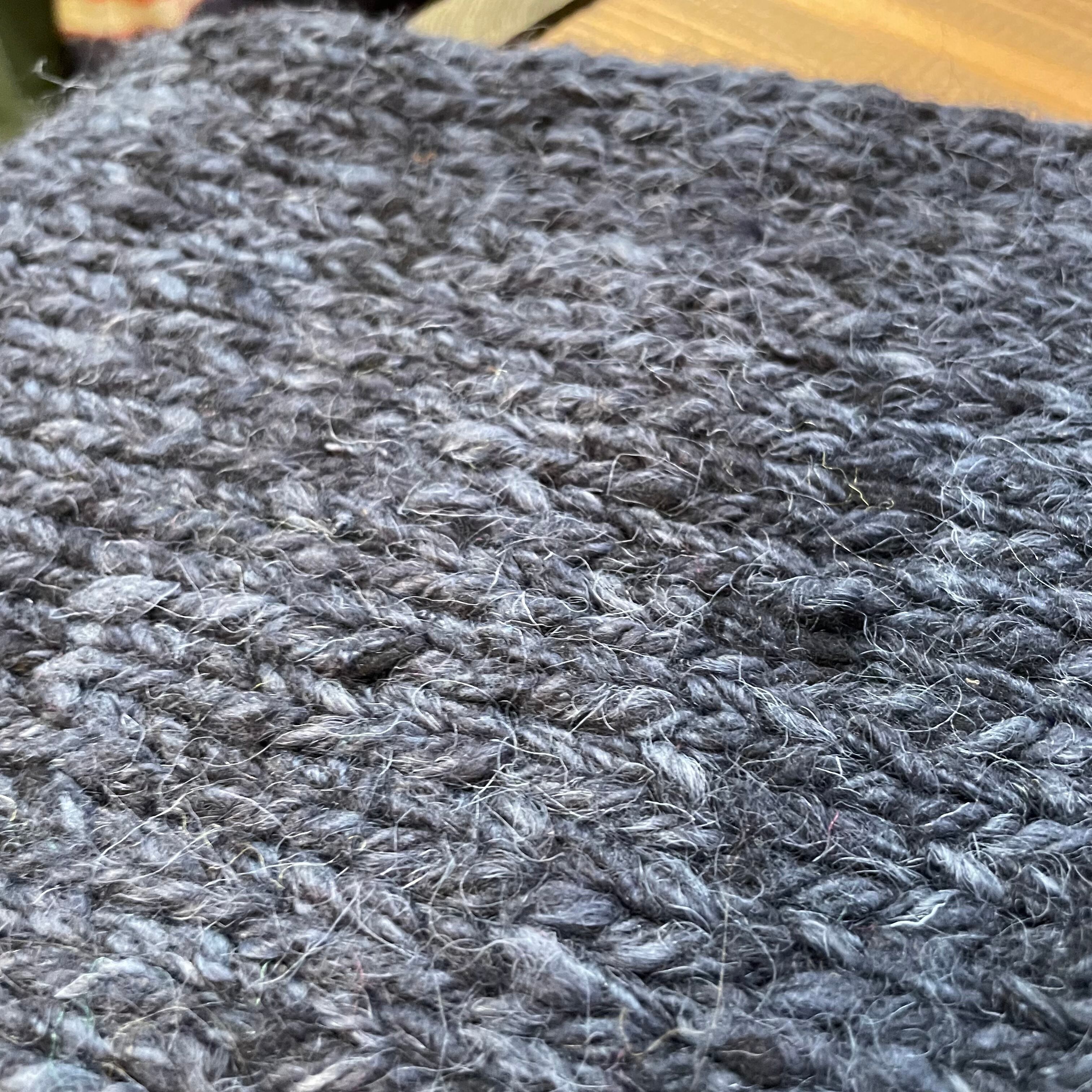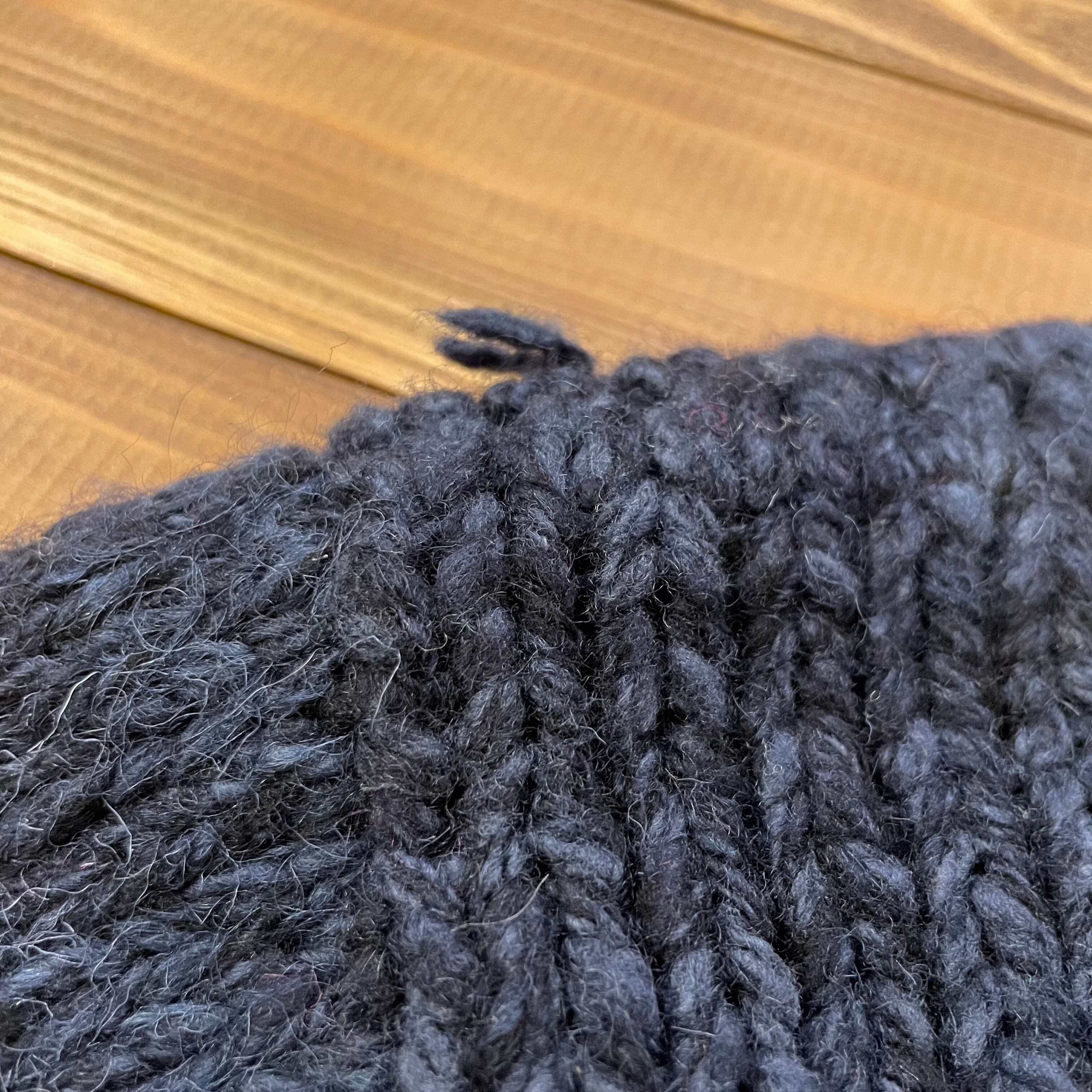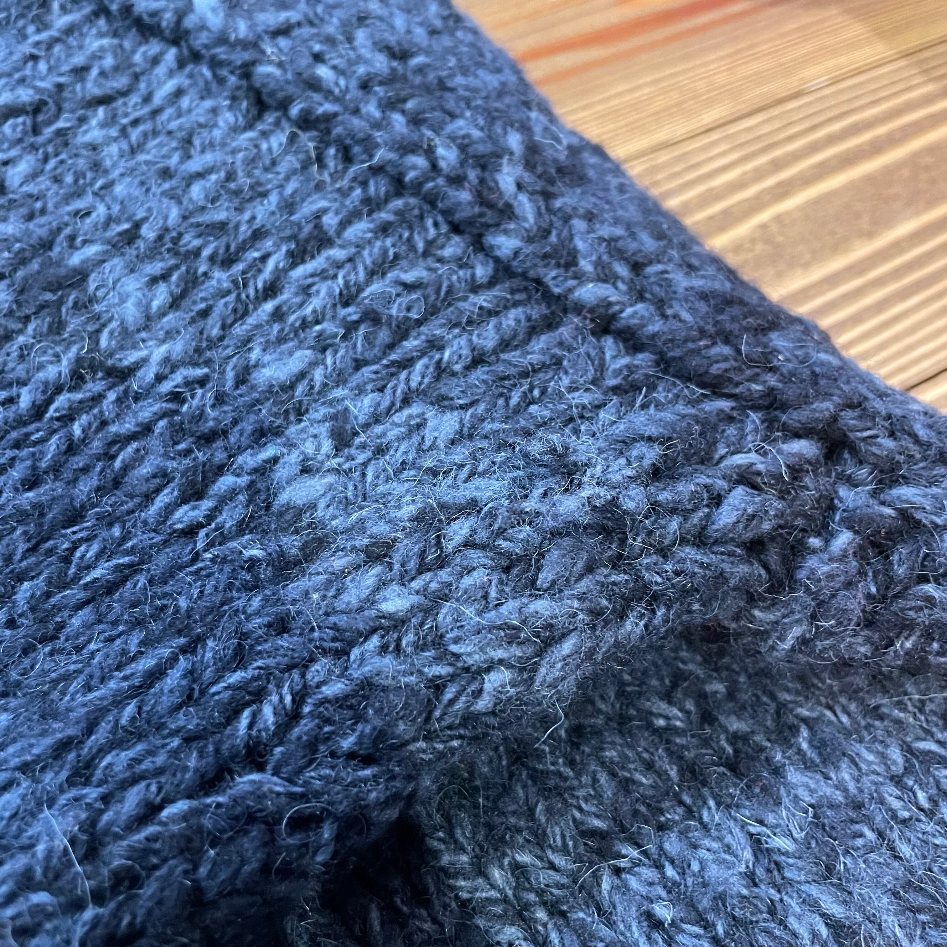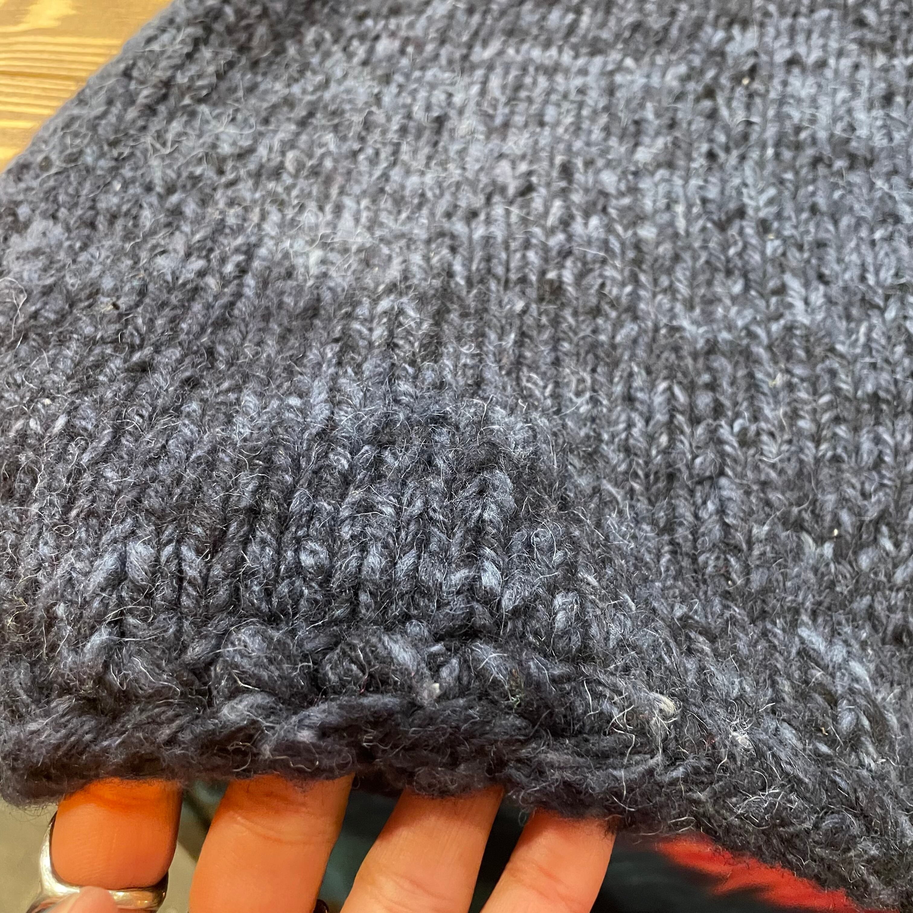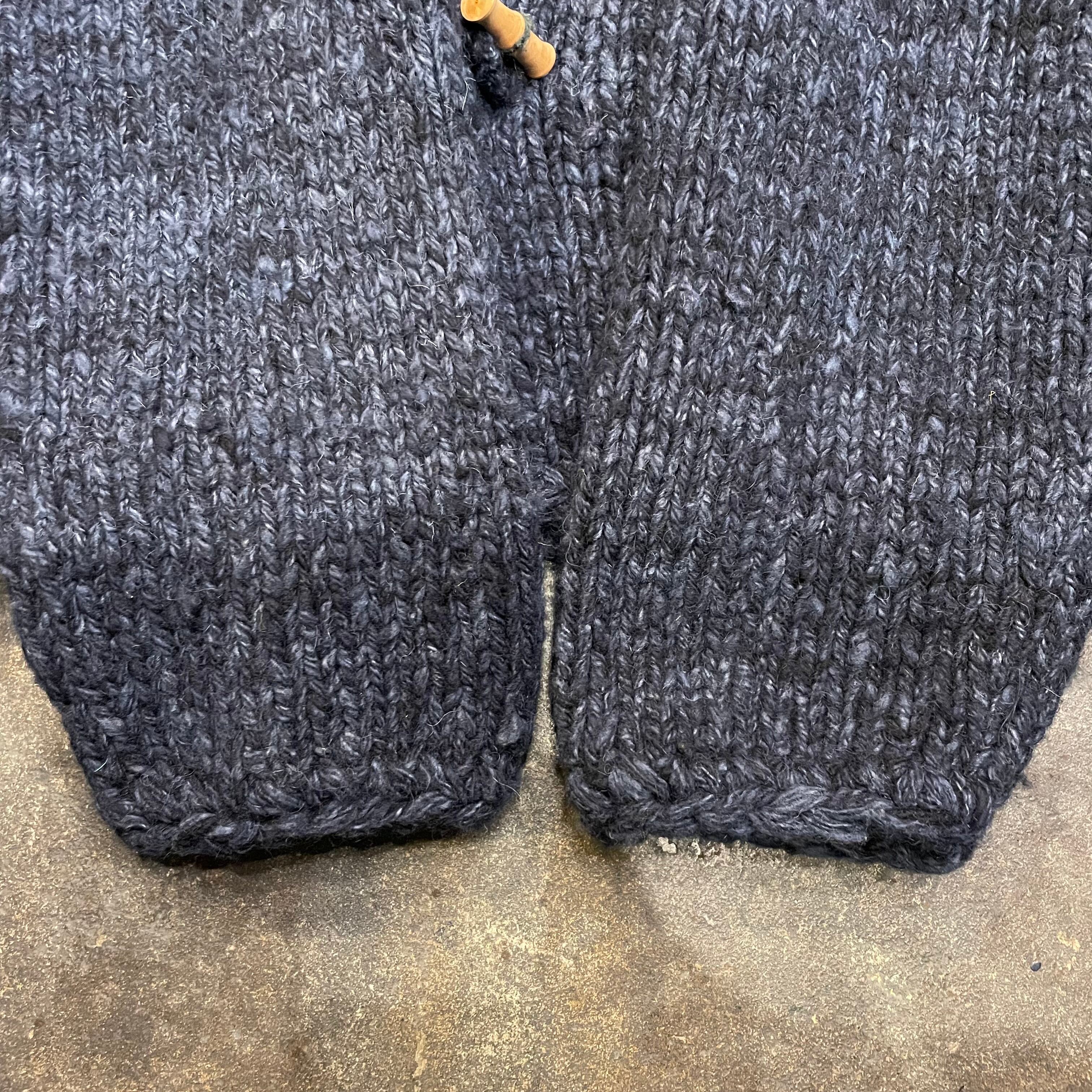 ハンドニットブランドAMANOのカーディガンです。ネイビーでとてもシンプルですが、不思議な形のトグルボタンが付いていて、それを紐状に編まれた部分で引っかける面白い作りです。
