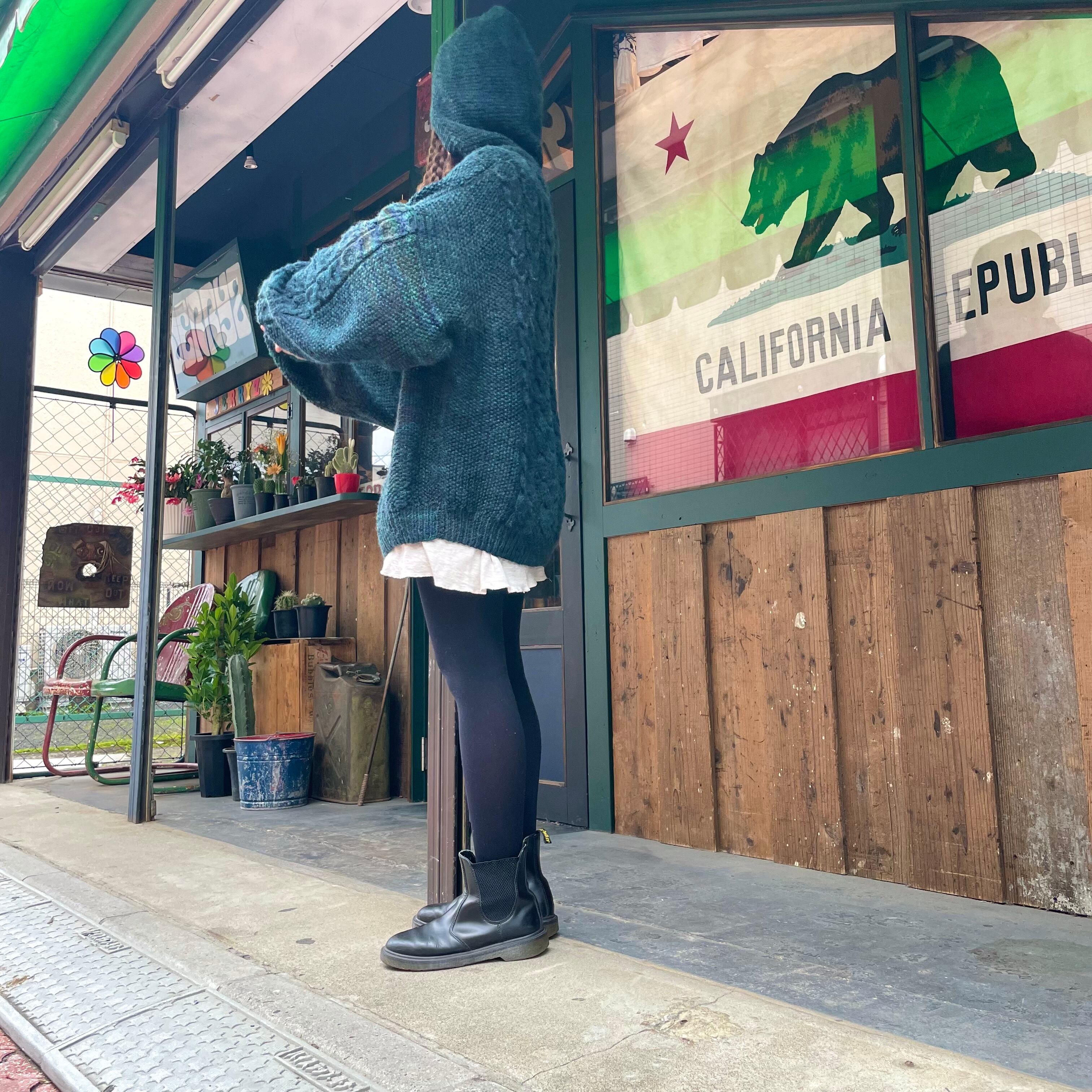 かなりゆったり大きいサイズ感でゆるっとしたシルエットが魅力的で、袖もタプっとゆとりがあり、フードが付いていて、渋い色味ですが遊び心のあるかわいい一着です。