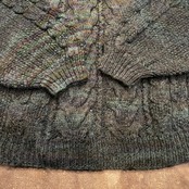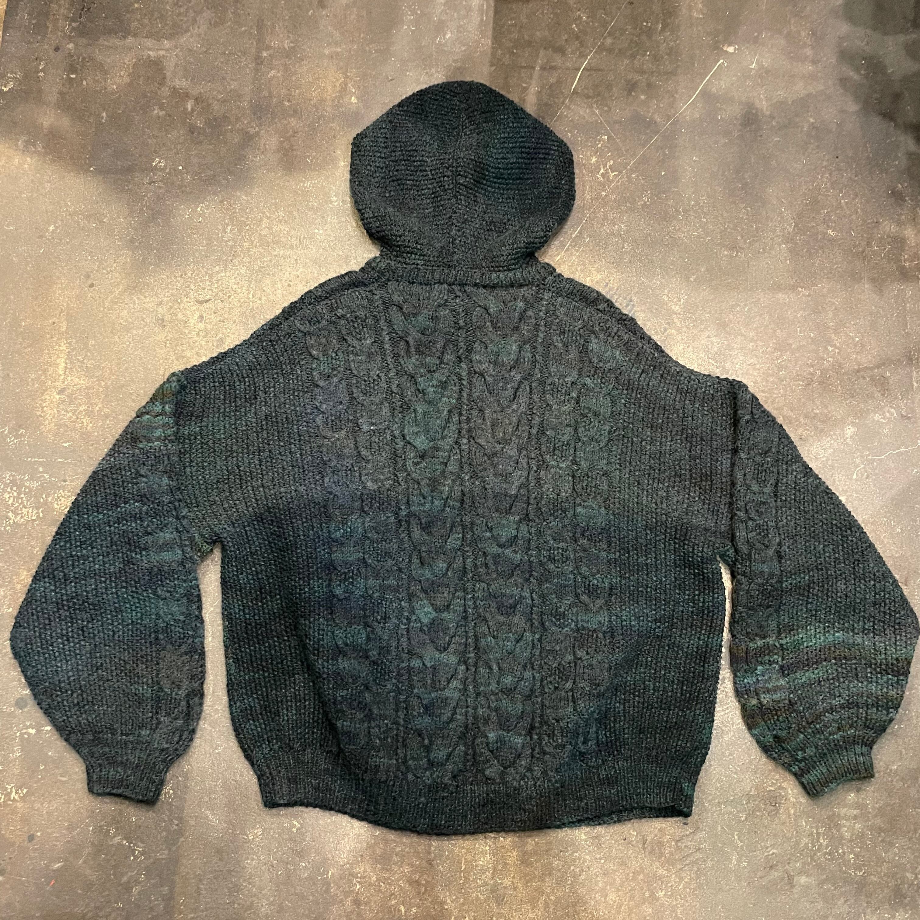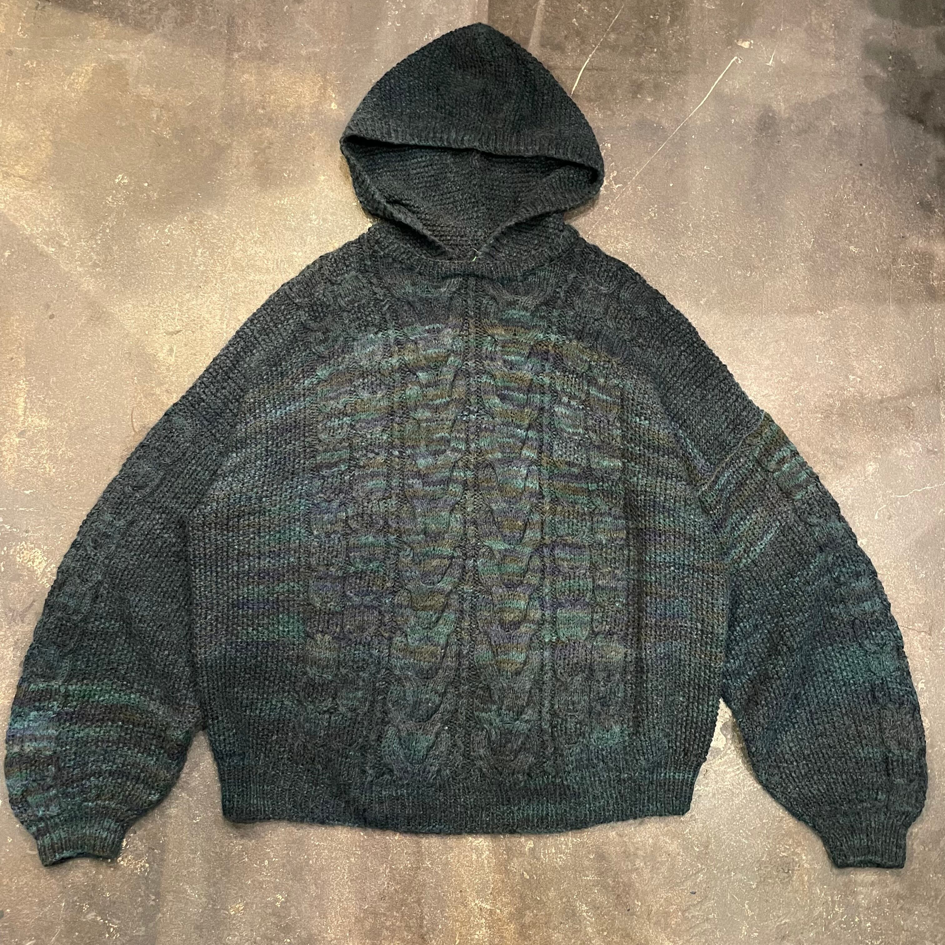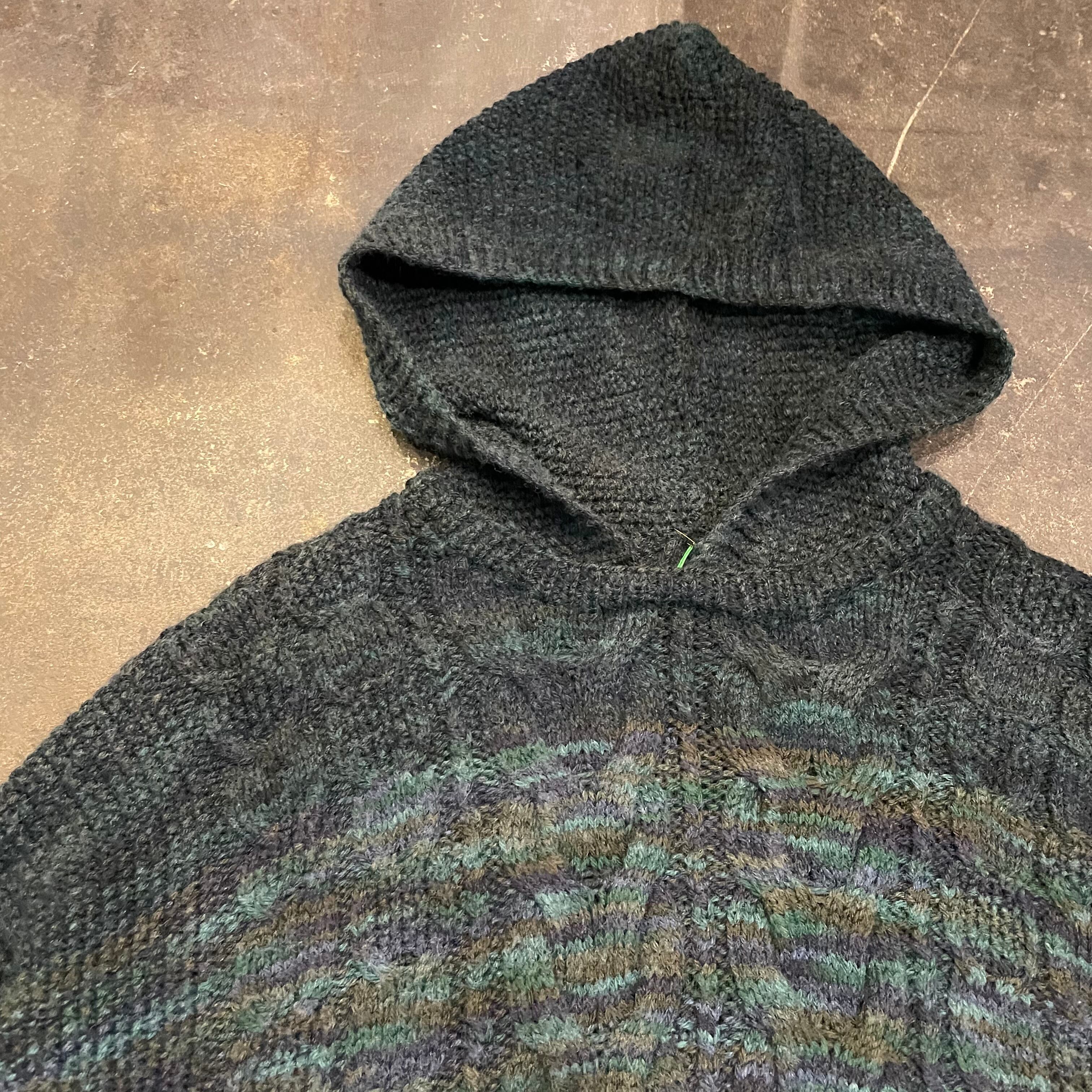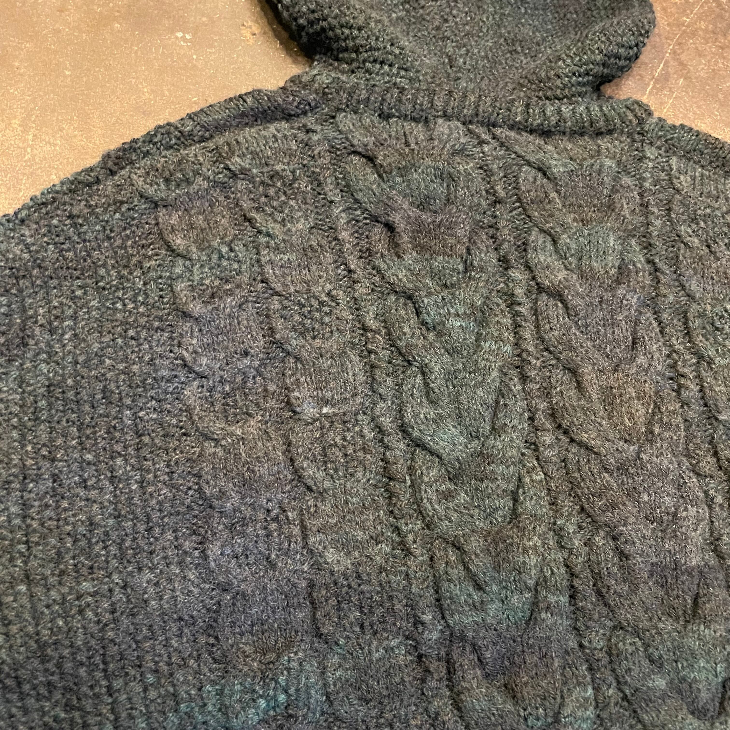 みどり系のミックスカラーの毛糸がとてもかわいいフード付きのセーターです。