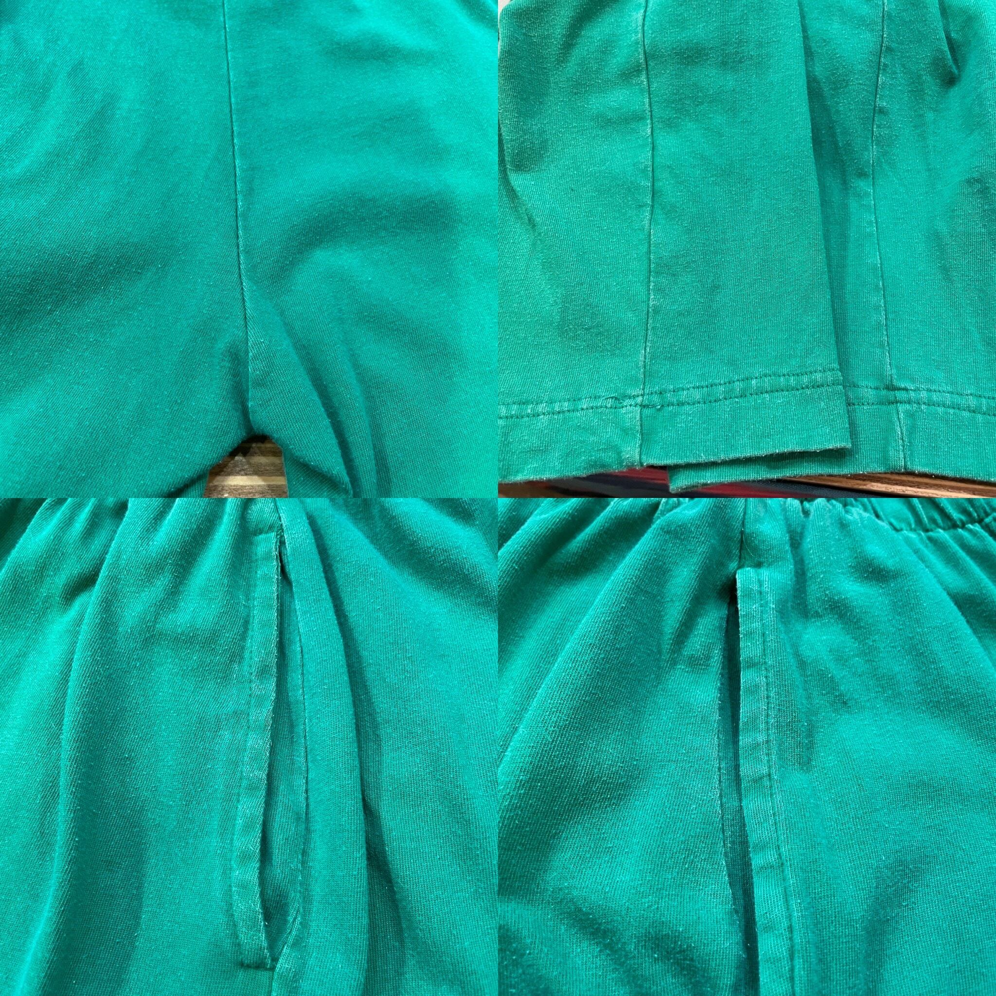 シャツは前立てや袖口に色褪せや毛羽立ちがございます。パンツはウエスト部分、縫い目部分、ポケット口に色褪せや毛羽立ち等ございます。