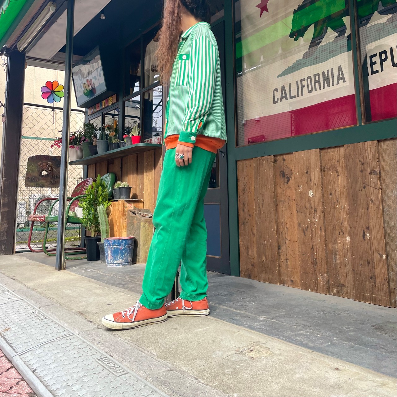 シャツは着丈が短めでバランスが取りやすいですしとてもポップで存在感があり、パンツはシンプルに無地で気軽に気回せそうです。