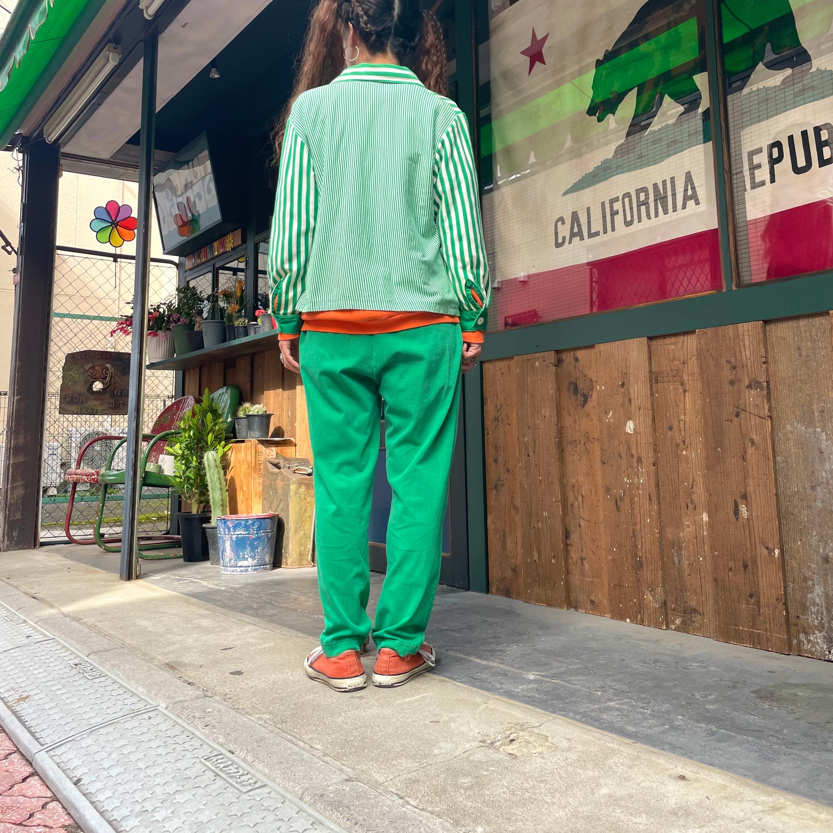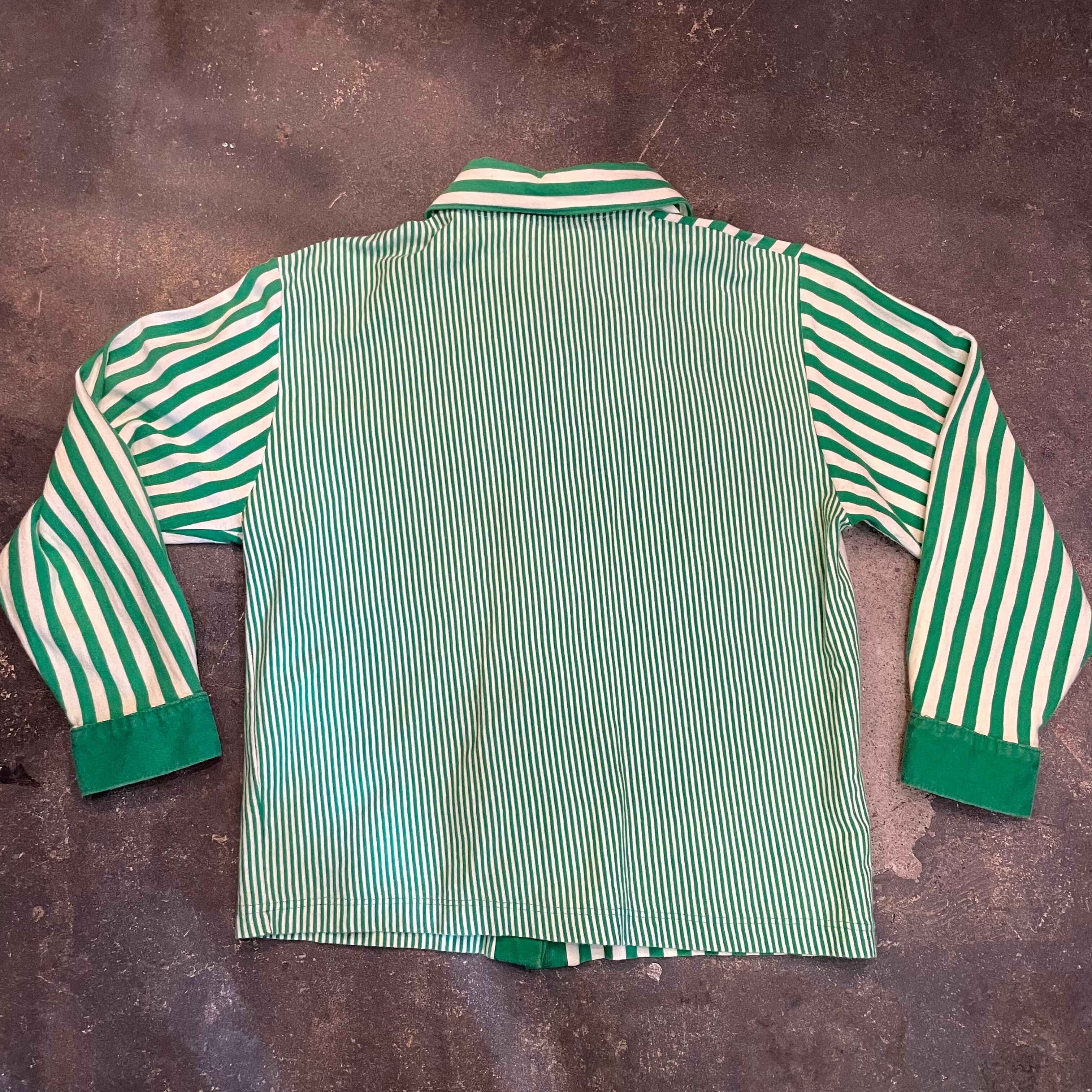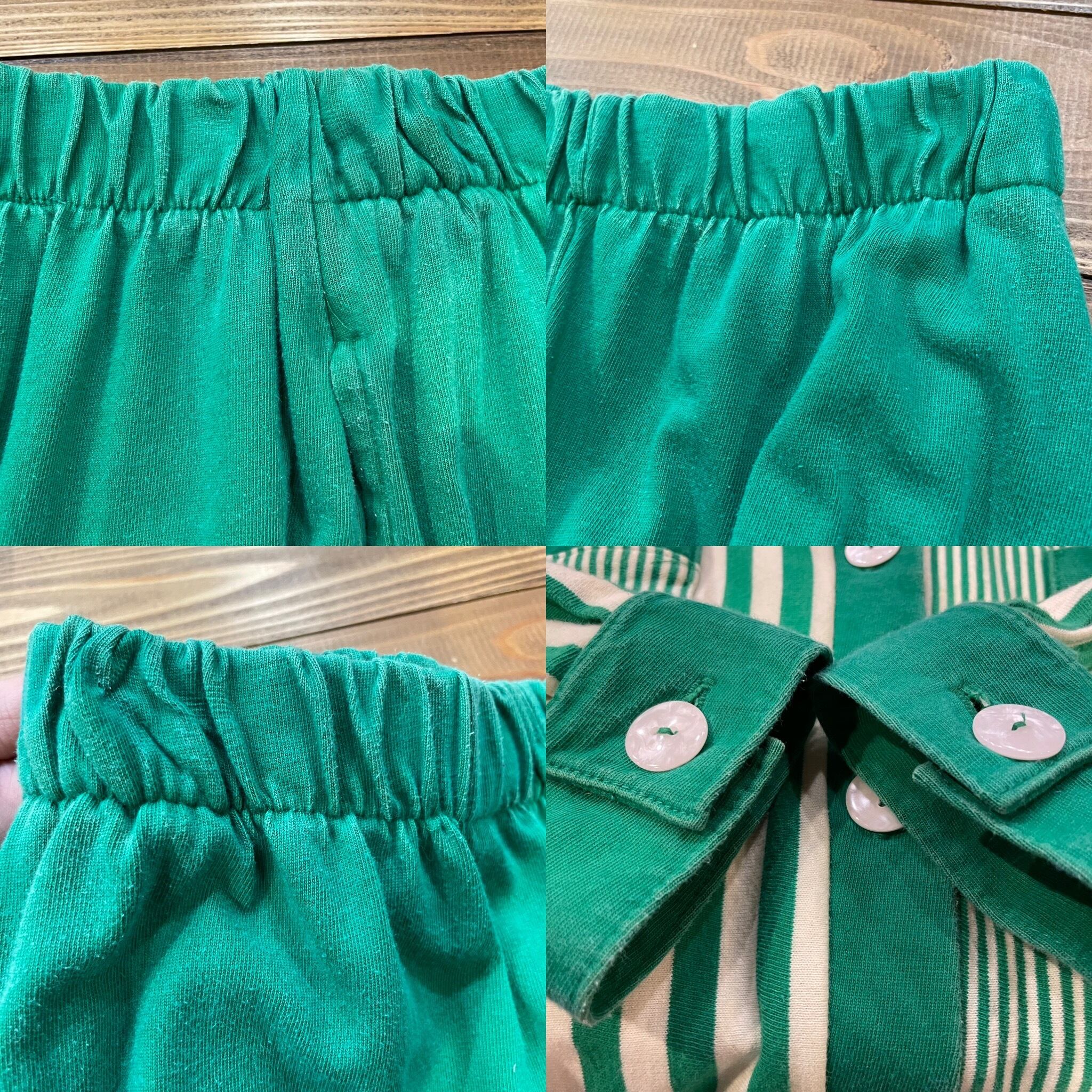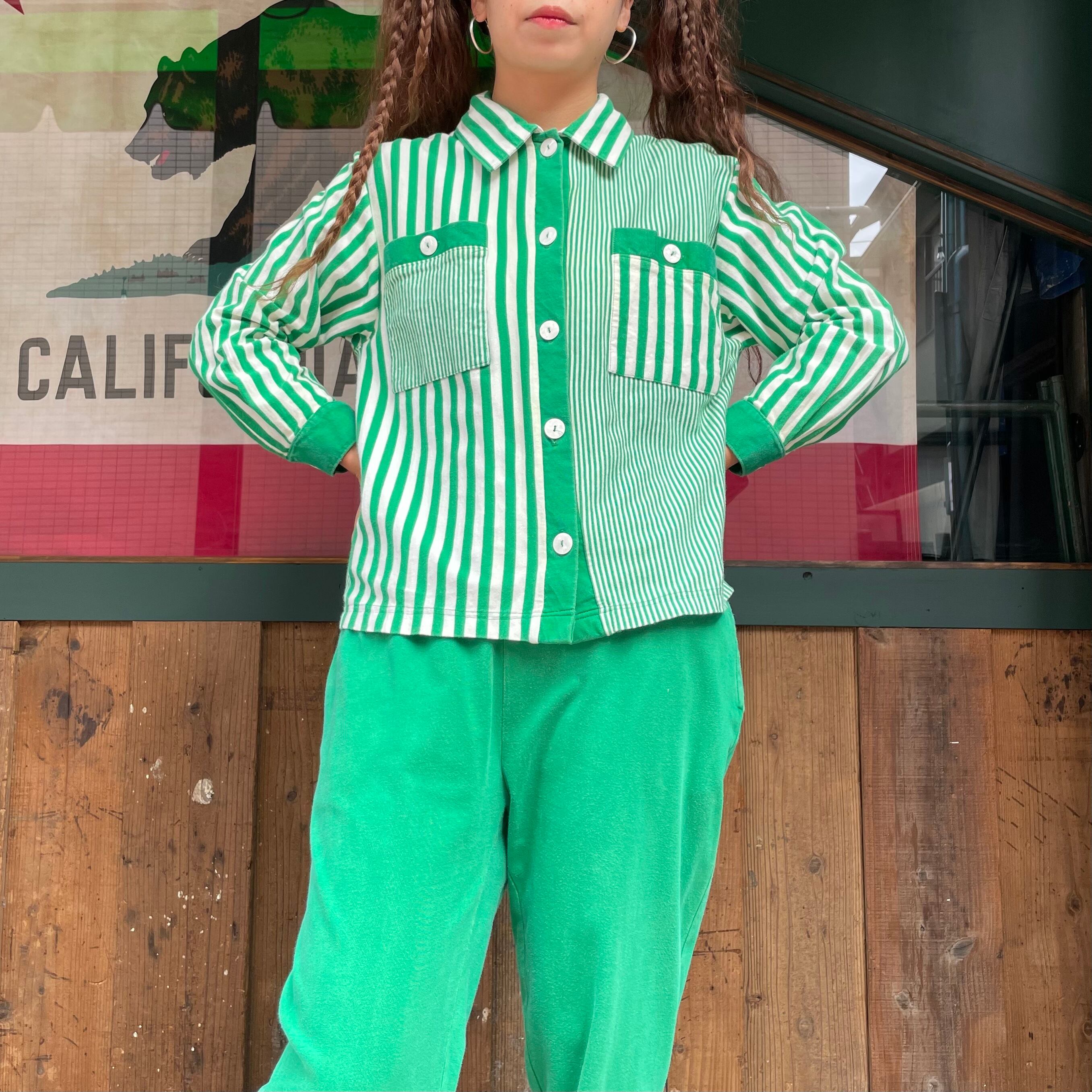 緑の左右非対称なストライプがかわいいシャツとパンツのセットアップです。