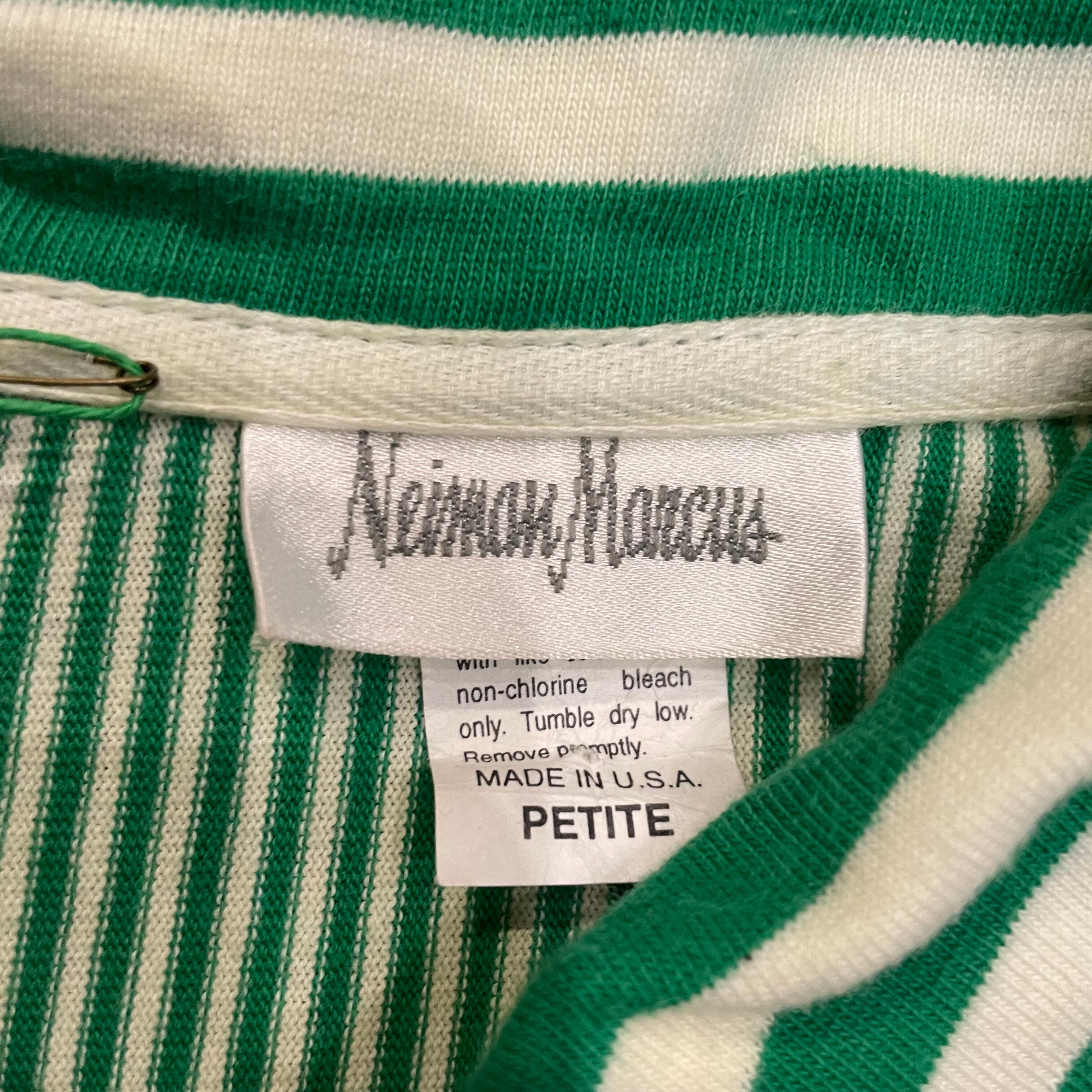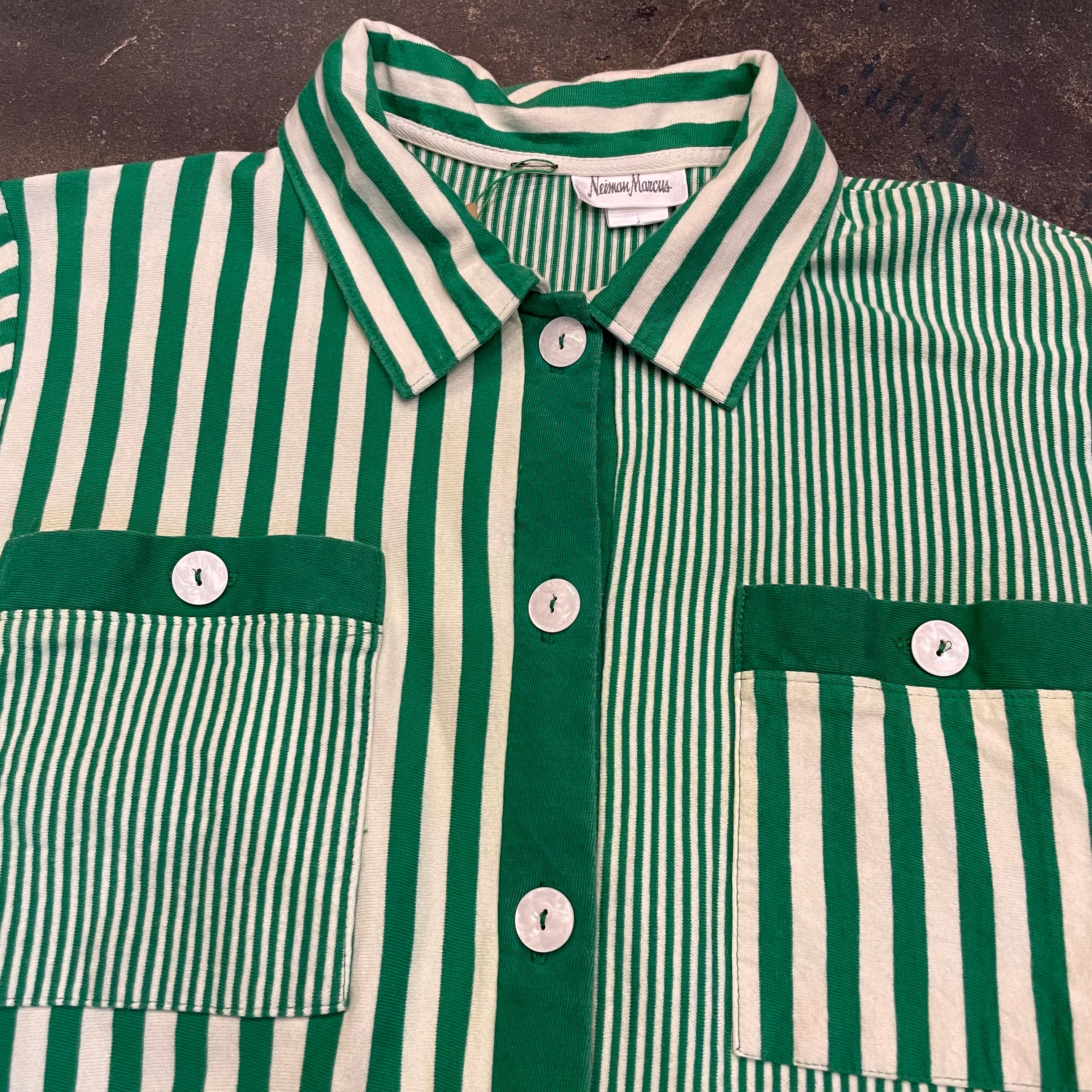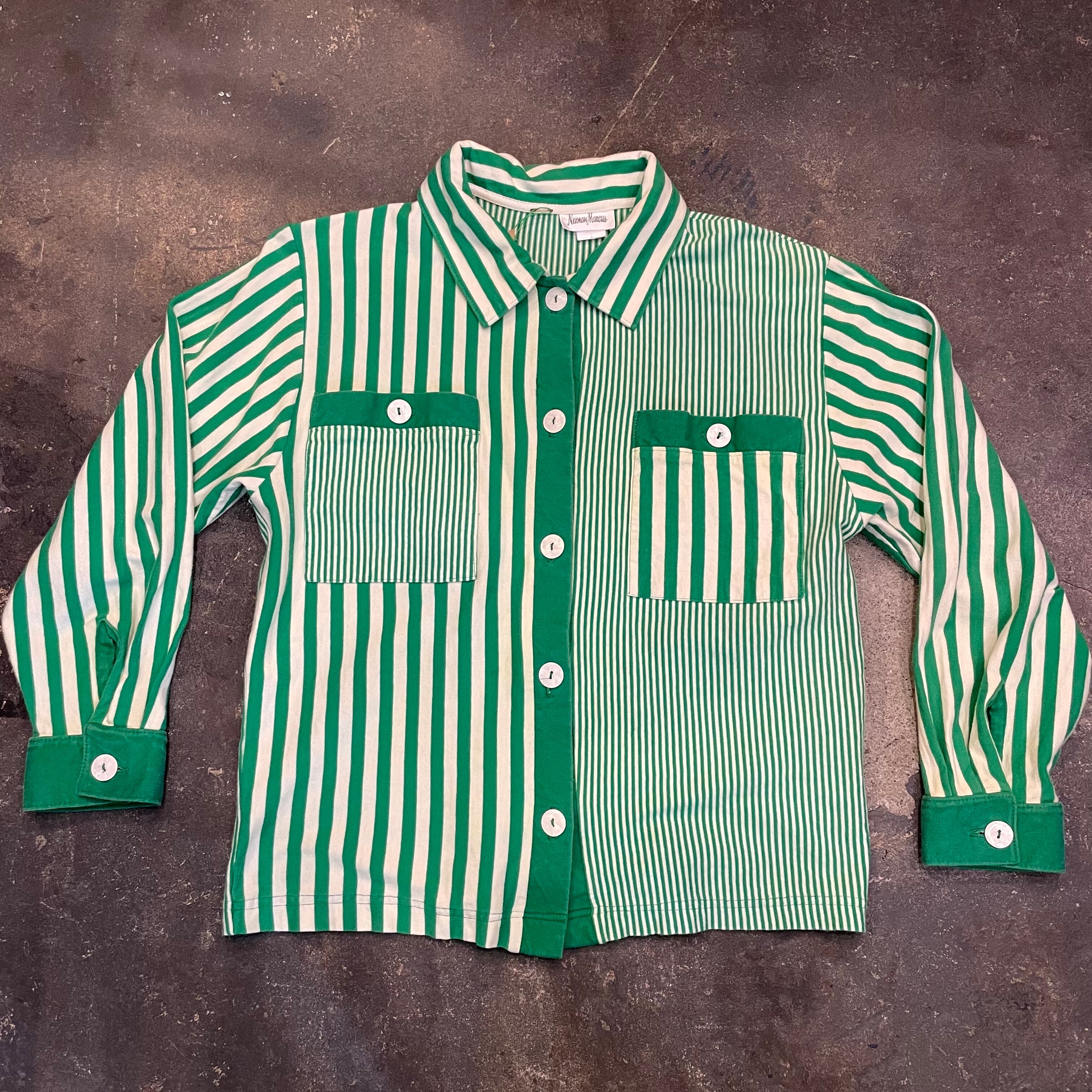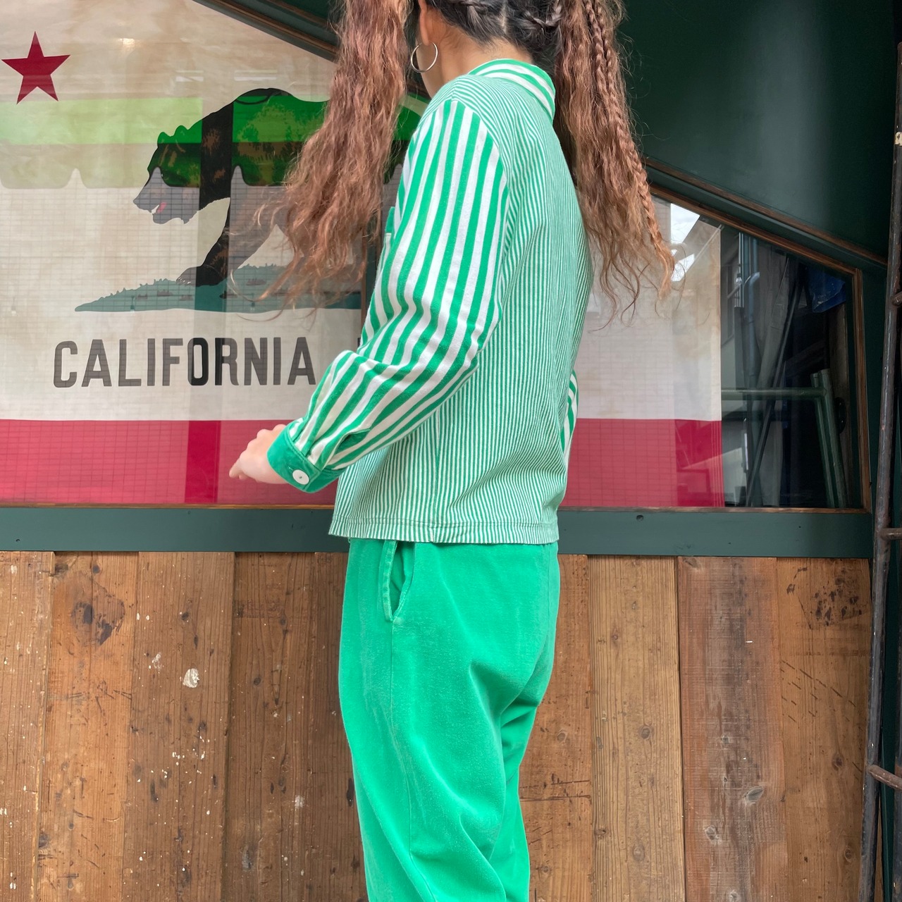 緑の左右非対称なストライプがかわいいシャツとパンツのセットアップです。