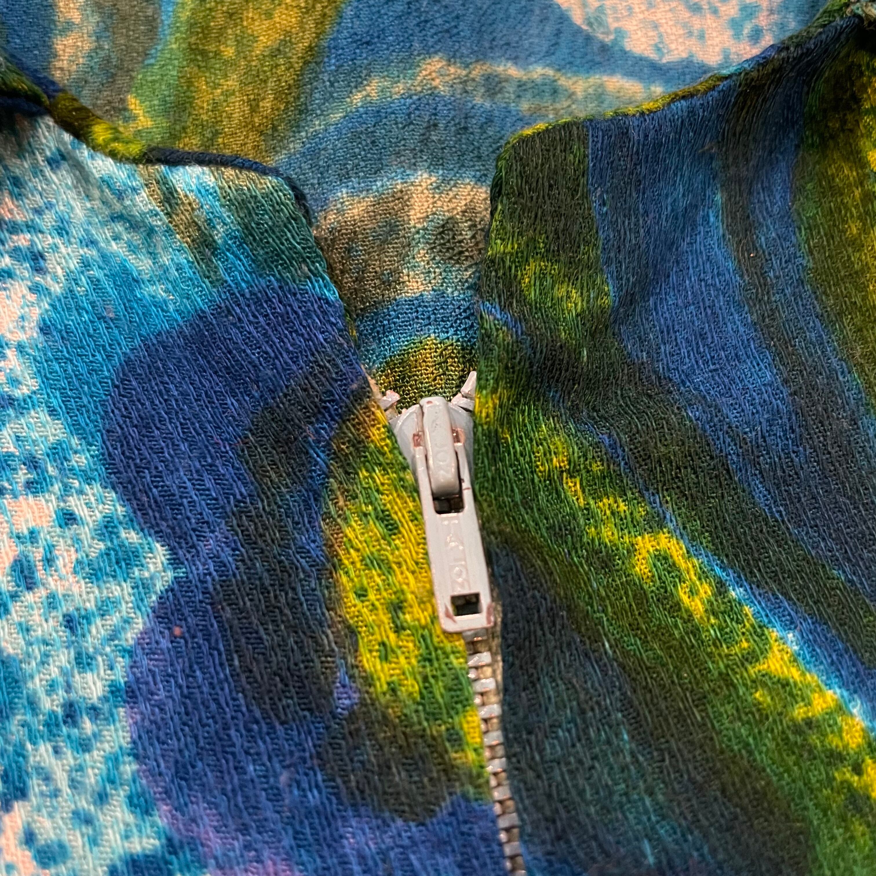 前がウエストまでジップになっているので着脱楽ちんなのはもちろん、インナーの合わせ方も楽しめそうです。さらに襟のあるブラウスを中に重ねたり、プリントのスウェットやパーカーを重ねても良いですね。