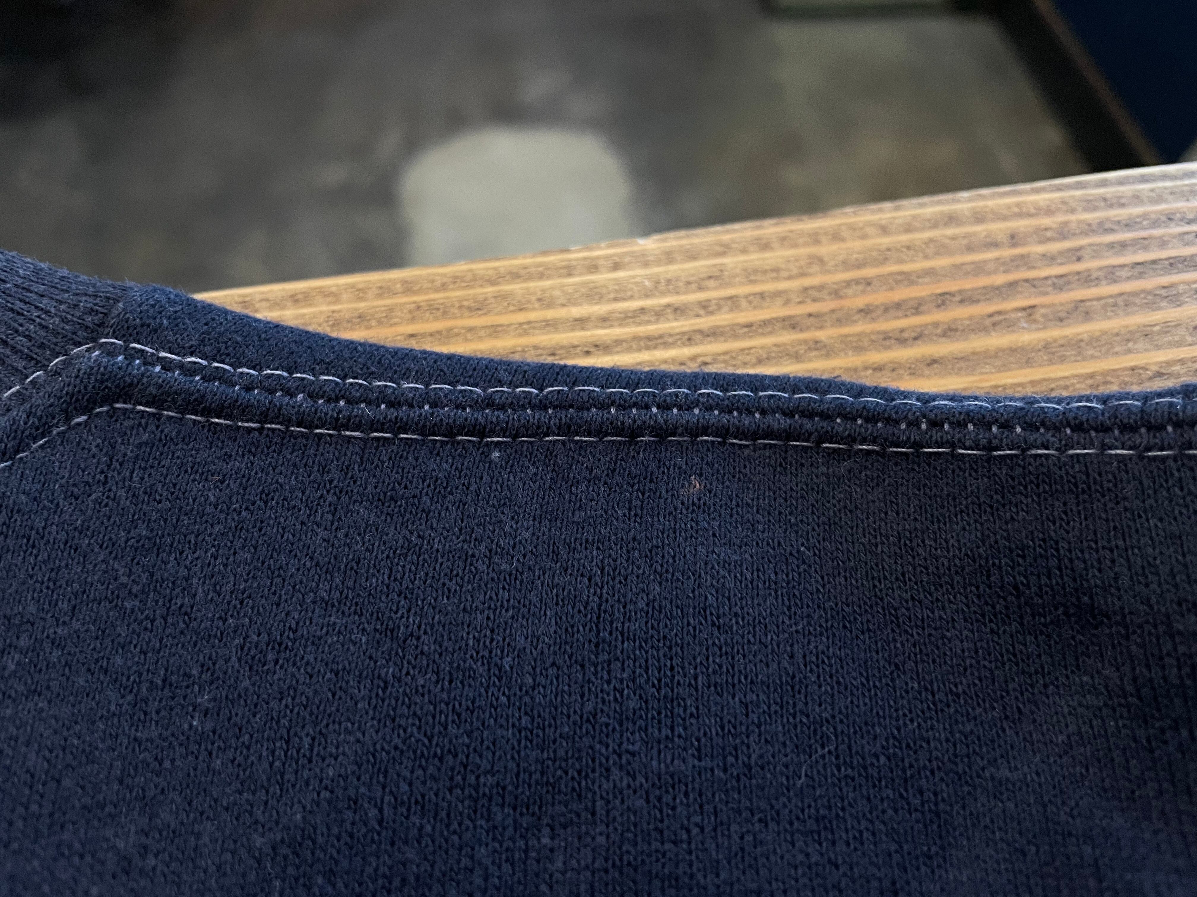 全体的な軽い毛羽立ち、プリントの剥げ、肩と袖口に小さなシミ等使用感のある商品です。