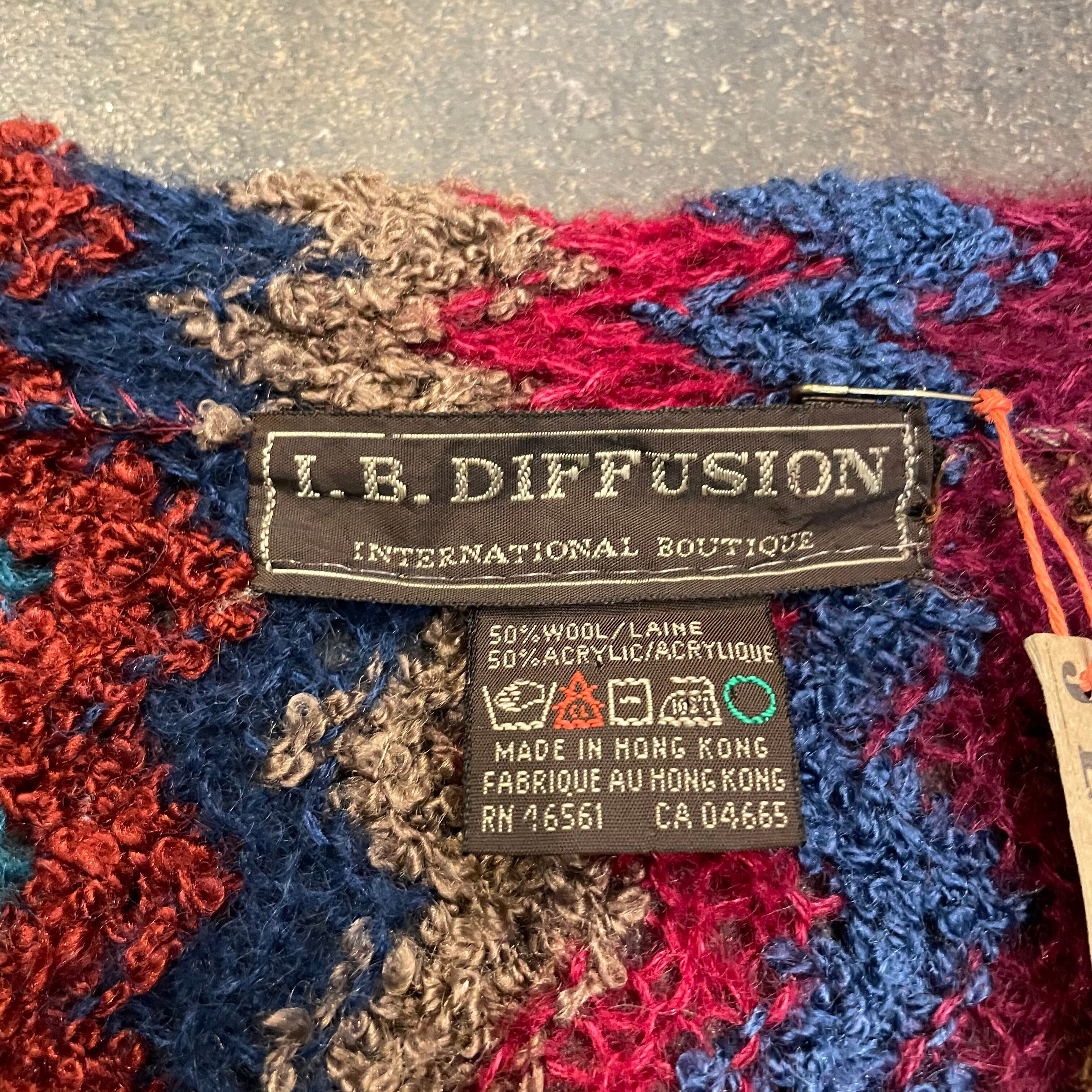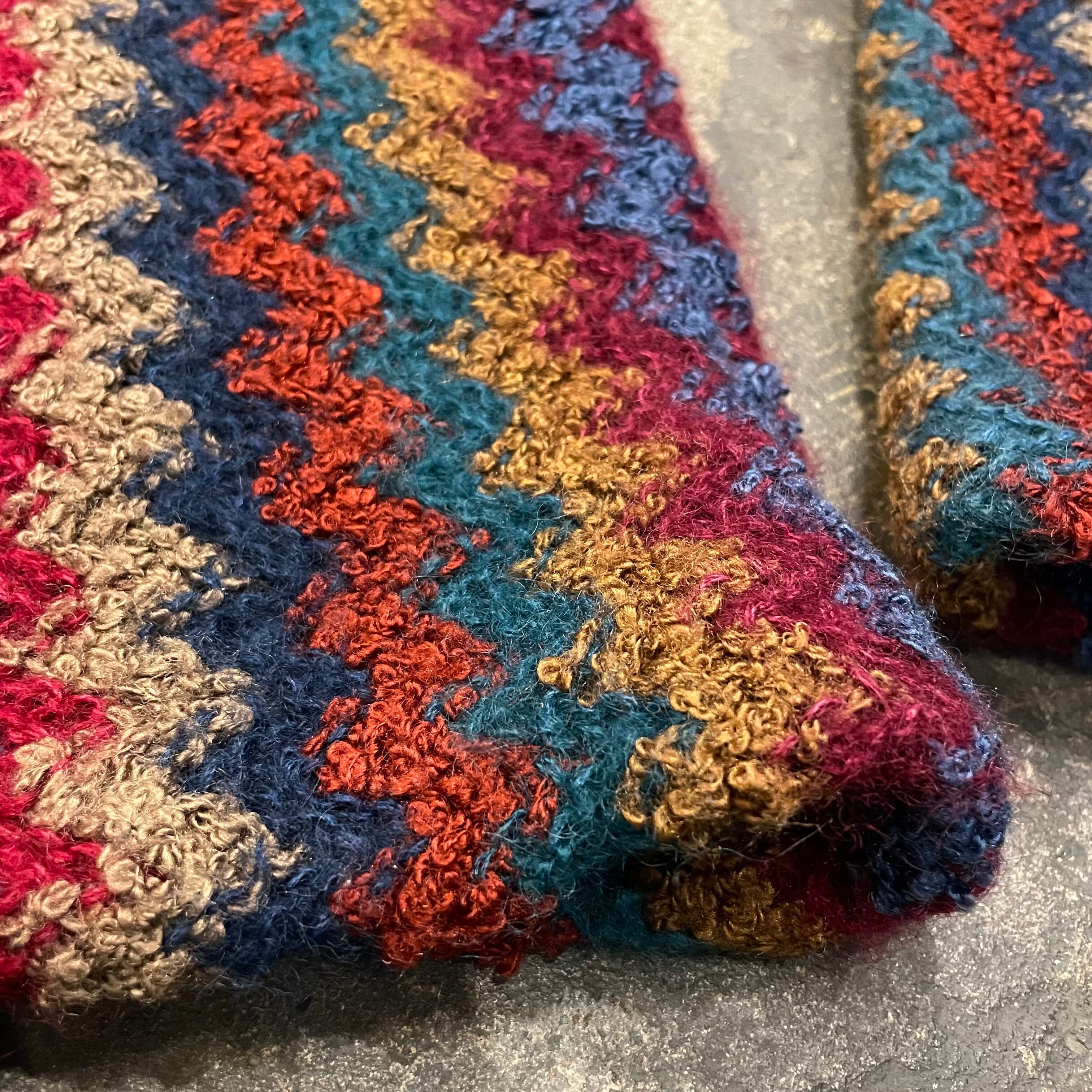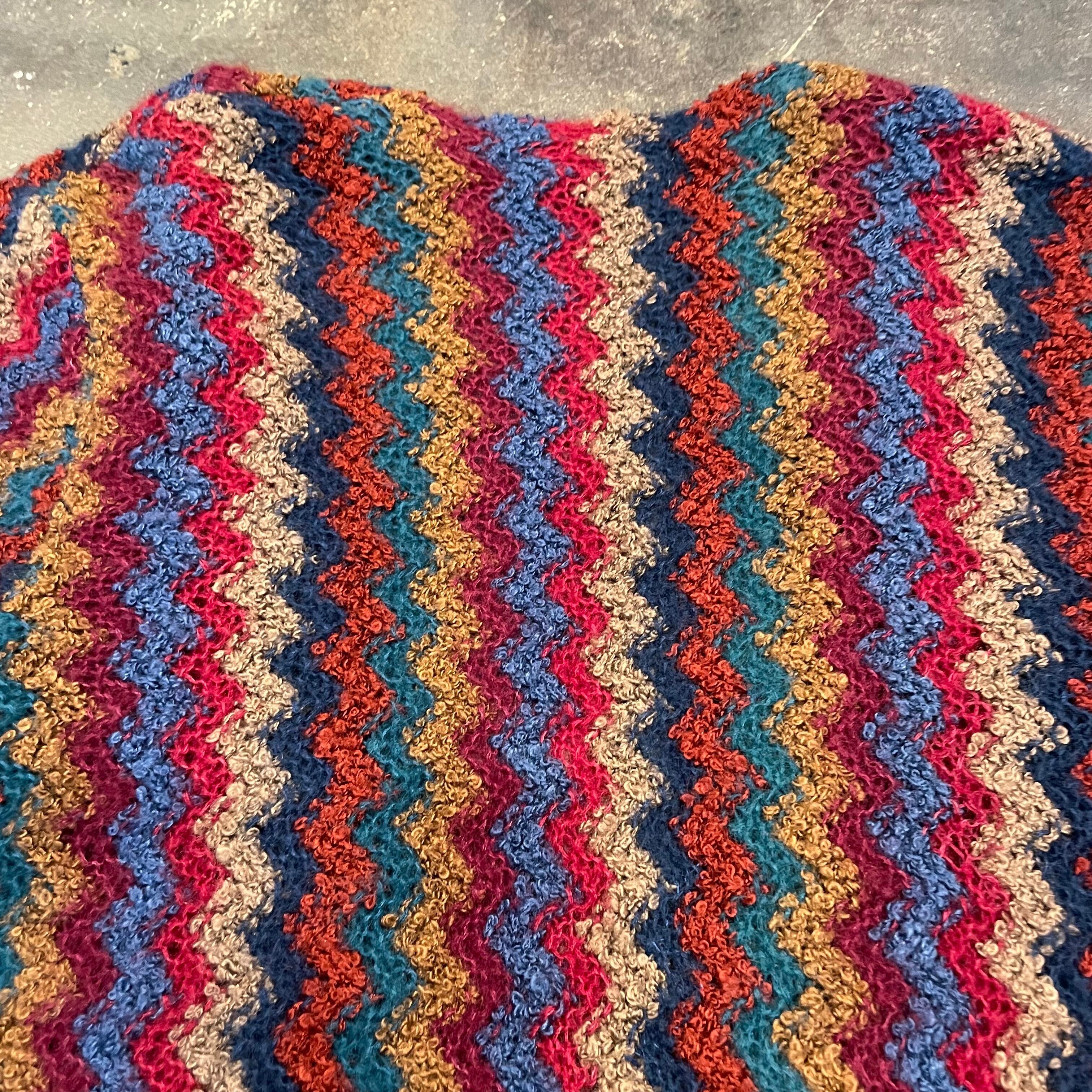 くるくる動きのある毛糸やモヘアっぽい毛足のある毛糸が使われていて色味もかっこいいですし、雰囲気たっぷりで素敵な一枚です。