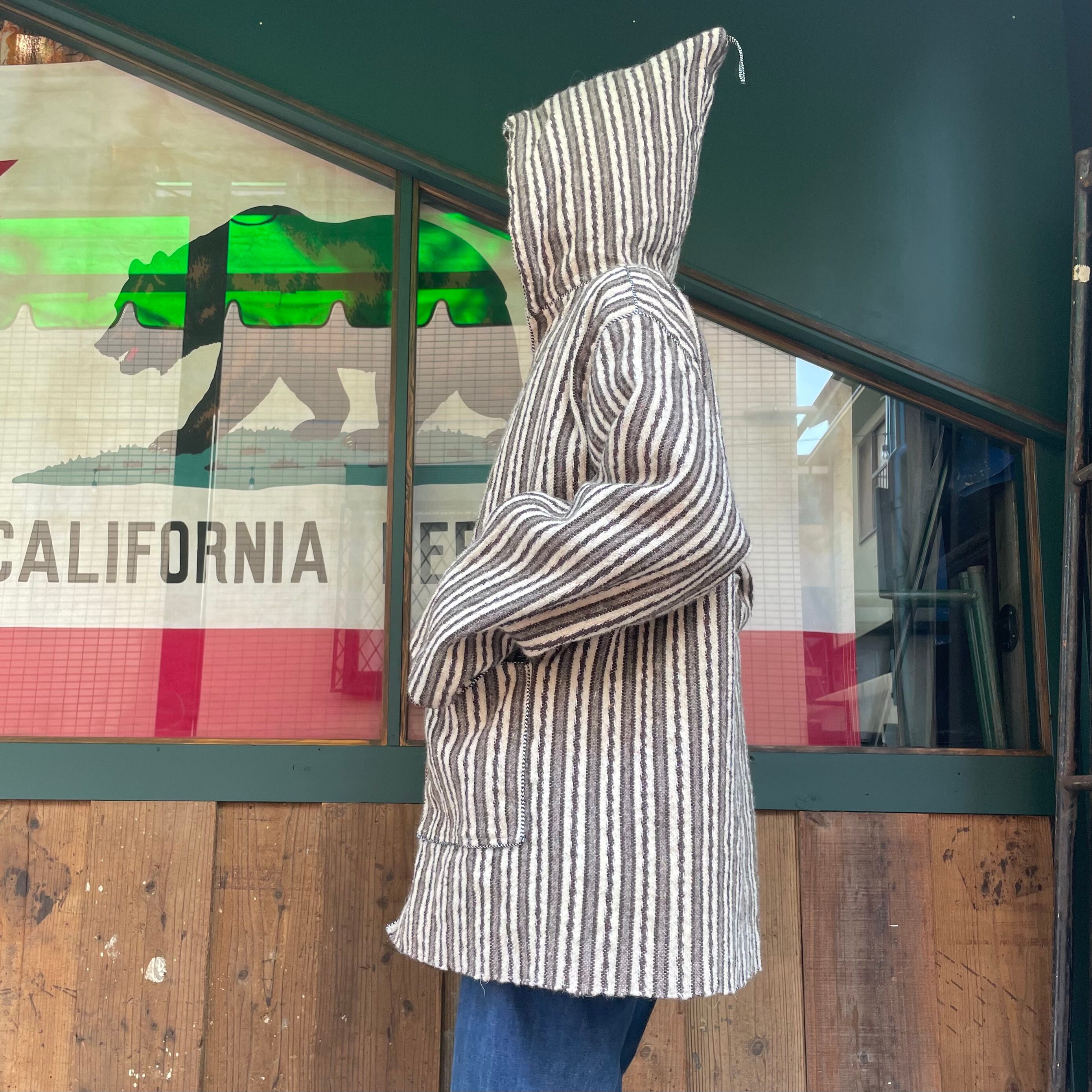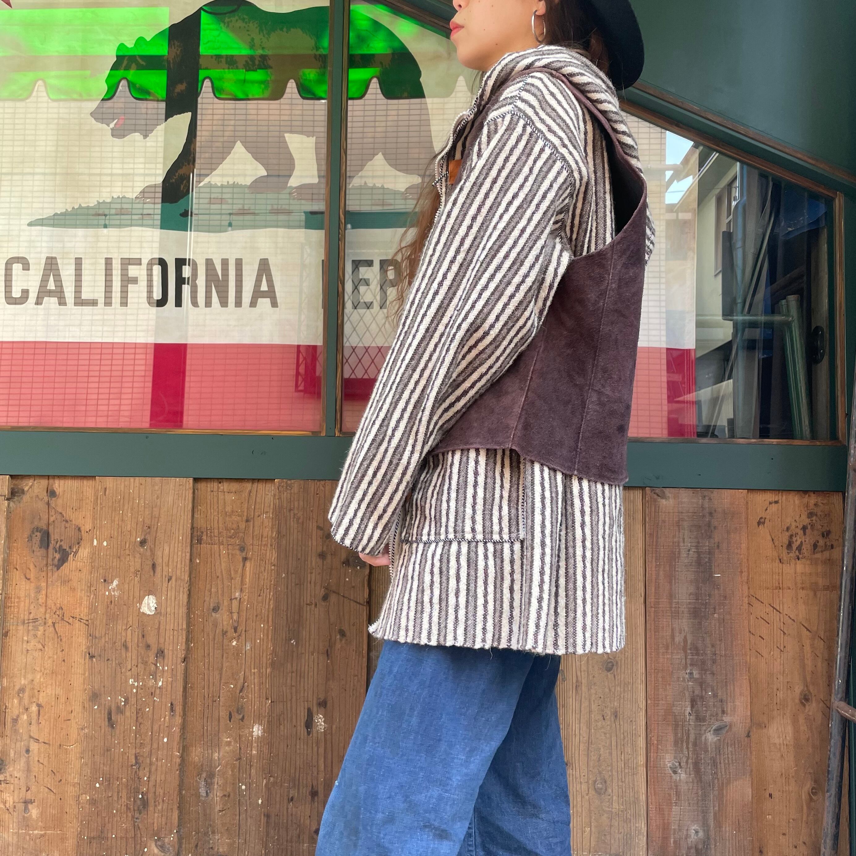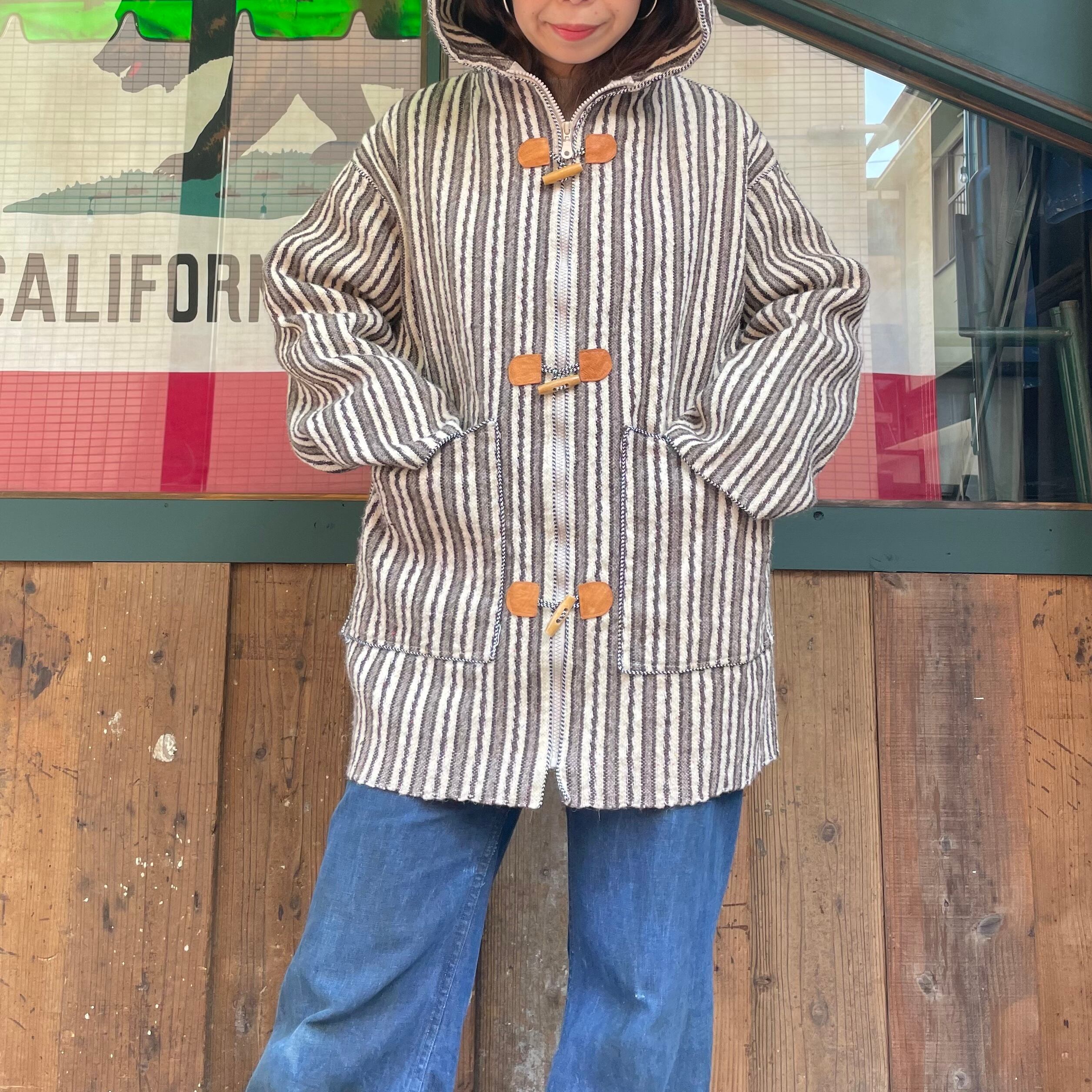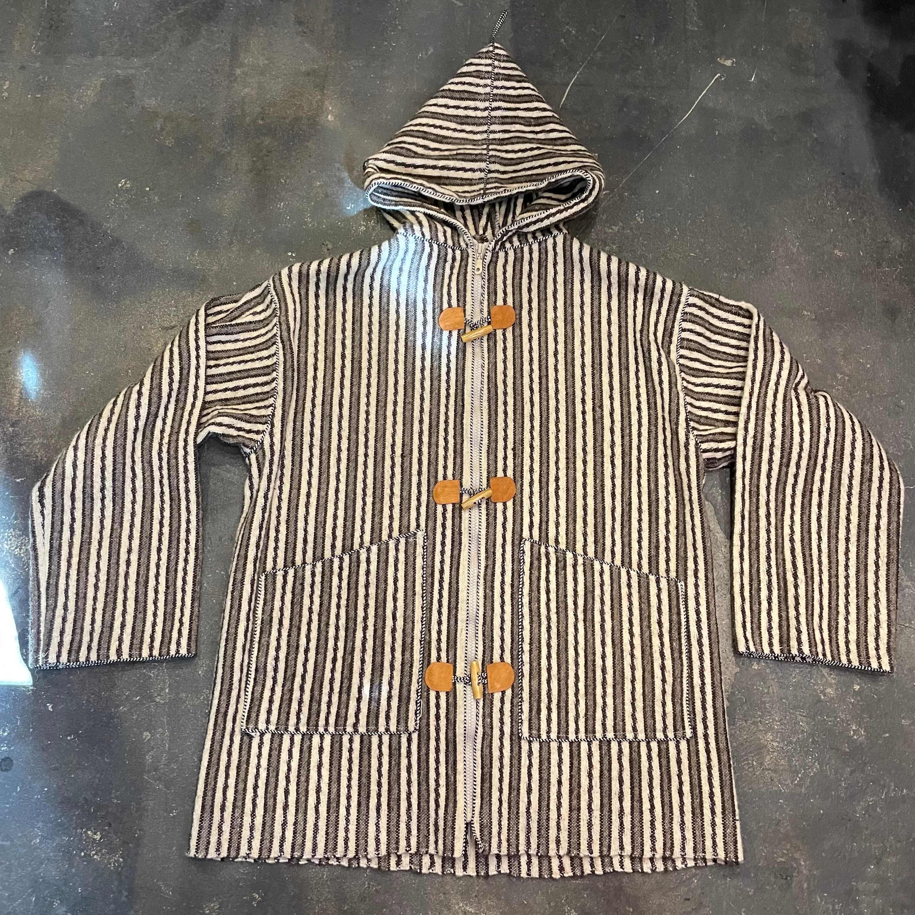 ボヘミアンな雰囲気のフード付きジャケットです。おそらくウールで織られたストライプ模様が良い雰囲気で、トグルボタンがポイントになっていてかわいいです。