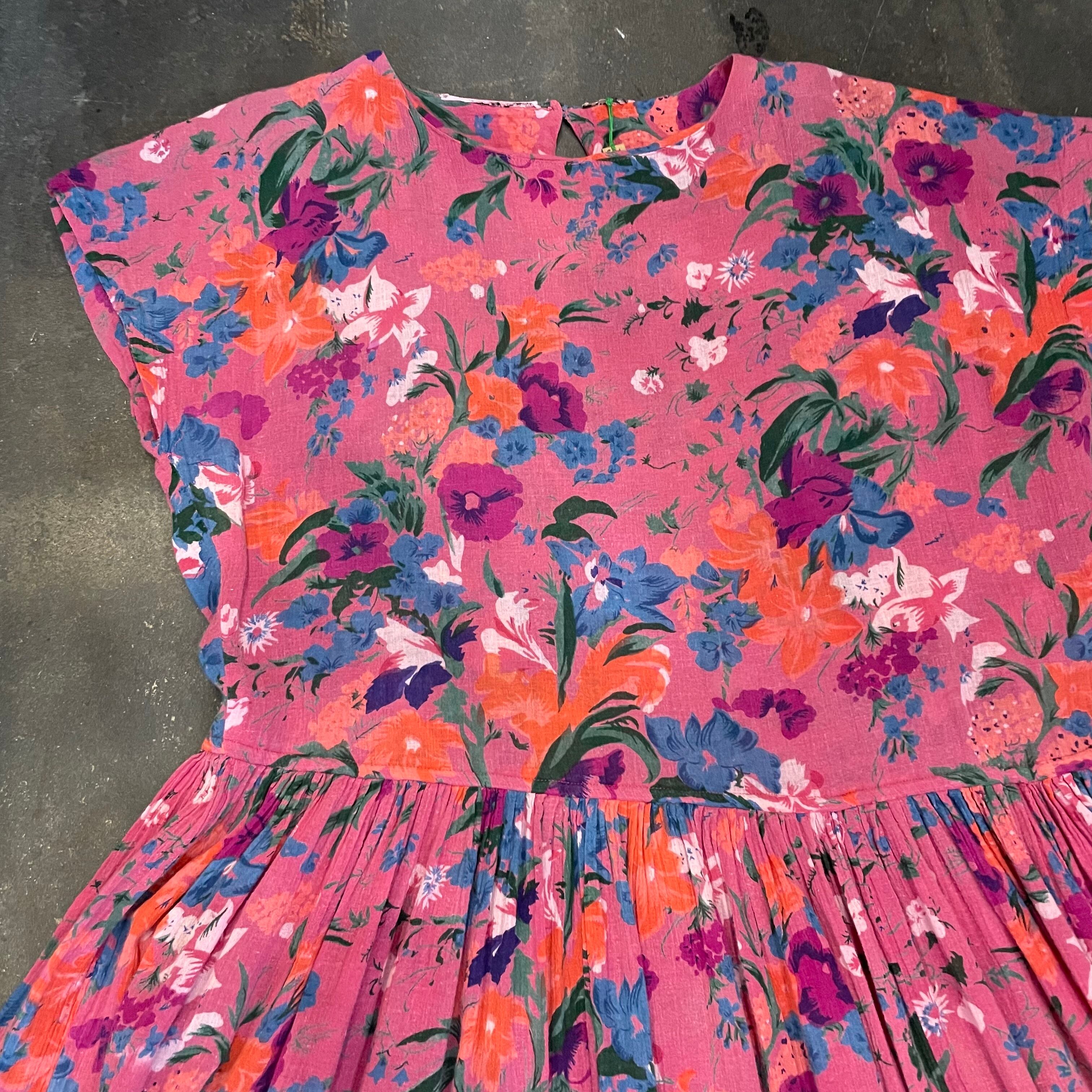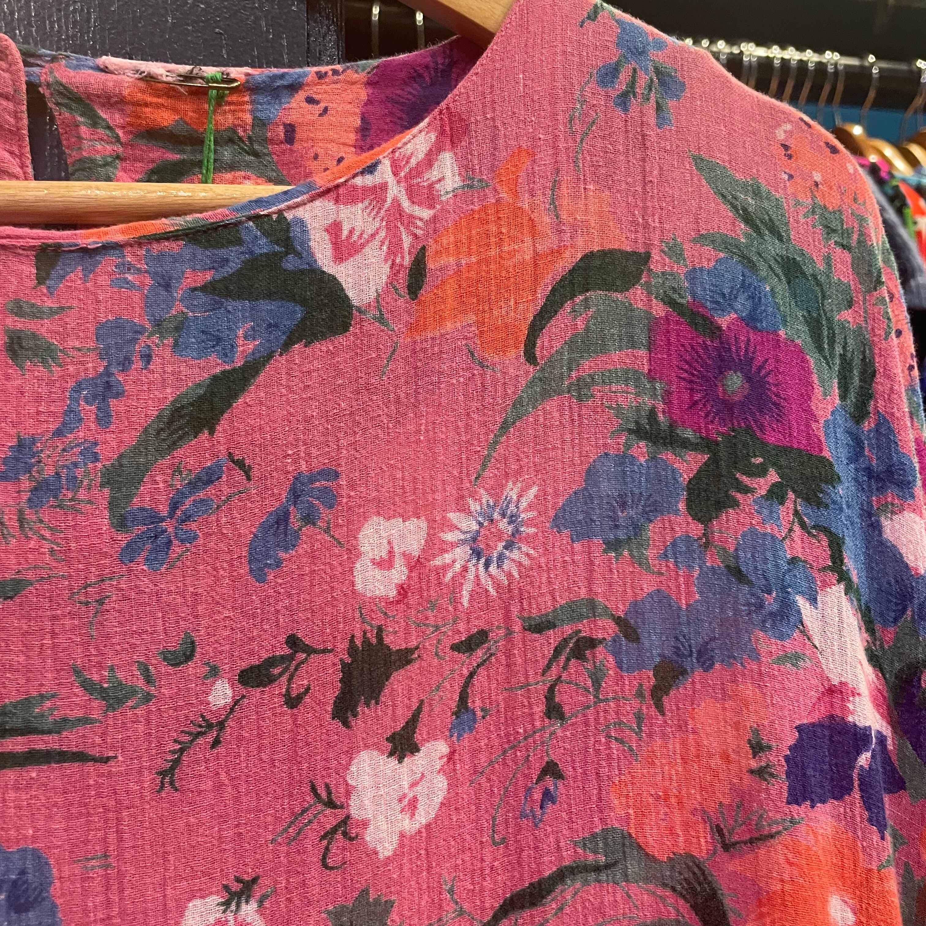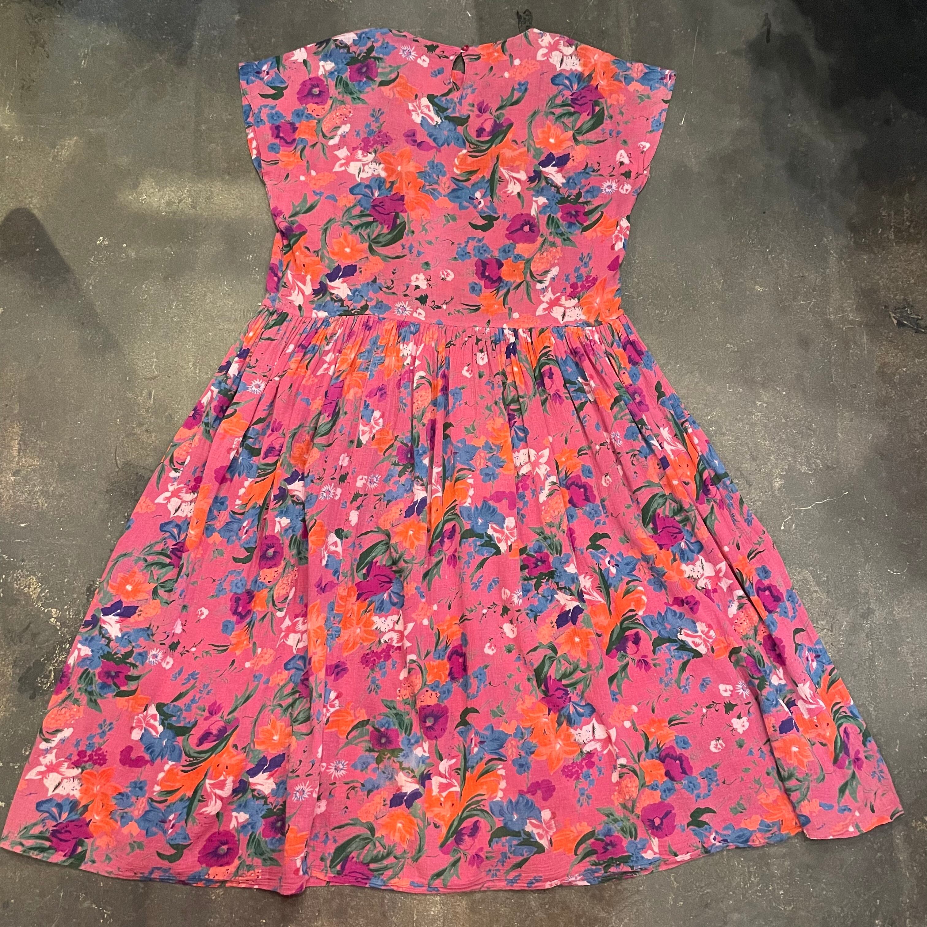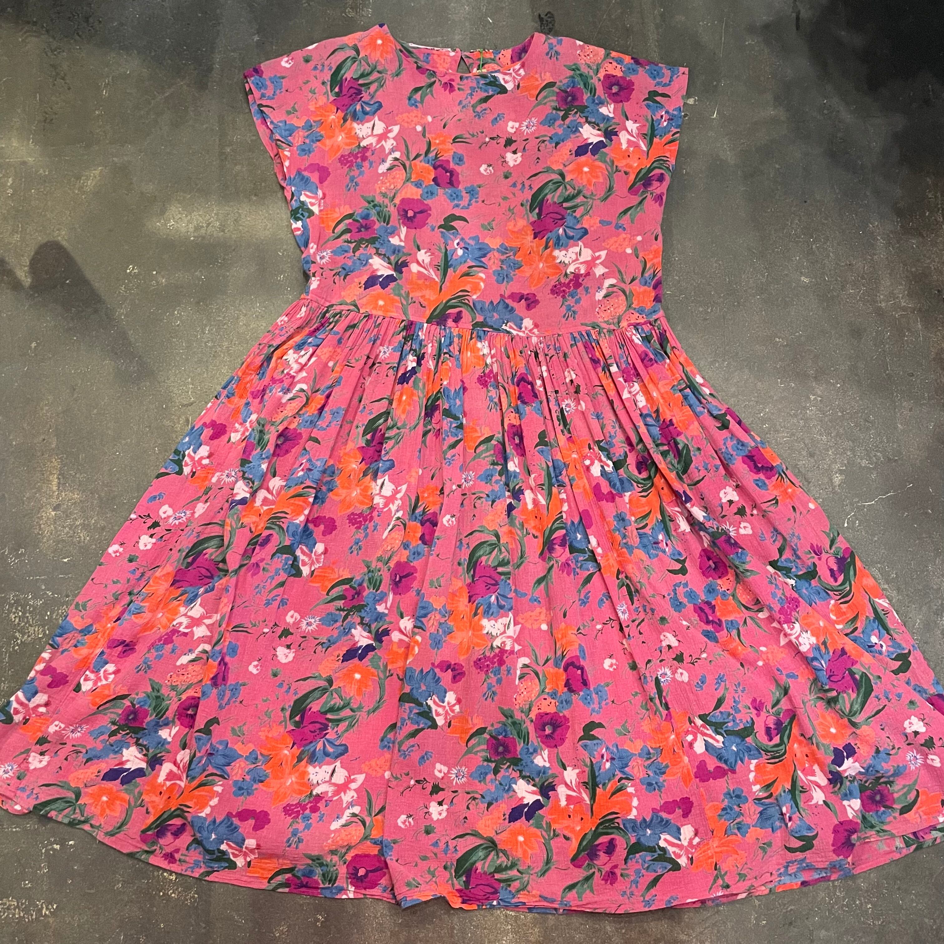 ゆったり緩いシルエットがかわいいワンピースです。ピンク地に青や紫、オレンジのお花の色味が包み紙のようなテキスタイルで、とても素敵な一枚です。