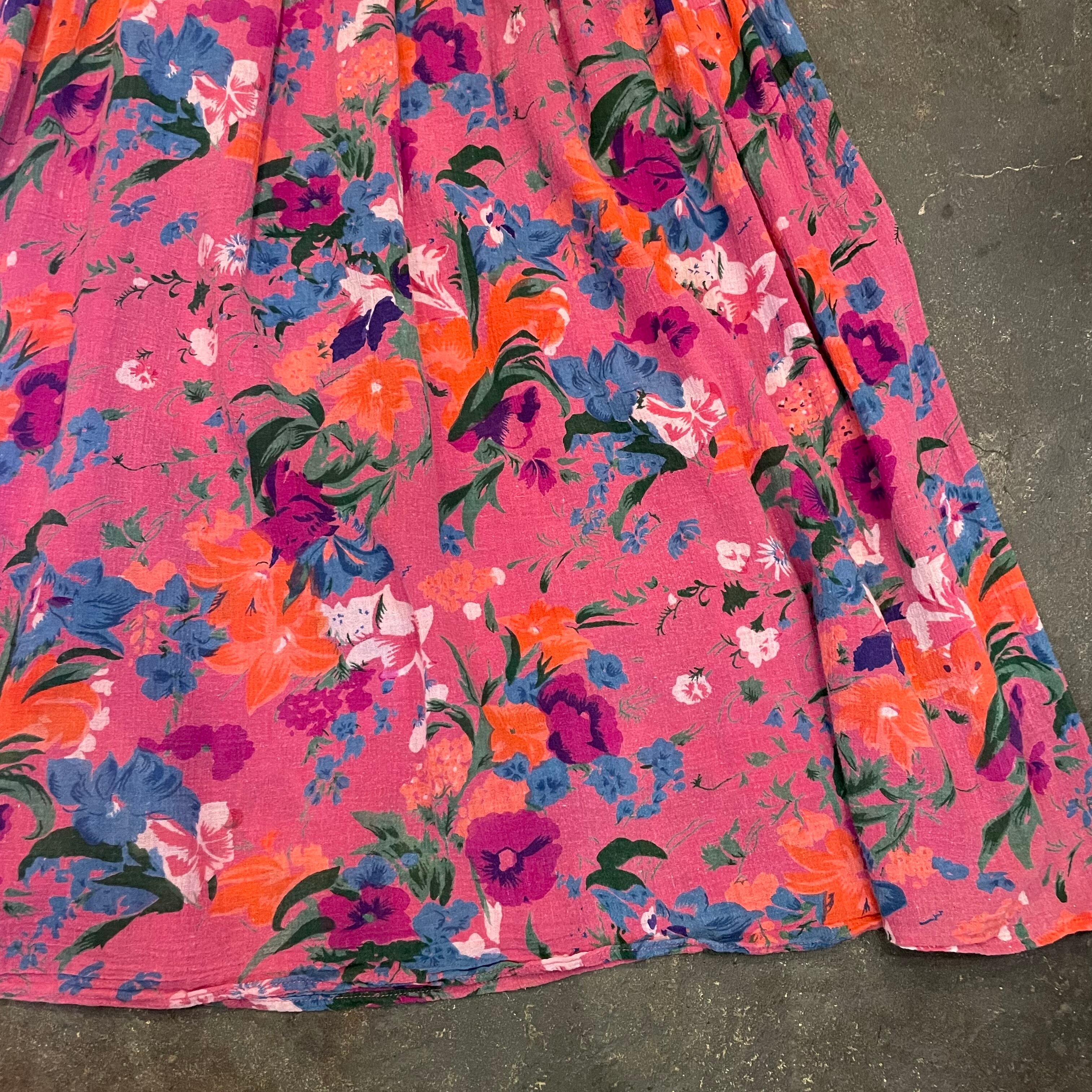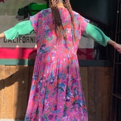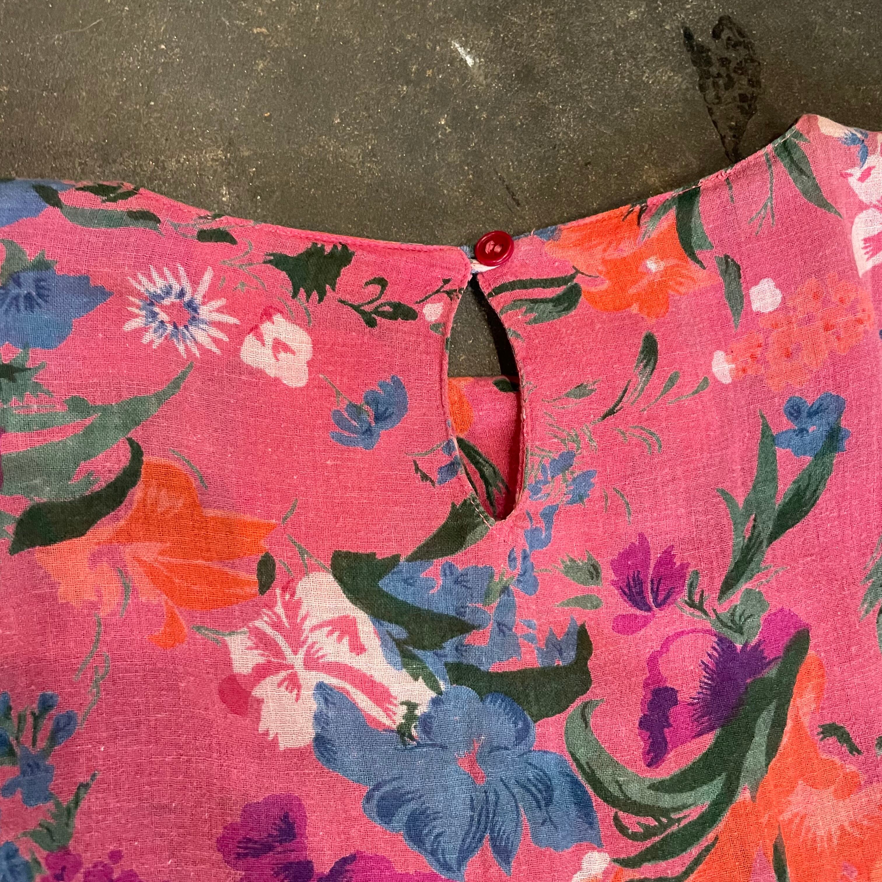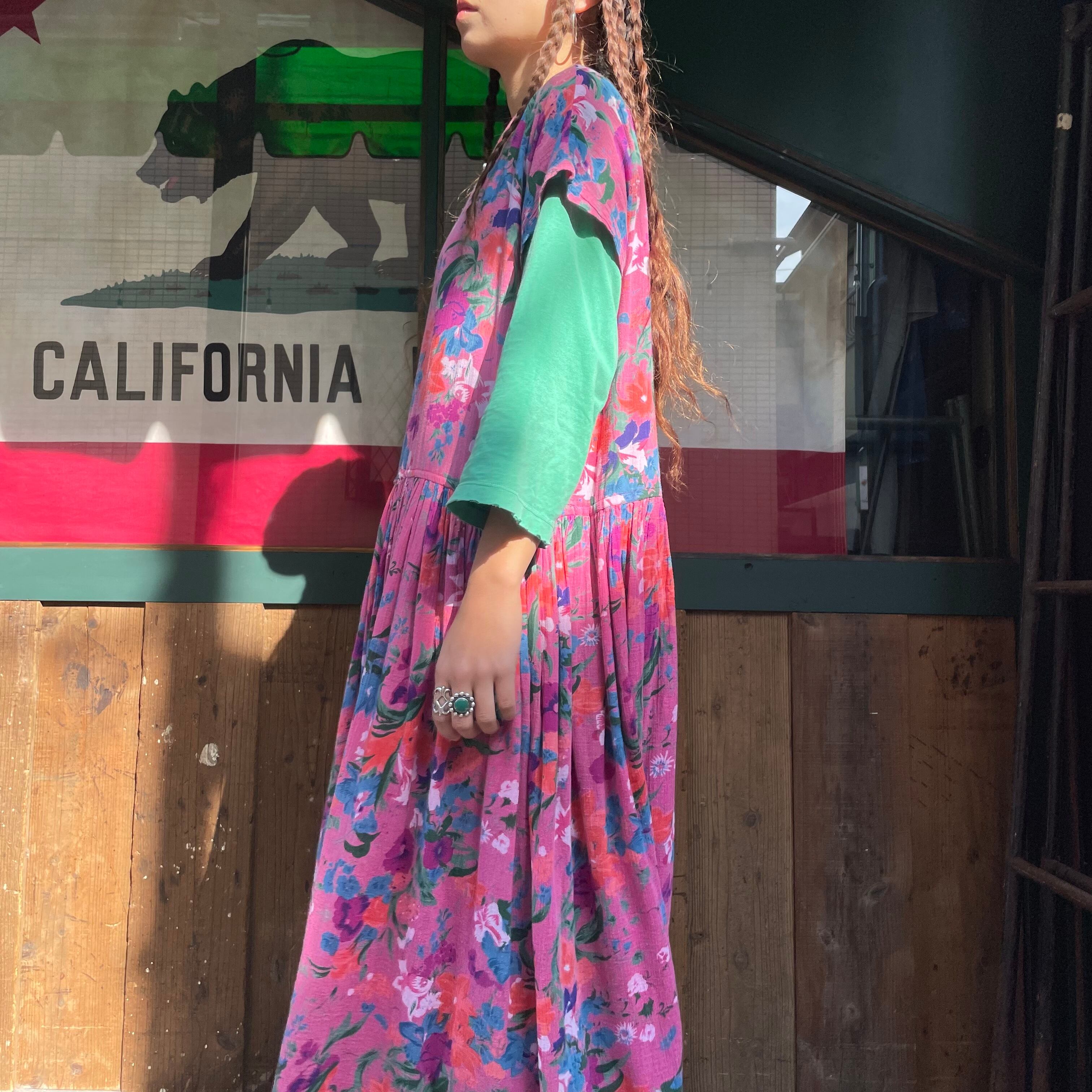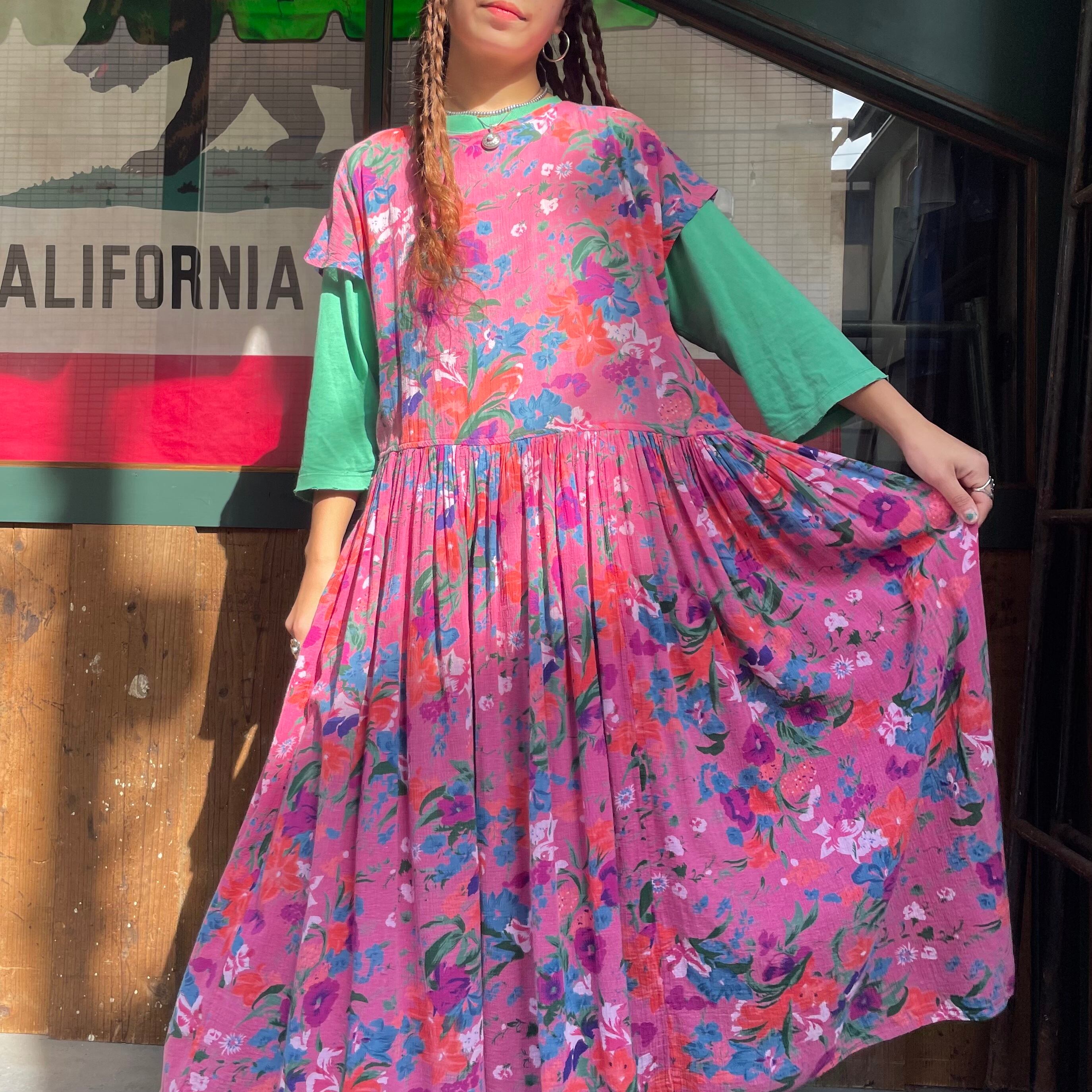 ゆったり緩いシルエットがかわいいワンピースです。ピンク地に青や紫、オレンジのお花の色味が包み紙のようなテキスタイルで、とても素敵な一枚です。