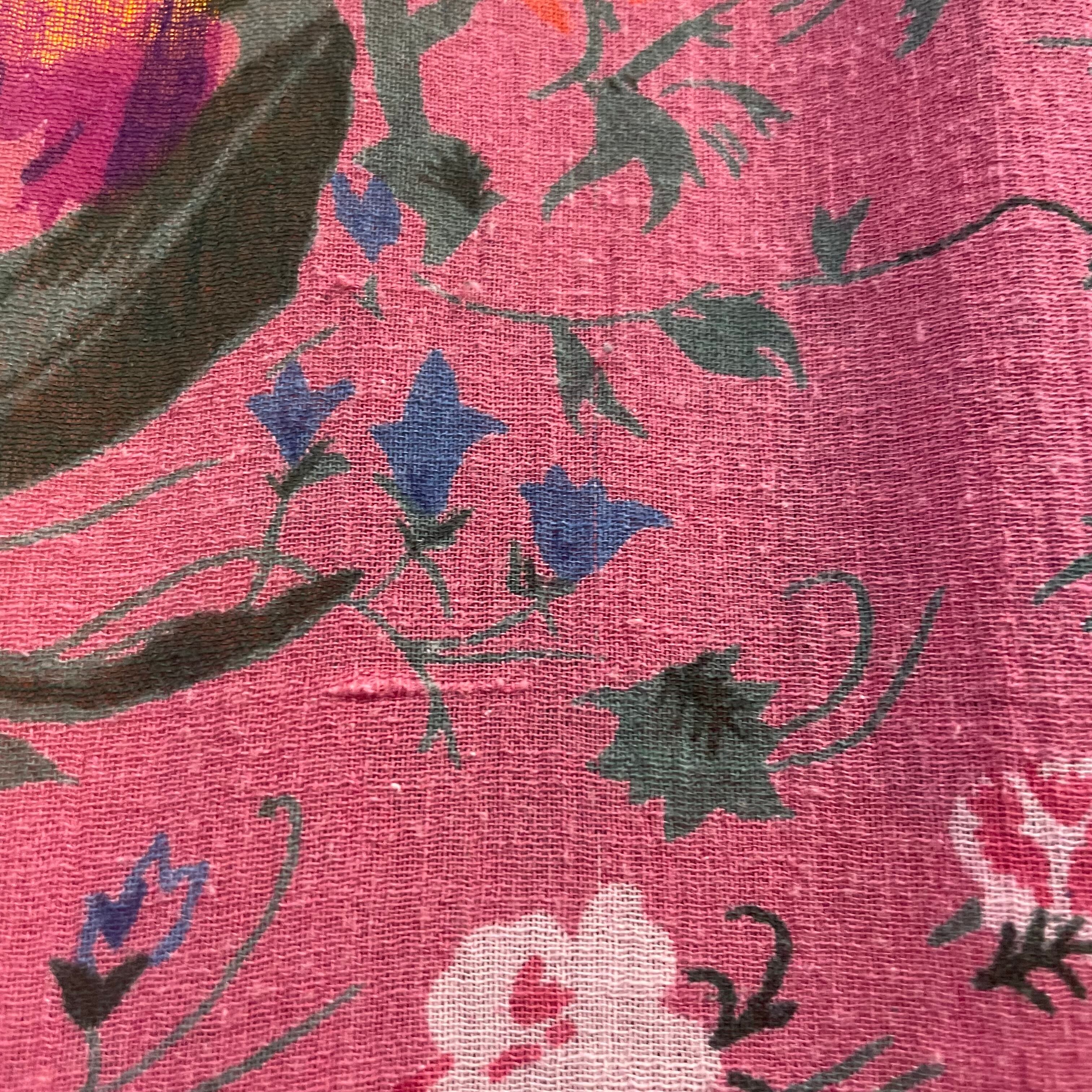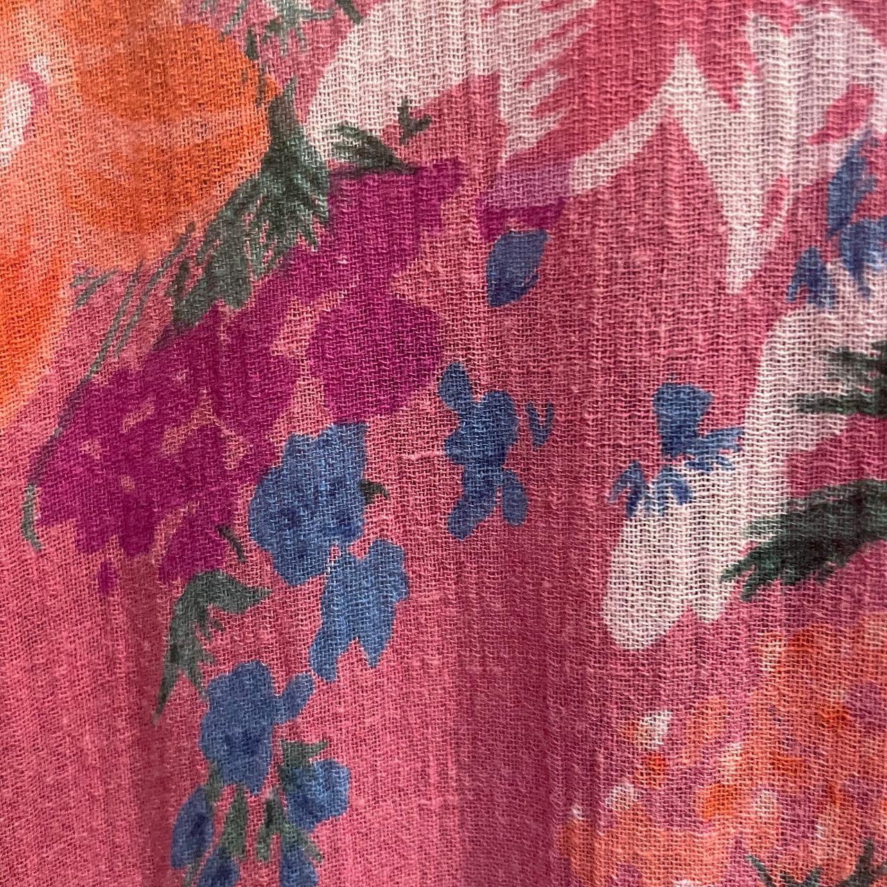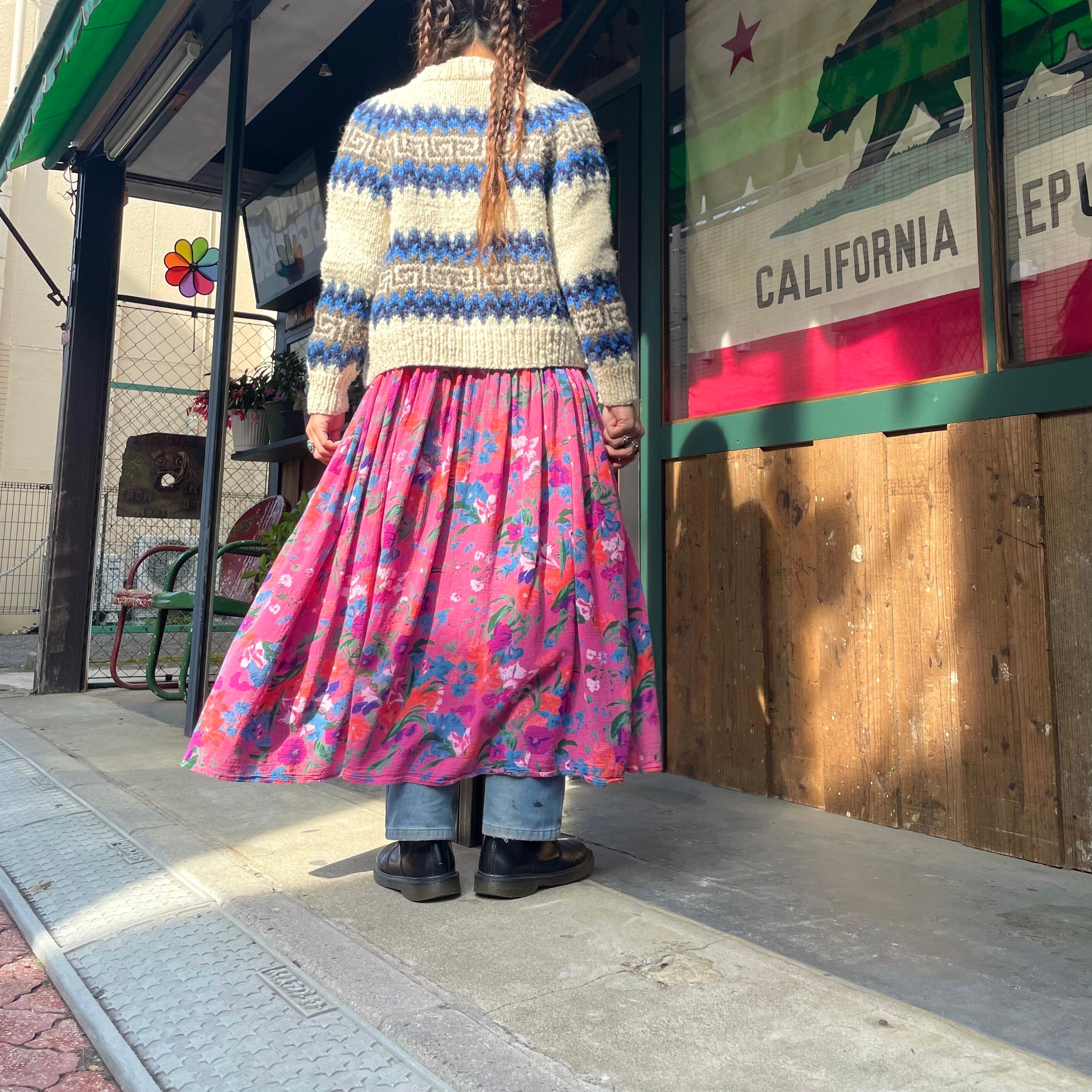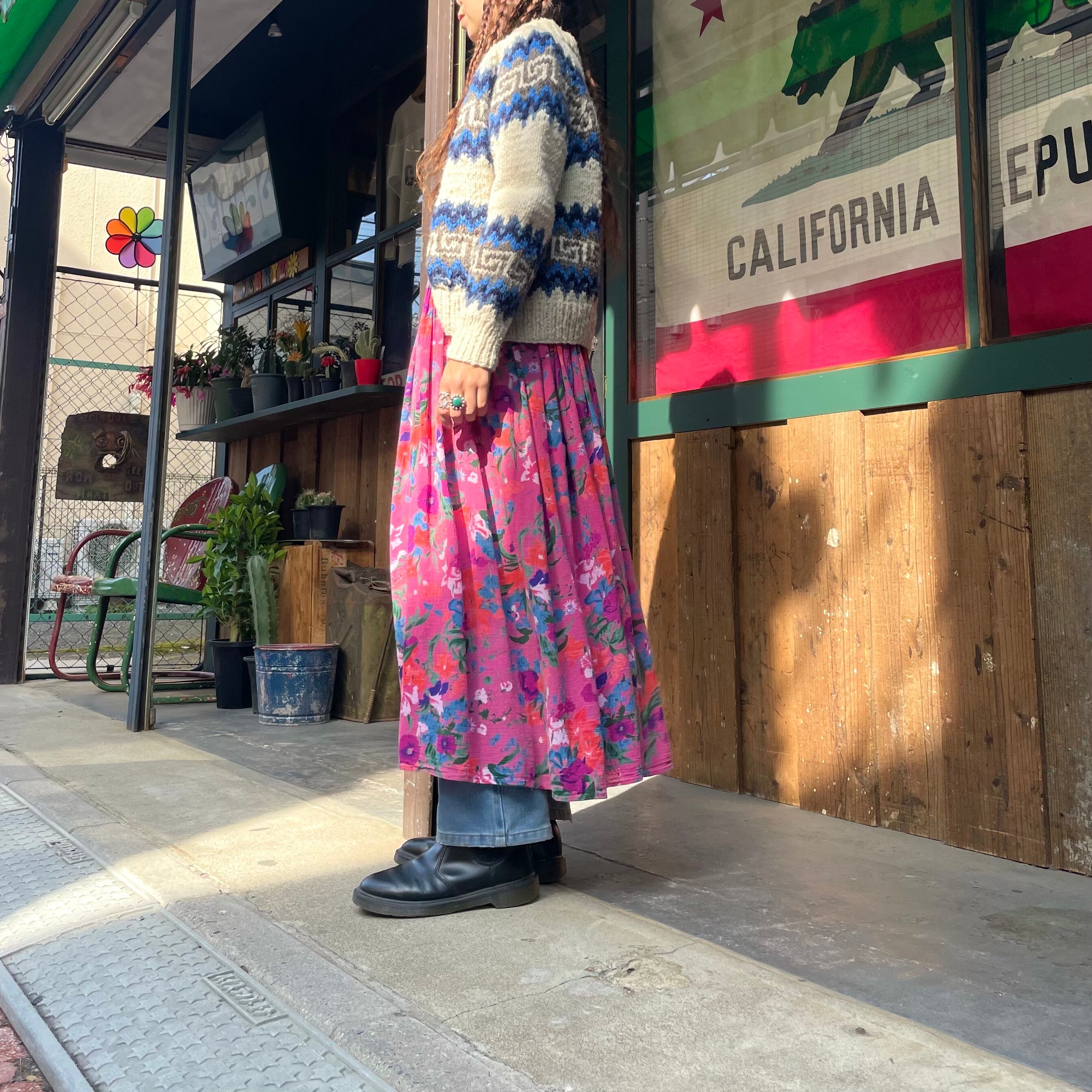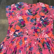 ゆったり緩いシルエットがかわいいワンピースです。ピンク地に青や紫、オレンジのお花の色味が包み紙のようなテキスタイルで、とても素敵な一枚です。