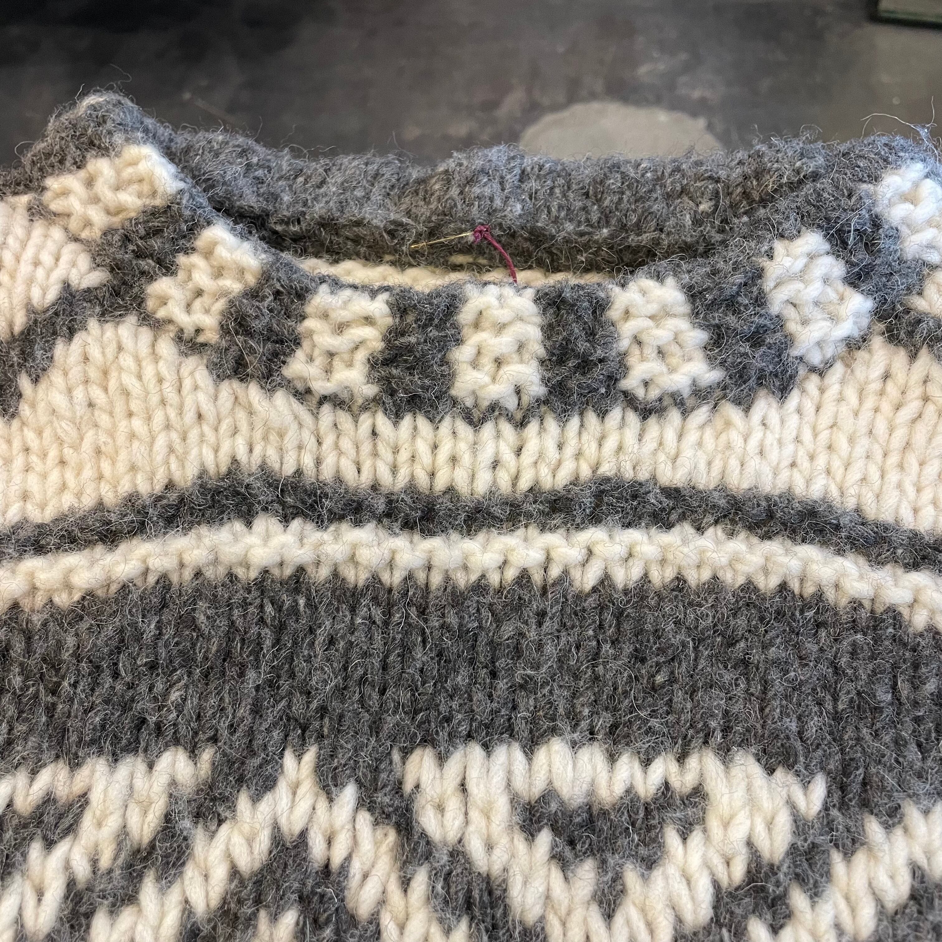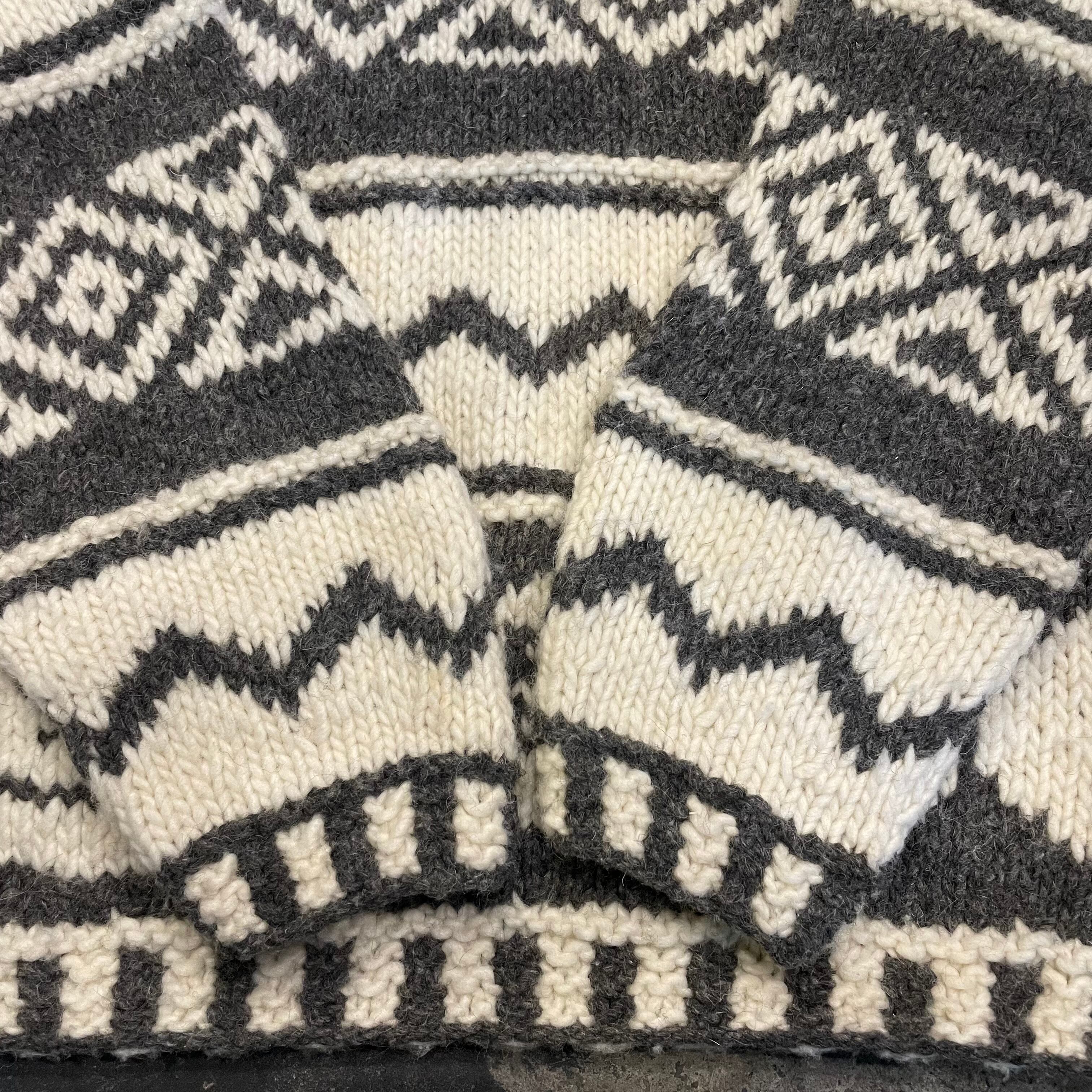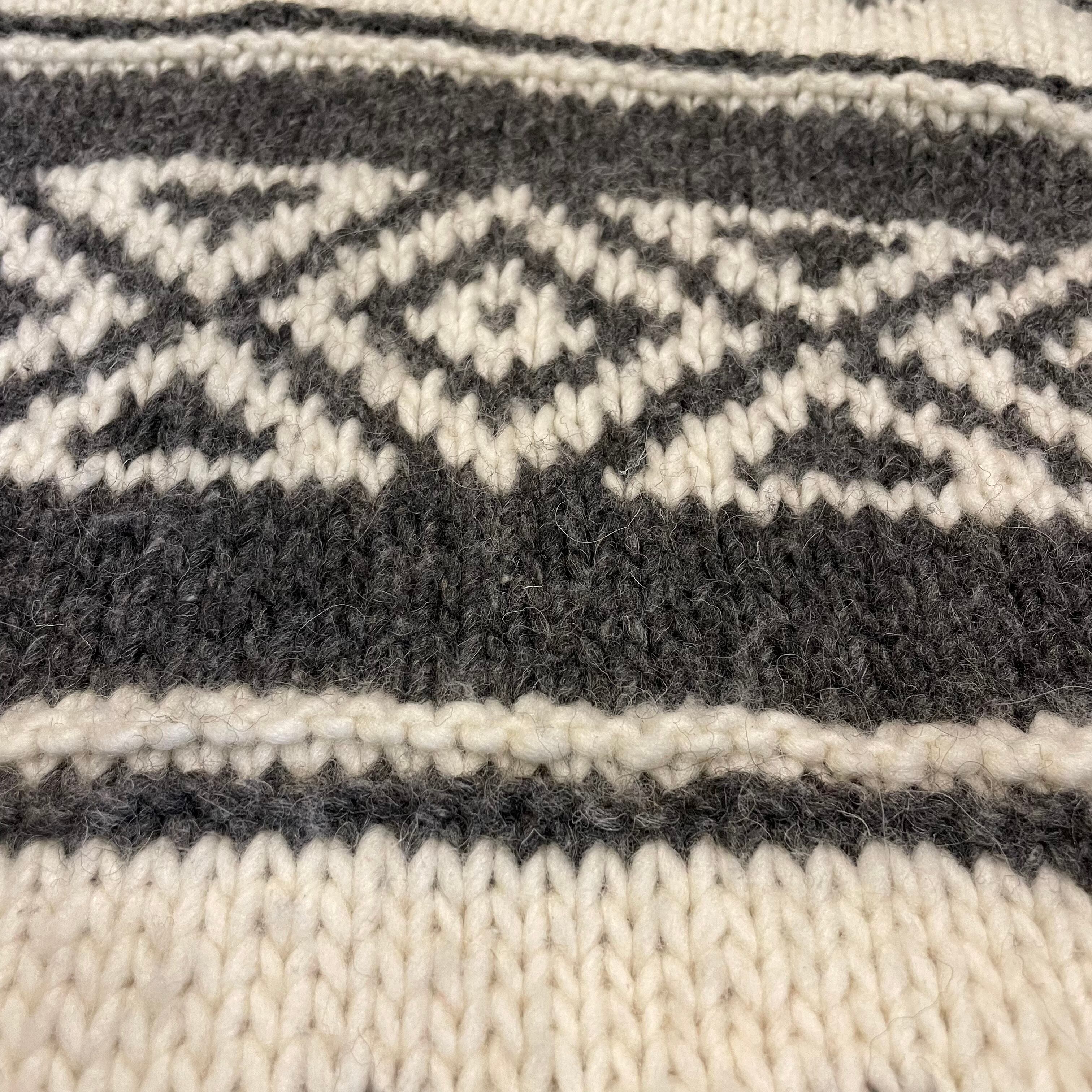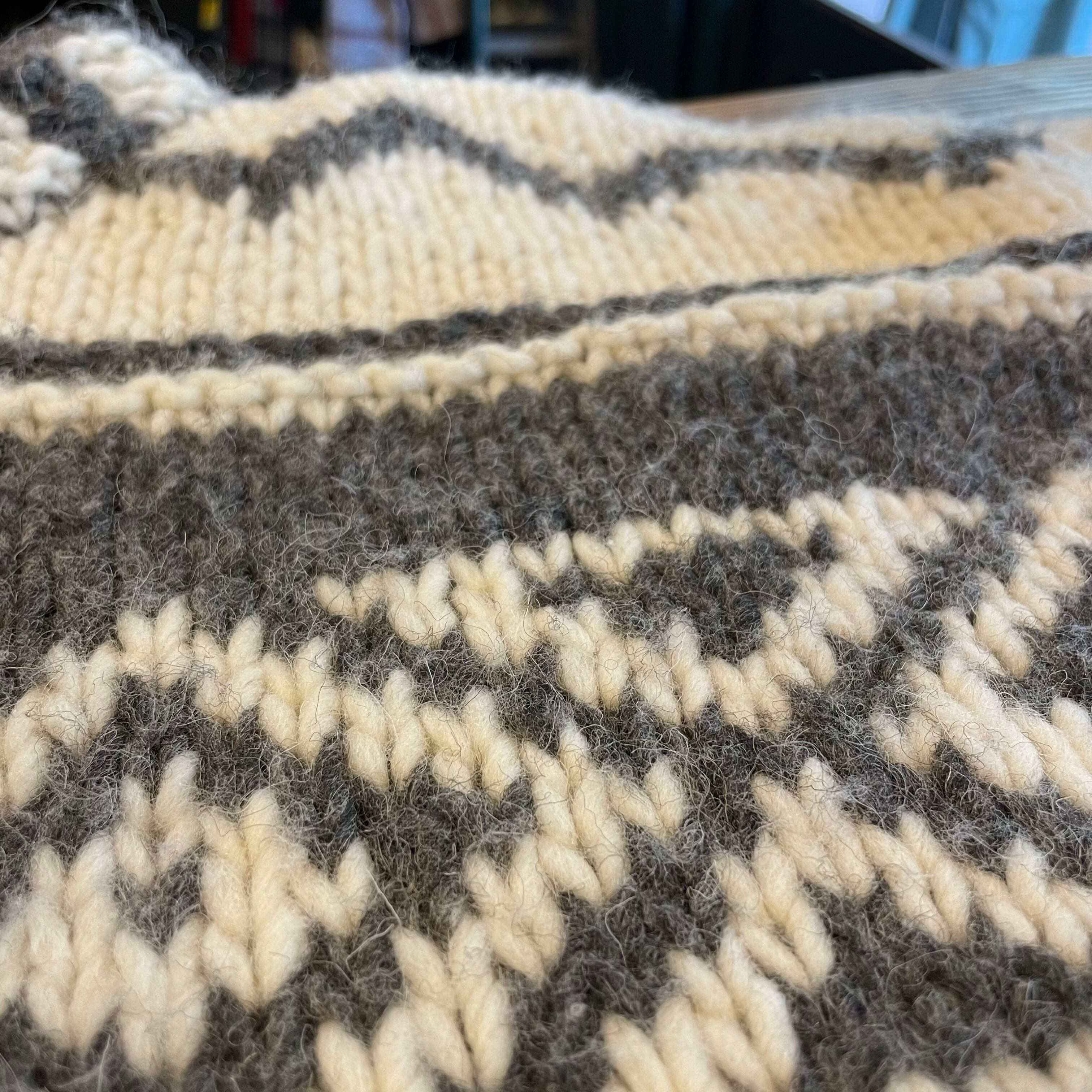 シンプルな色合いですが、ギザギザ、シマシマ、いろんな模様が編まれていて個性的な一枚です。