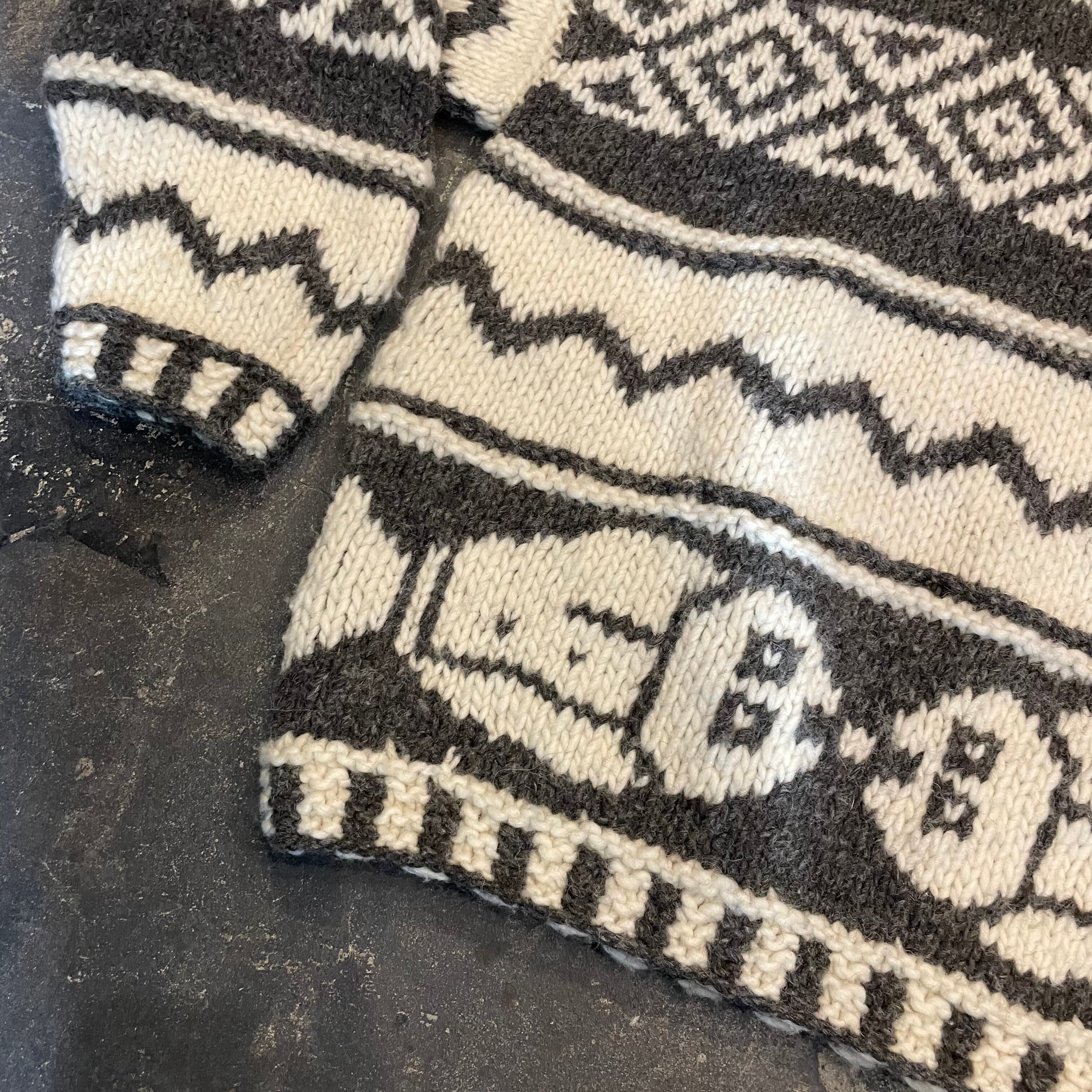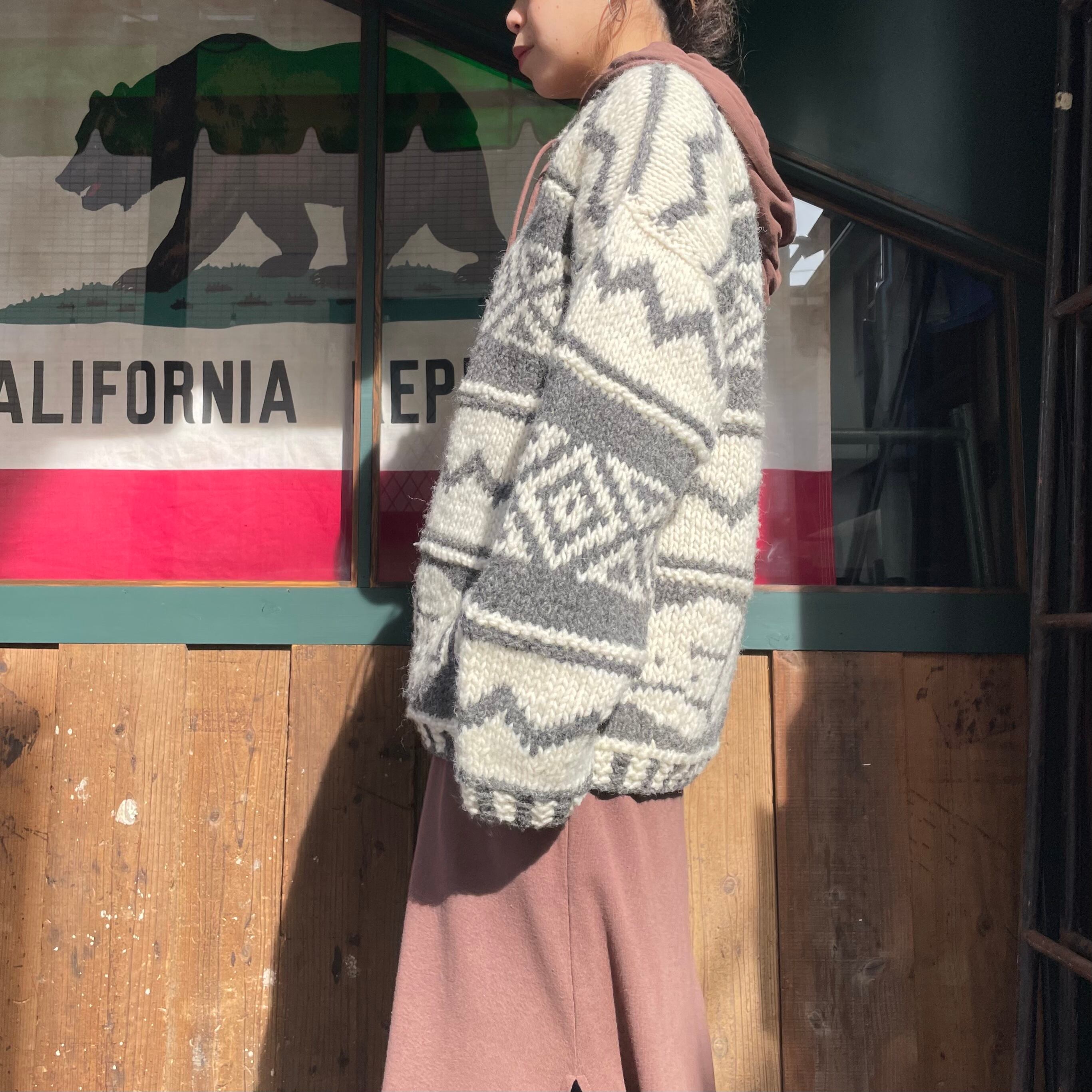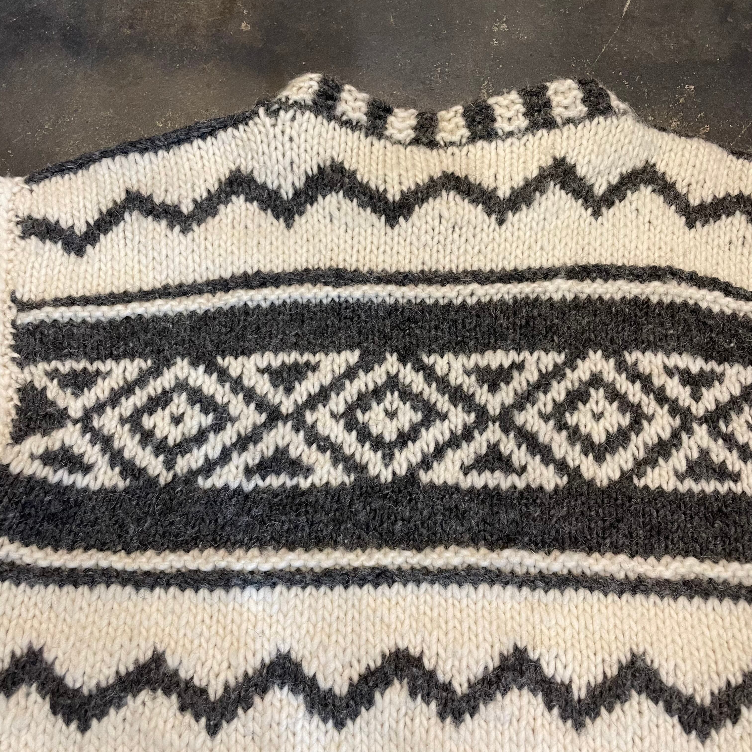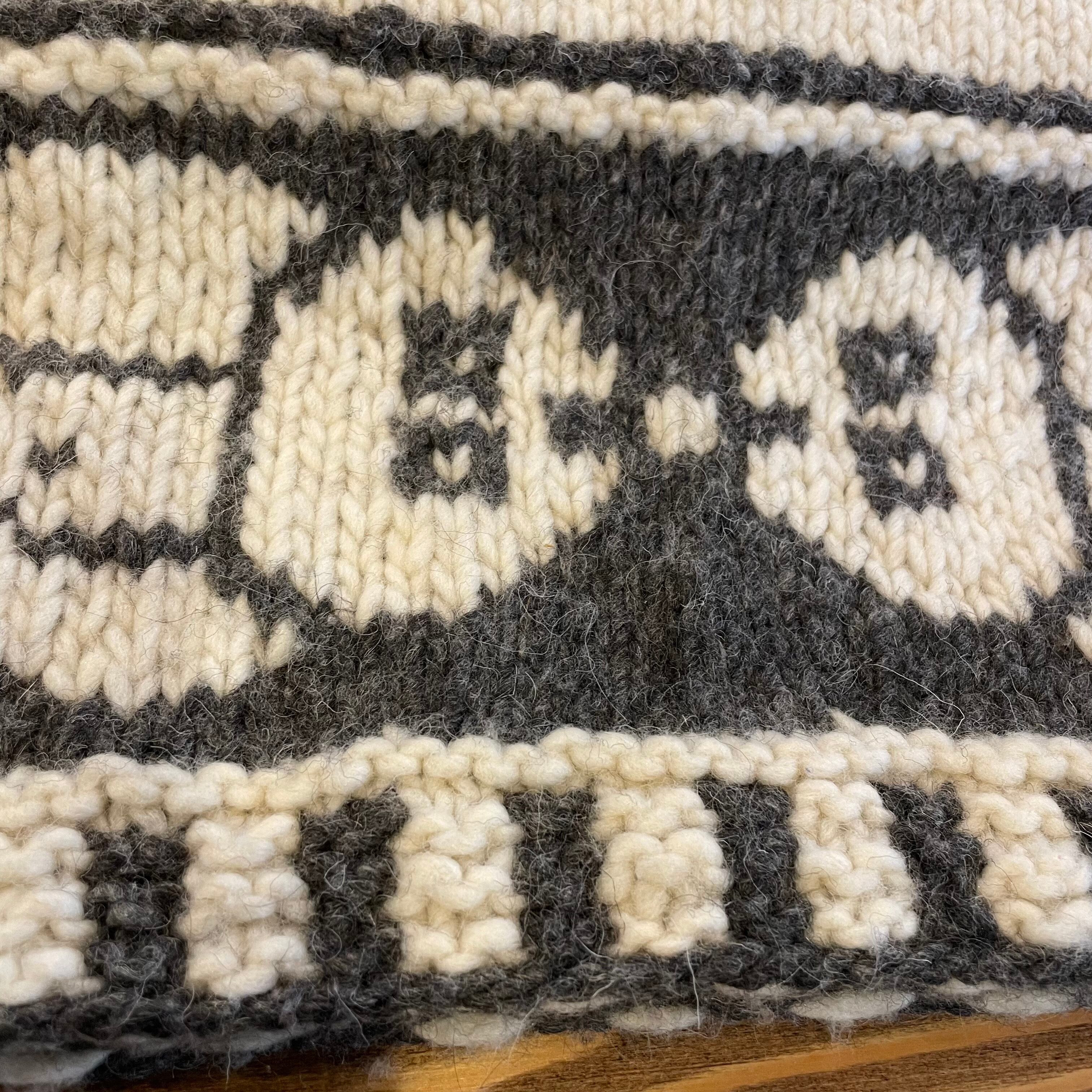 シンプルな色合いですが、ギザギザ、シマシマ、いろんな模様が編まれていて個性的な一枚です。