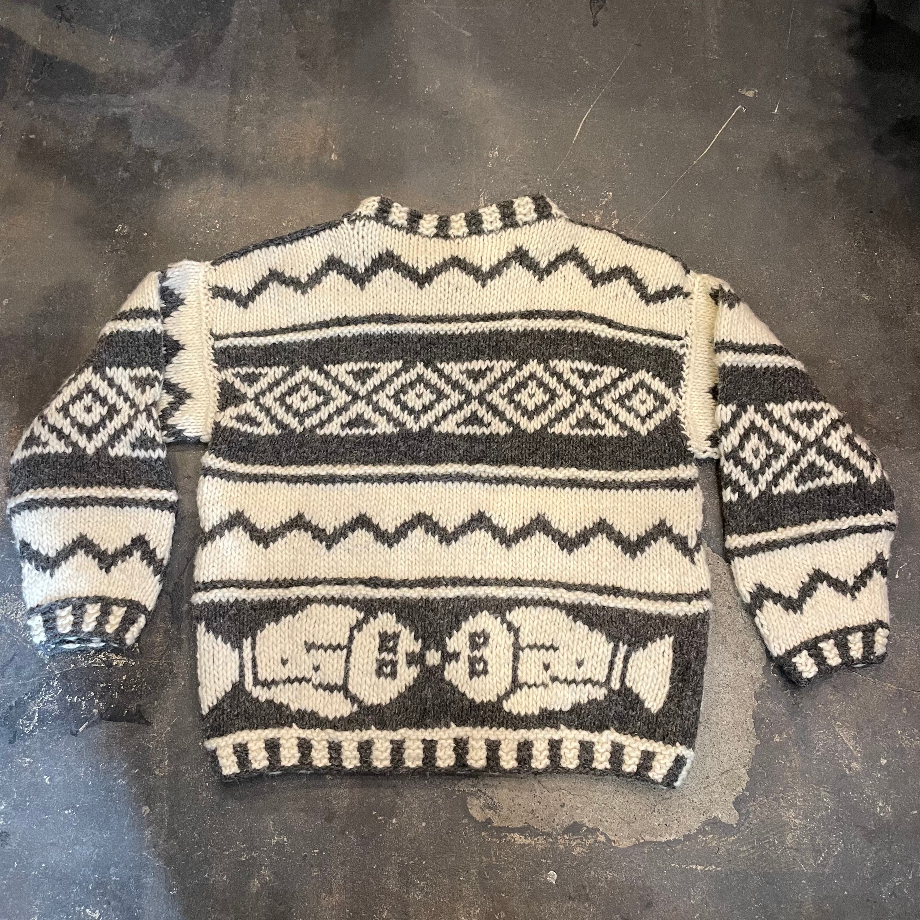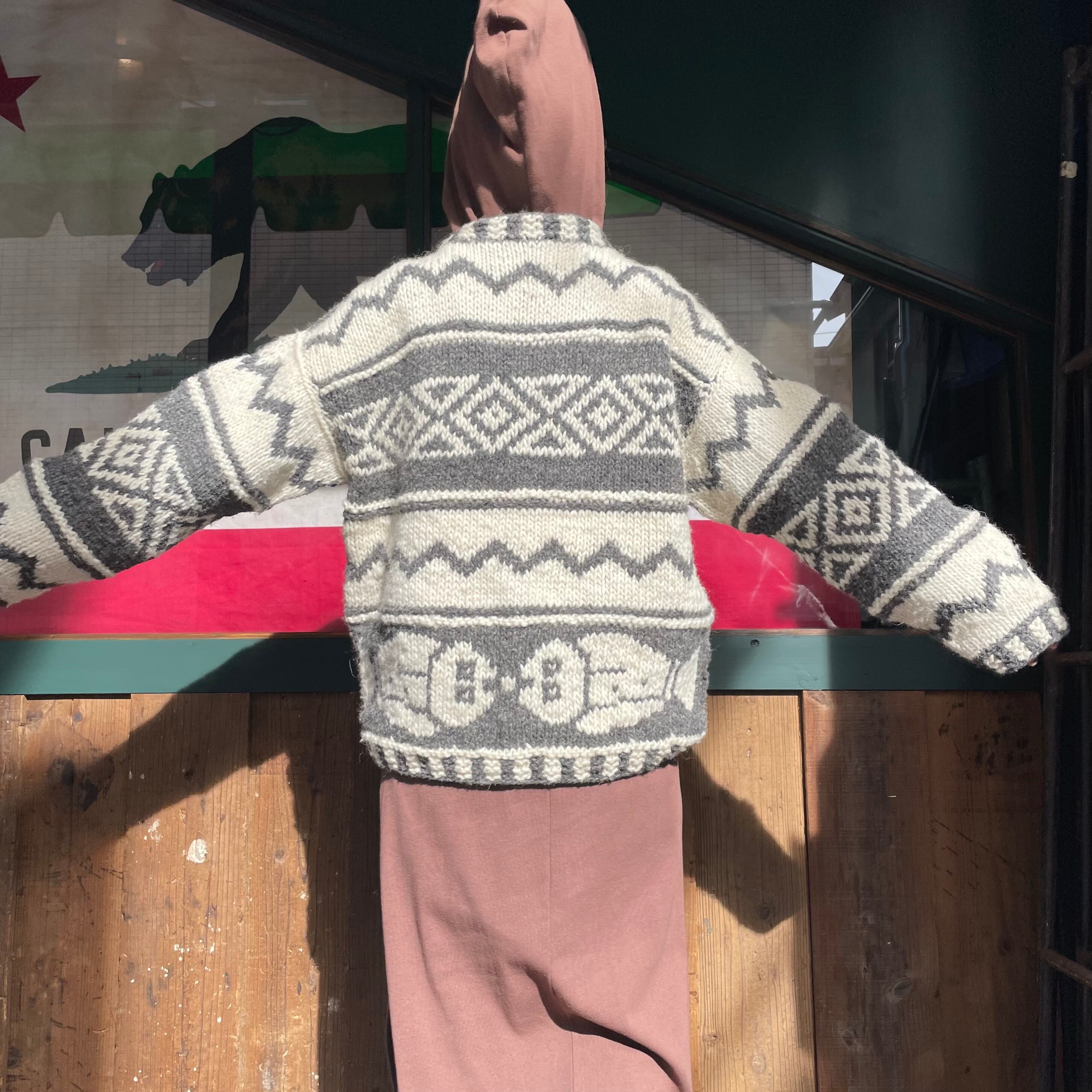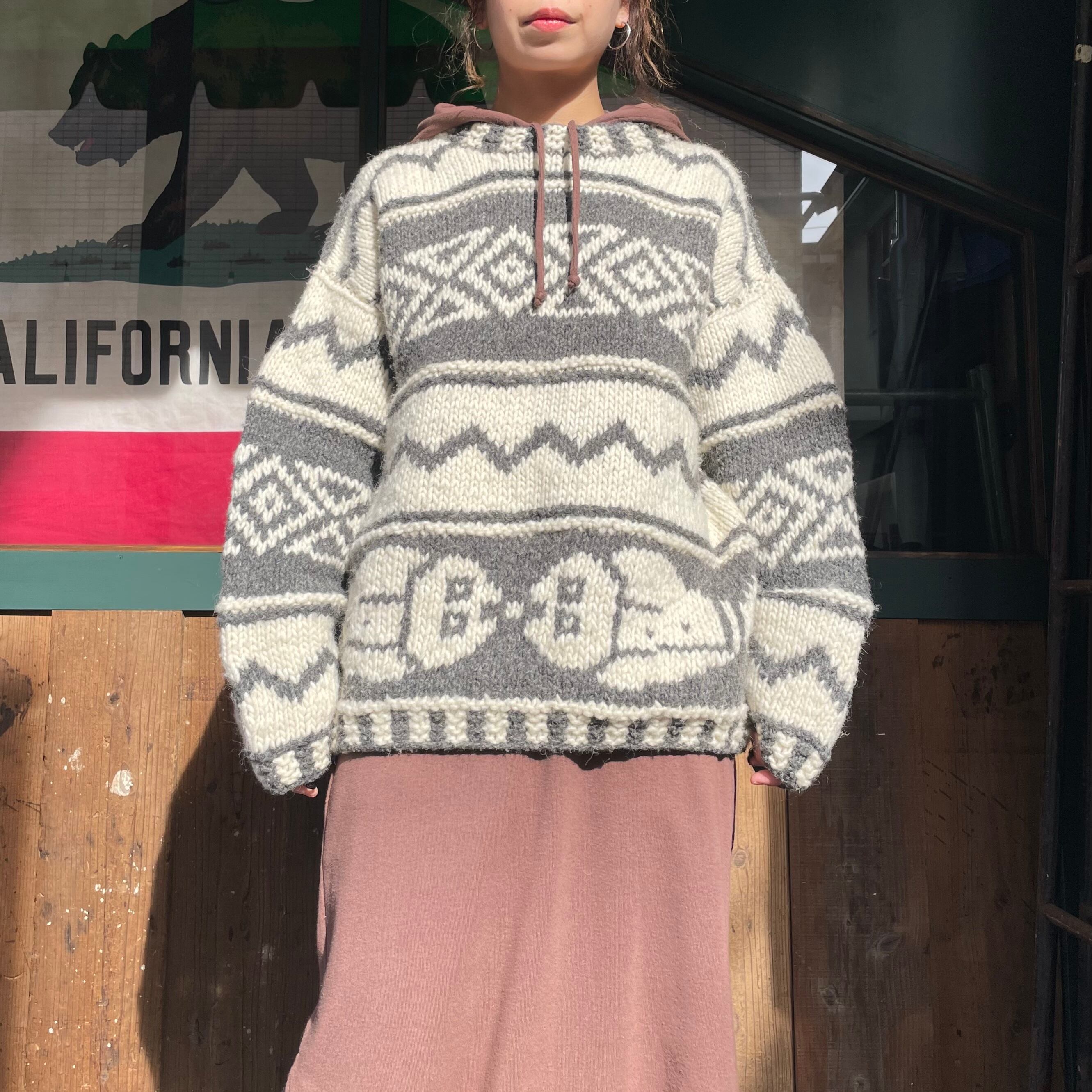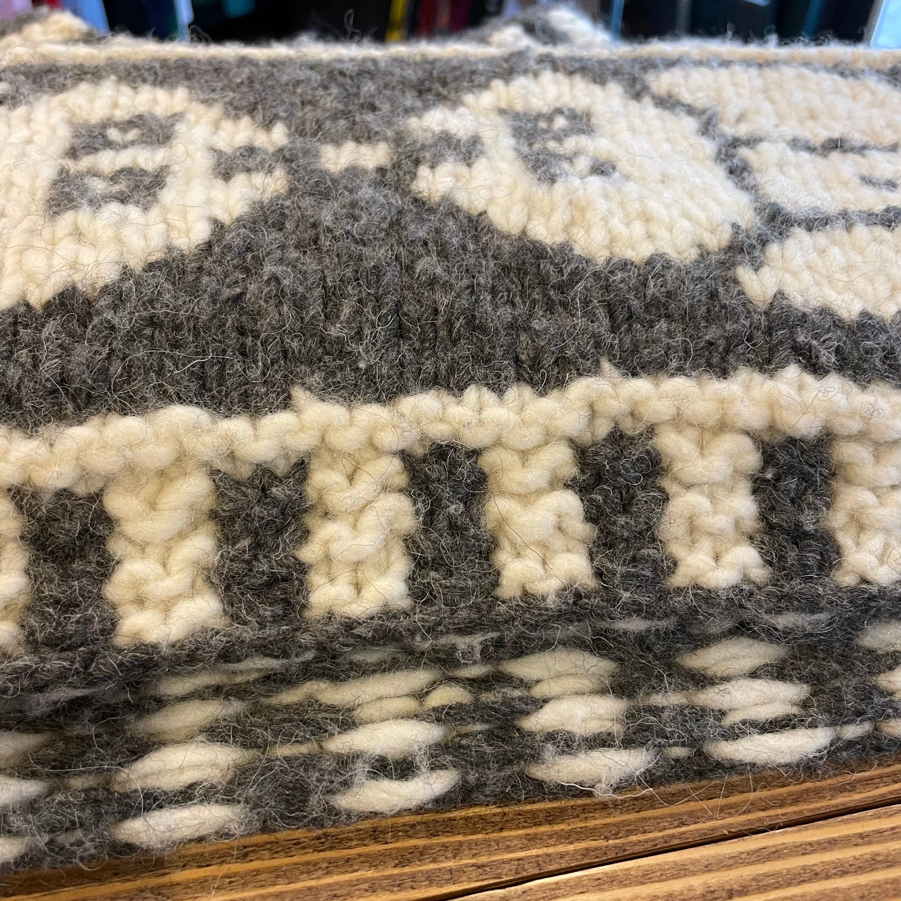 シンプルな色合いですが、ギザギザ、シマシマ、いろんな模様が編まれていて個性的な一枚です。