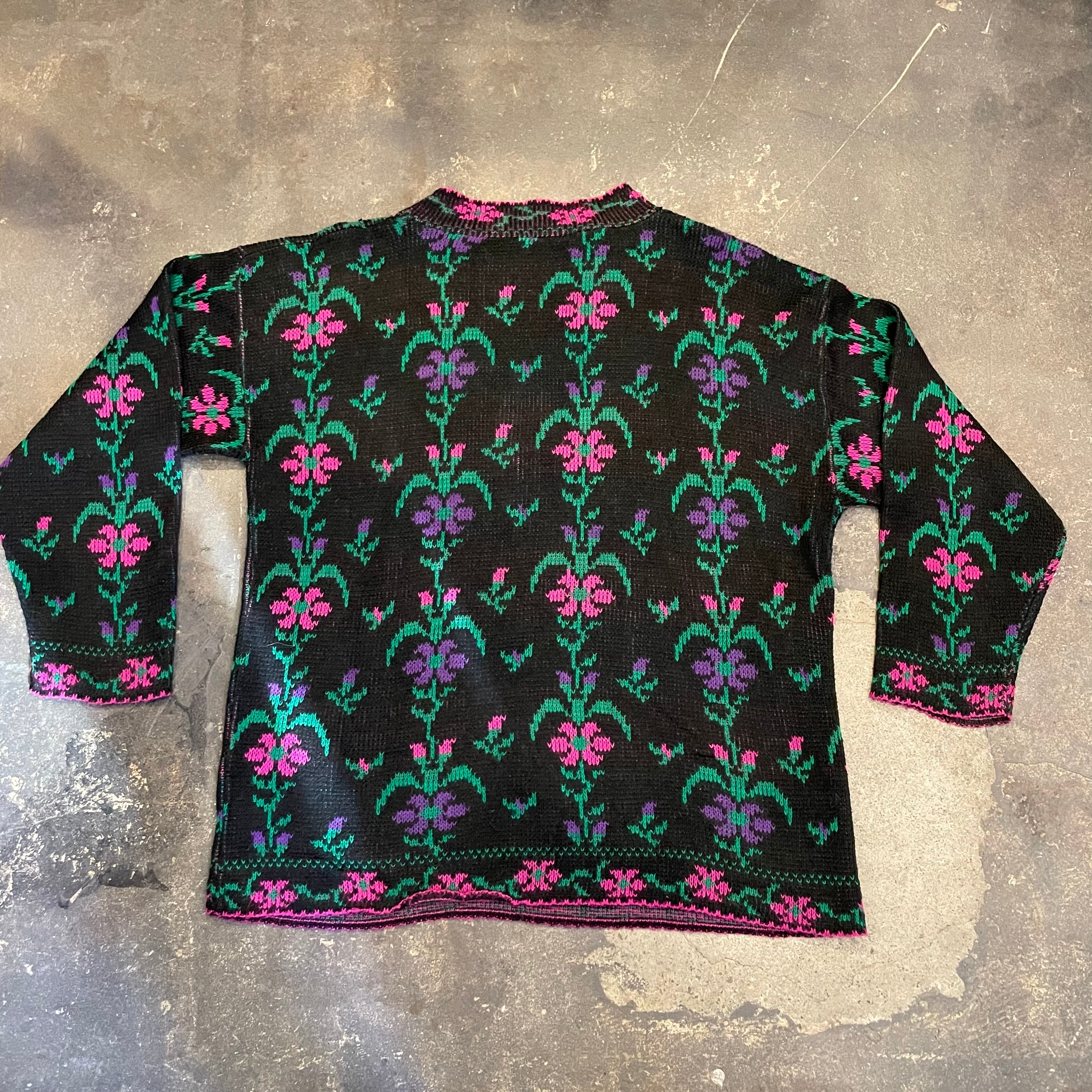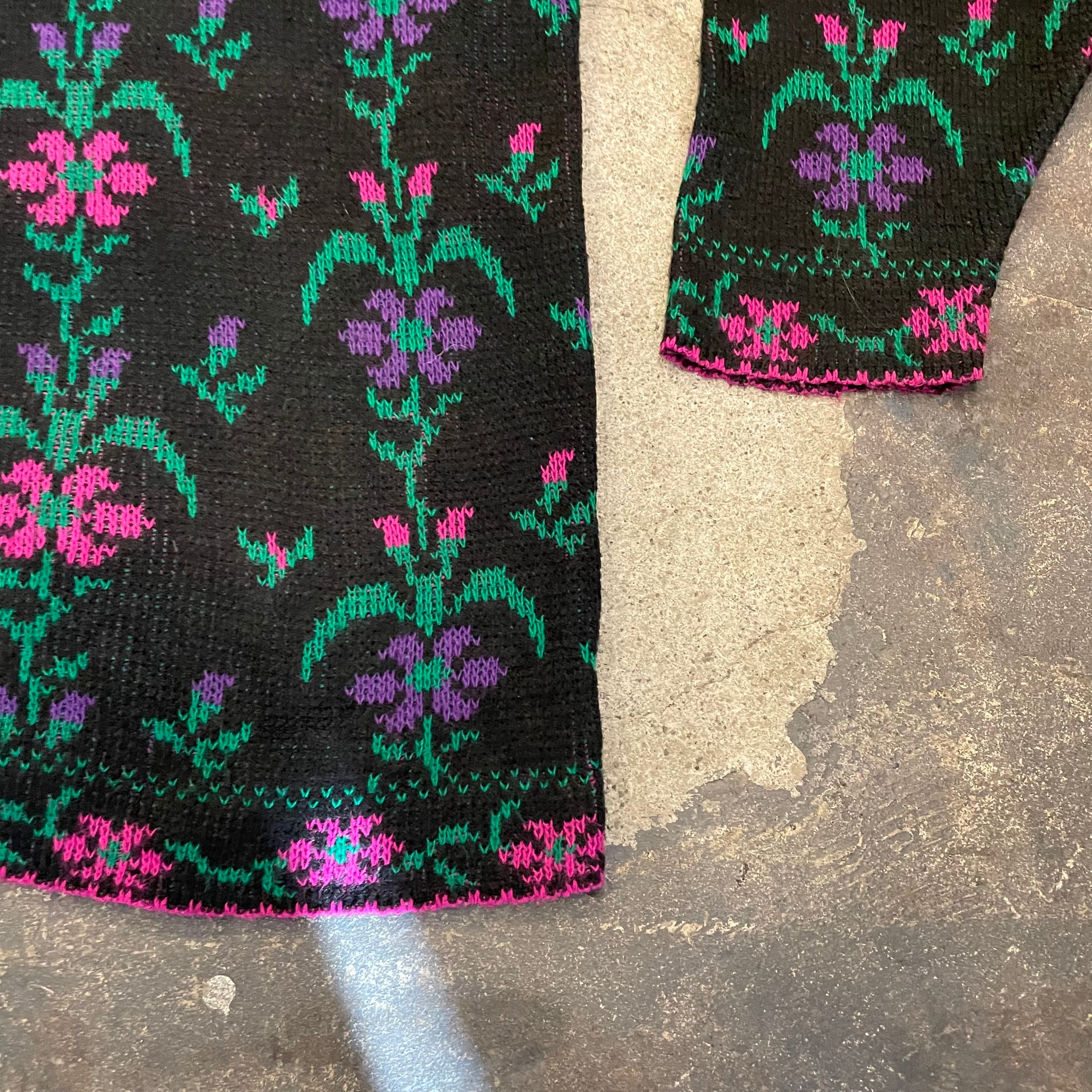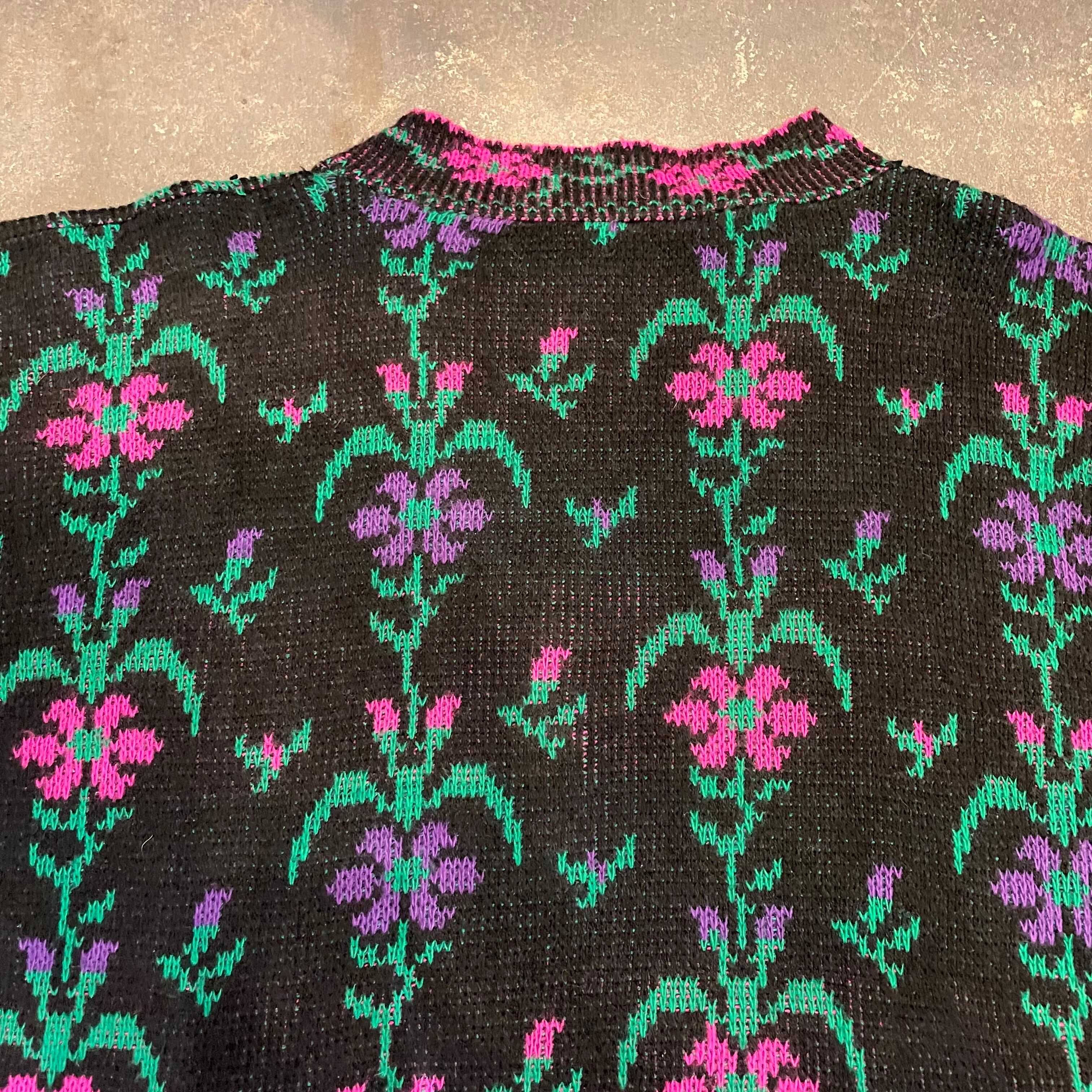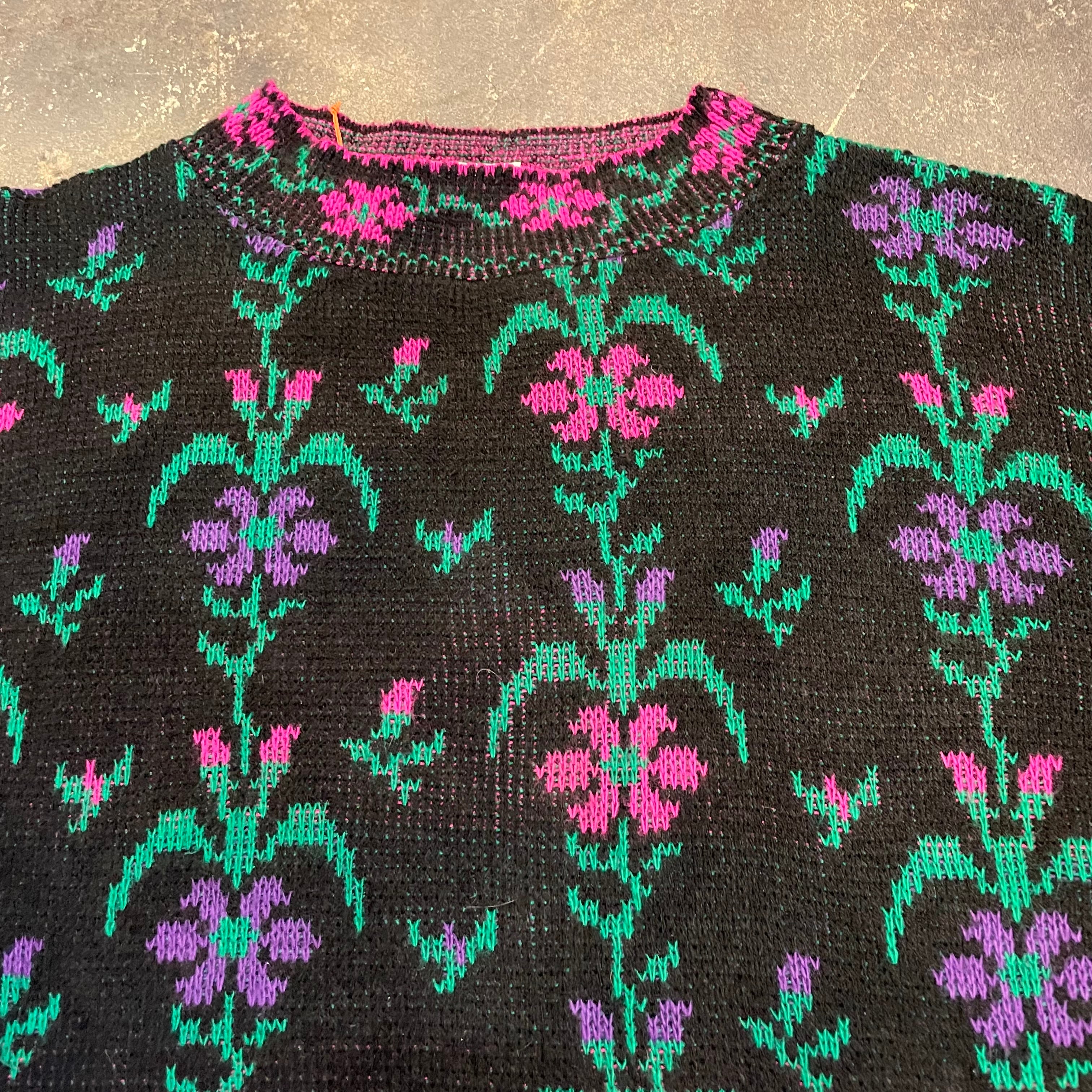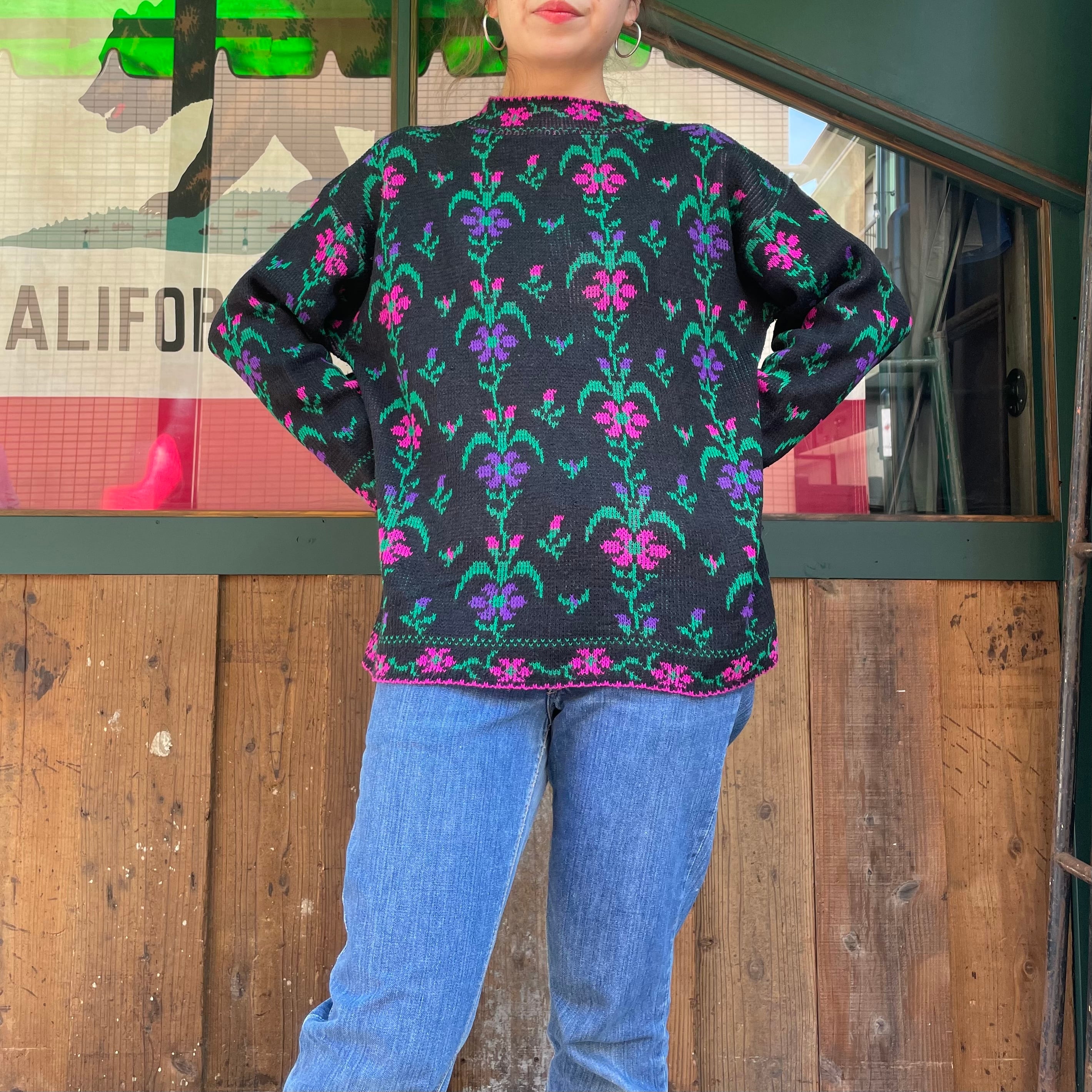 黒地に紫とピンクの花柄がかわいいアクリル素材のセーターです。