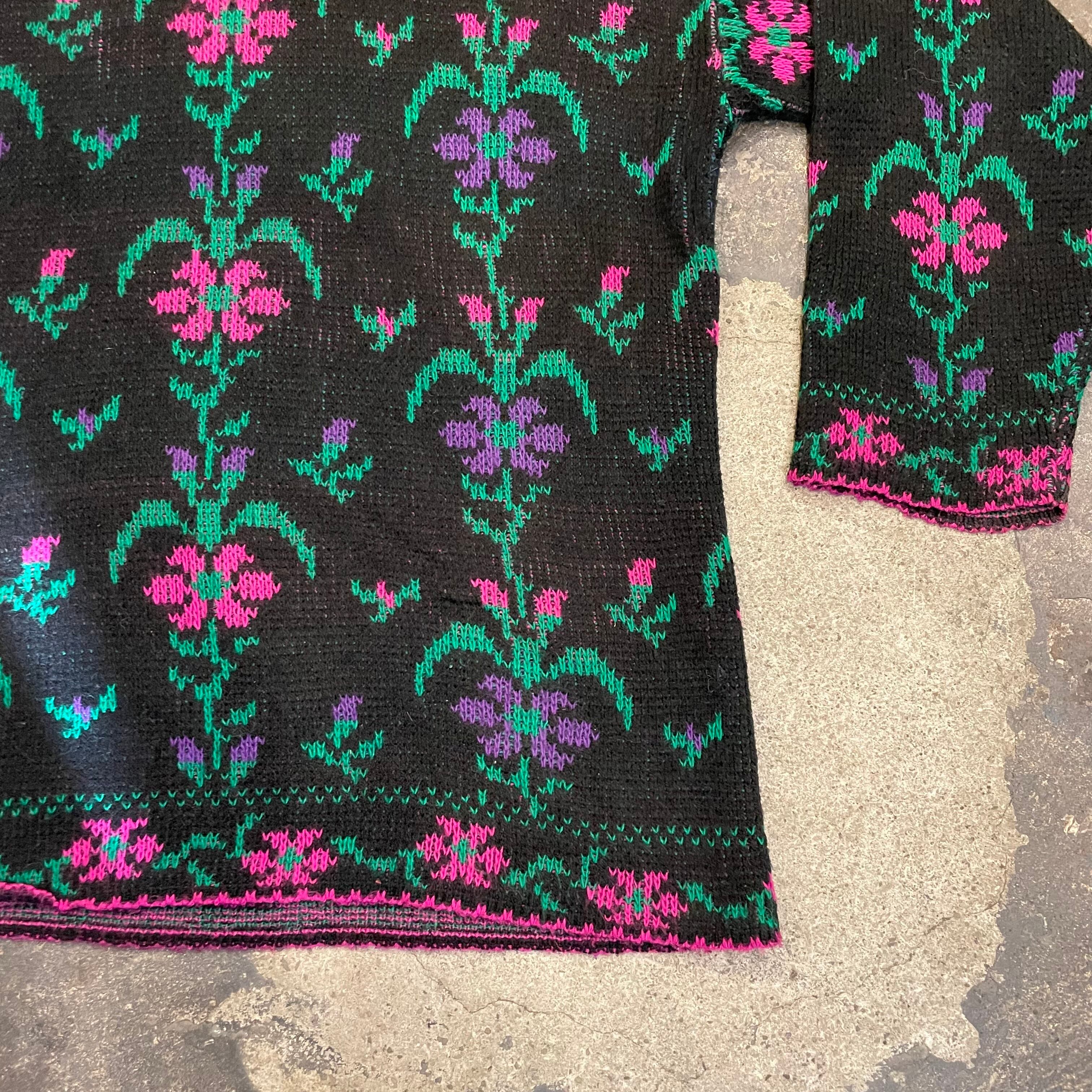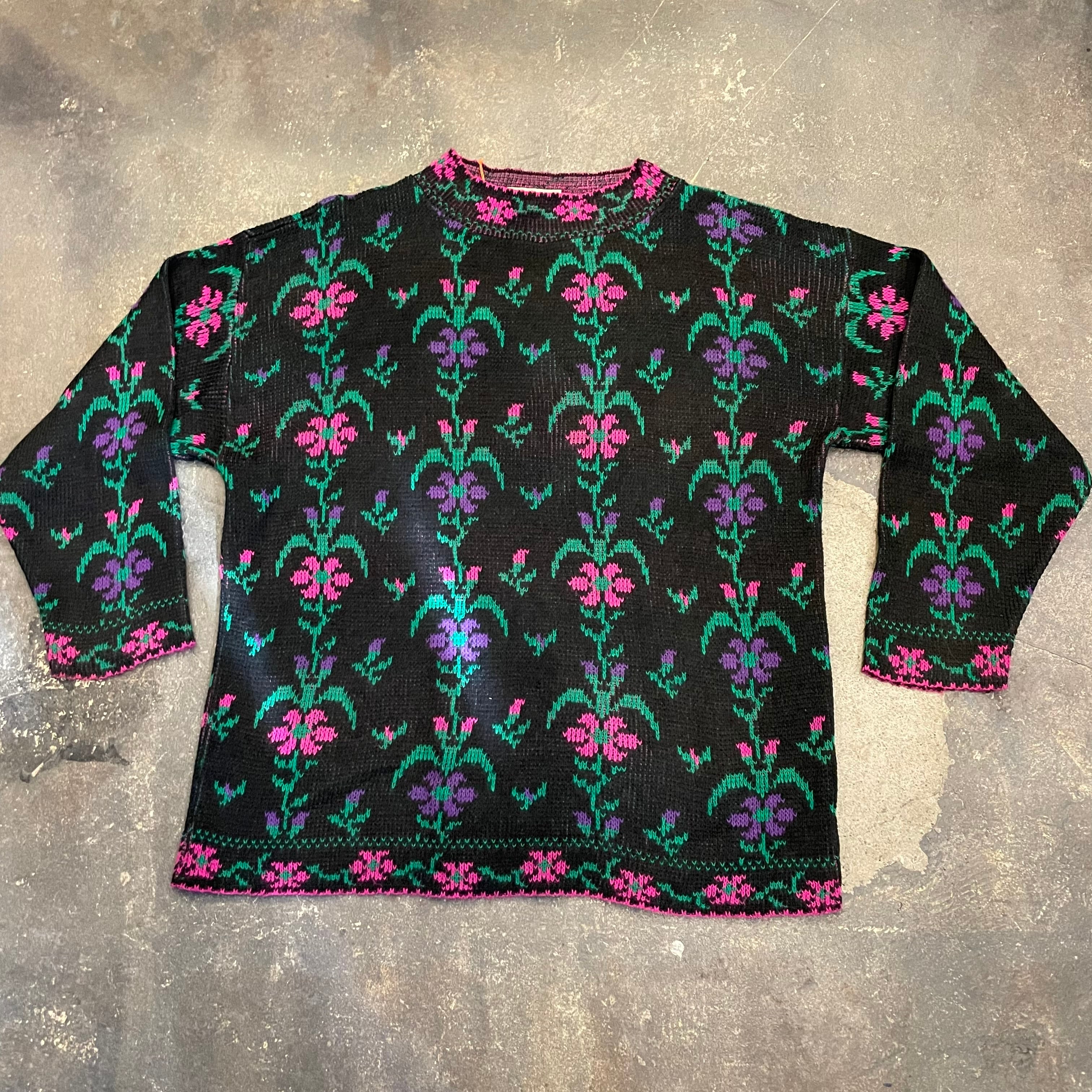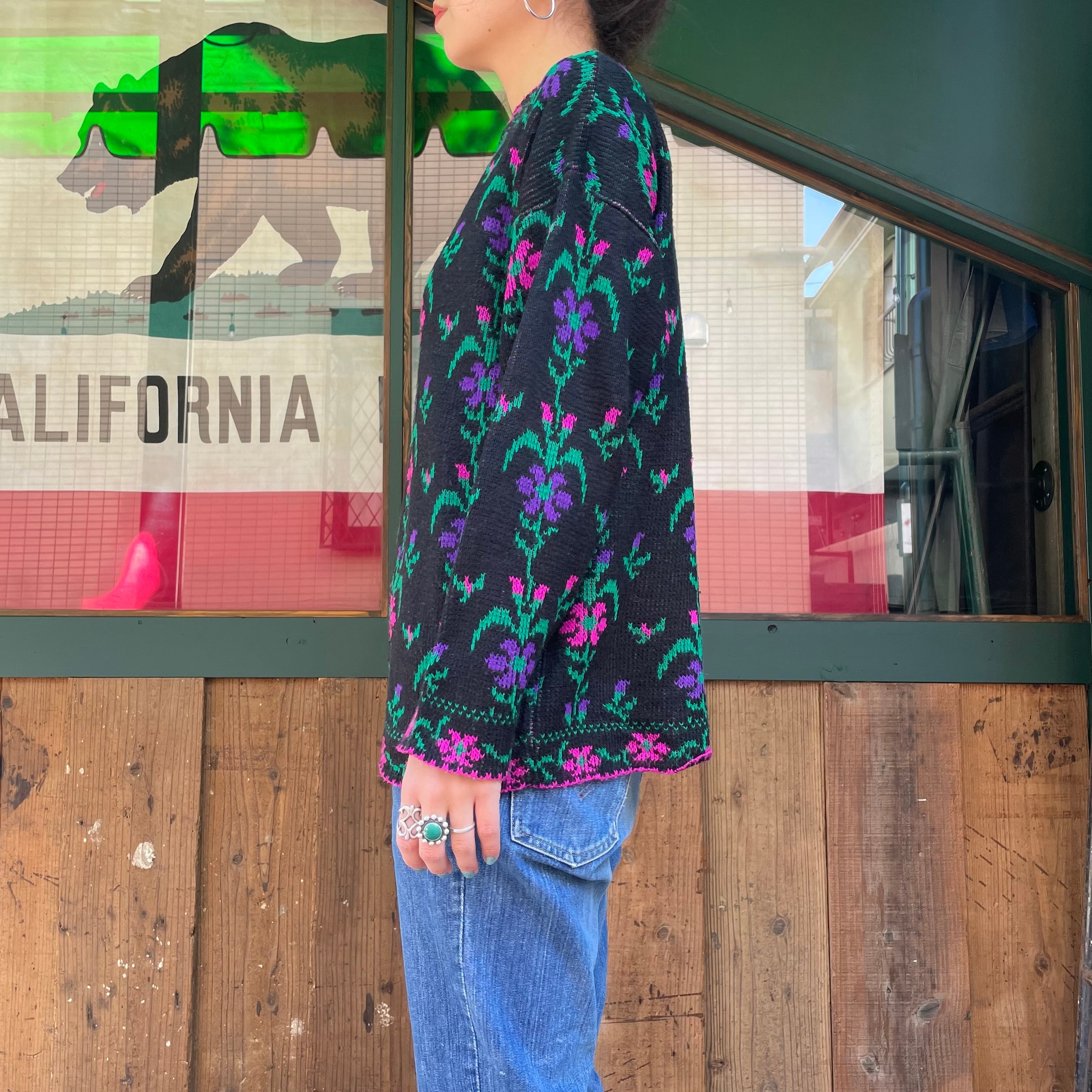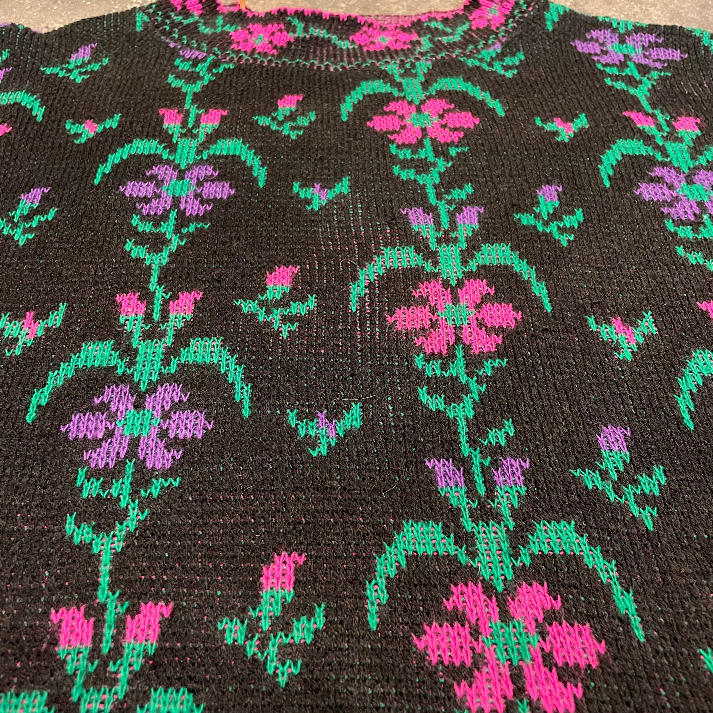 黒地に紫とピンクの花柄がかわいいアクリル素材のセーターです。