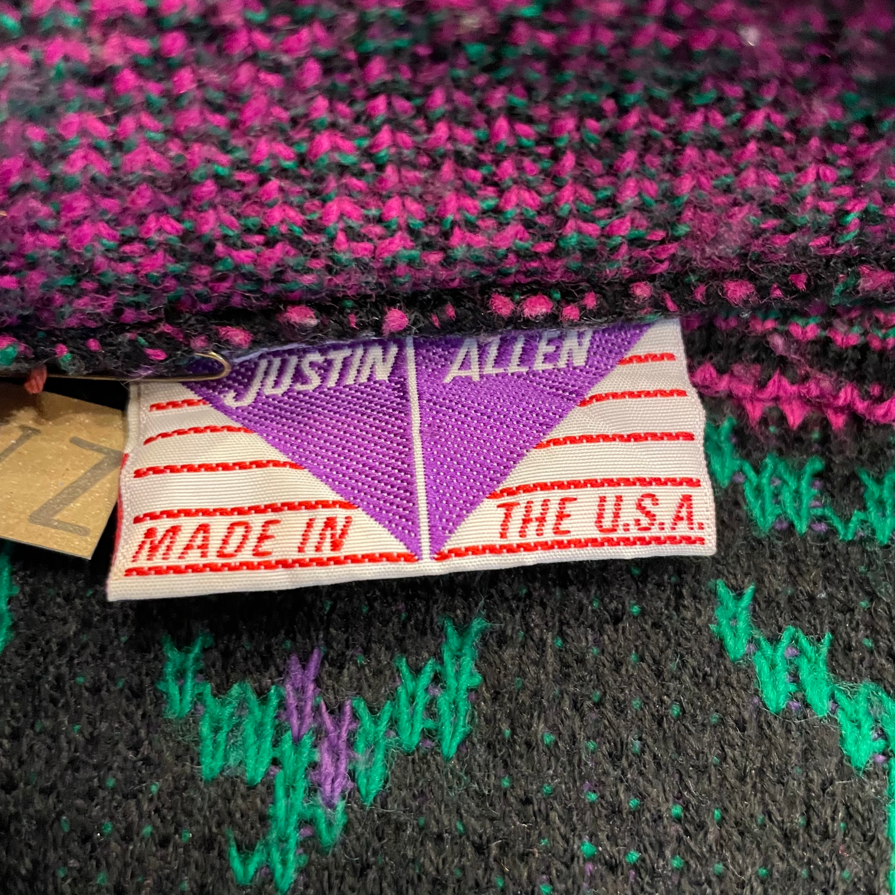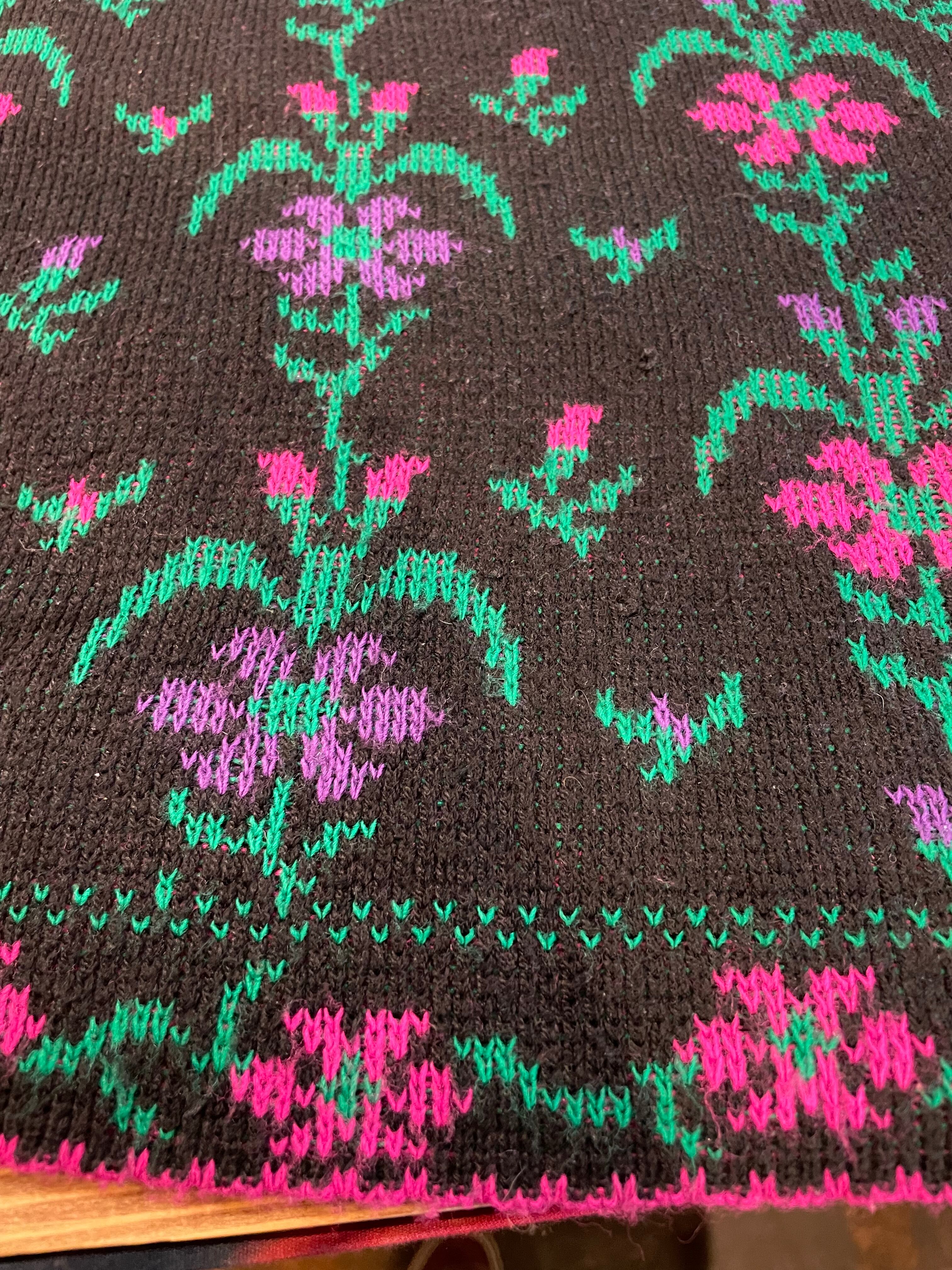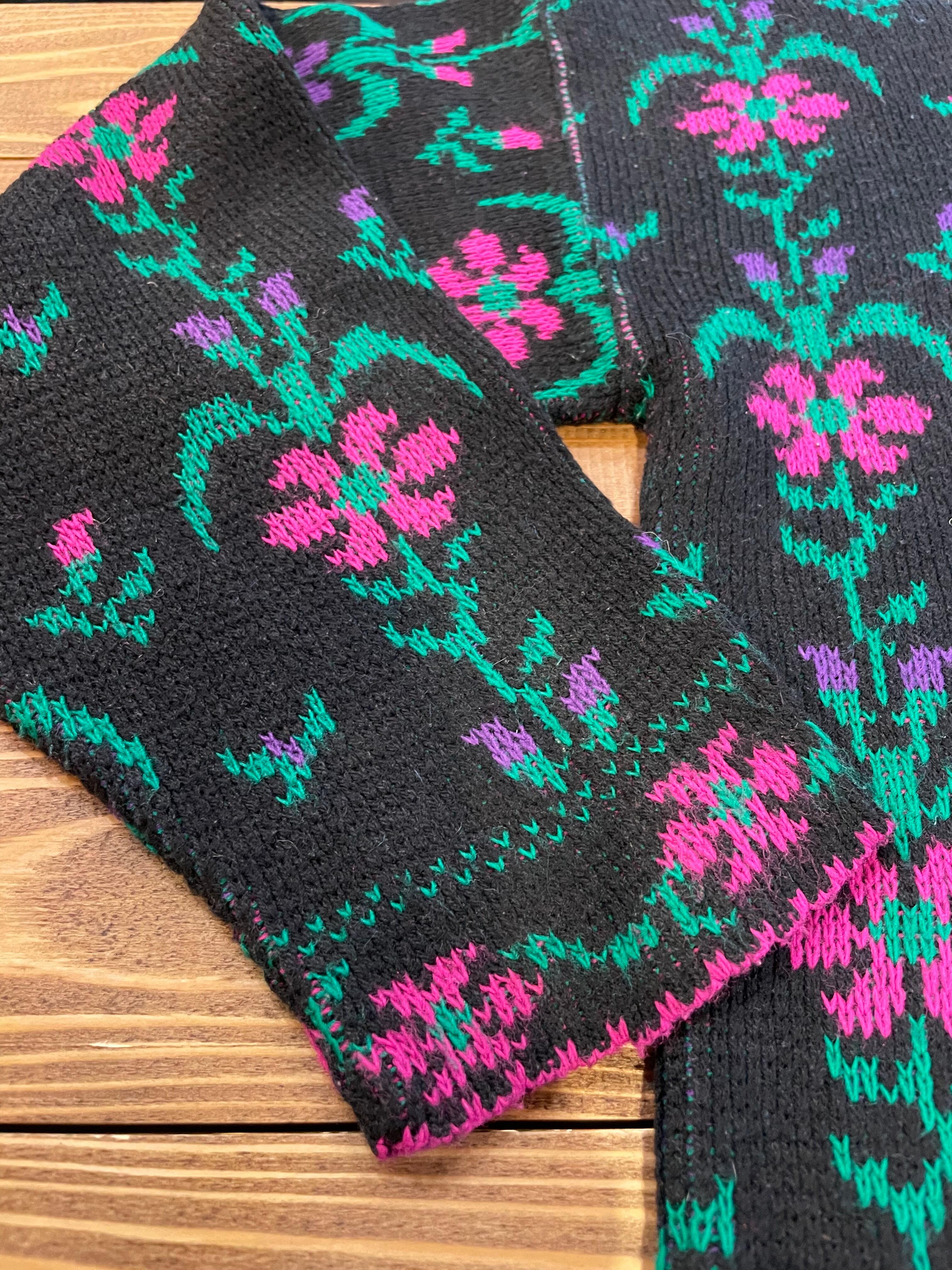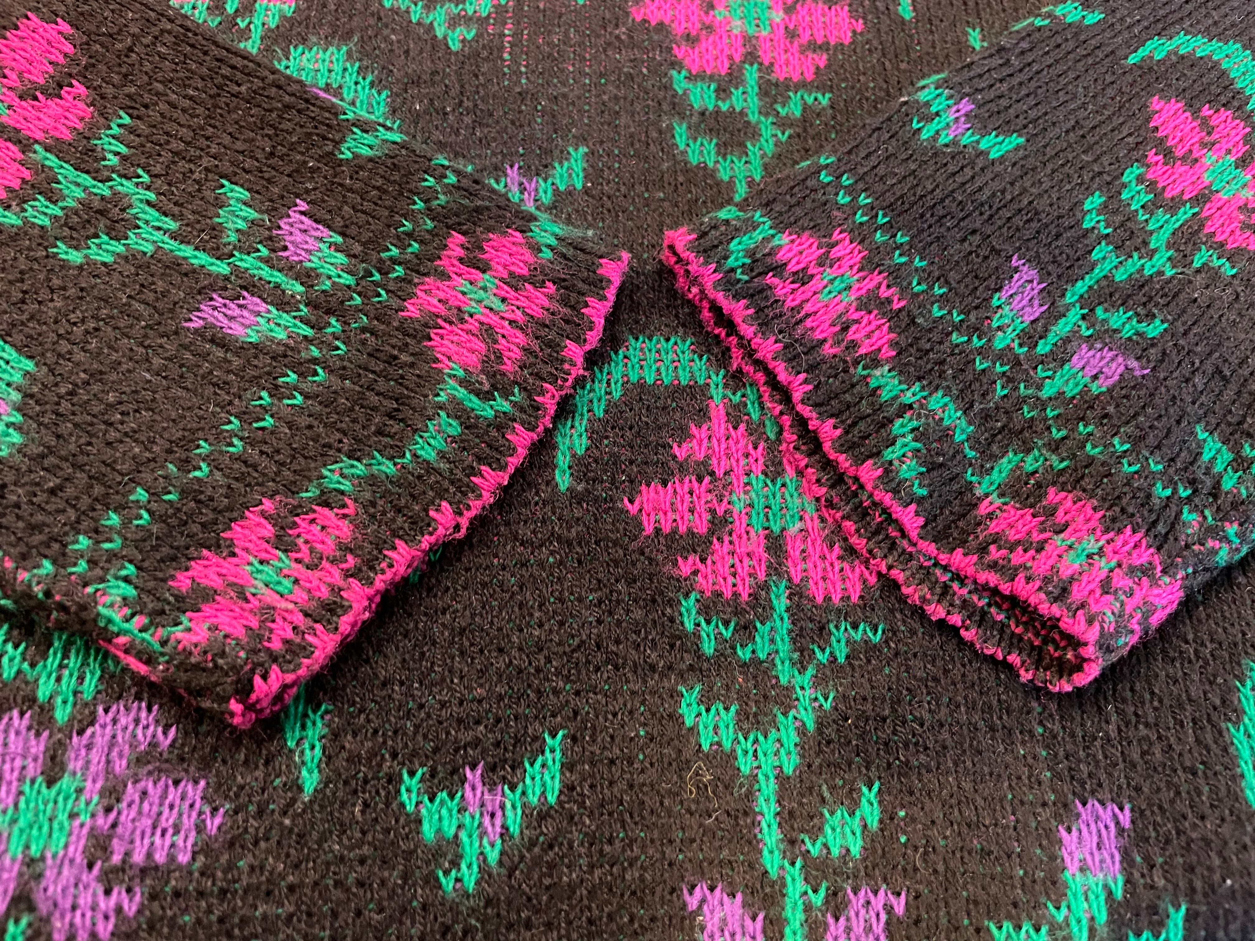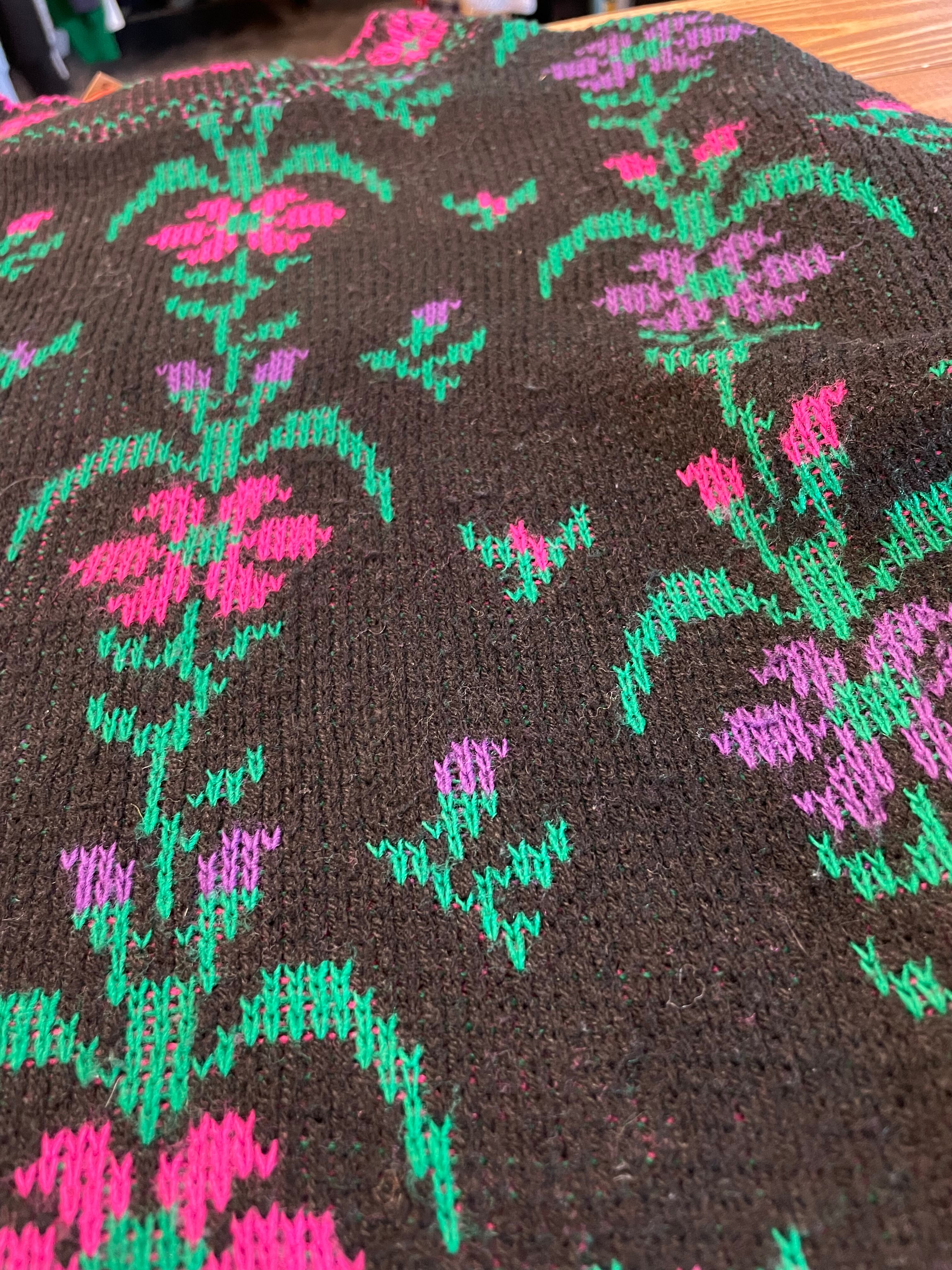 黒地に紫とピンクの花柄がかわいいアクリル素材のセーターです。