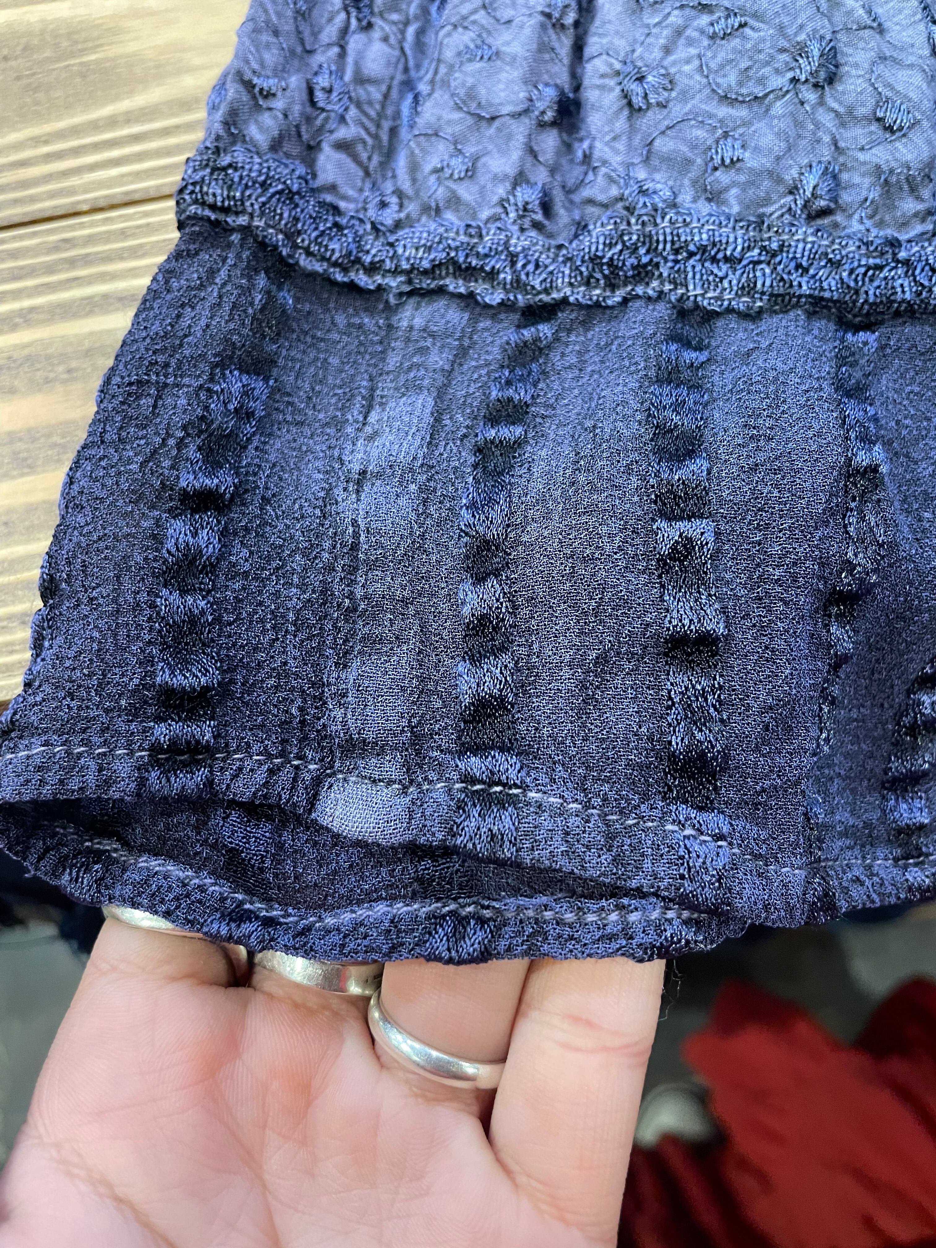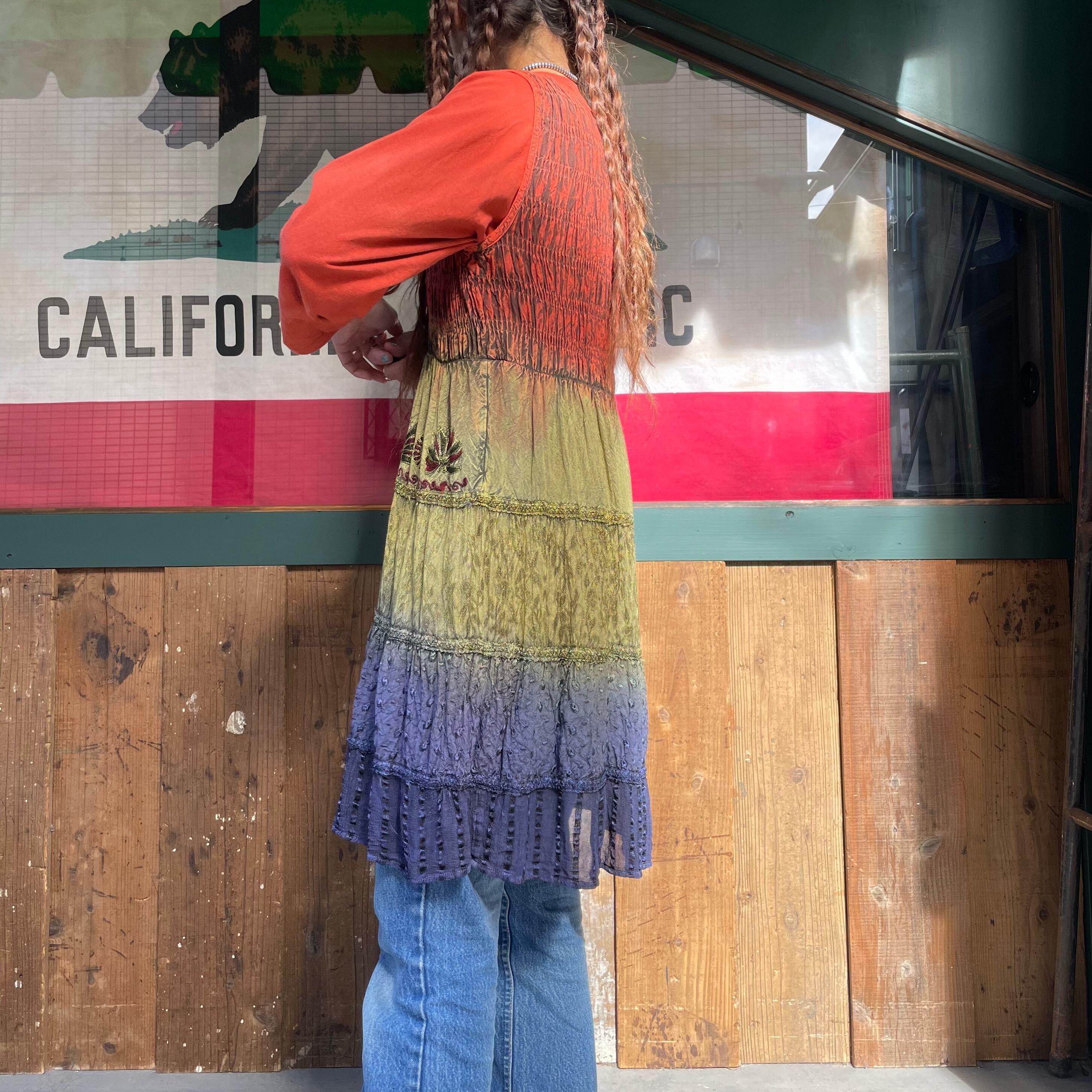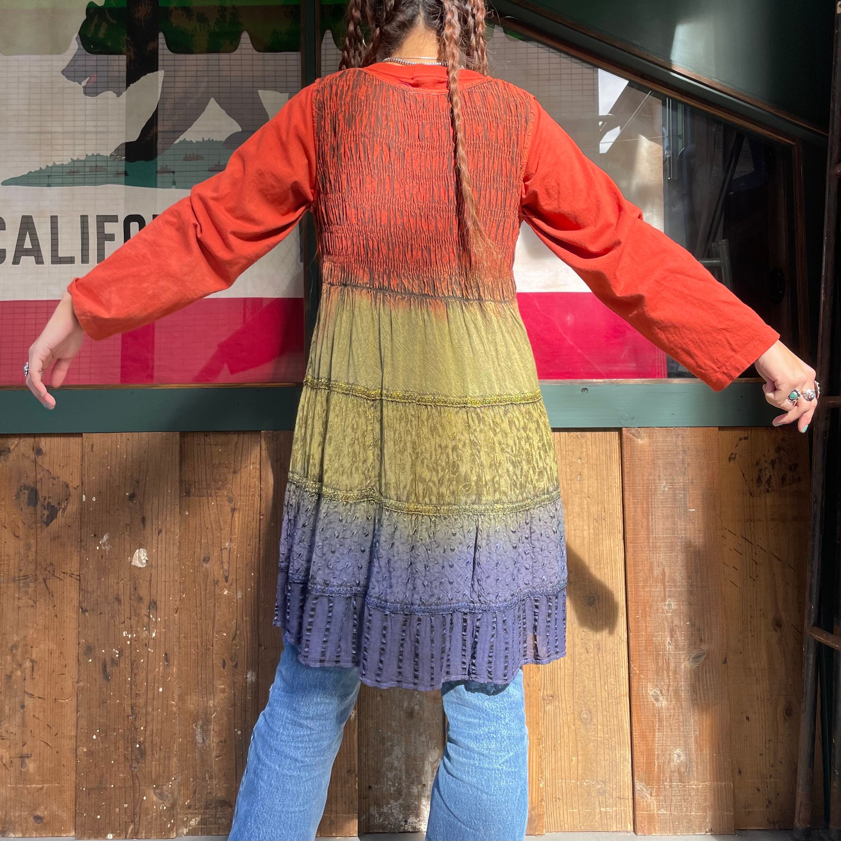 オレンジから濃い紫色までのグラデーションもきれいですし、チェーンステッチの刺繍もかわいいです。夏に一枚で着るのはもちろんですが、インナー次第では一年中着られておすすめです。