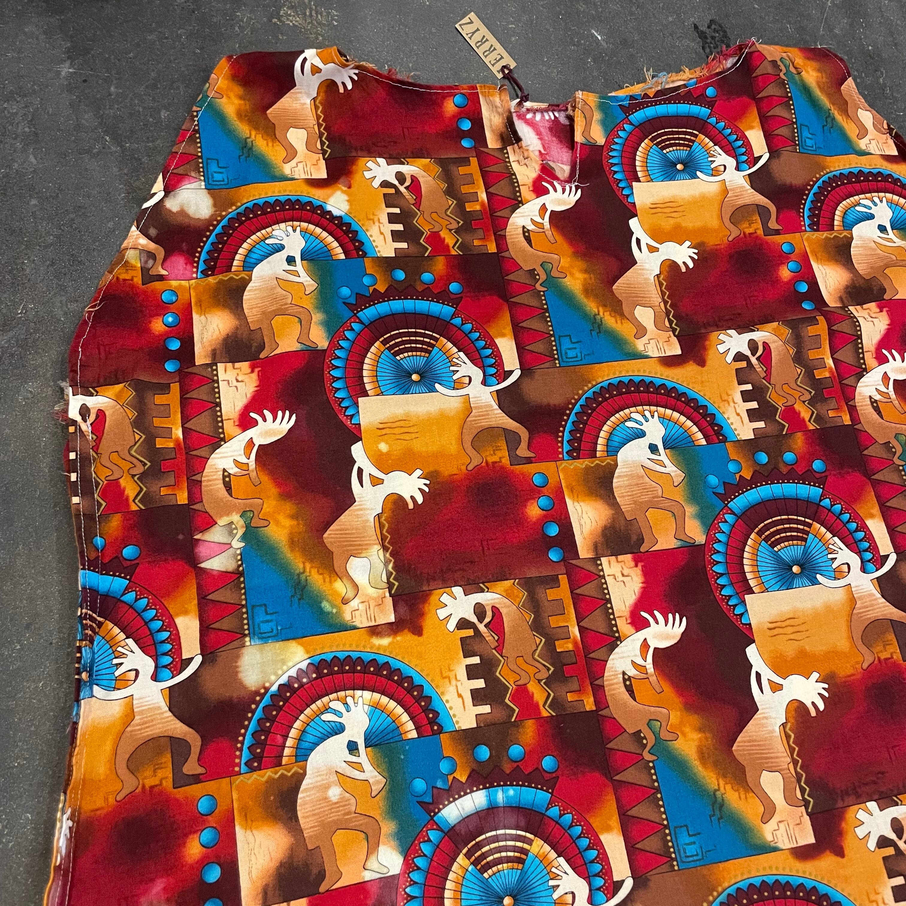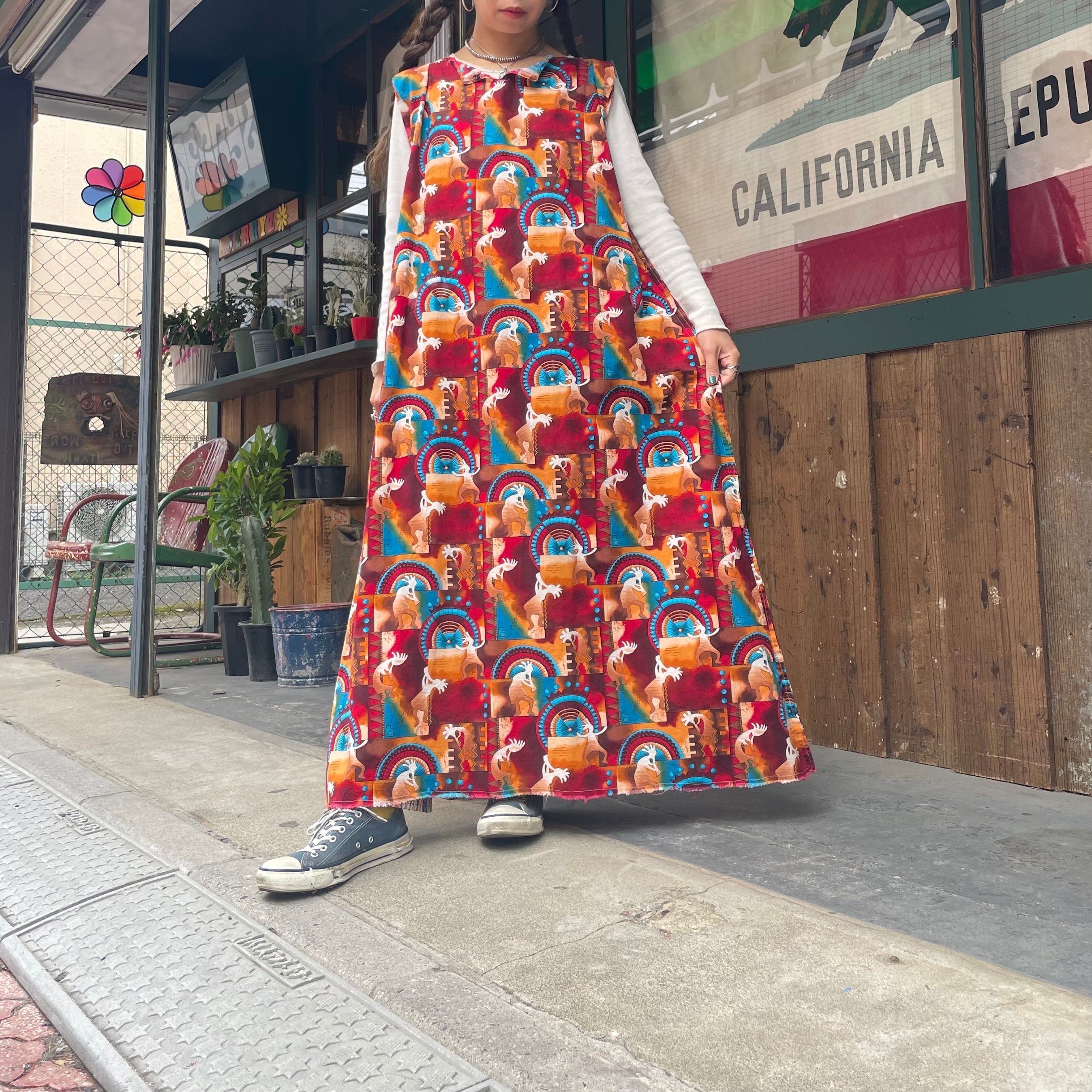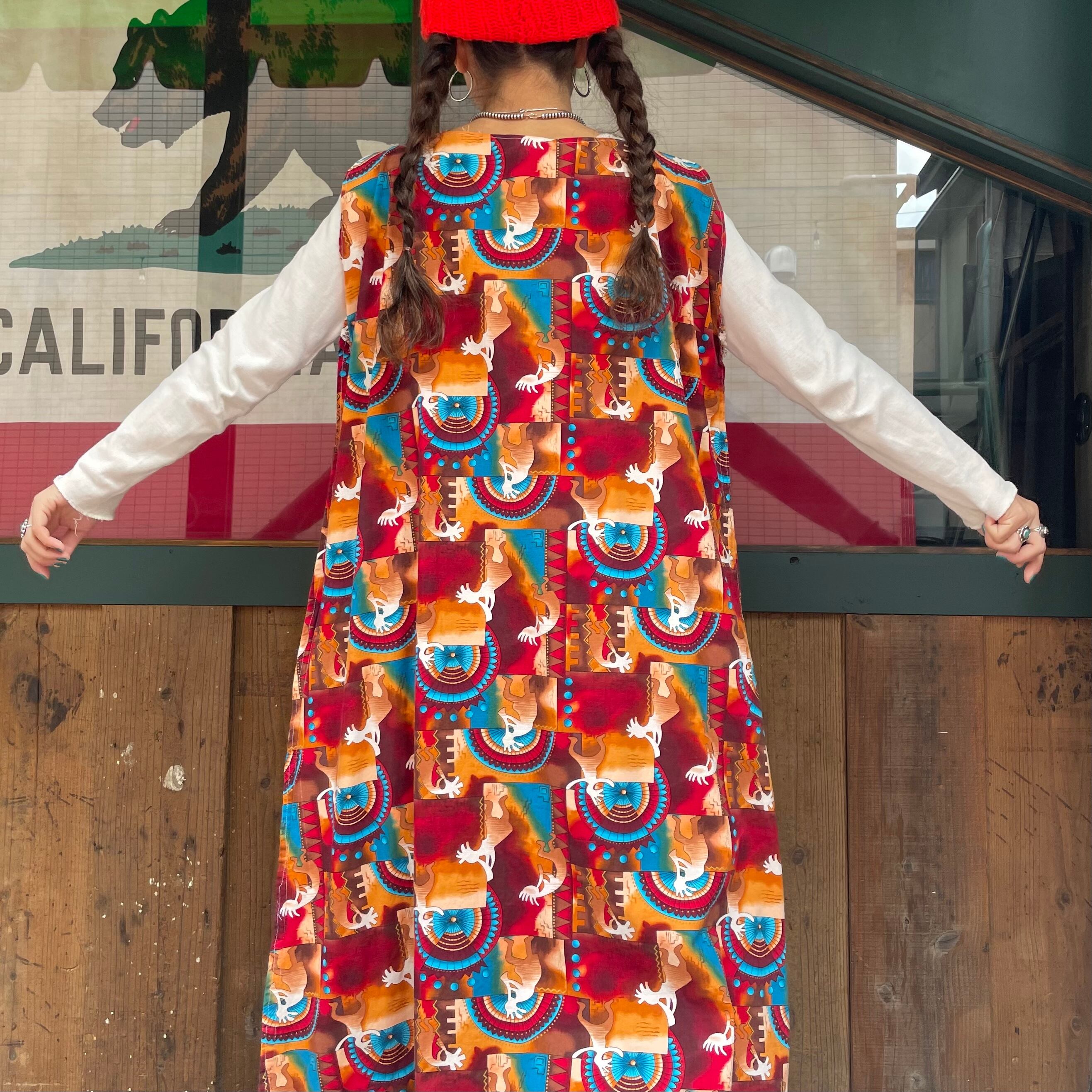 ココペリ、赤土や太陽、ターコイズなどネイティブアメリカンの雰囲気たっぷりな柄がかわいいワンピースです。