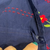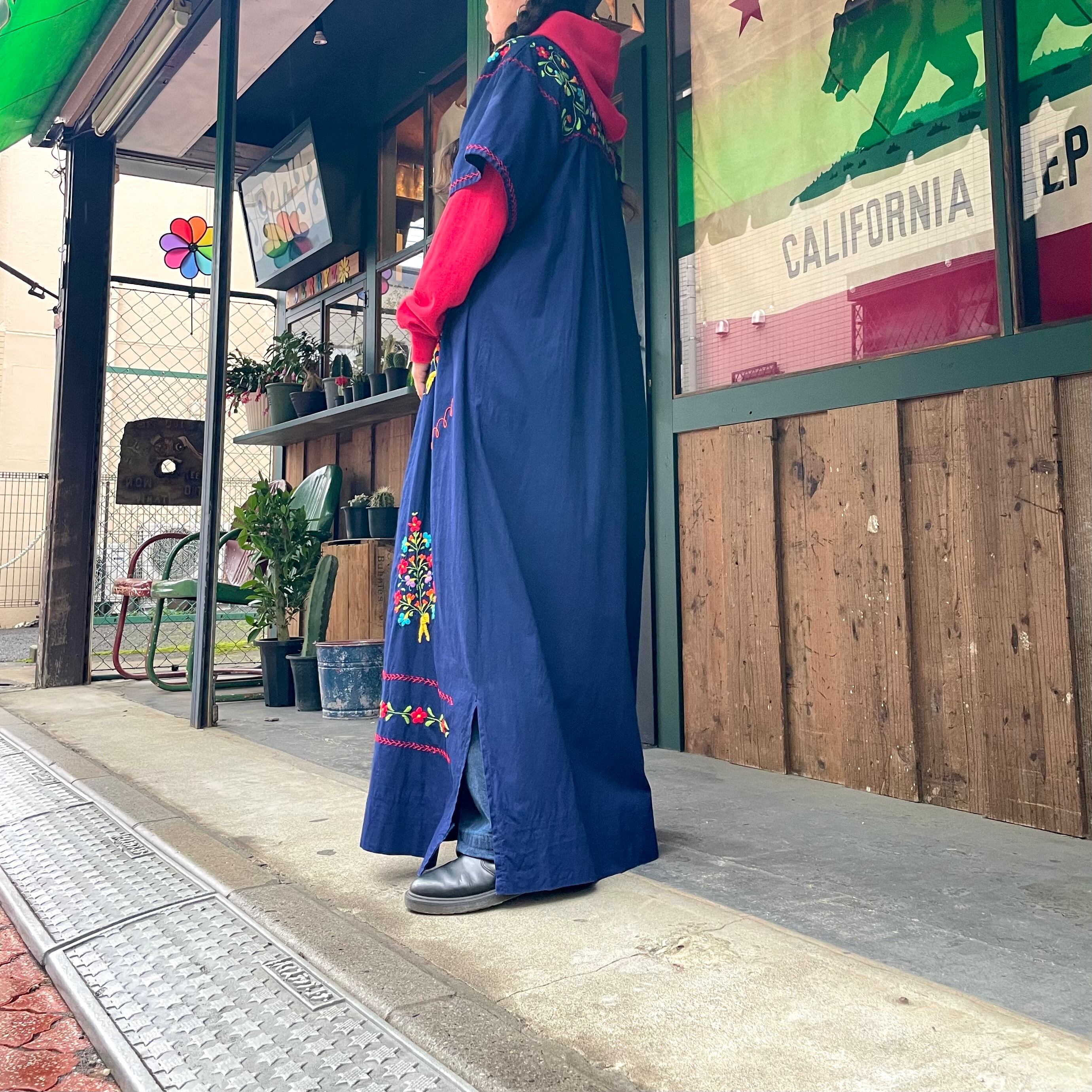 ゆったり大きめで着丈も長く、程よく広がり素敵なシルエットです。ネイビー地にカラフルな刺繍が映えるので、いろんな色のインナーを重ねて楽しめそうです。