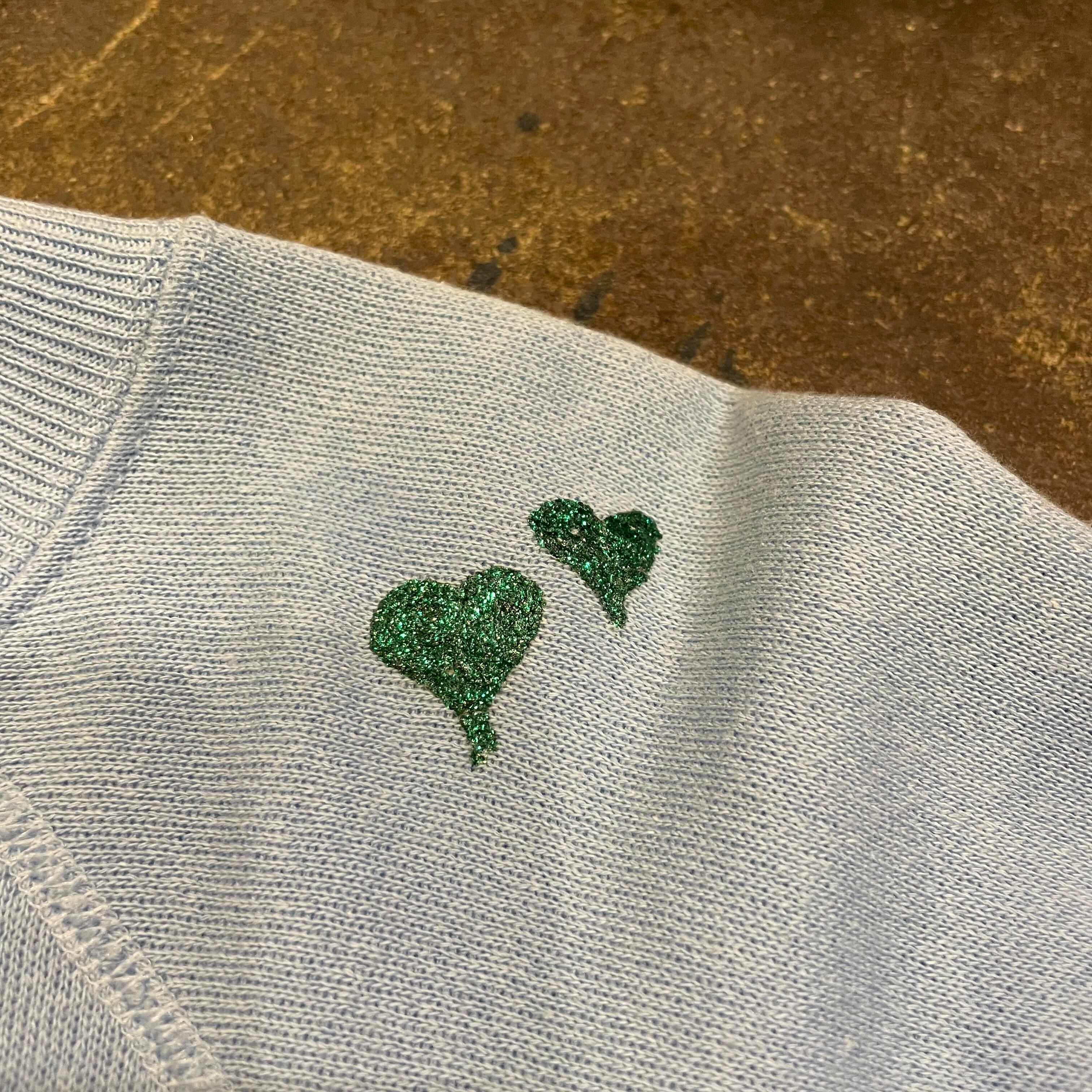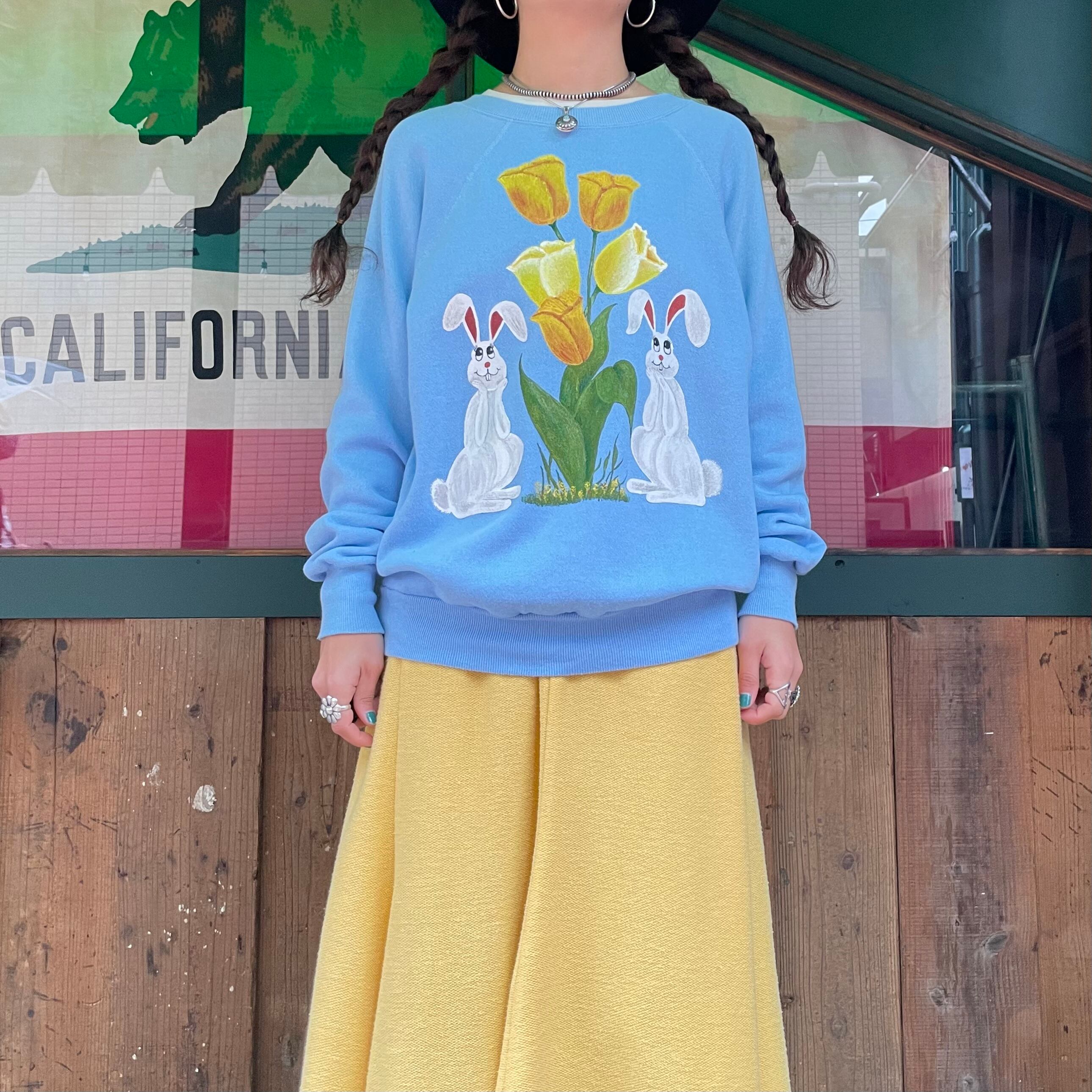 チューリップを見つめるうさぎ2匹のちょっとシュールなデザインですが、上手に描かれておりとてもかわいいです。右肩のラメラメなハートもポイントです。