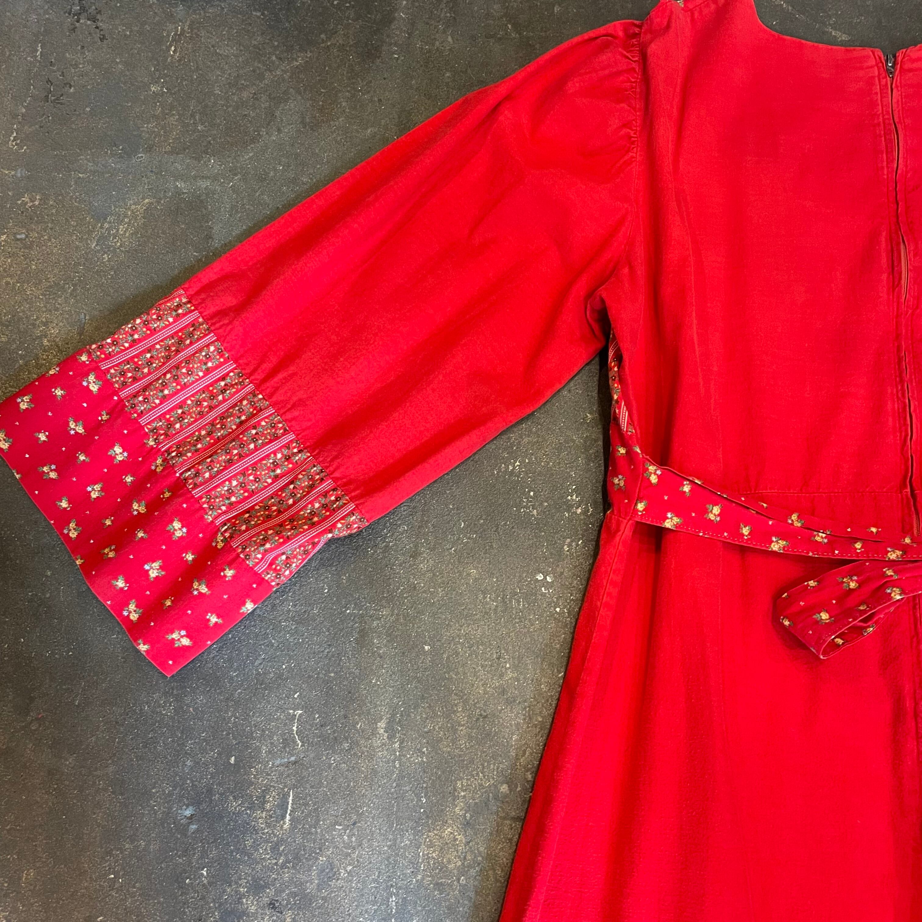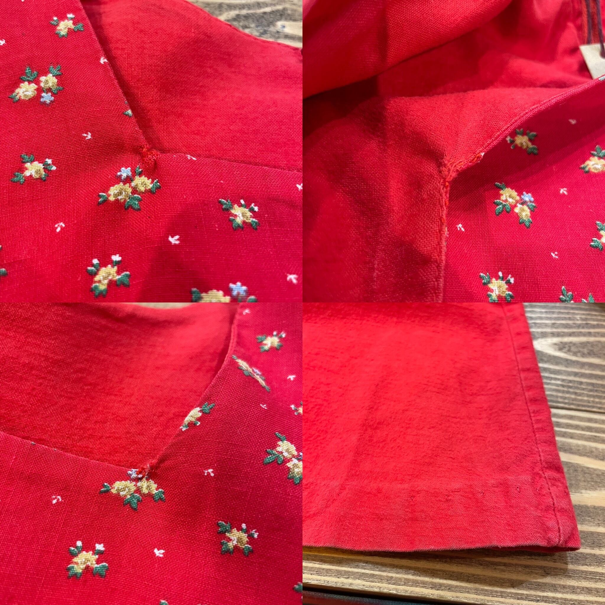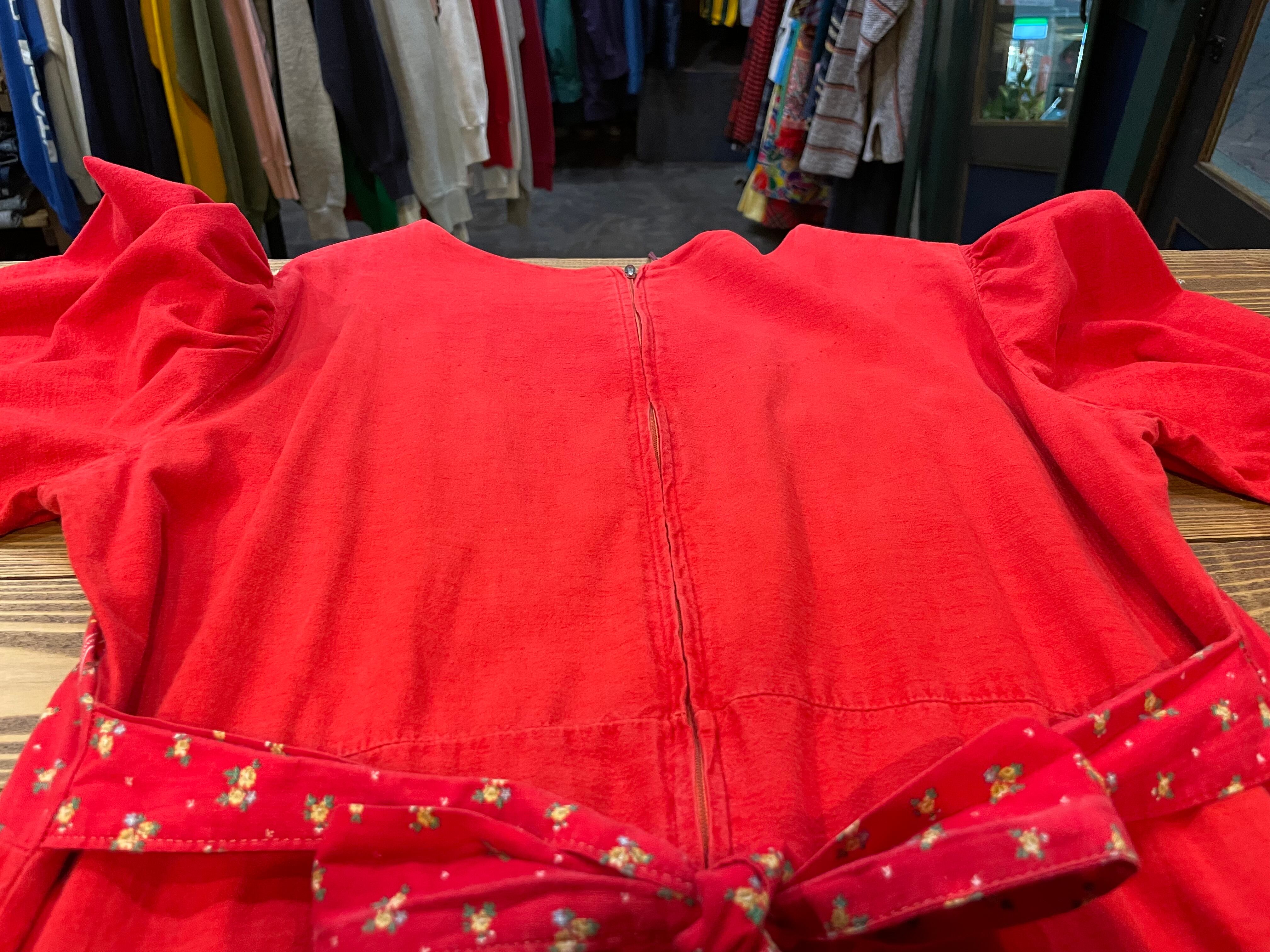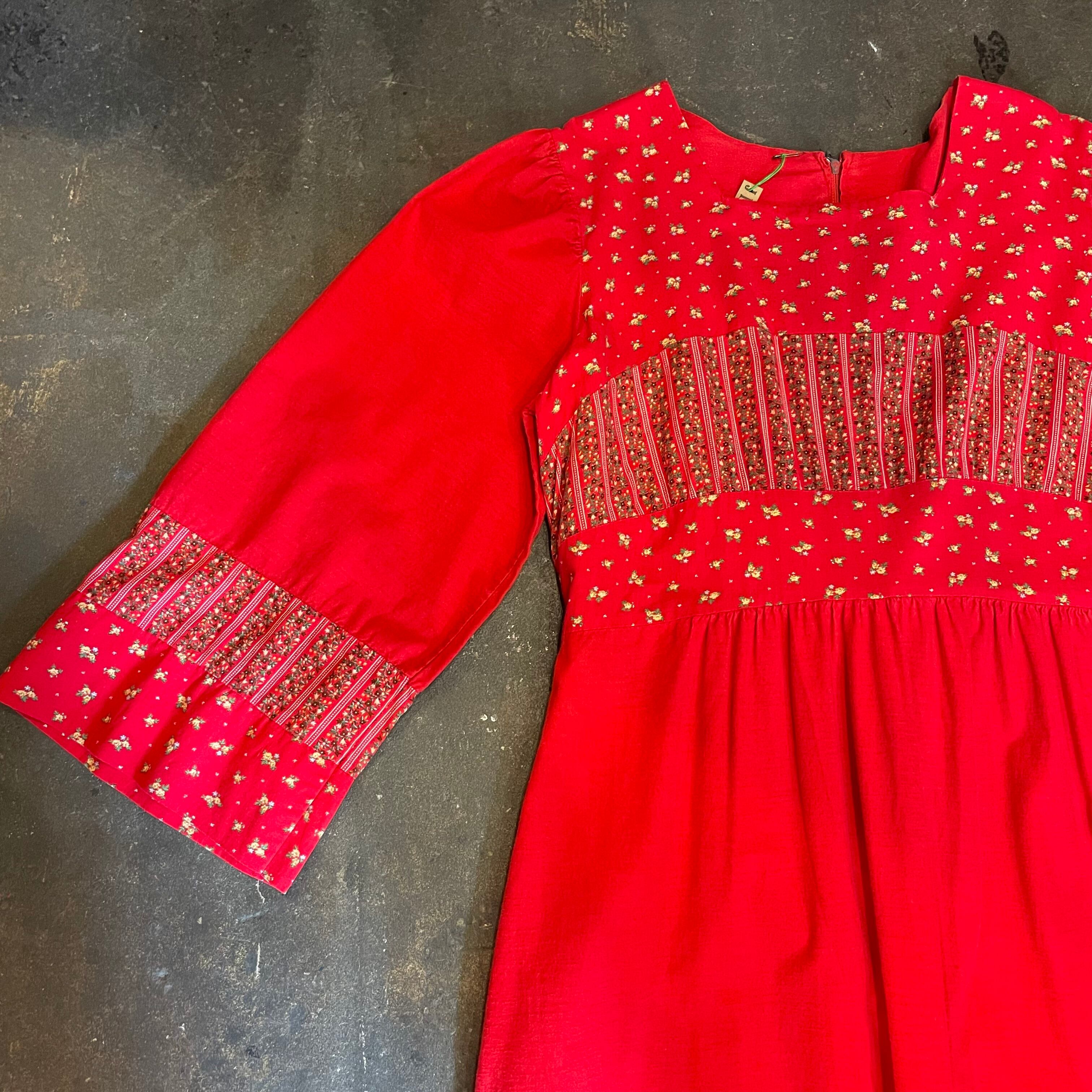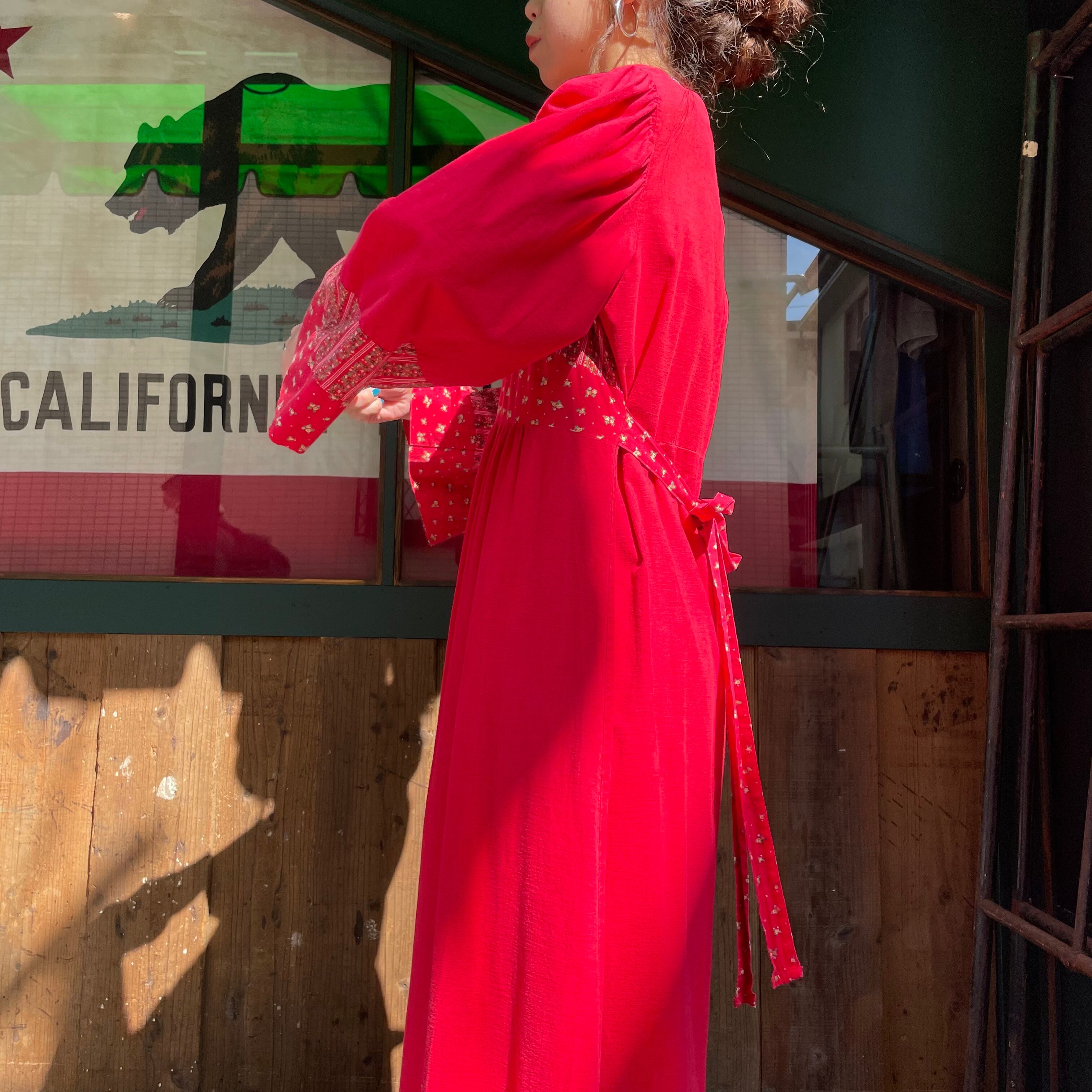 胸下切り替えのフレアスリーブでマキシ丈の70'sらしいデザインのワンピースです。小花柄2種類と真っ赤な無地の切り替えがシンプルでかわいいです。