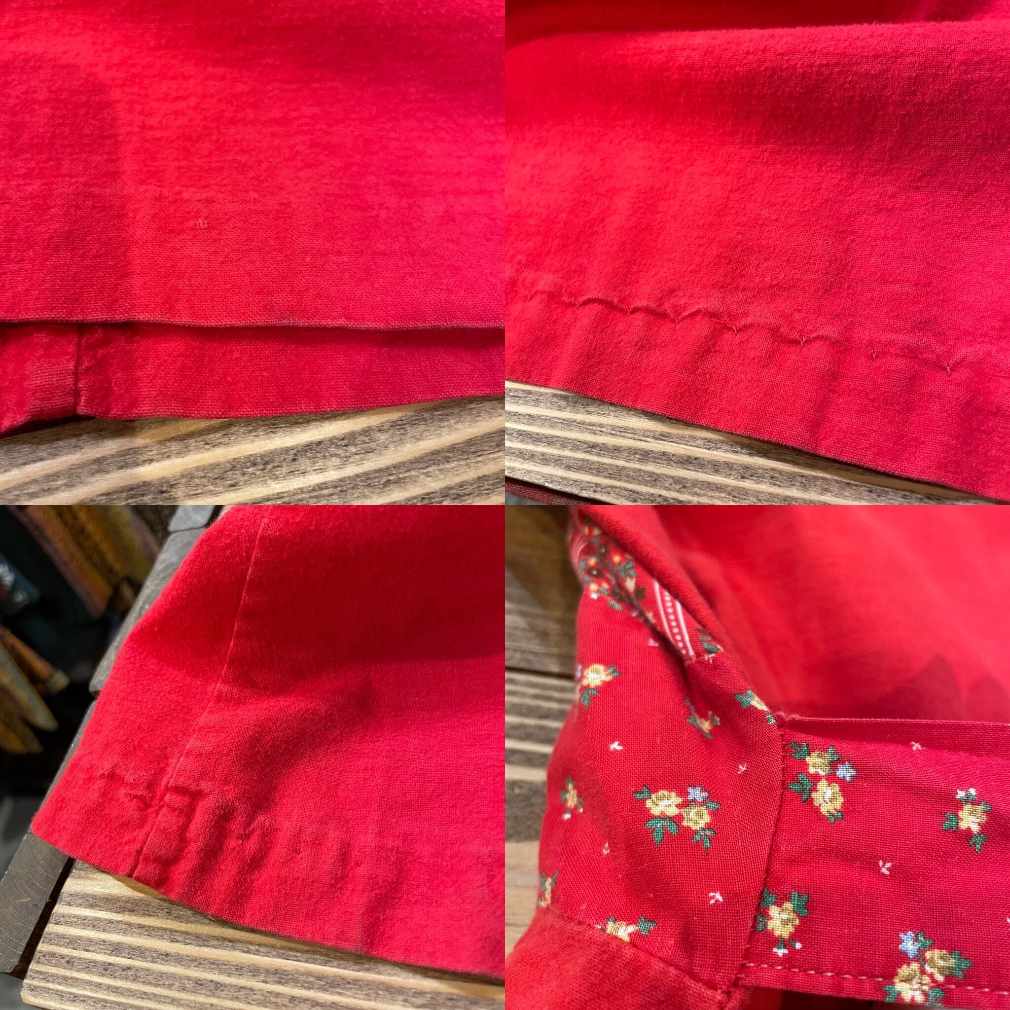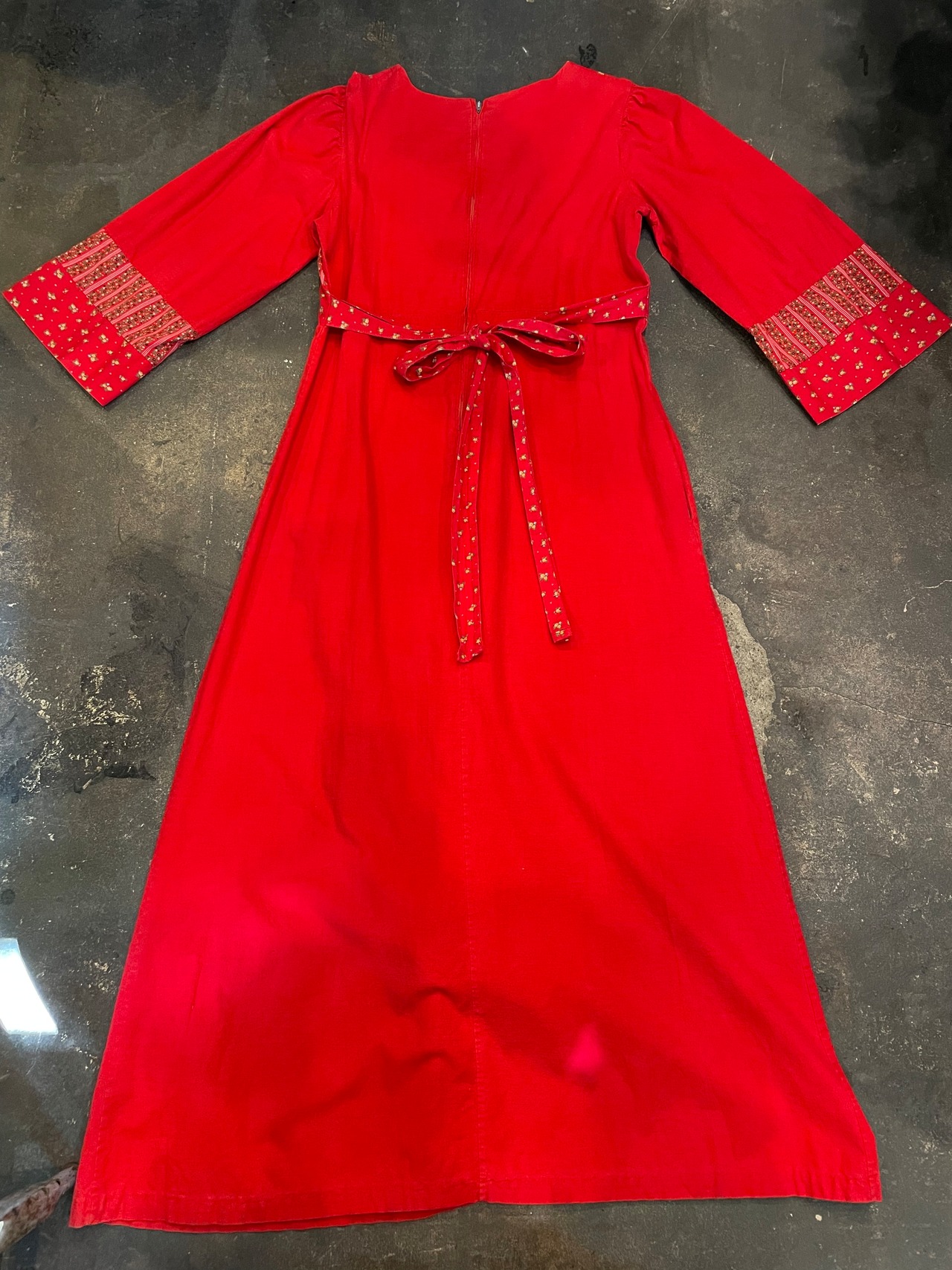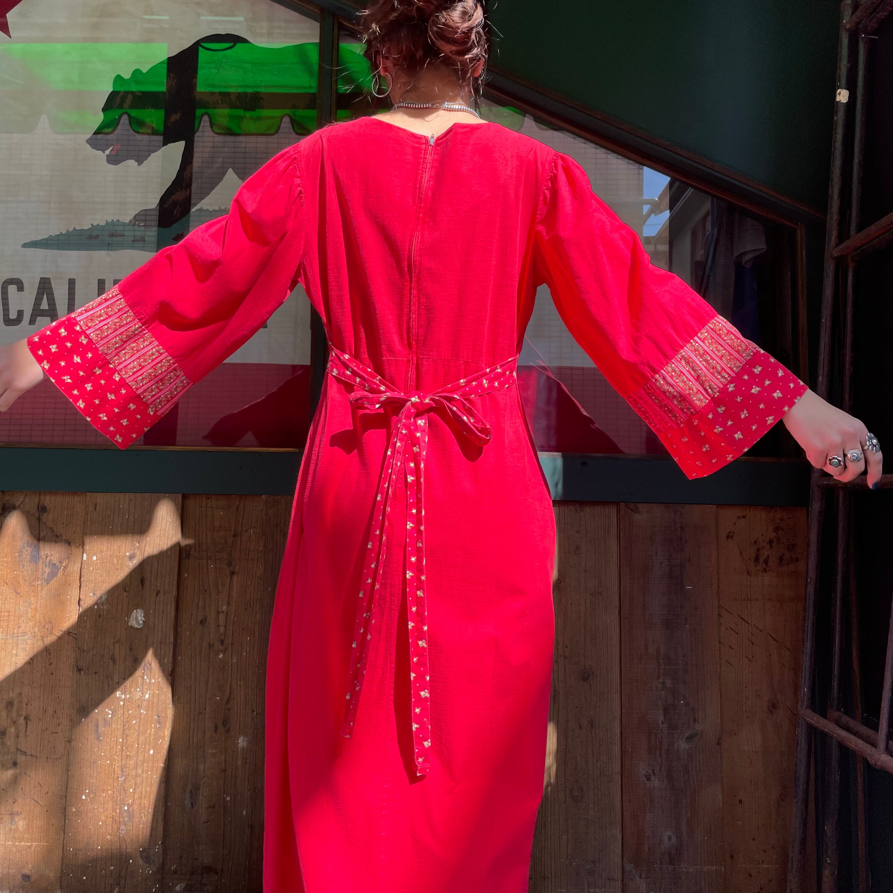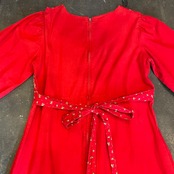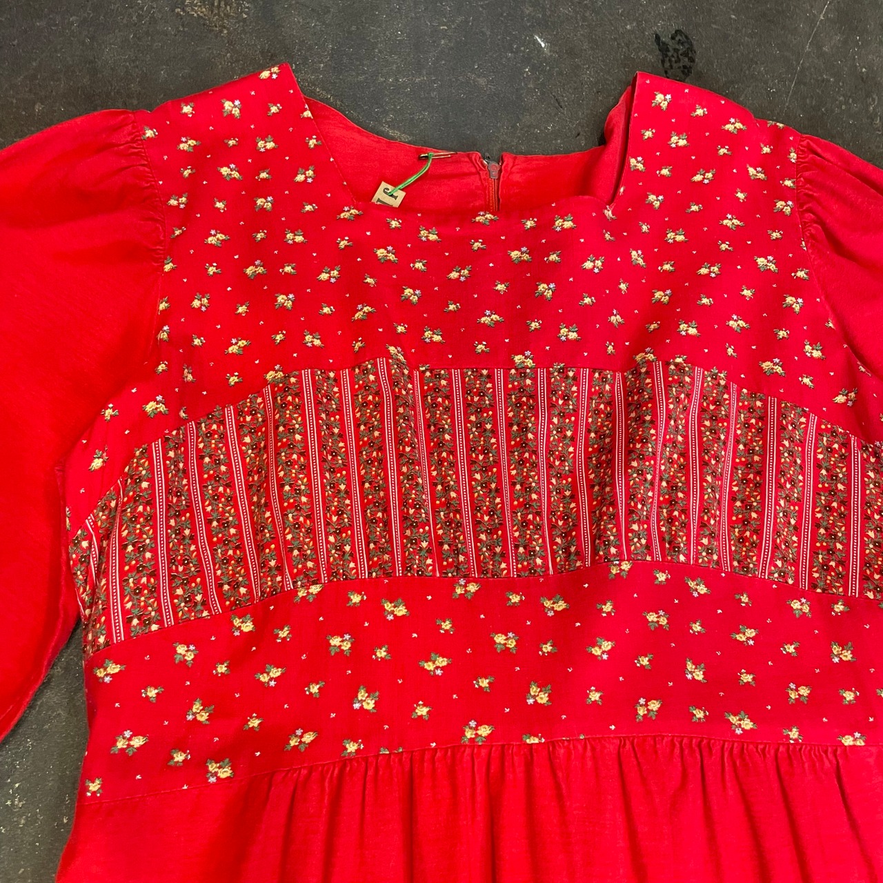胸下切り替えのフレアスリーブでマキシ丈の70'sらしいデザインのワンピースです。小花柄2種類と真っ赤な無地の切り替えがシンプルでかわいいです。