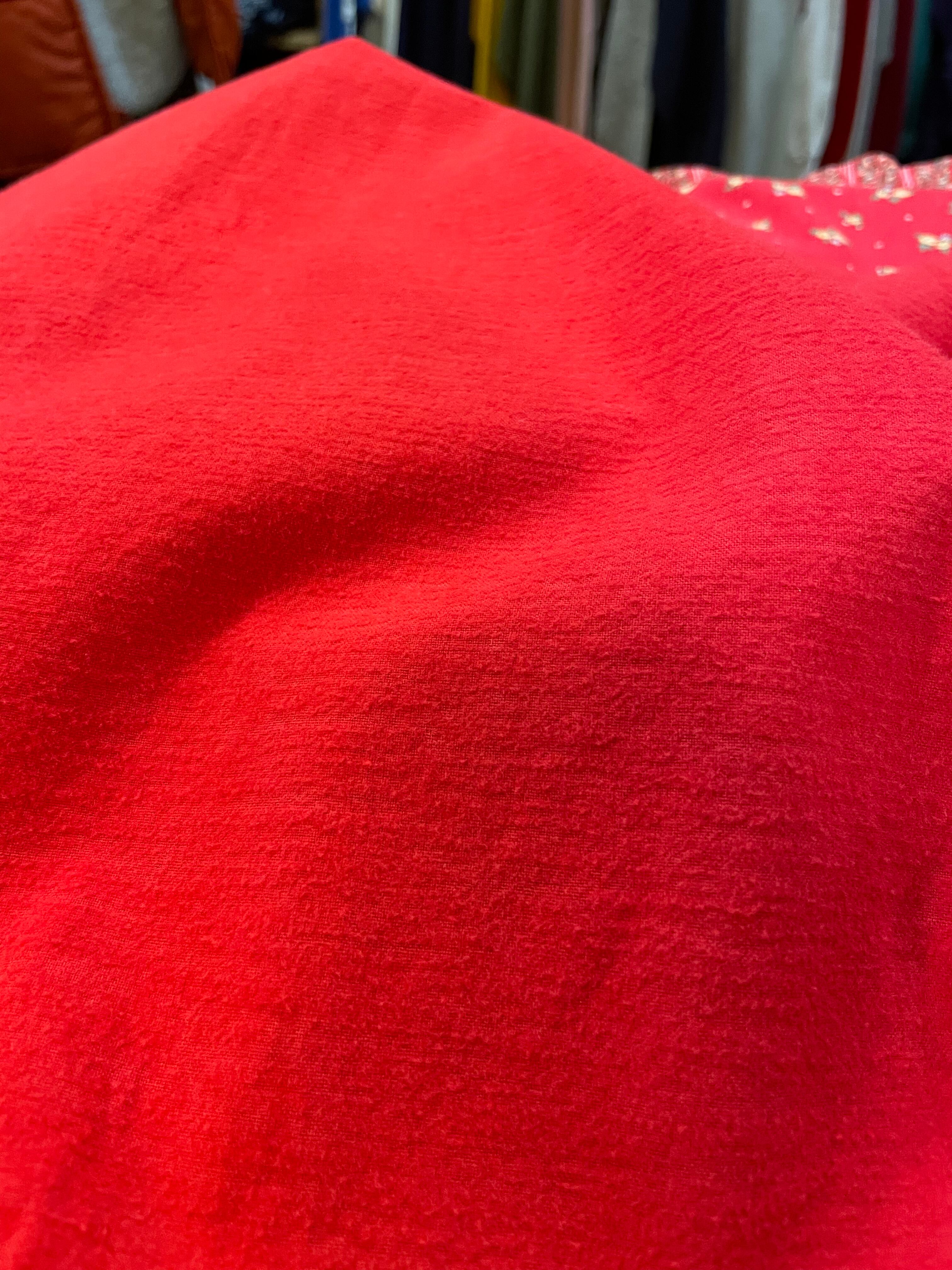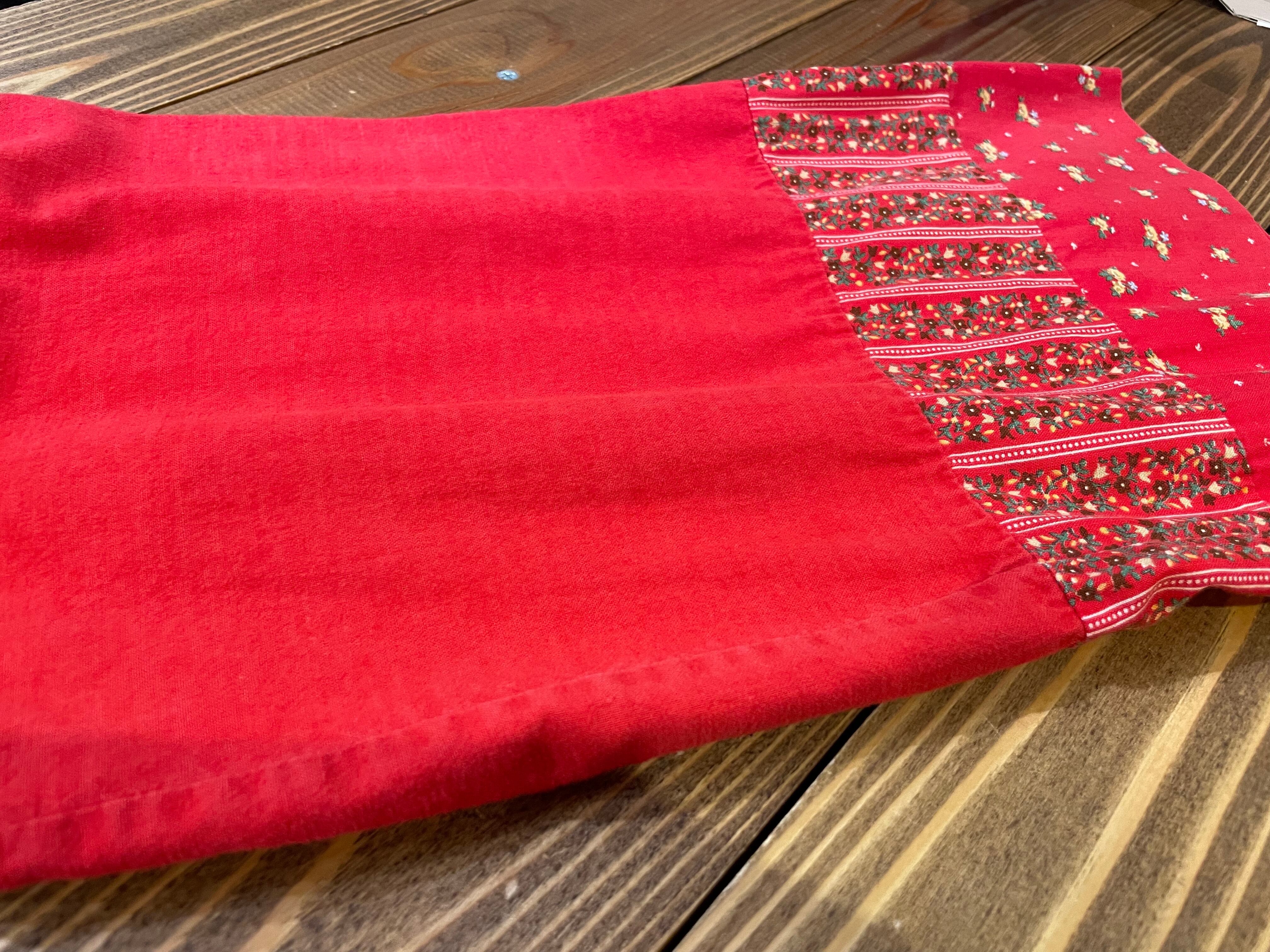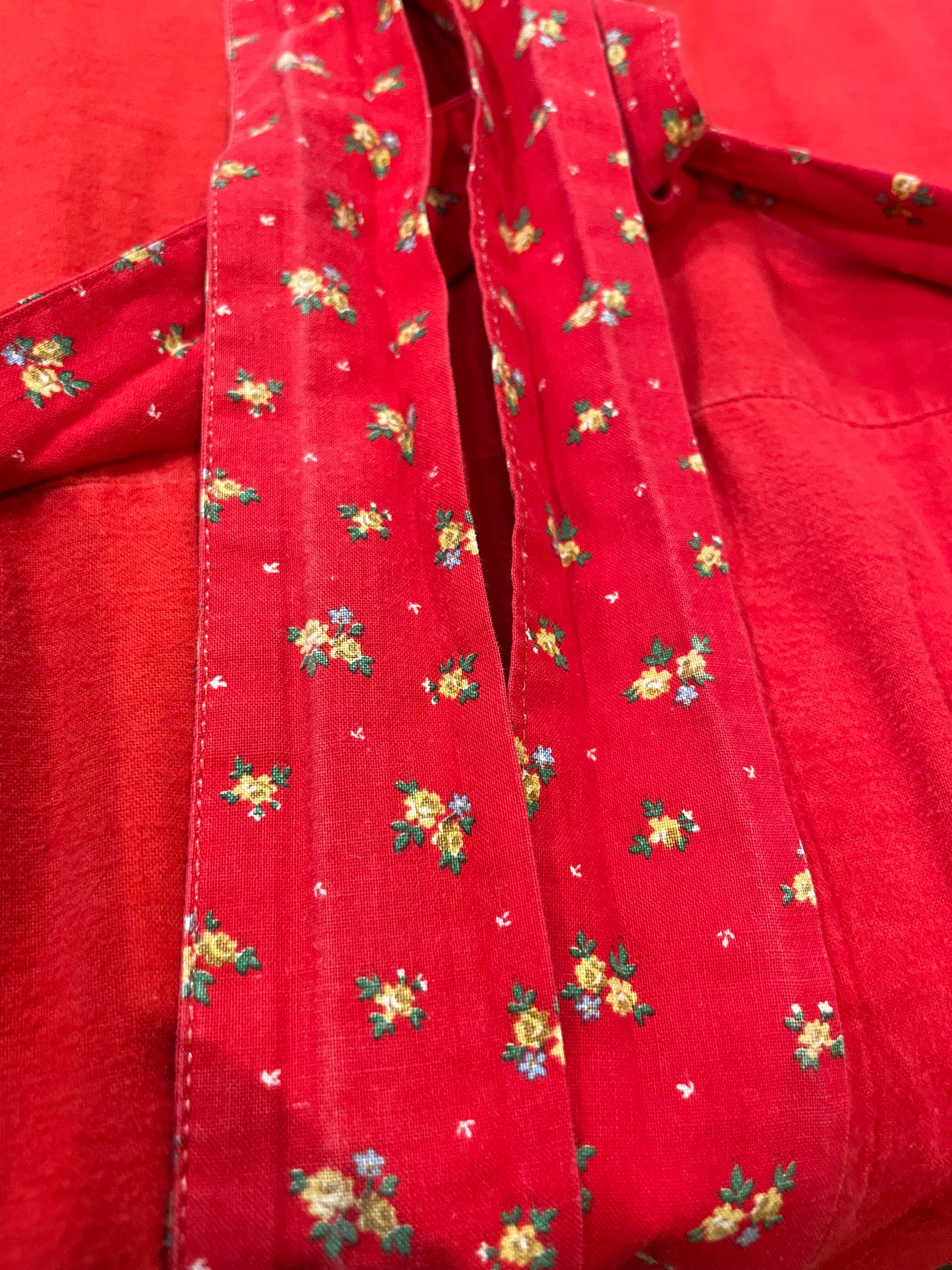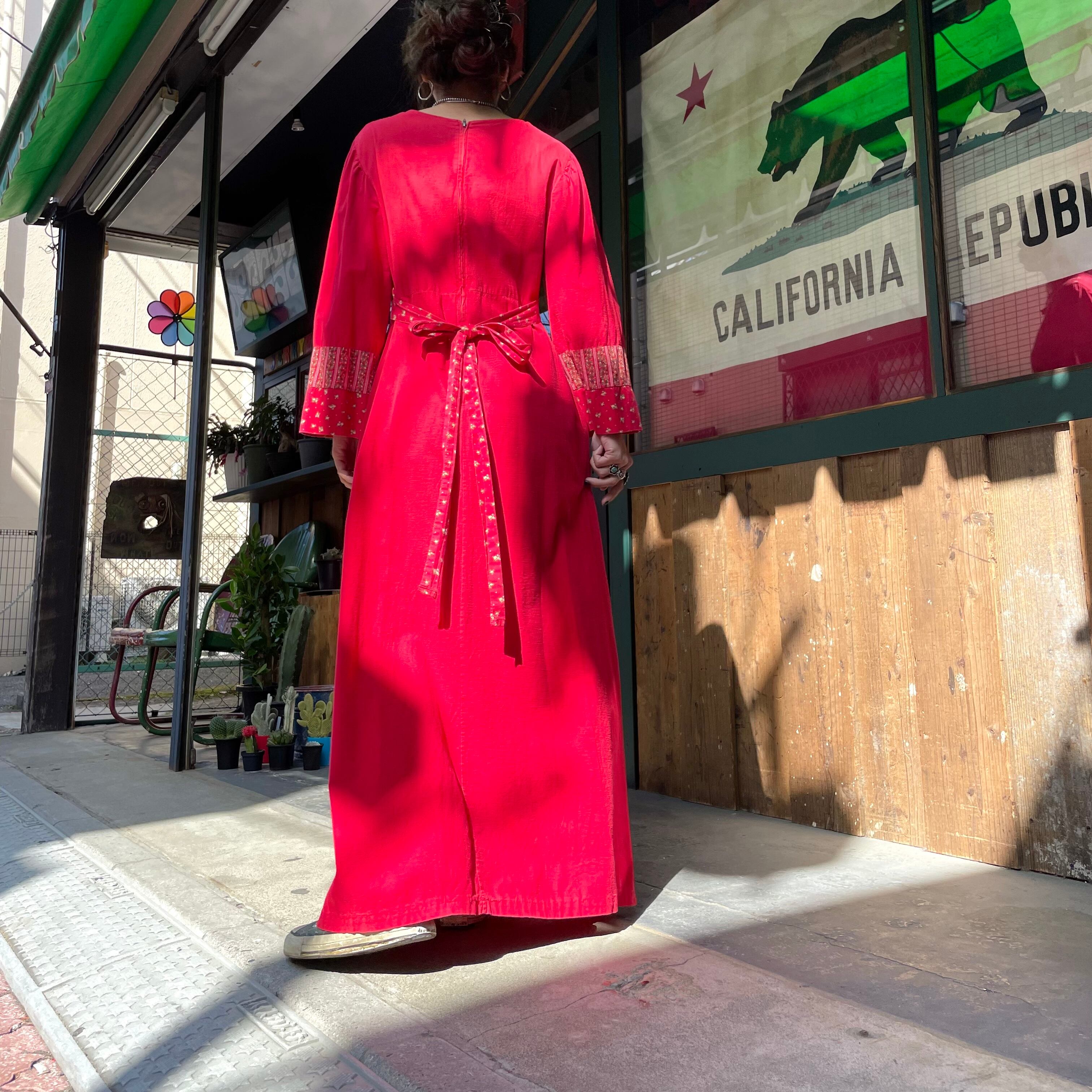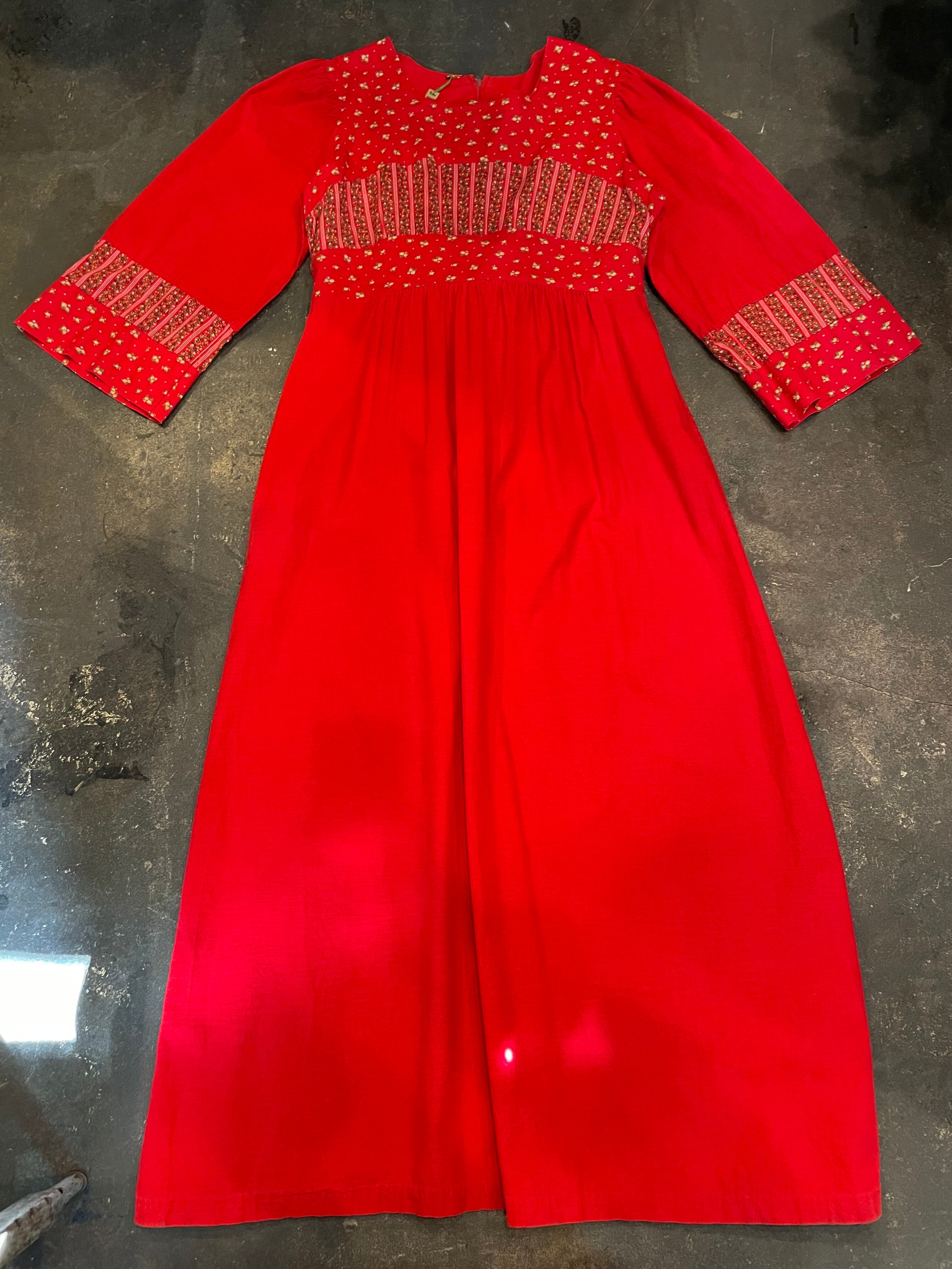 胸下切り替えのフレアスリーブでマキシ丈の70'sらしいデザインのワンピースです。小花柄2種類と真っ赤な無地の切り替えがシンプルでかわいいです。