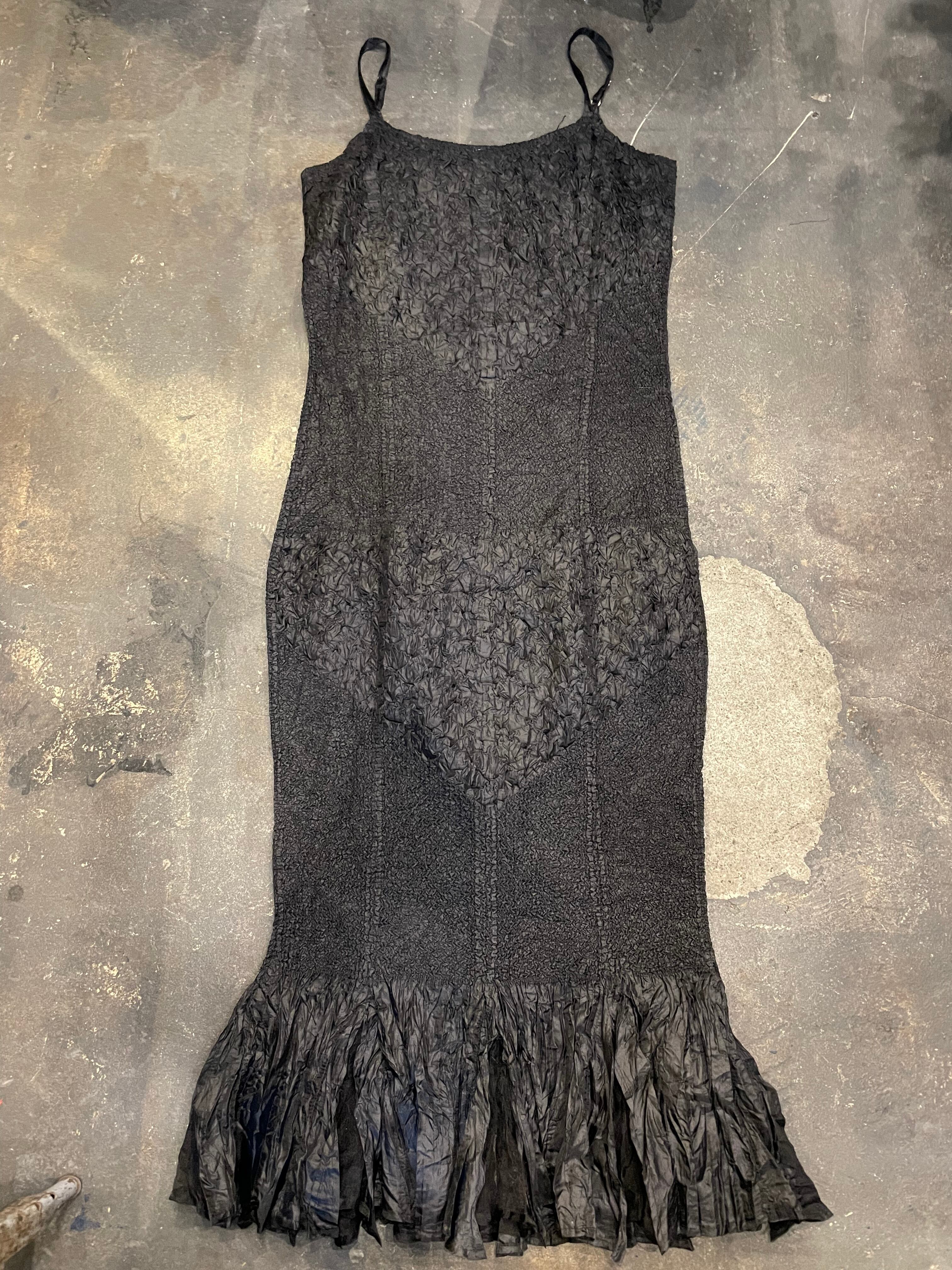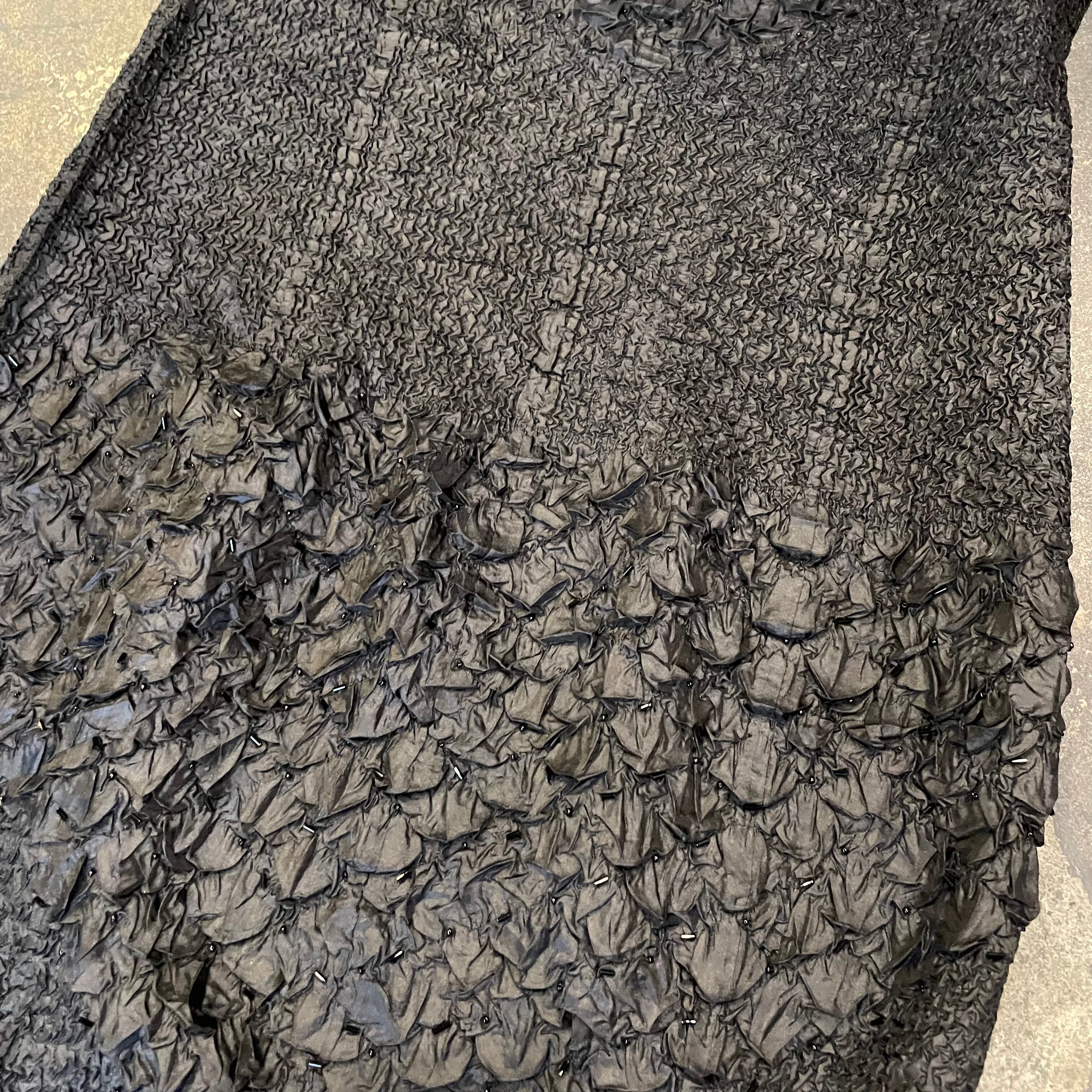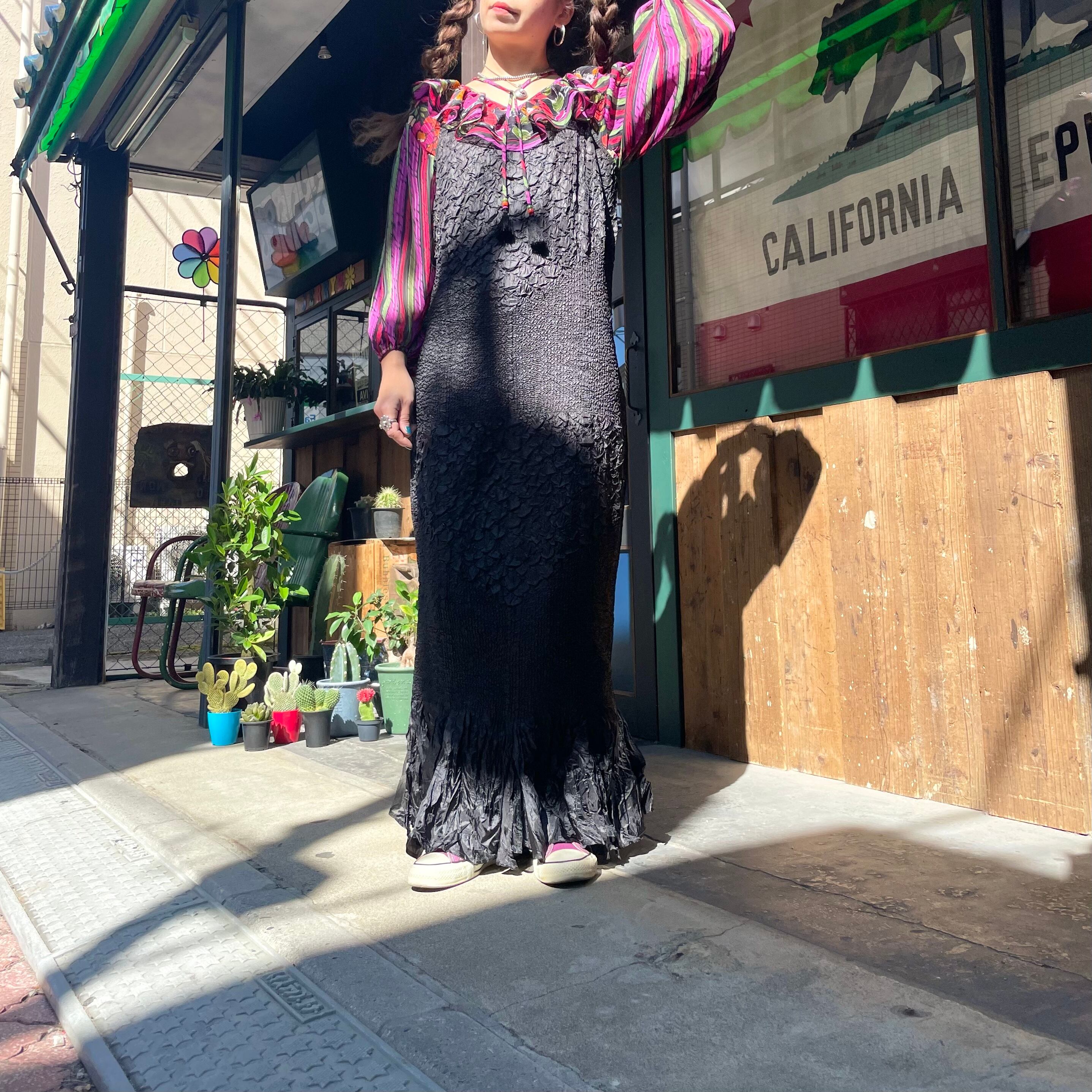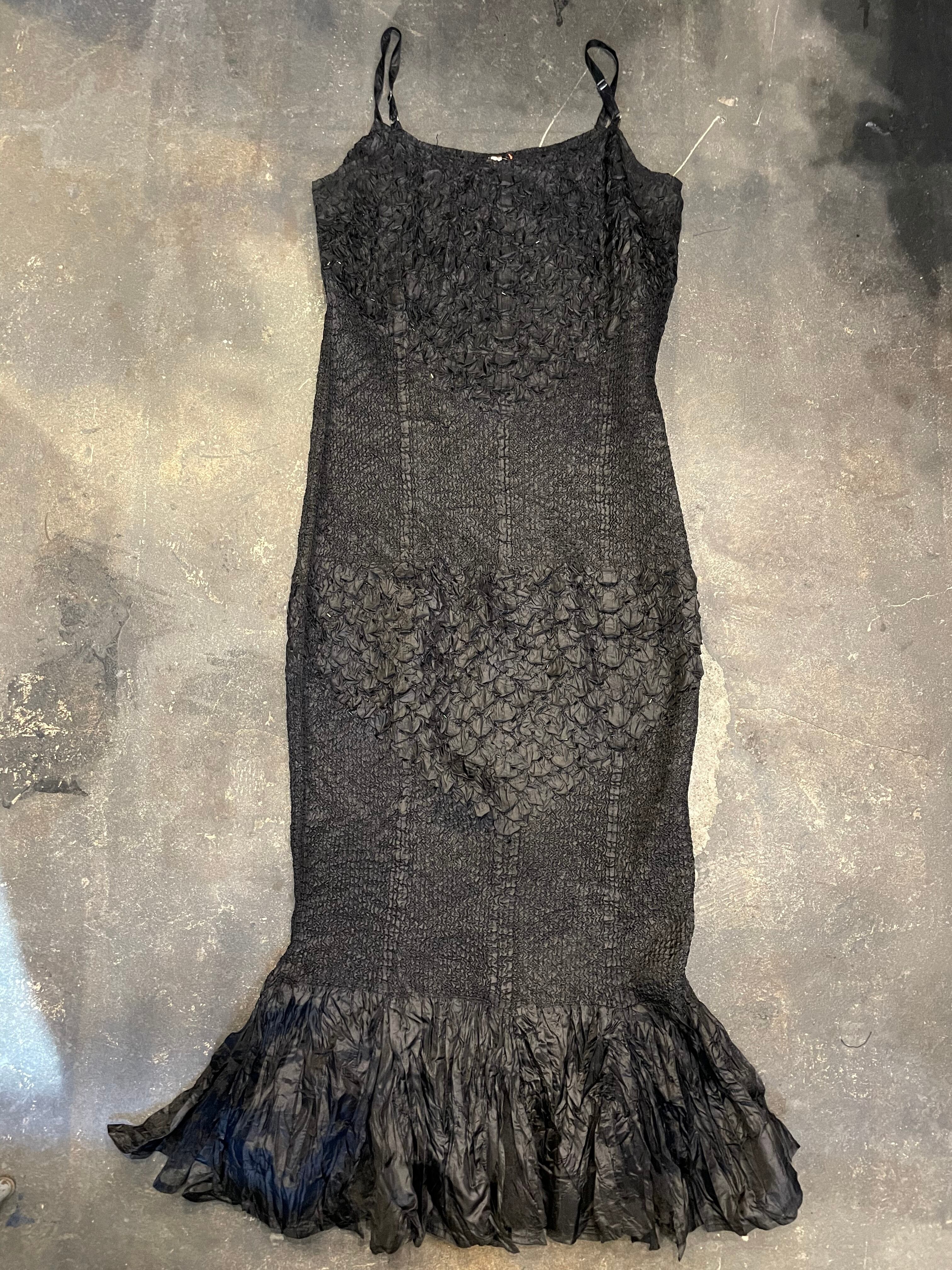 ややマーメイドシルエットのような雰囲気で黒地に黒いビーズがついていたり、大人っぽい一枚です。