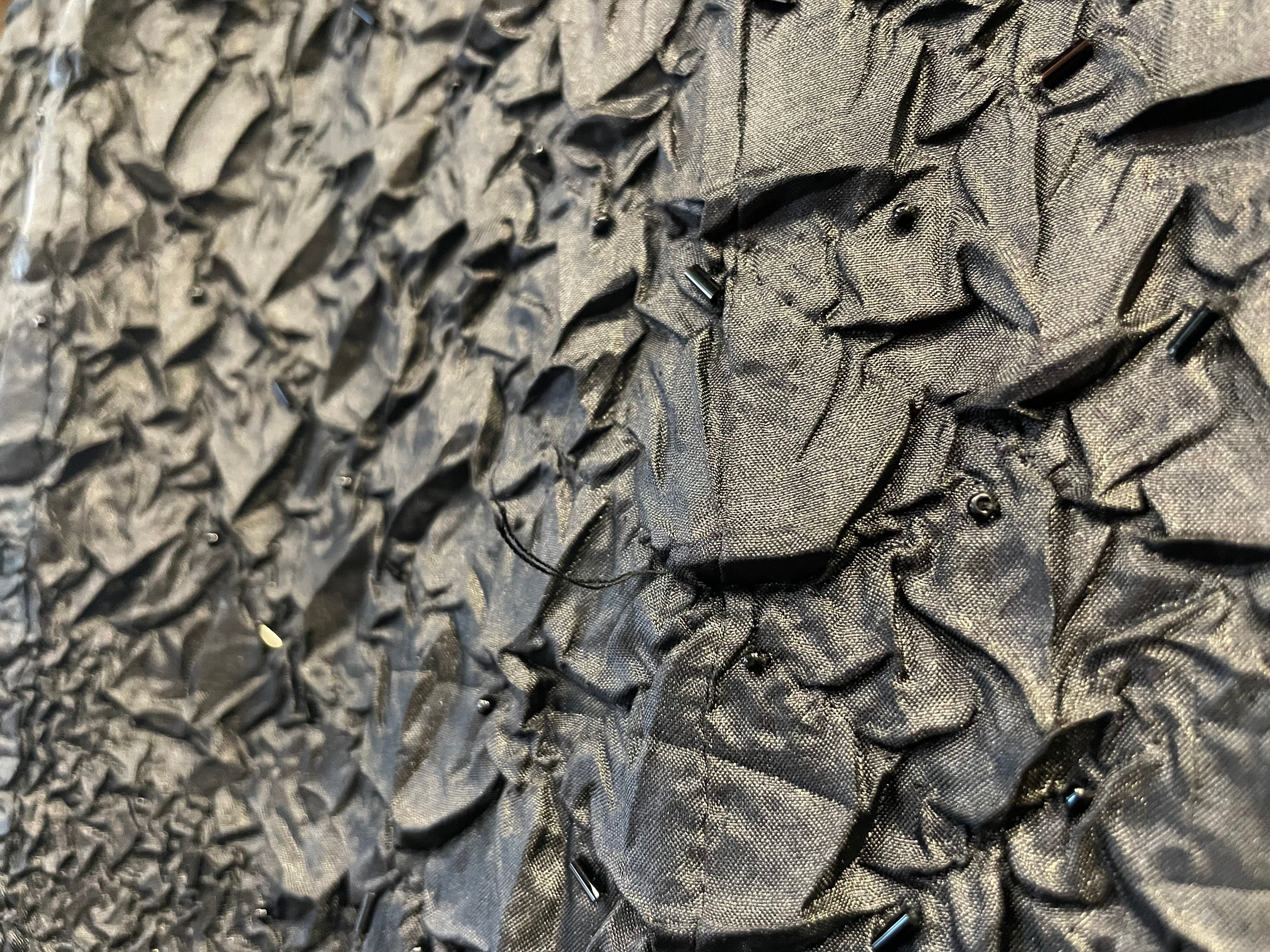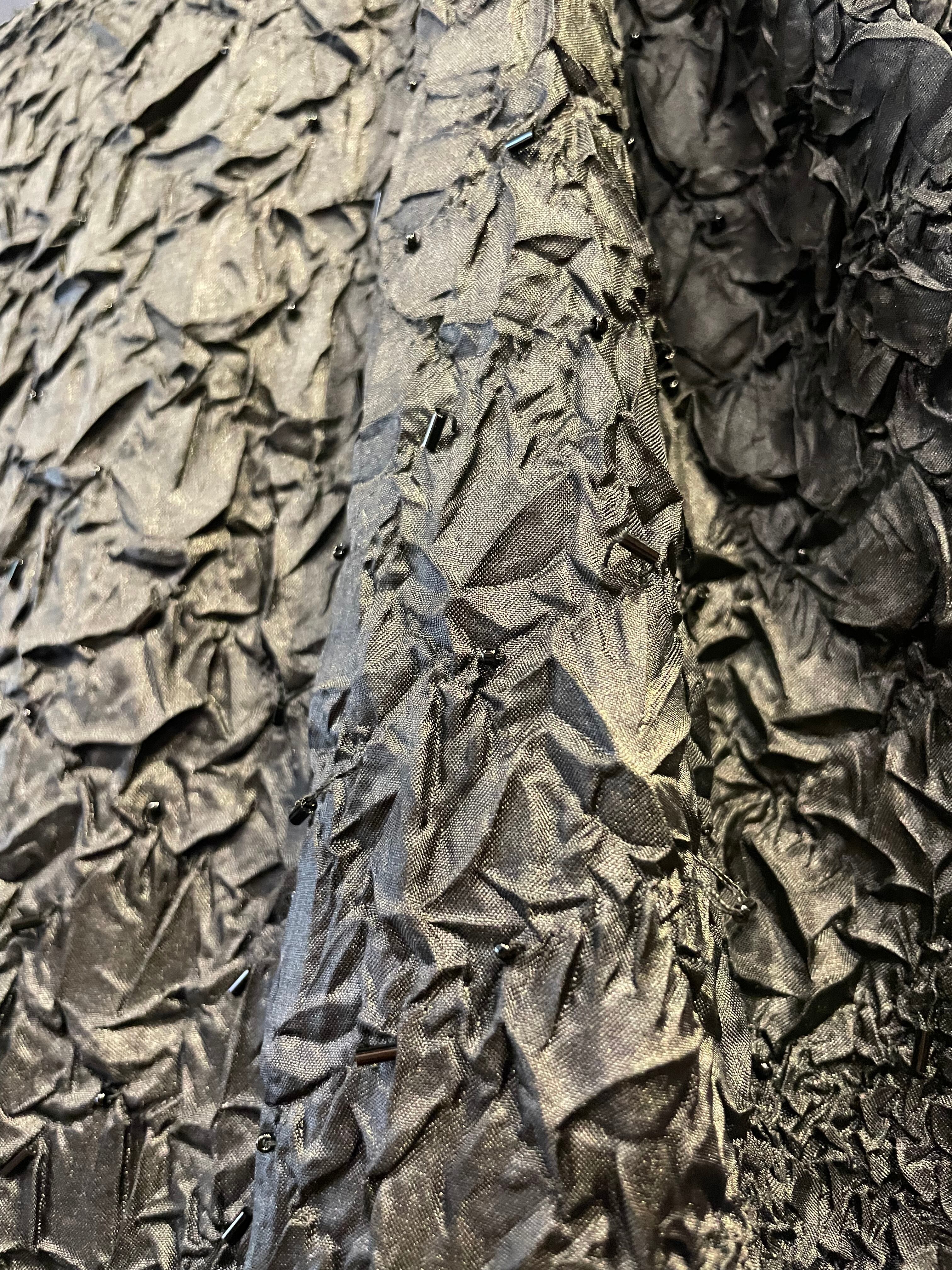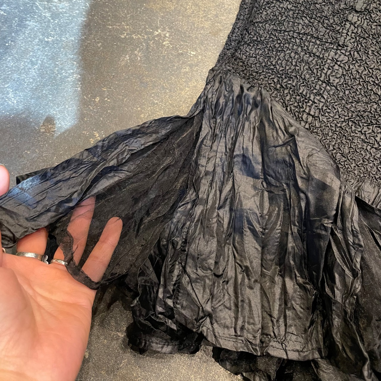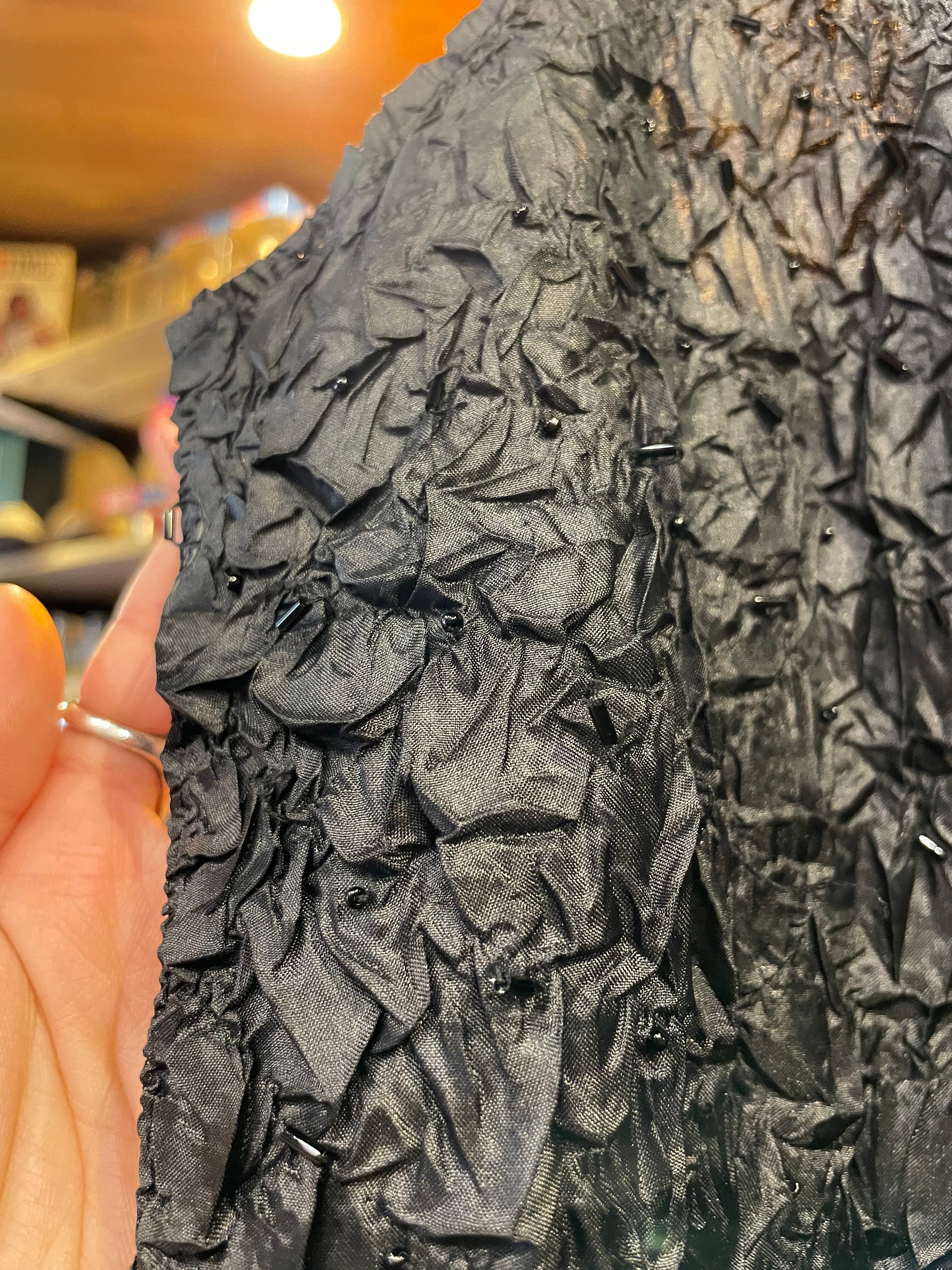 ややマーメイドシルエットのような雰囲気で黒地に黒いビーズがついていたり、大人っぽい一枚です。
