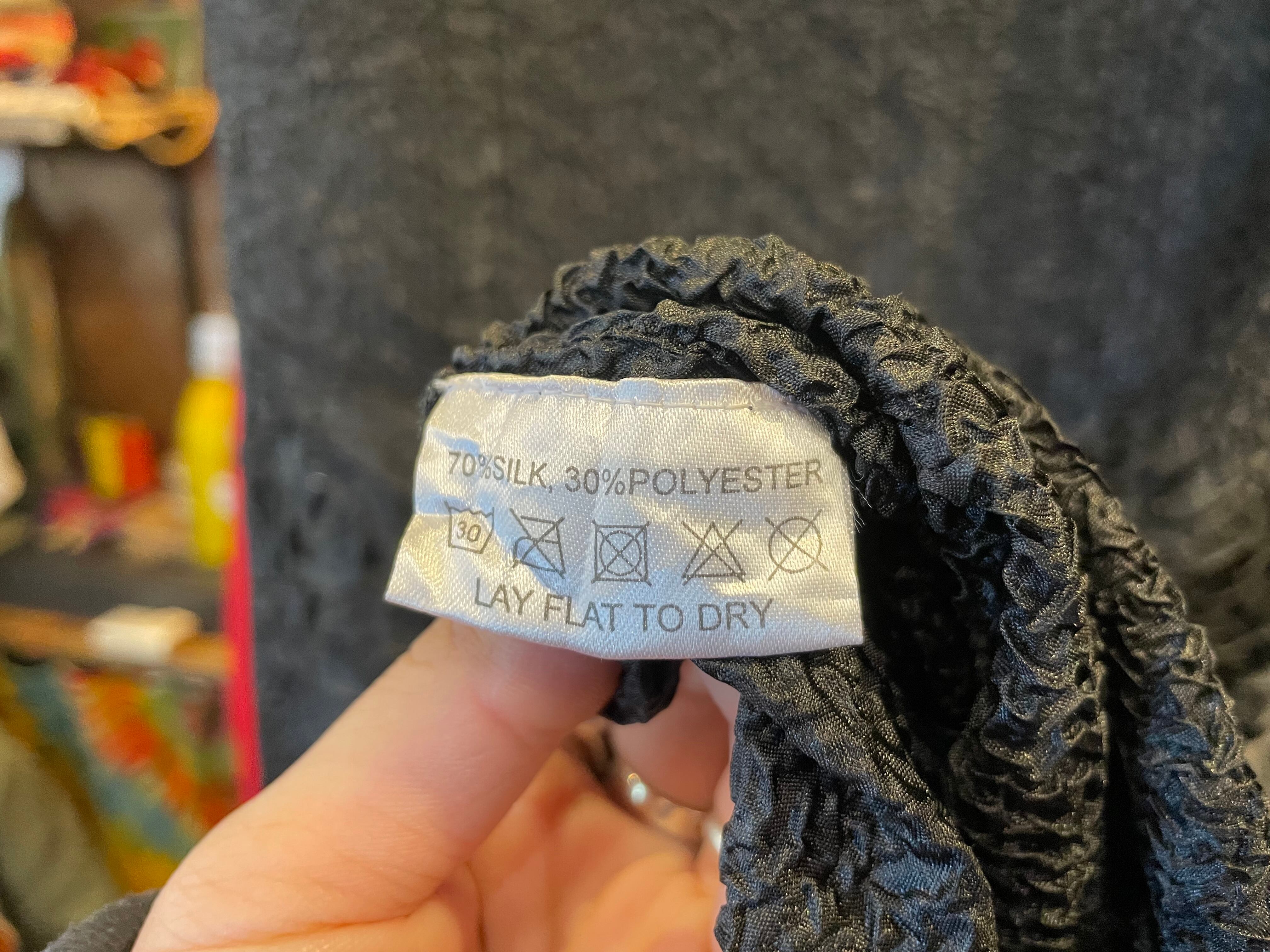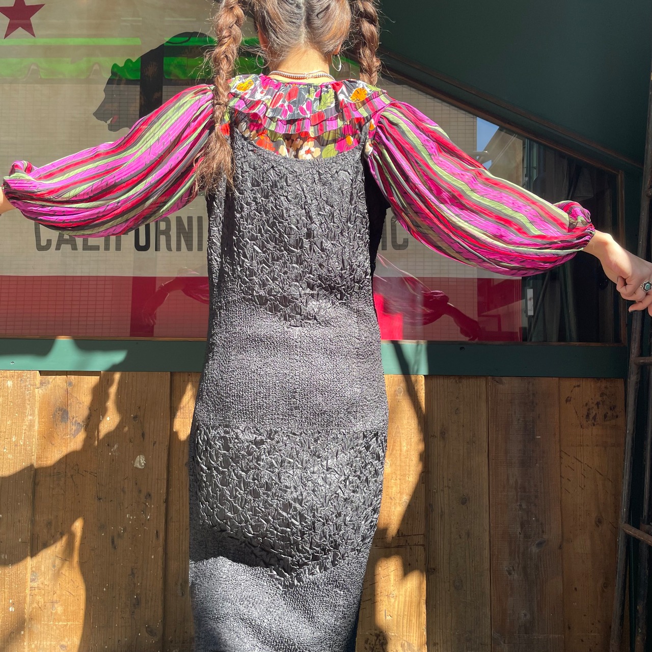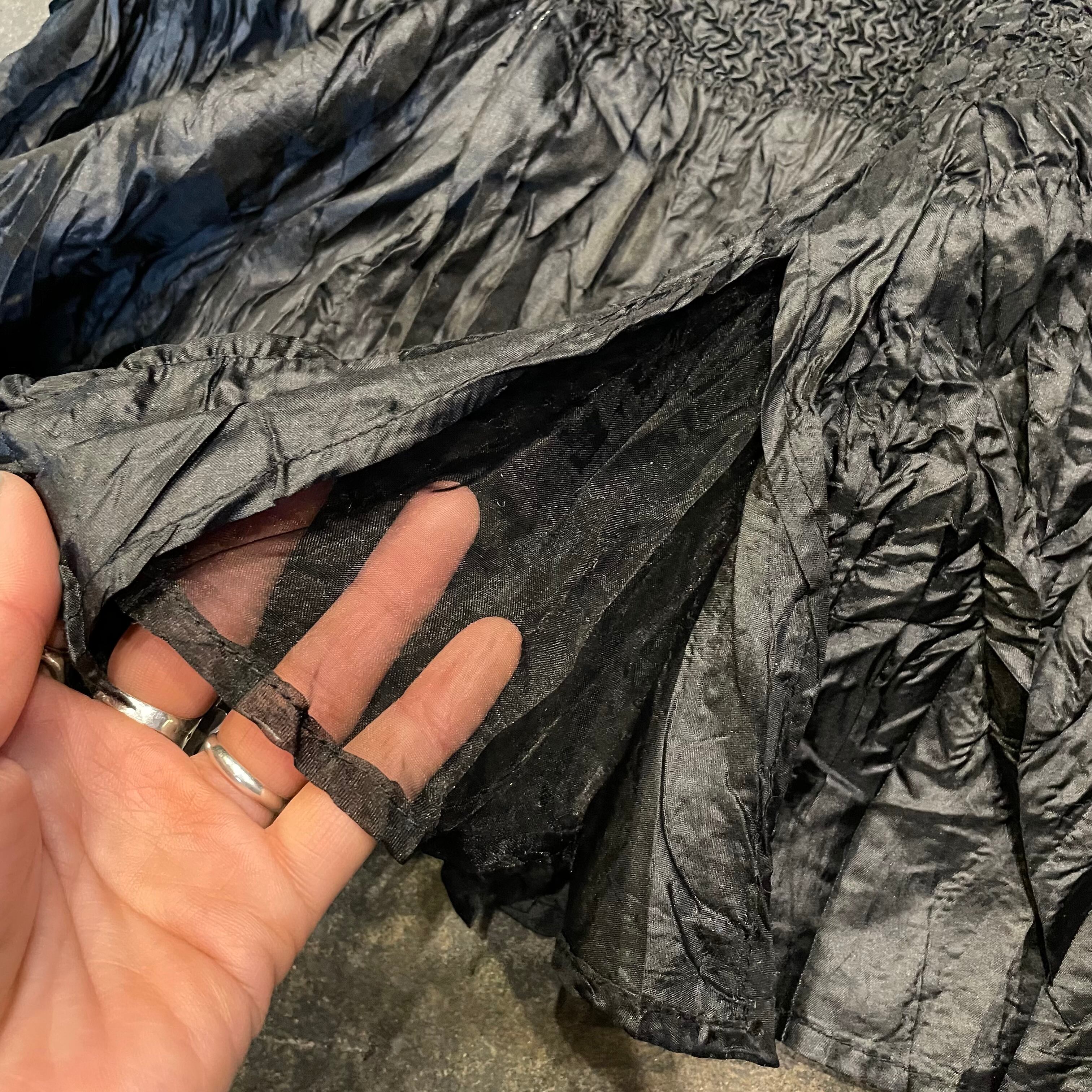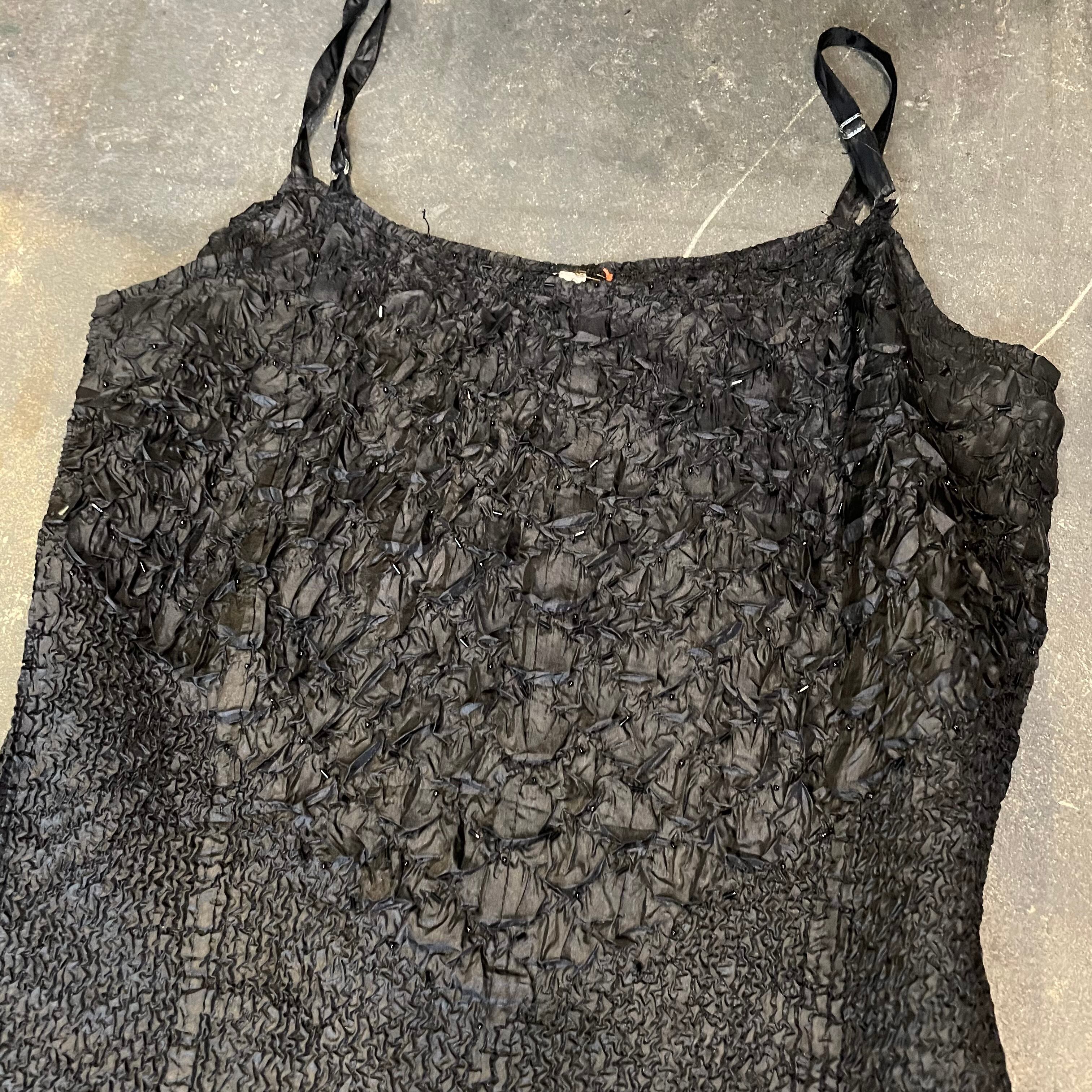 ややマーメイドシルエットのような雰囲気で黒地に黒いビーズがついていたり、大人っぽい一枚です。