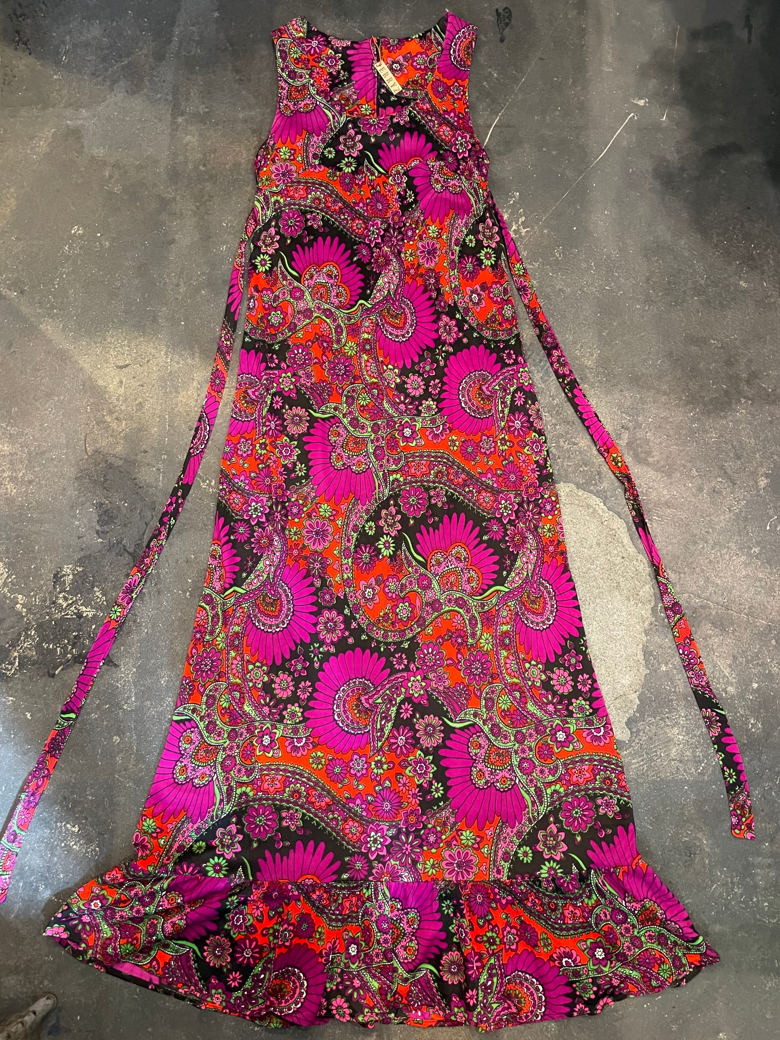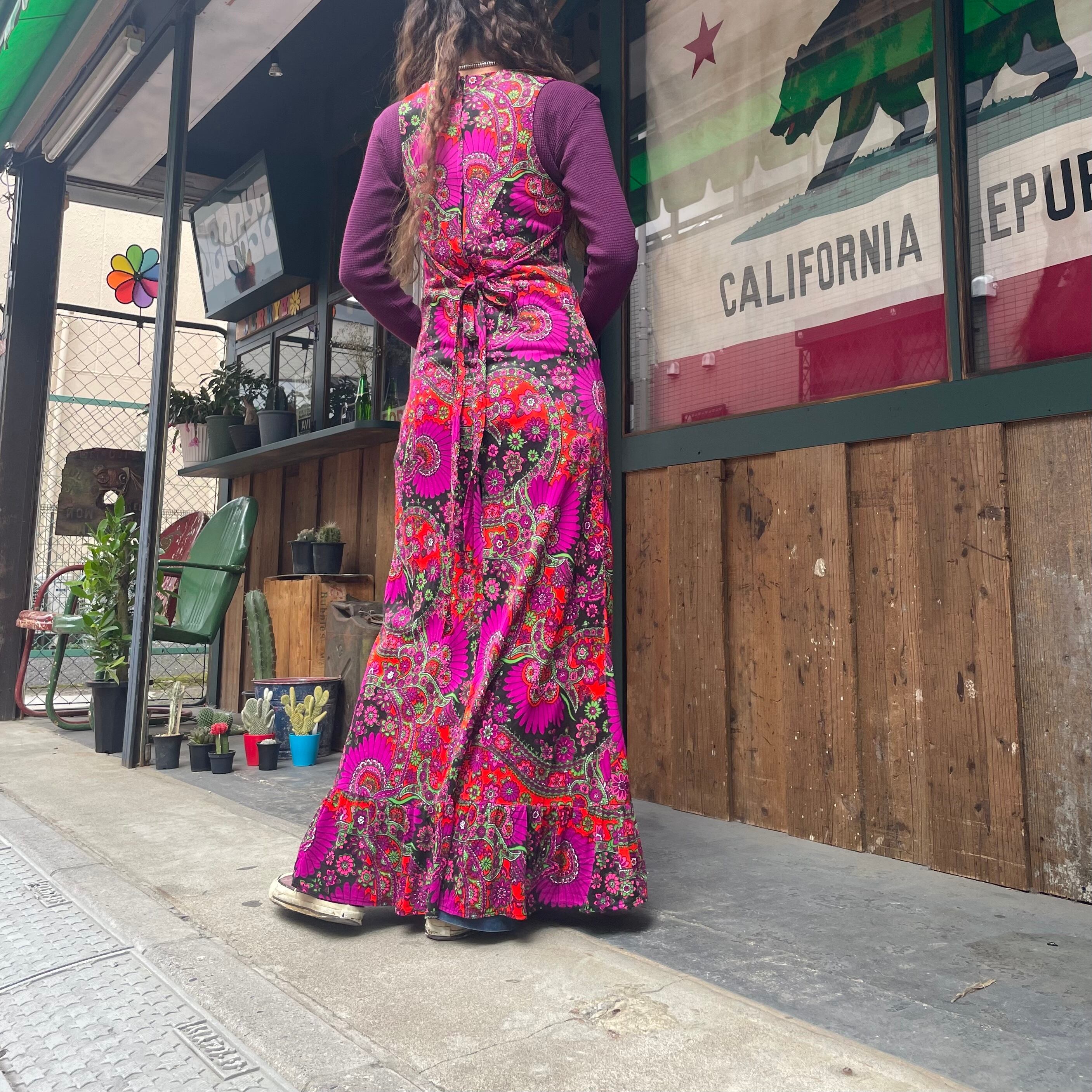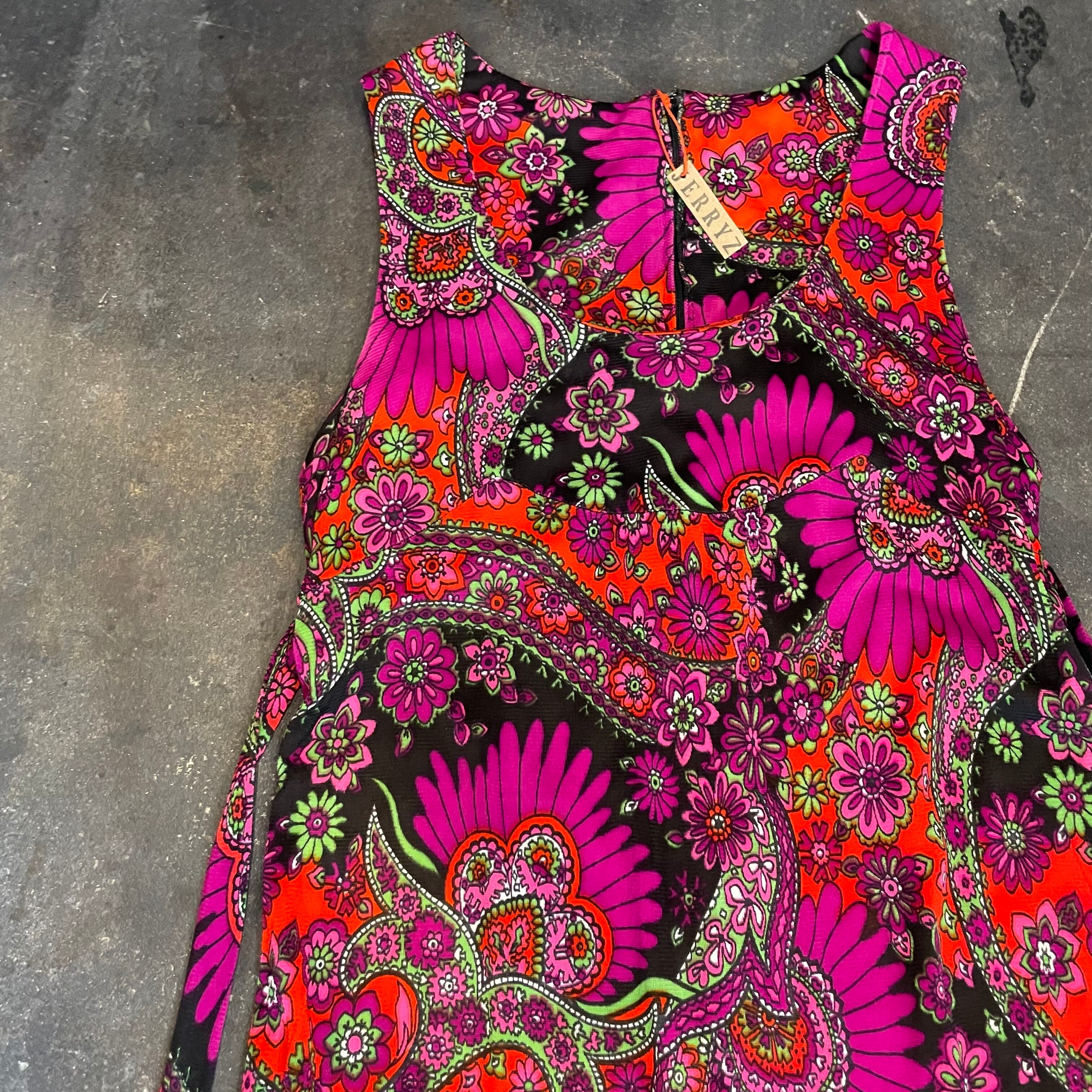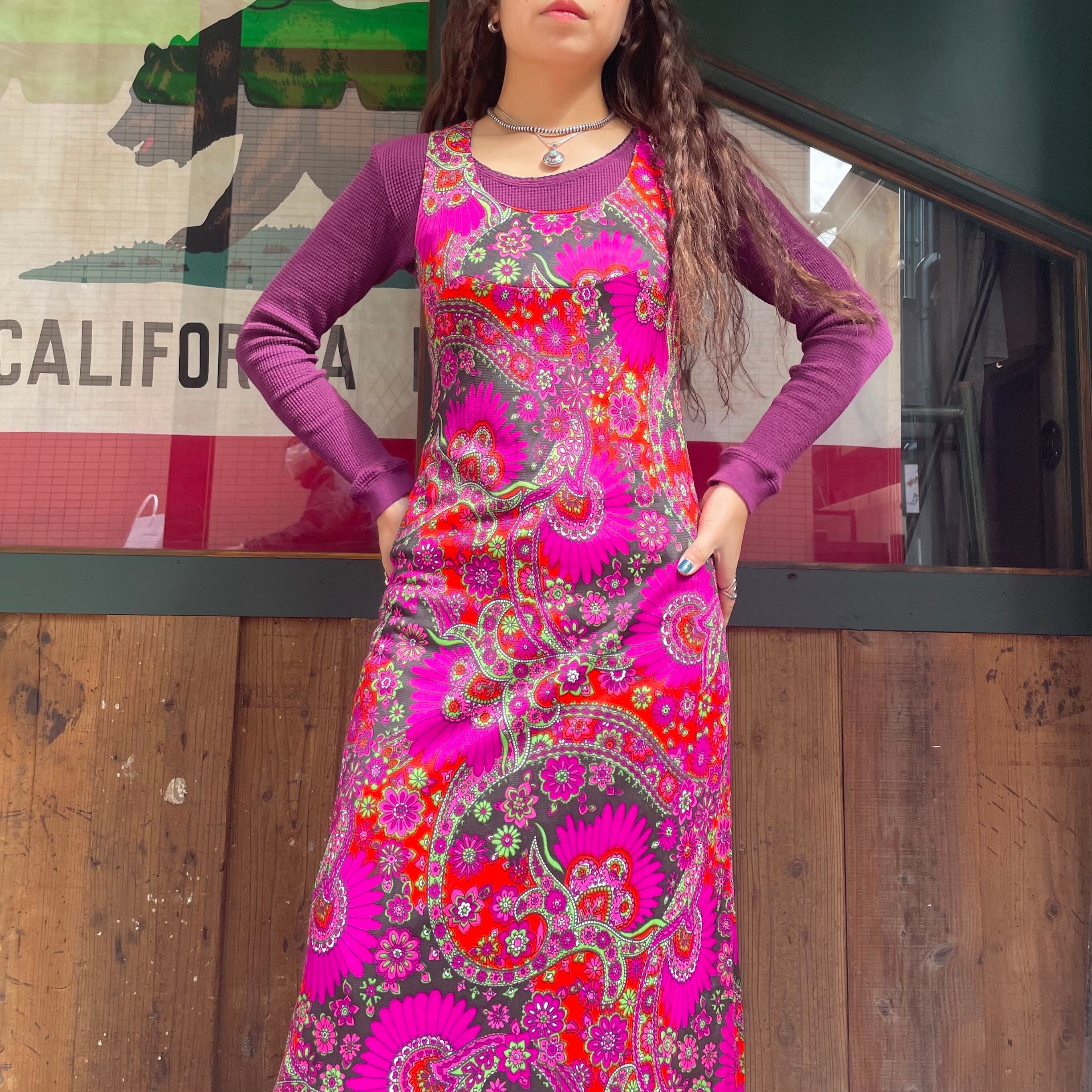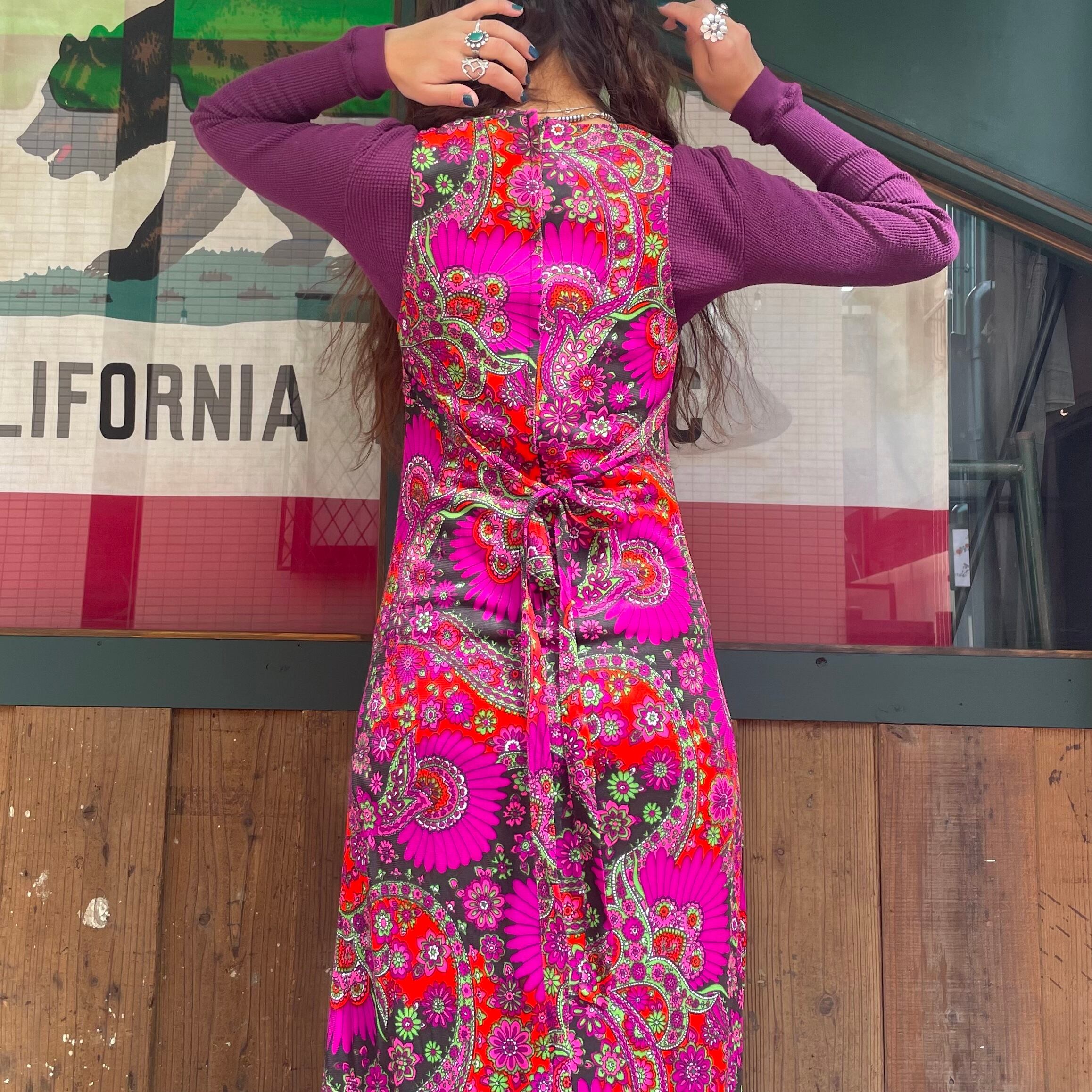 ピンクパープルやオレンジ、グリーンの配色がとてもかわいいサイケデリックな花柄のワンピースです。