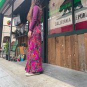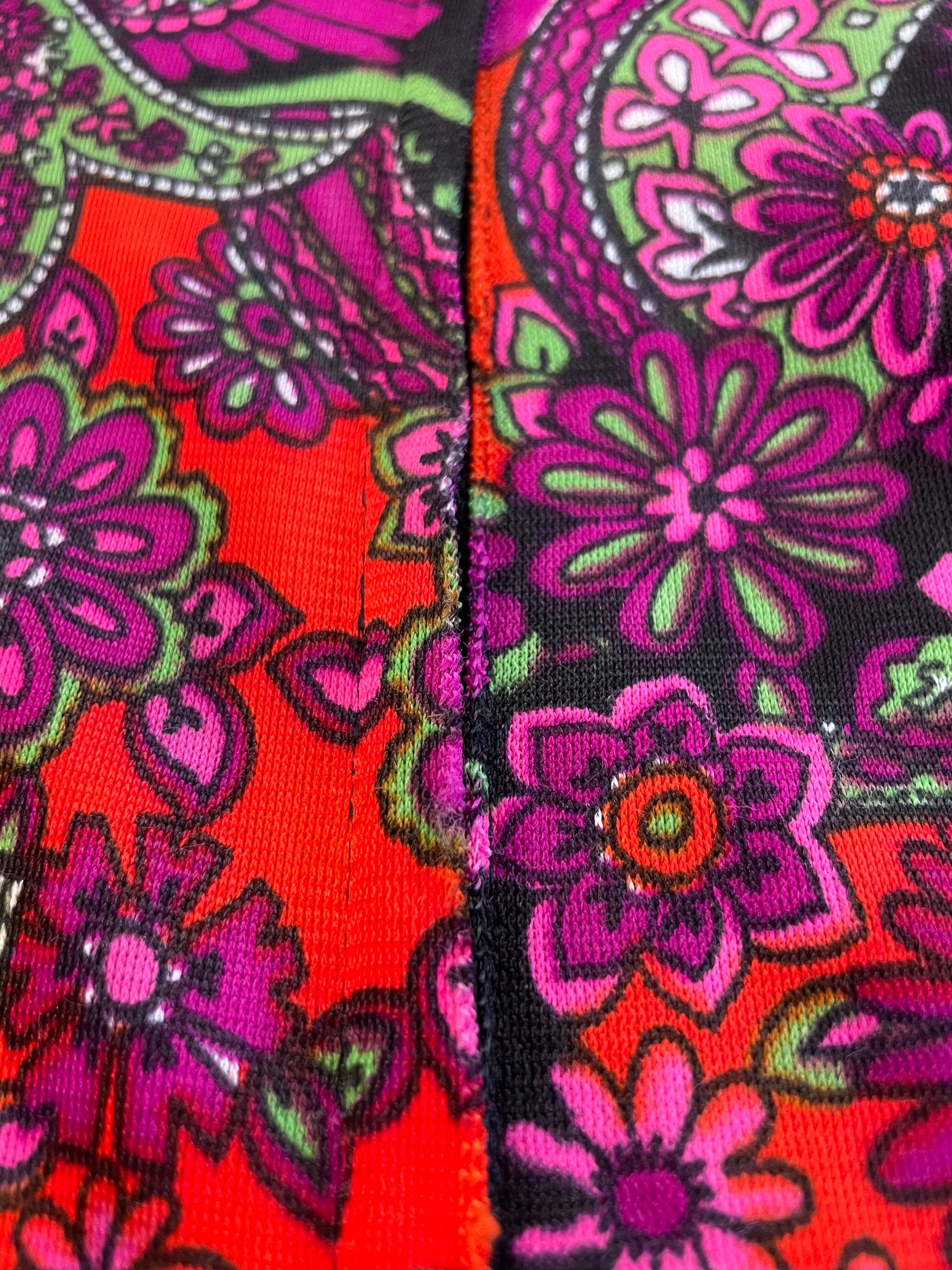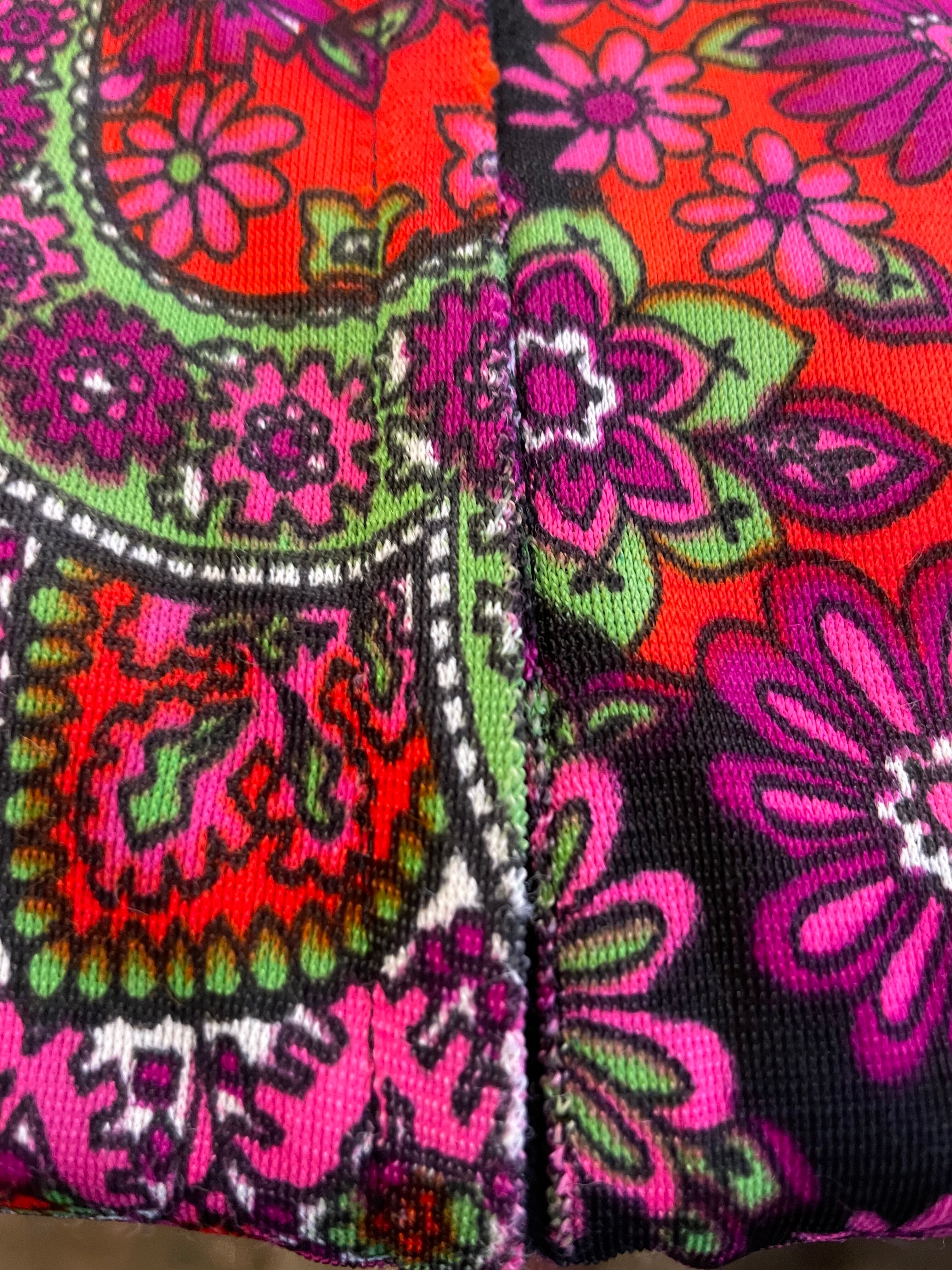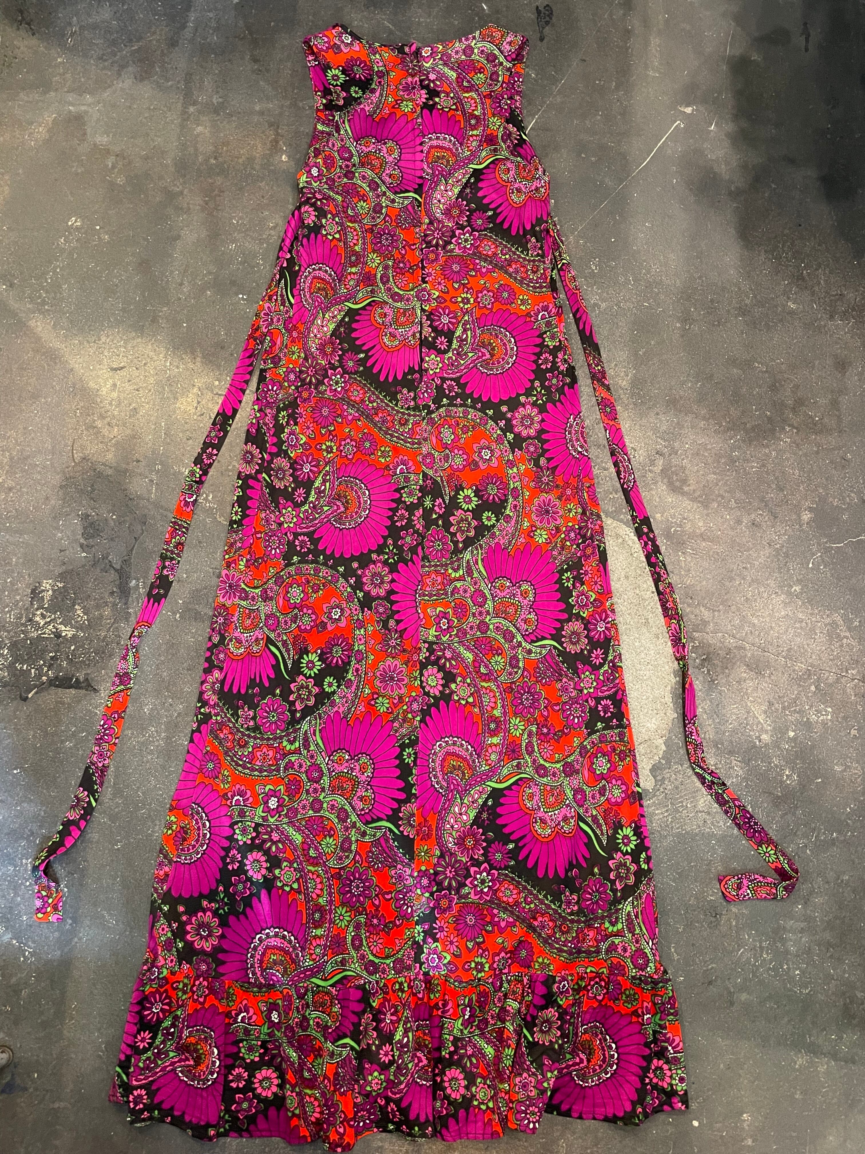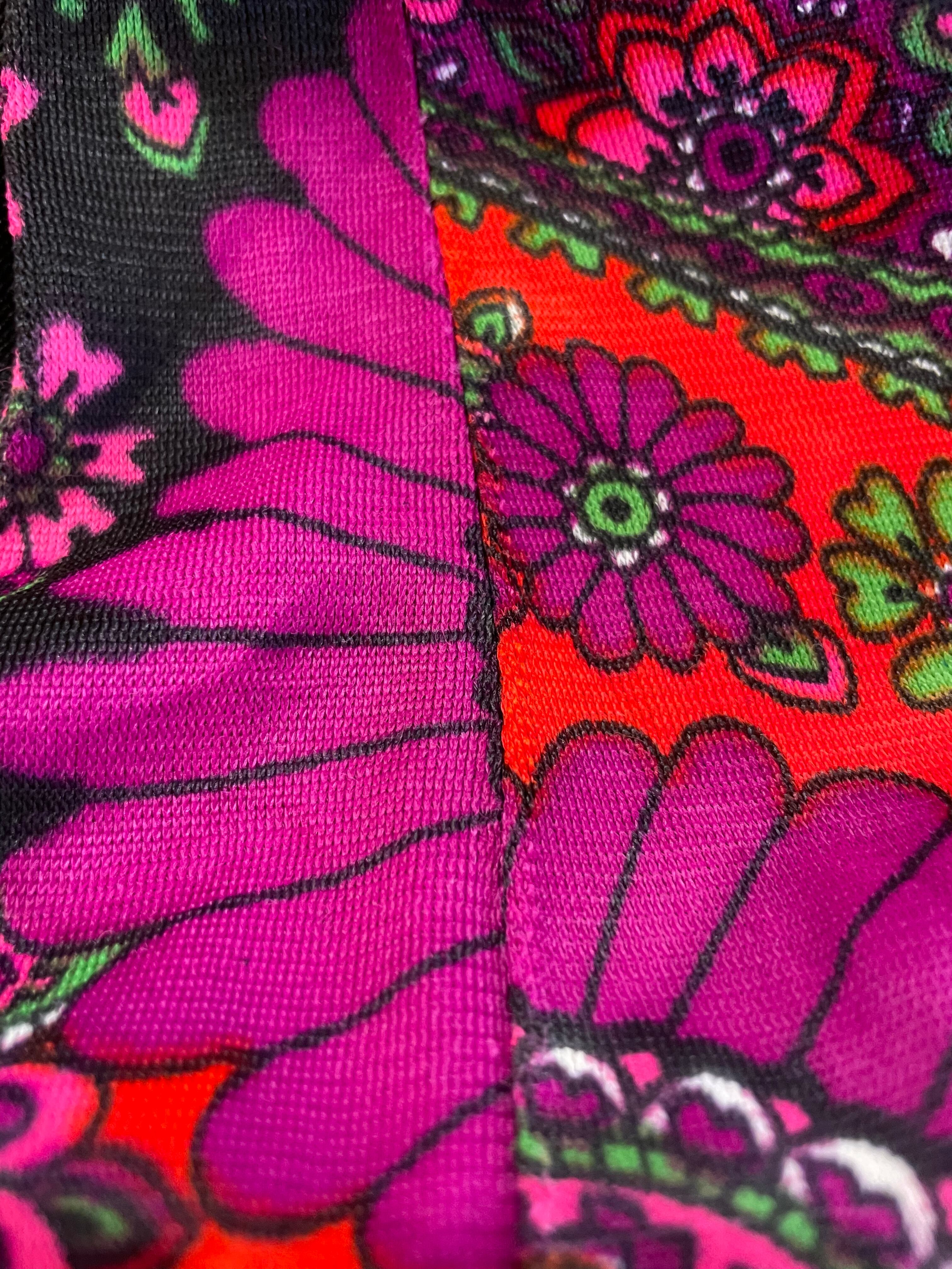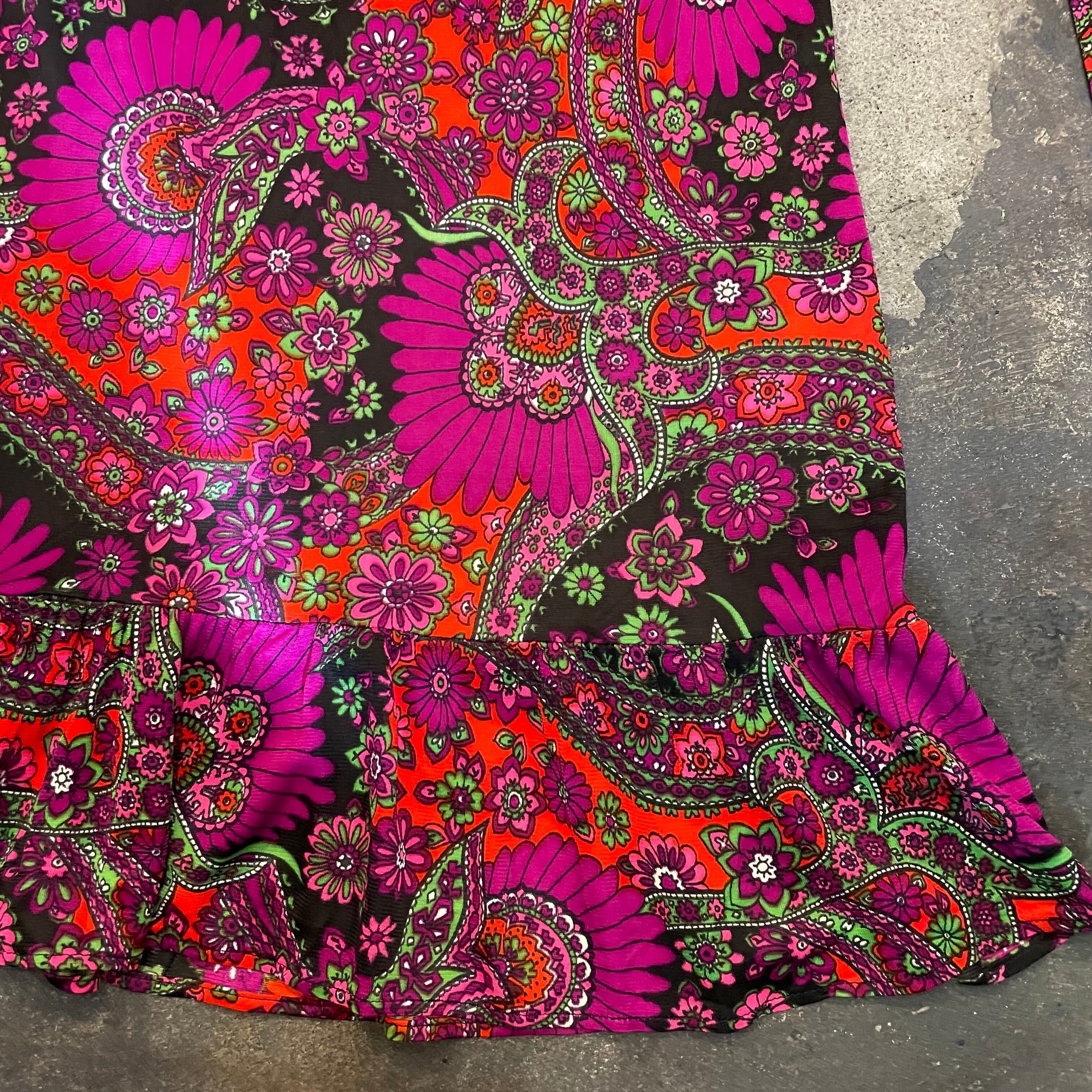 ピンクパープルやオレンジ、グリーンの配色がとてもかわいいサイケデリックな花柄のワンピースです。