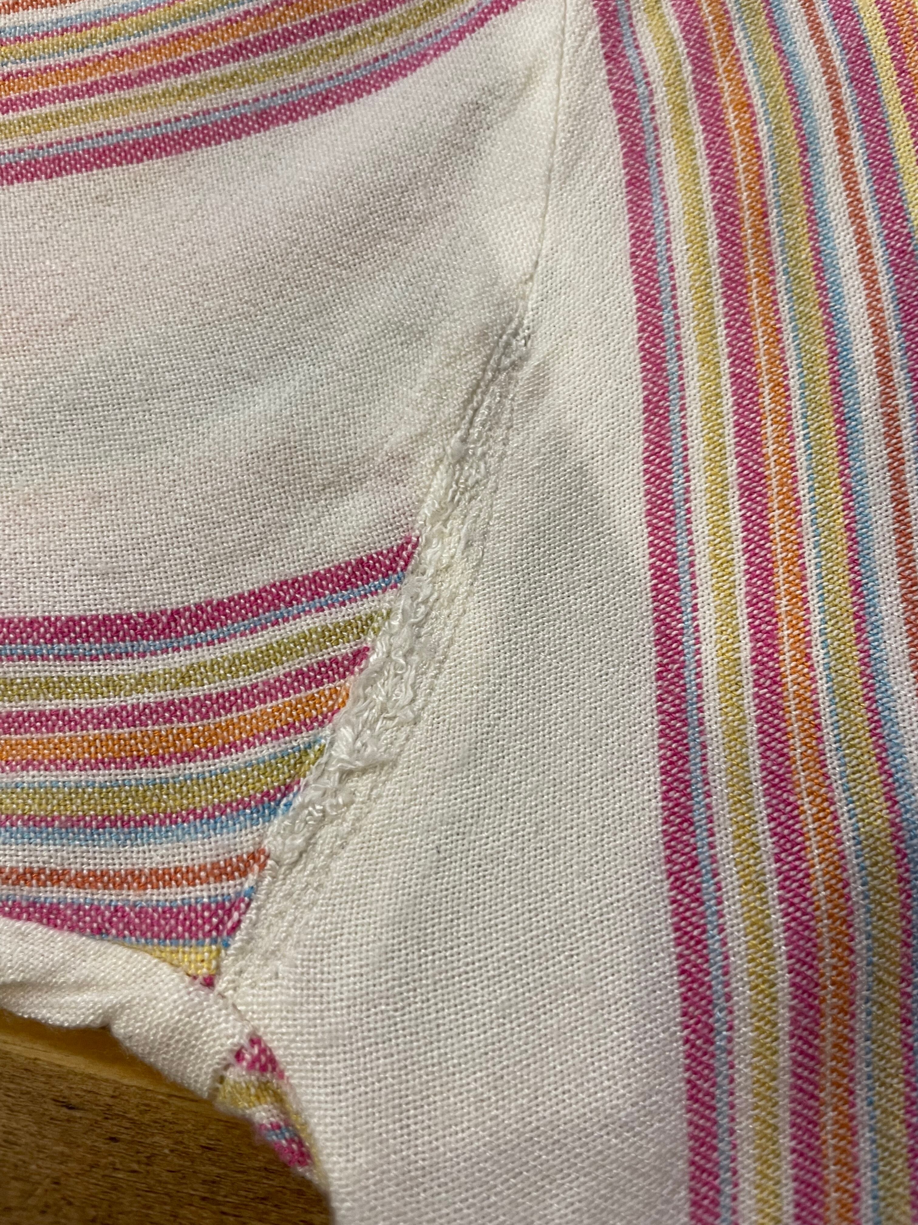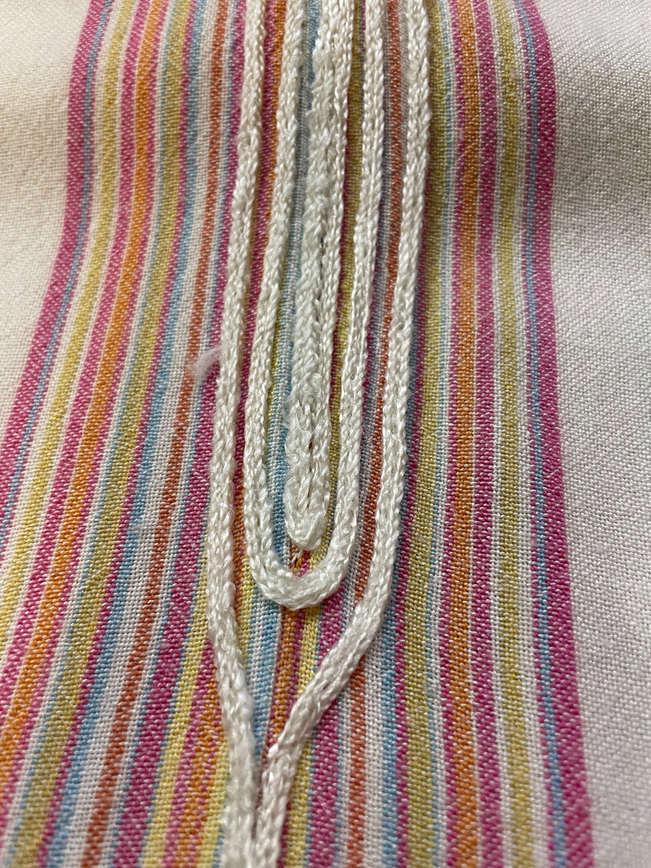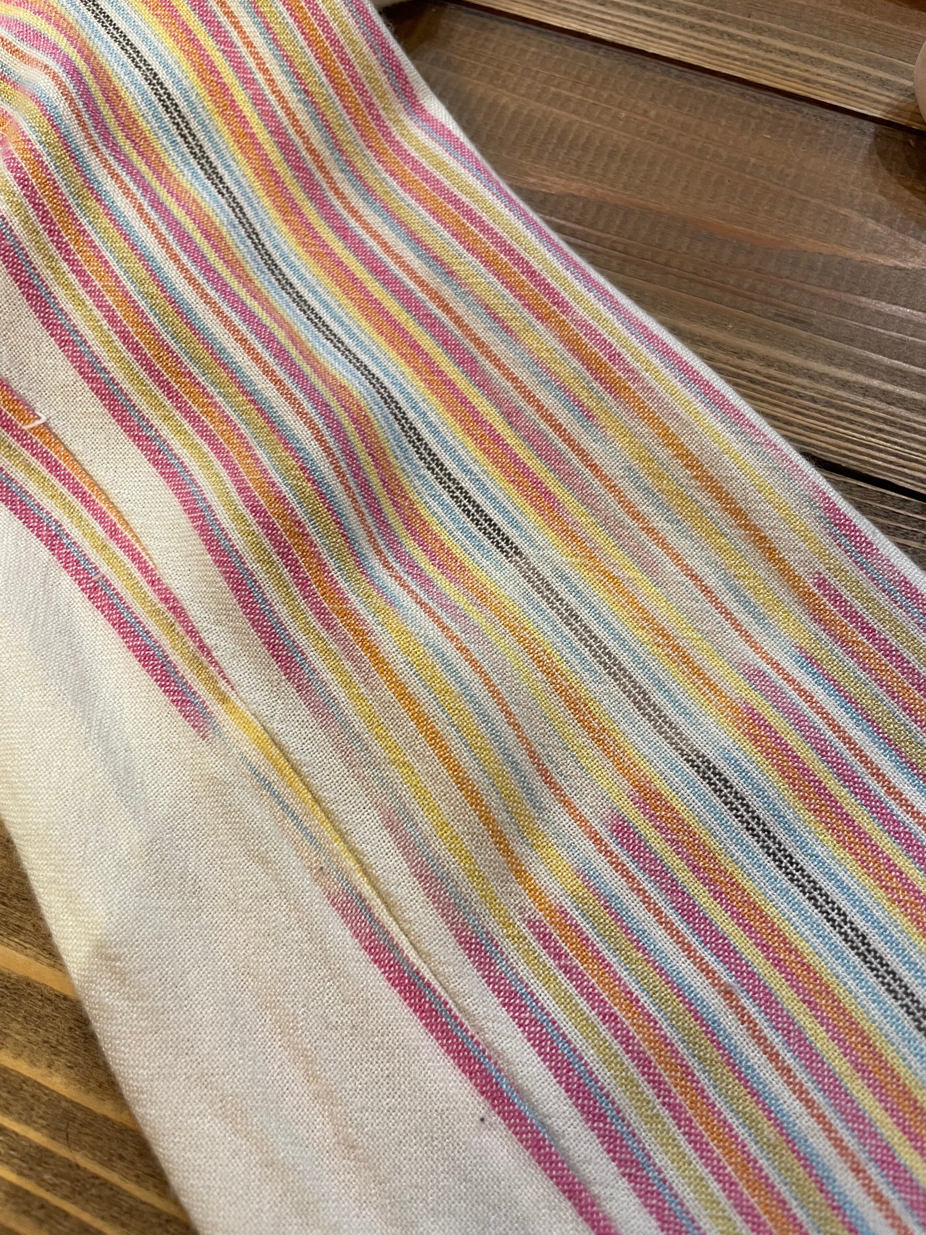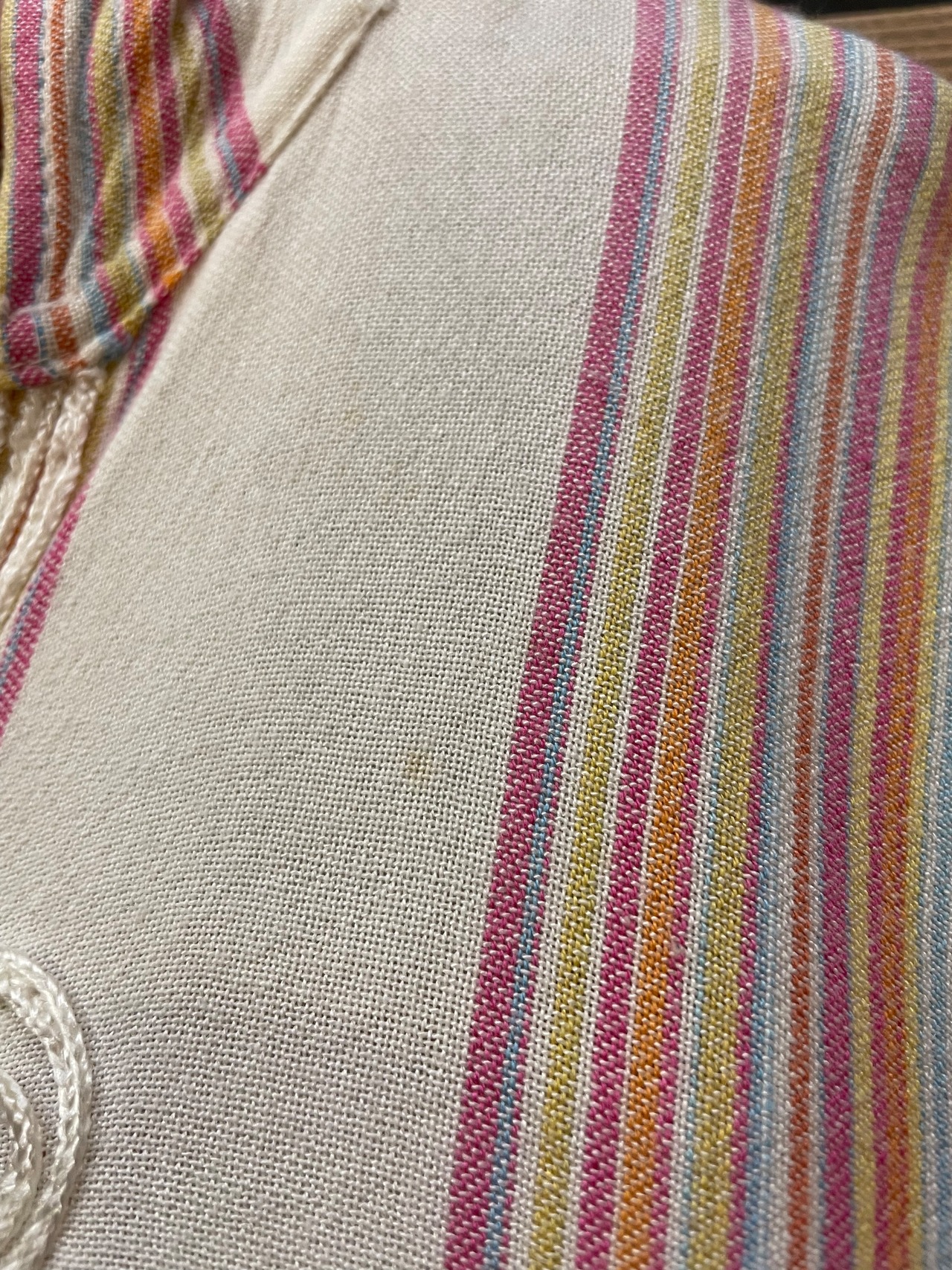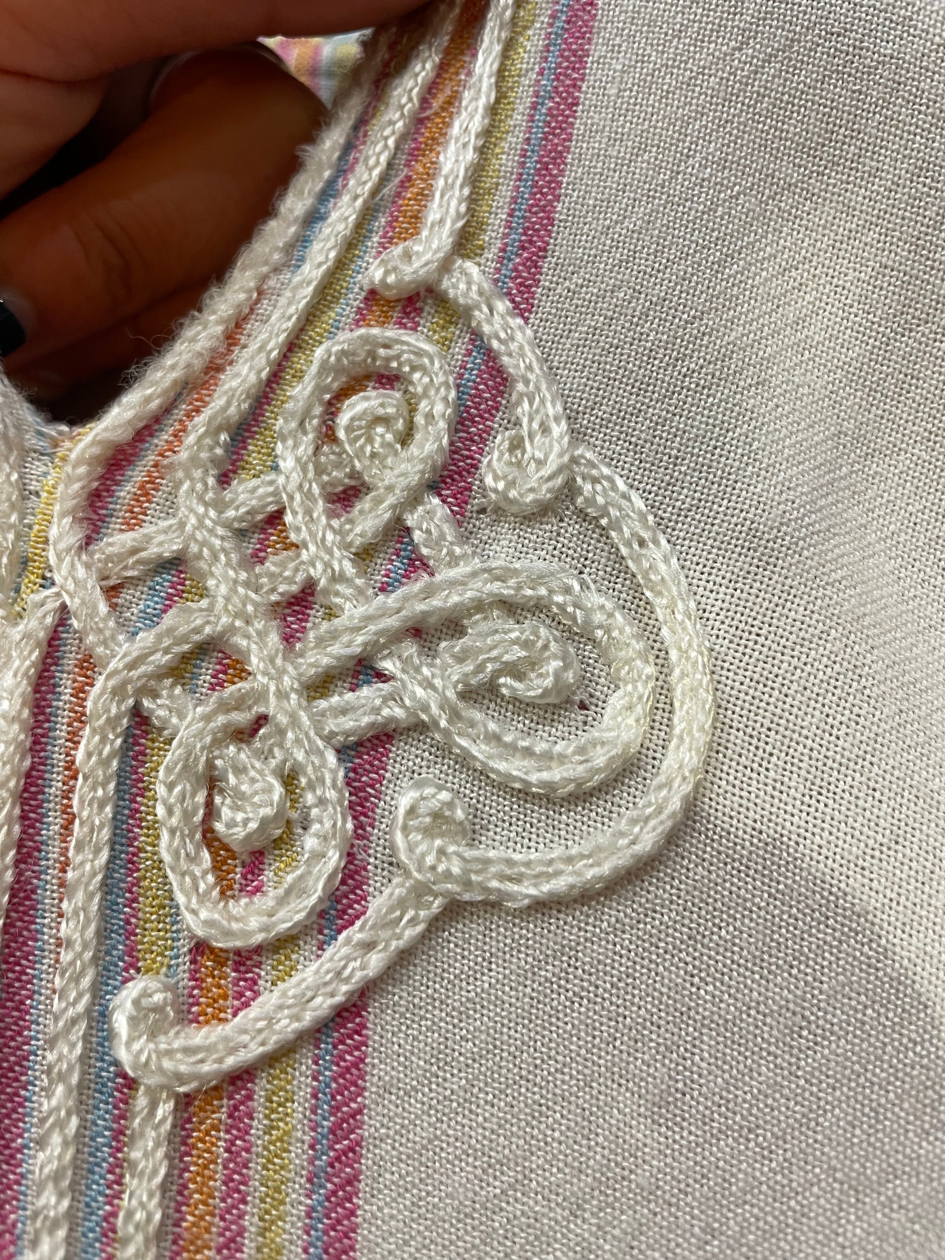 カラフルなストライプに白のコード刺繍がかわいいトップスです。