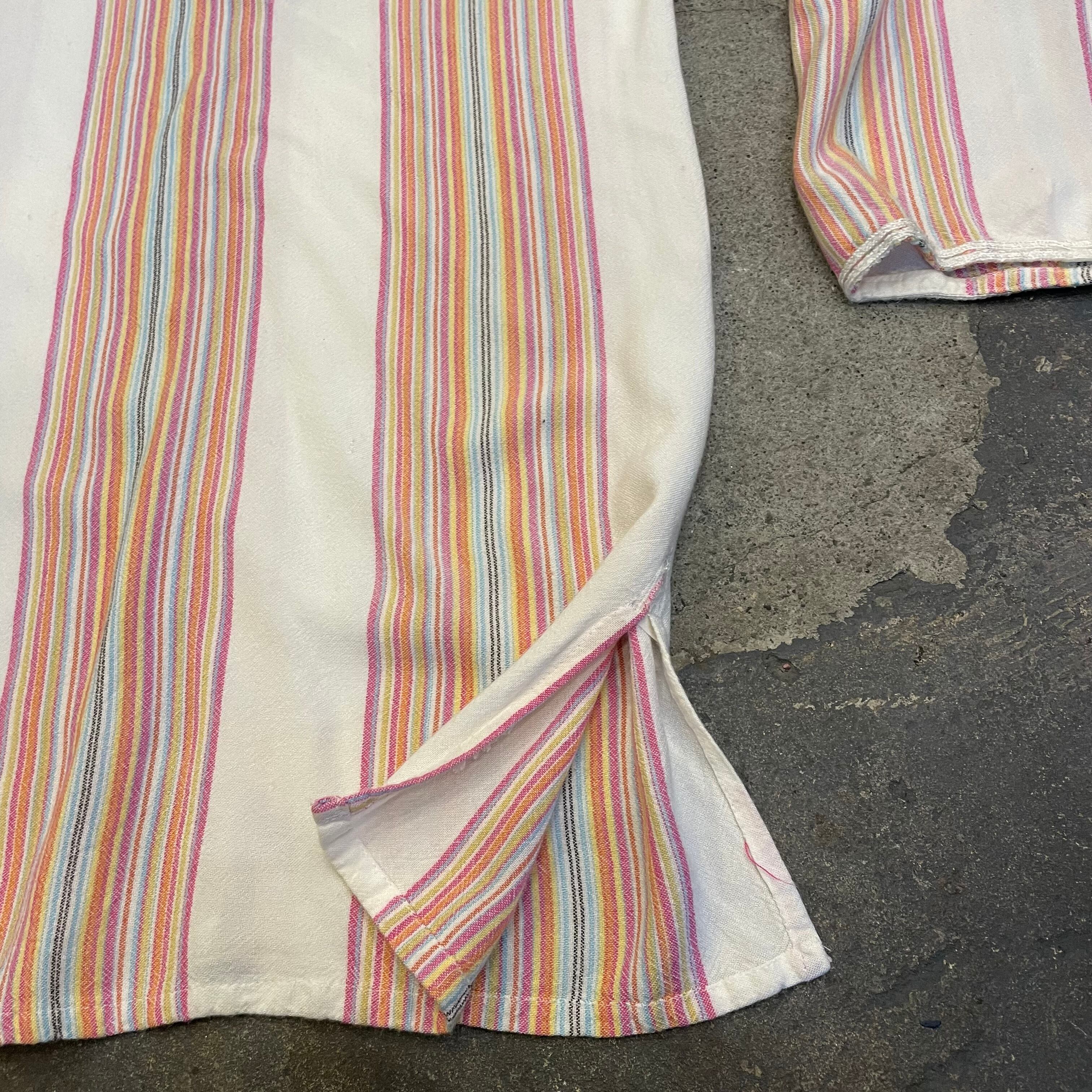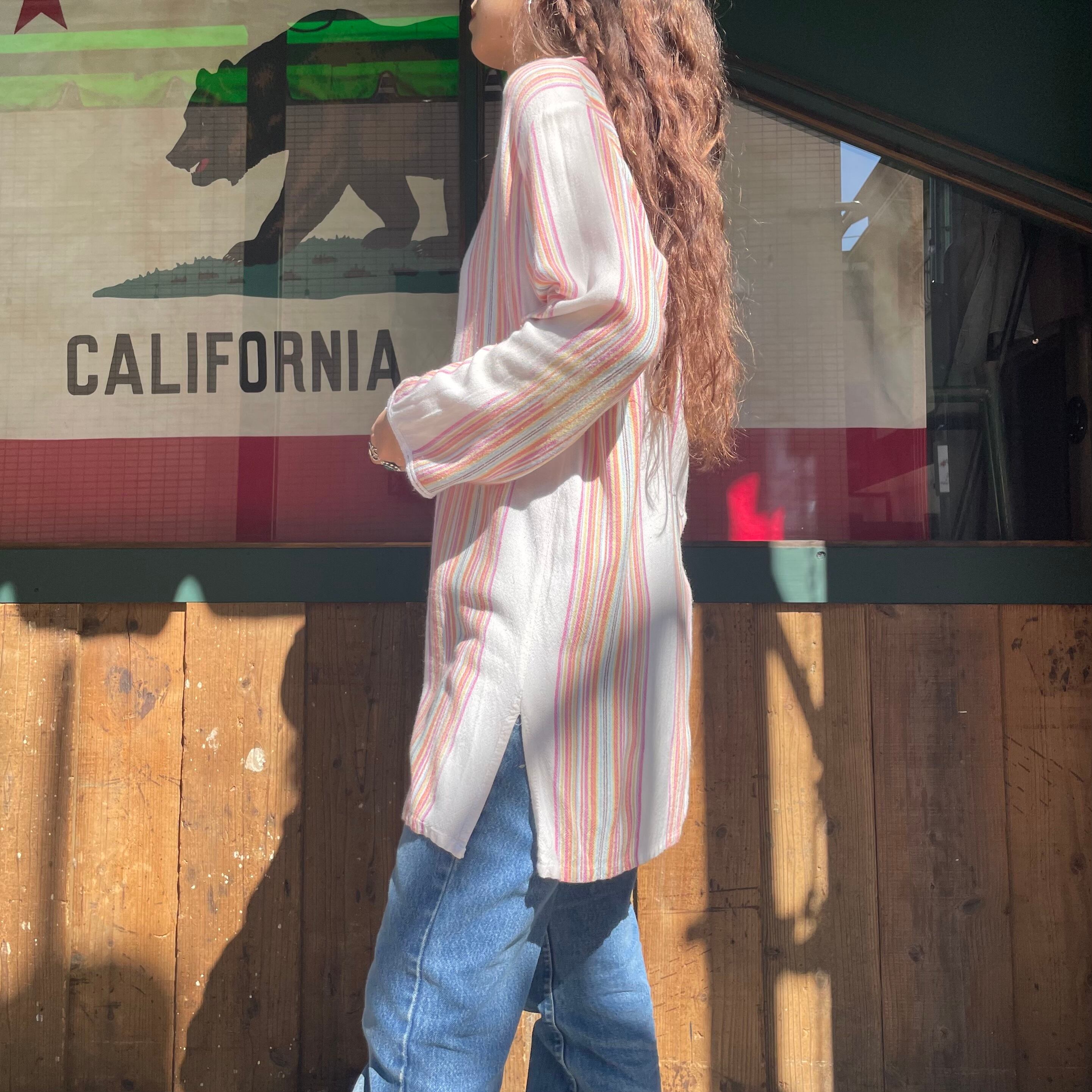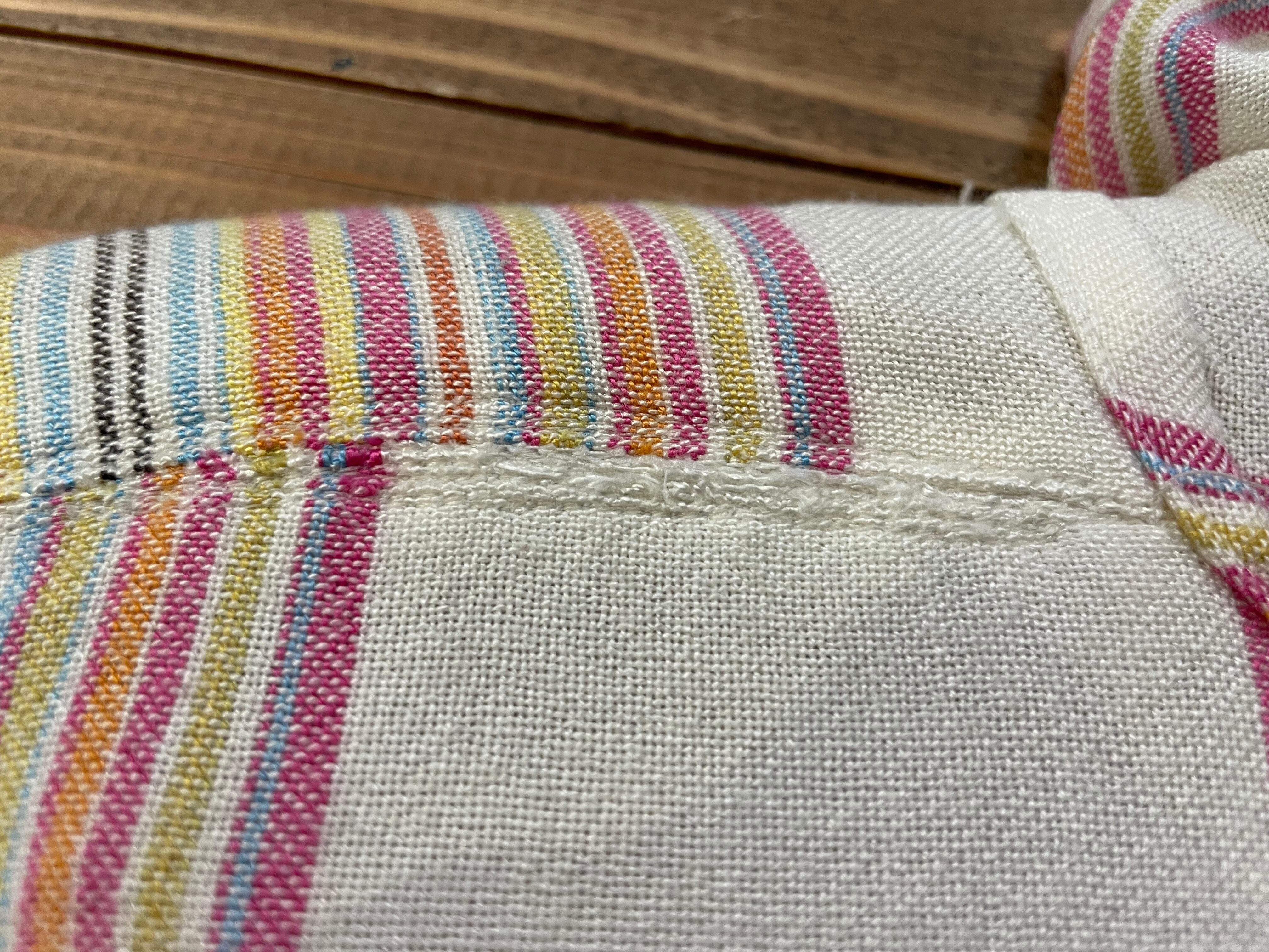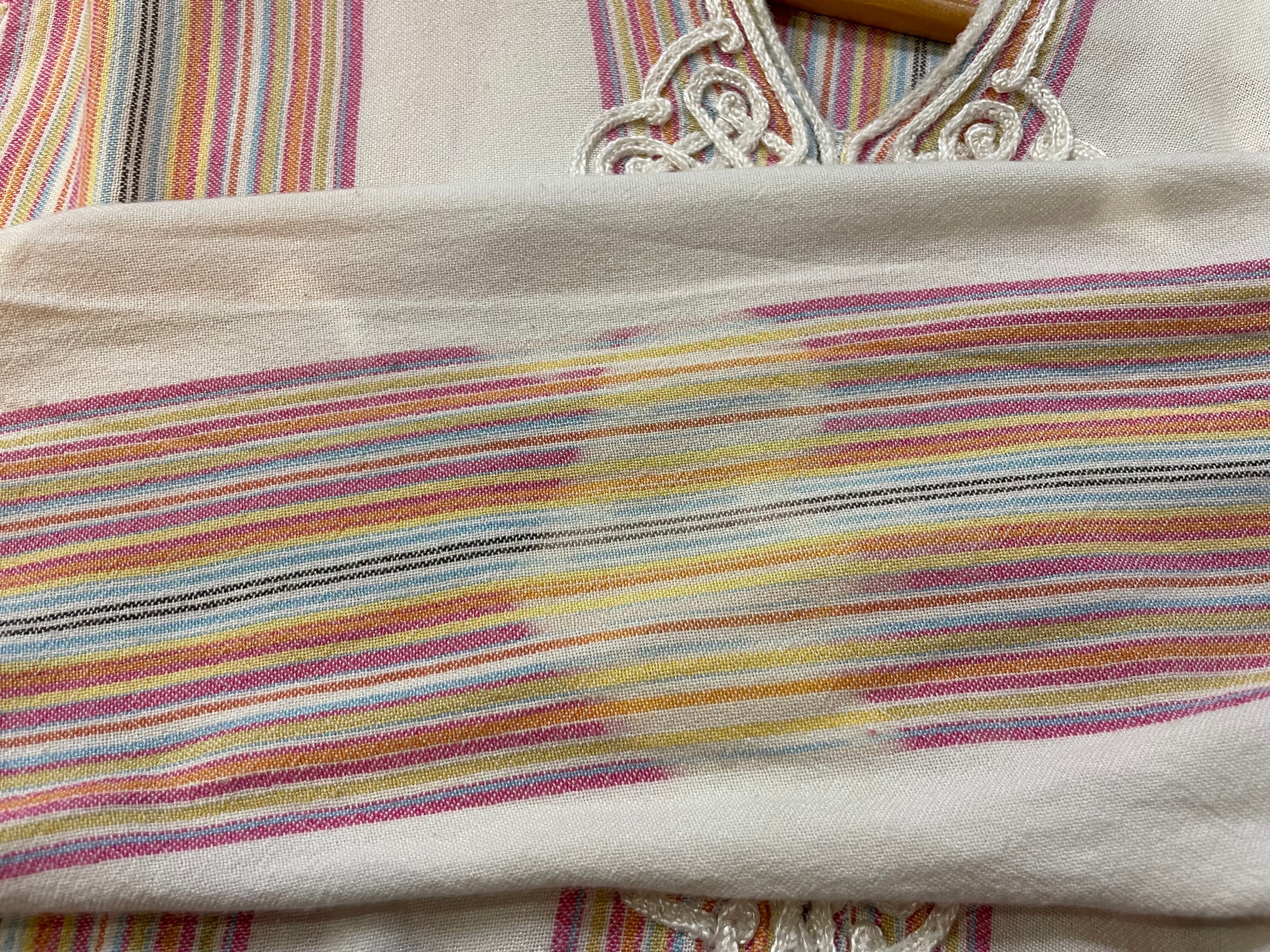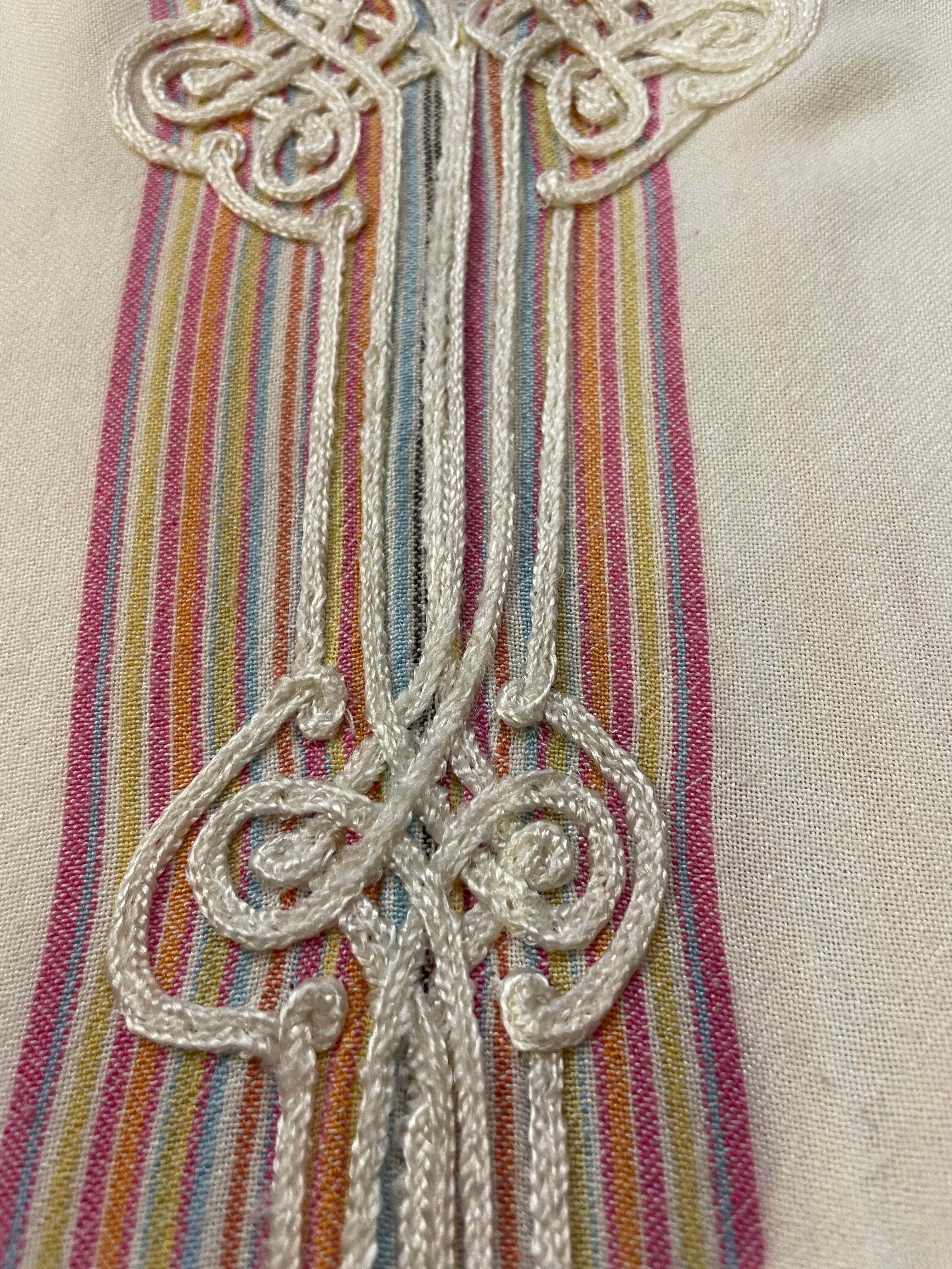 カラフルなストライプに白のコード刺繍がかわいいトップスです。