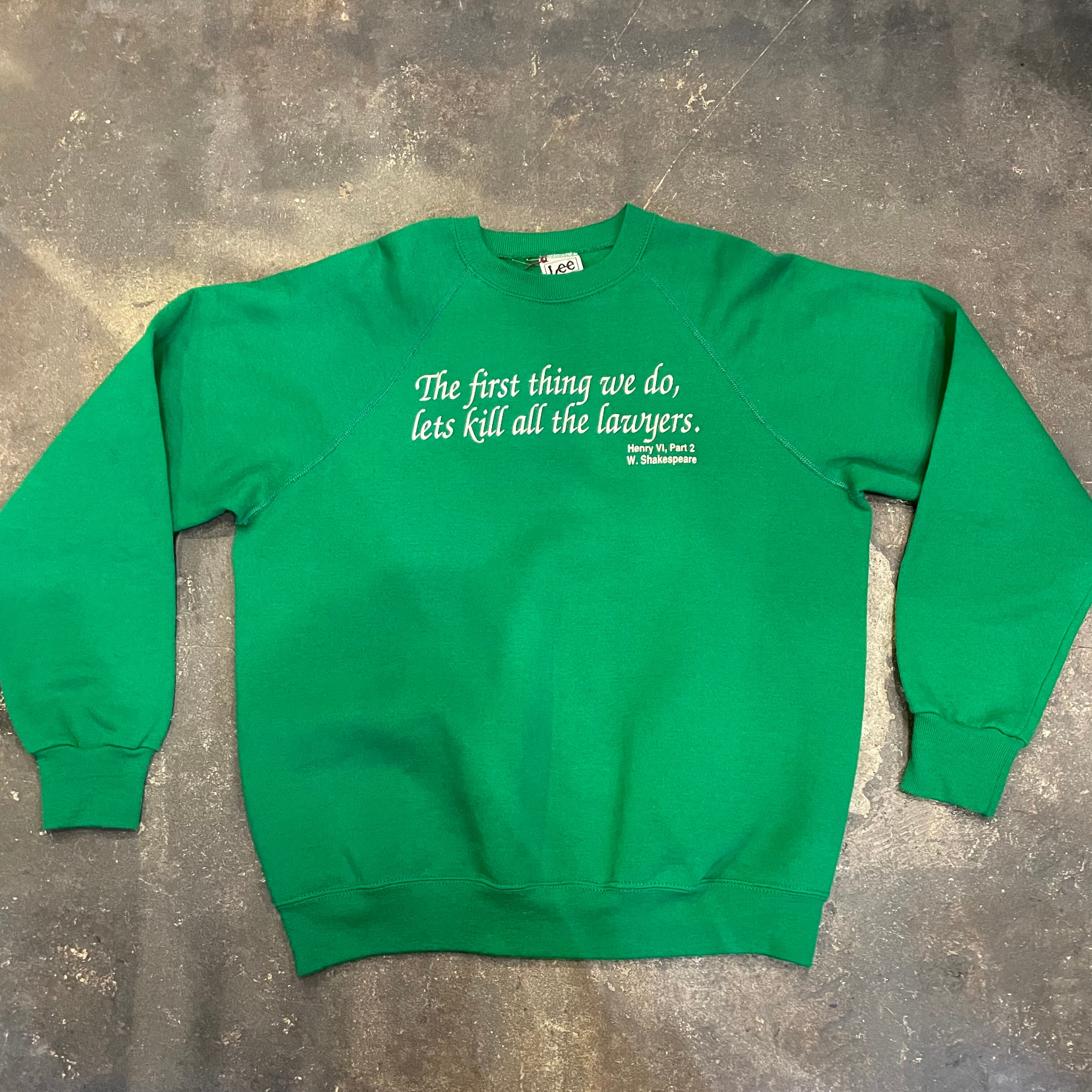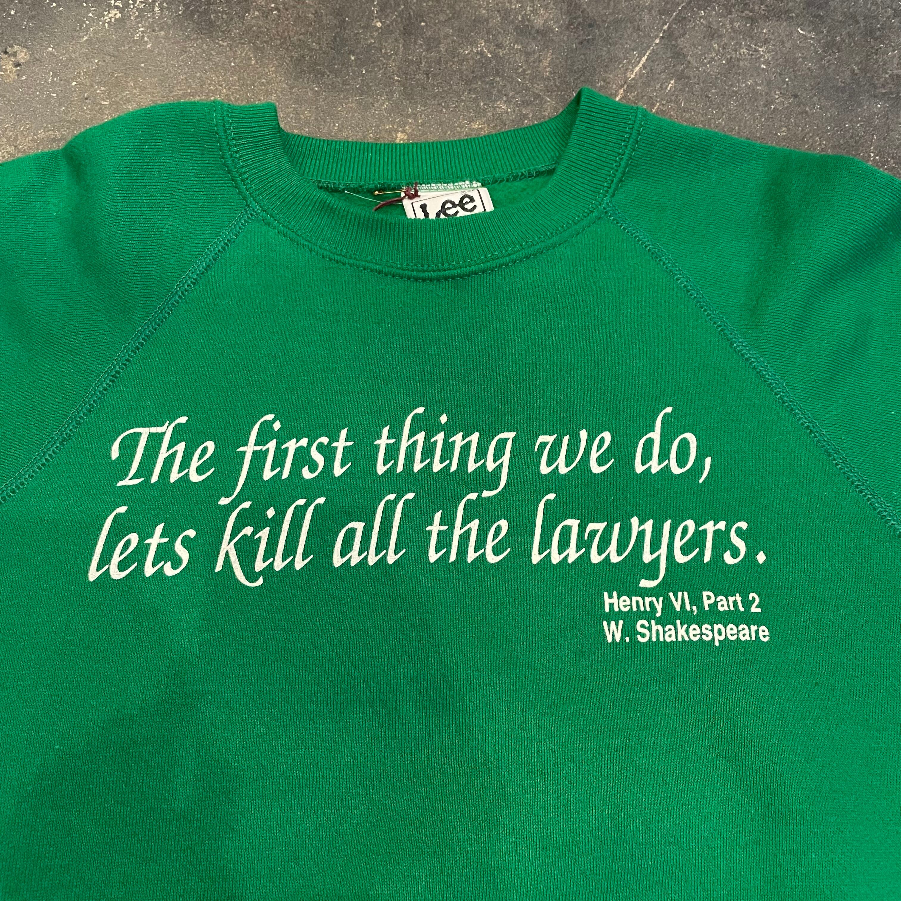 前は、ヘンリー6世 第2部というシェイクスピアの戯曲に出てくるセリフ(まず初めに弁護士を皆殺しにしよう)のプリントです。背中はイリノイ州シカゴにあるシアターの名前のようです。