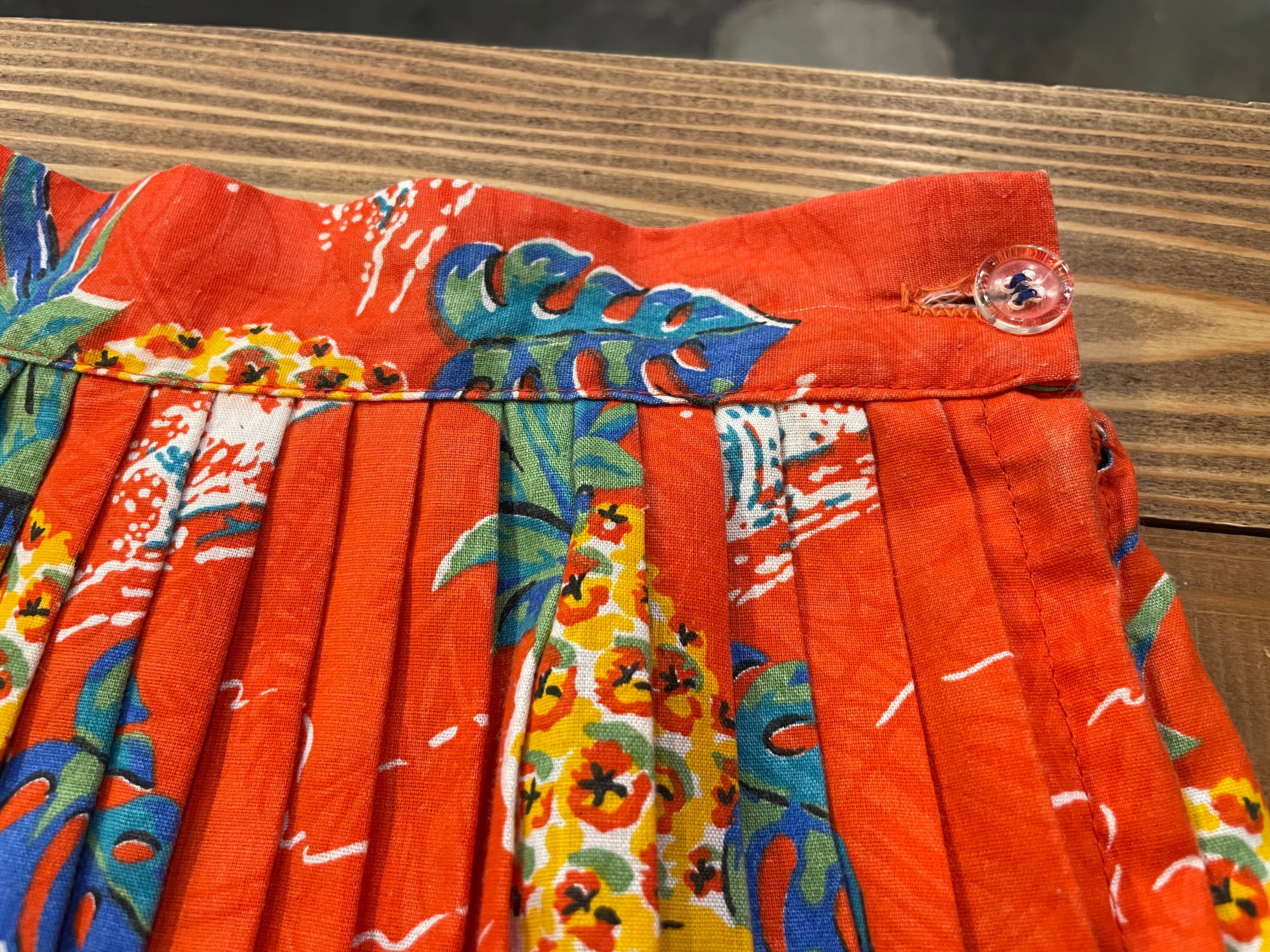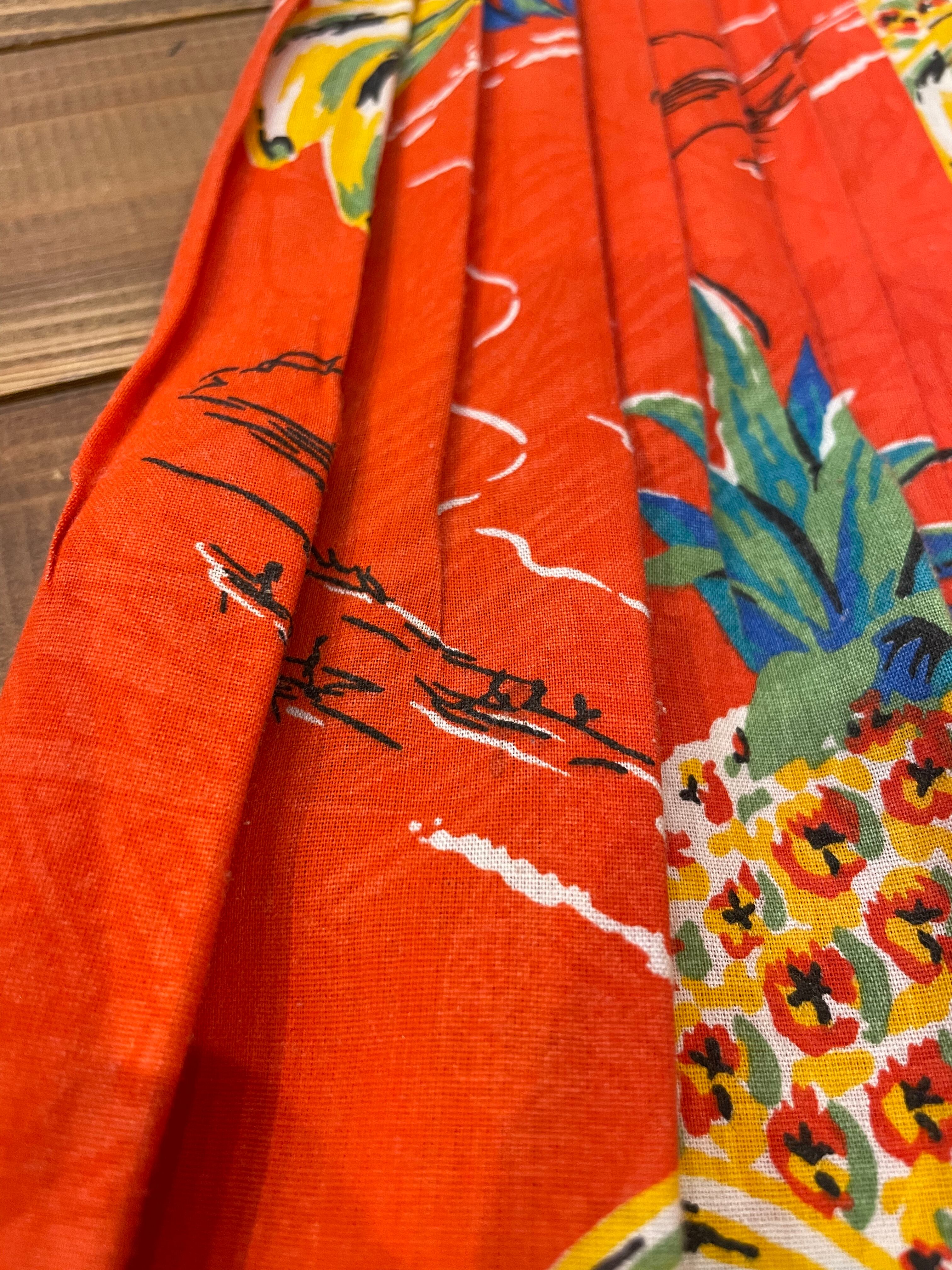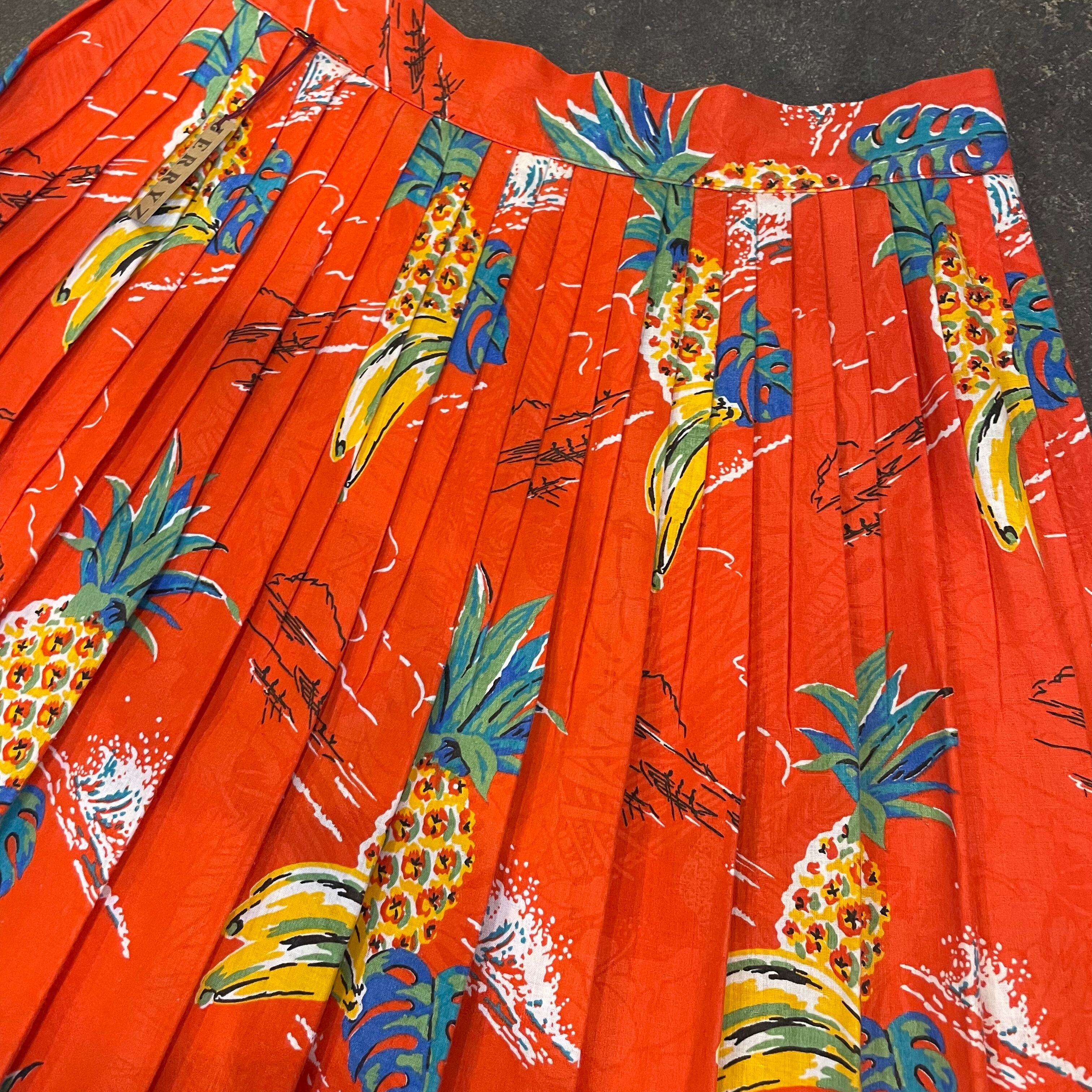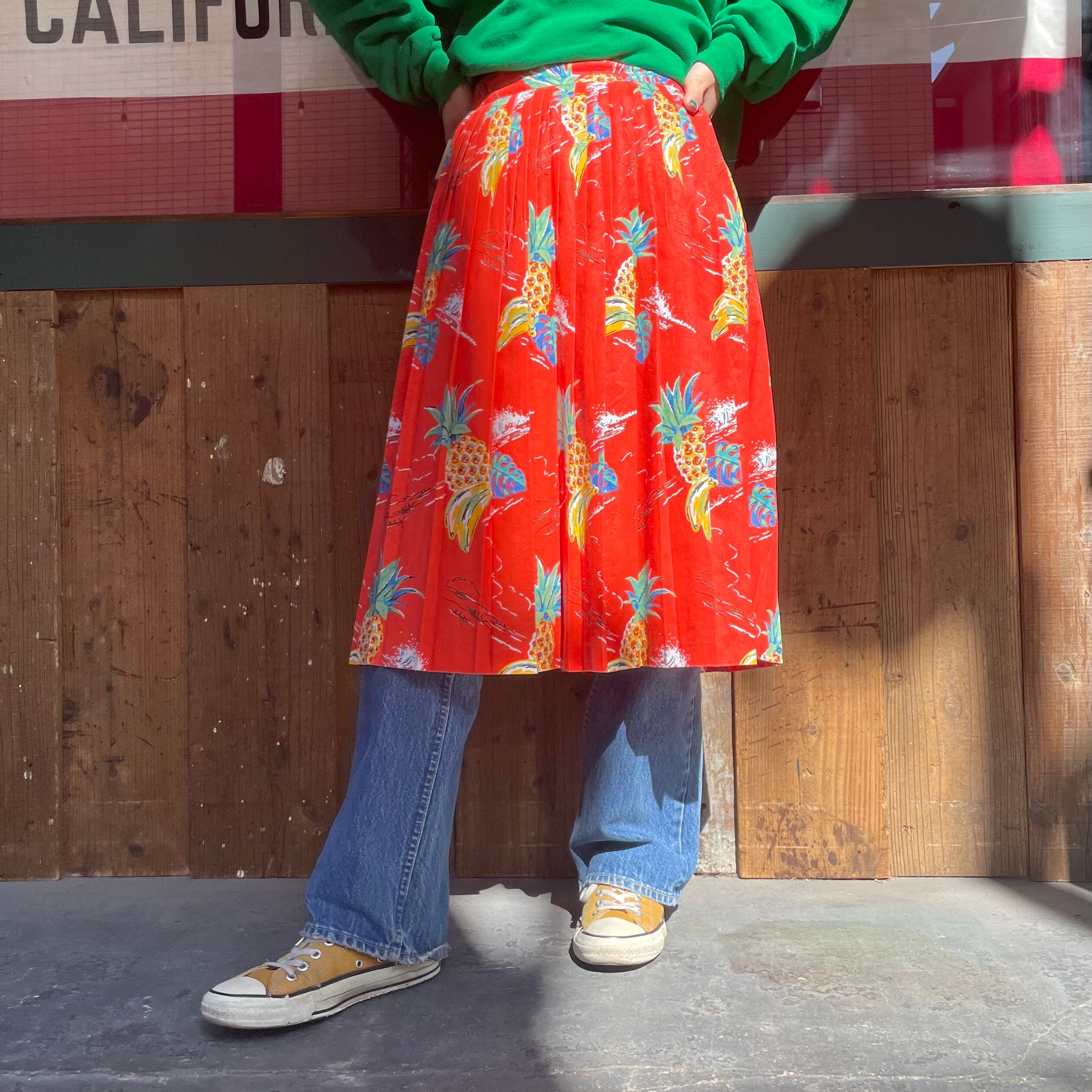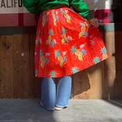 きれいなオレンジベースにパイナップル、バナナ、モンステラの南国感のある模様がとてもかわいいスカートです。