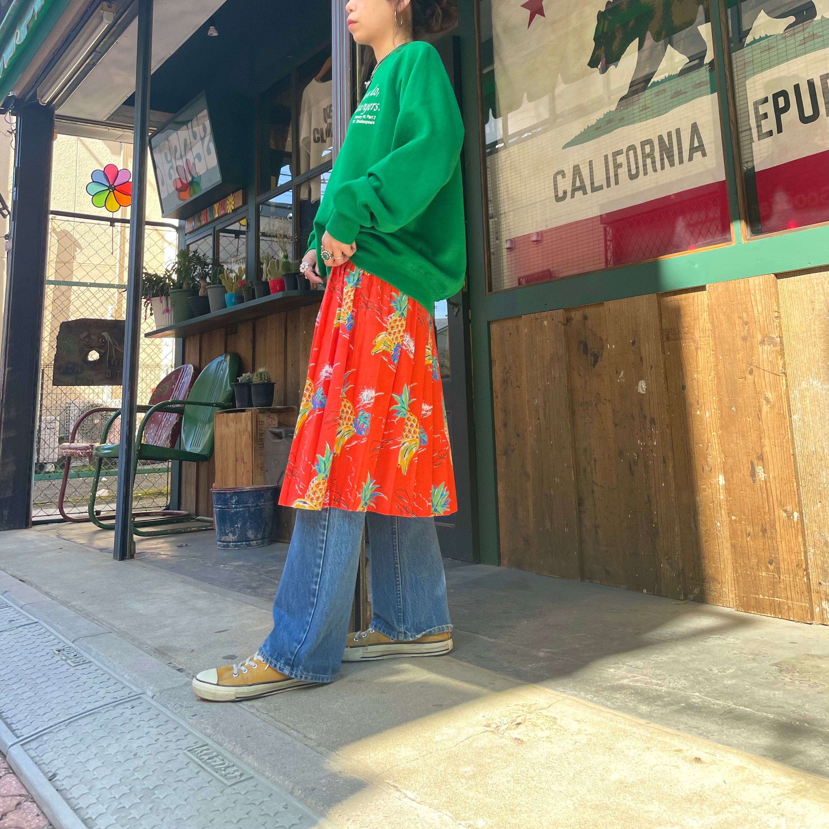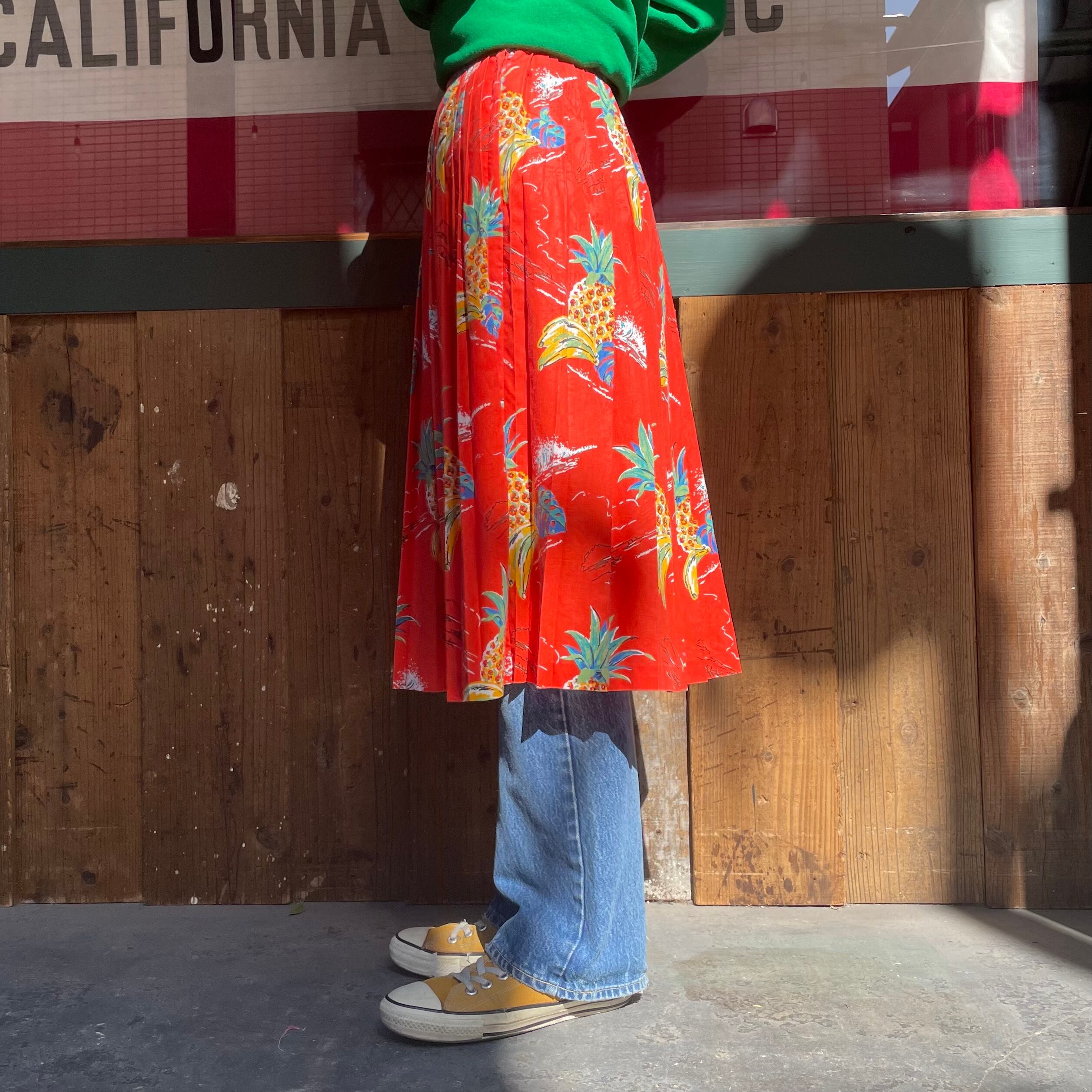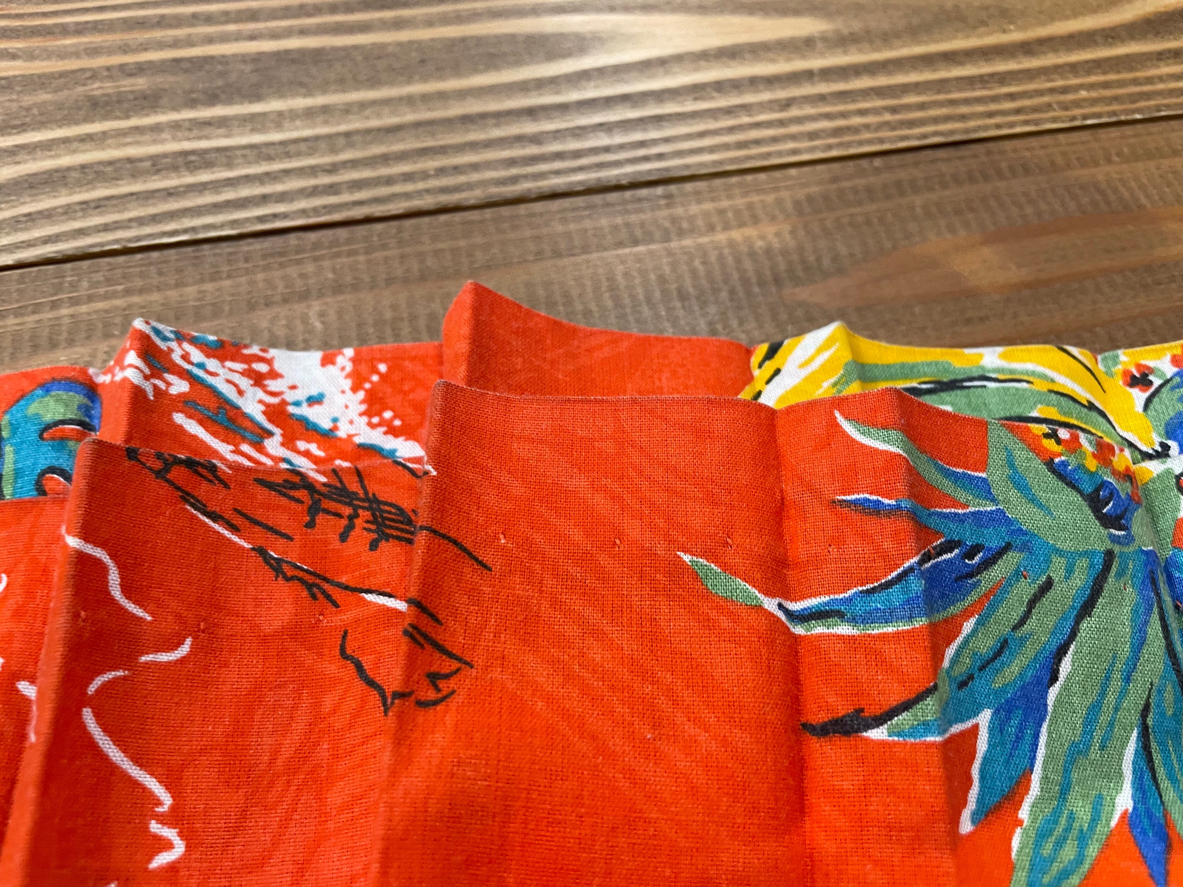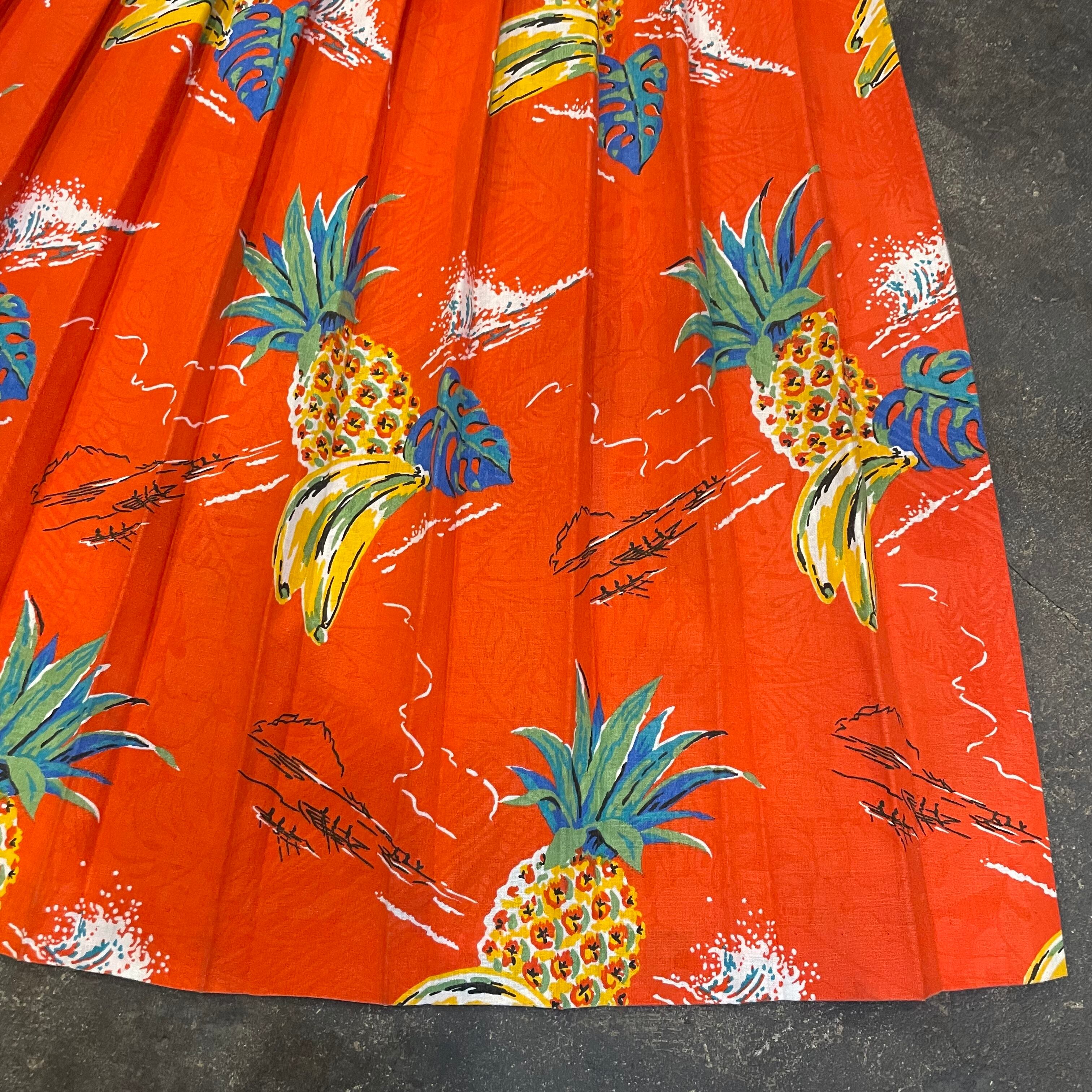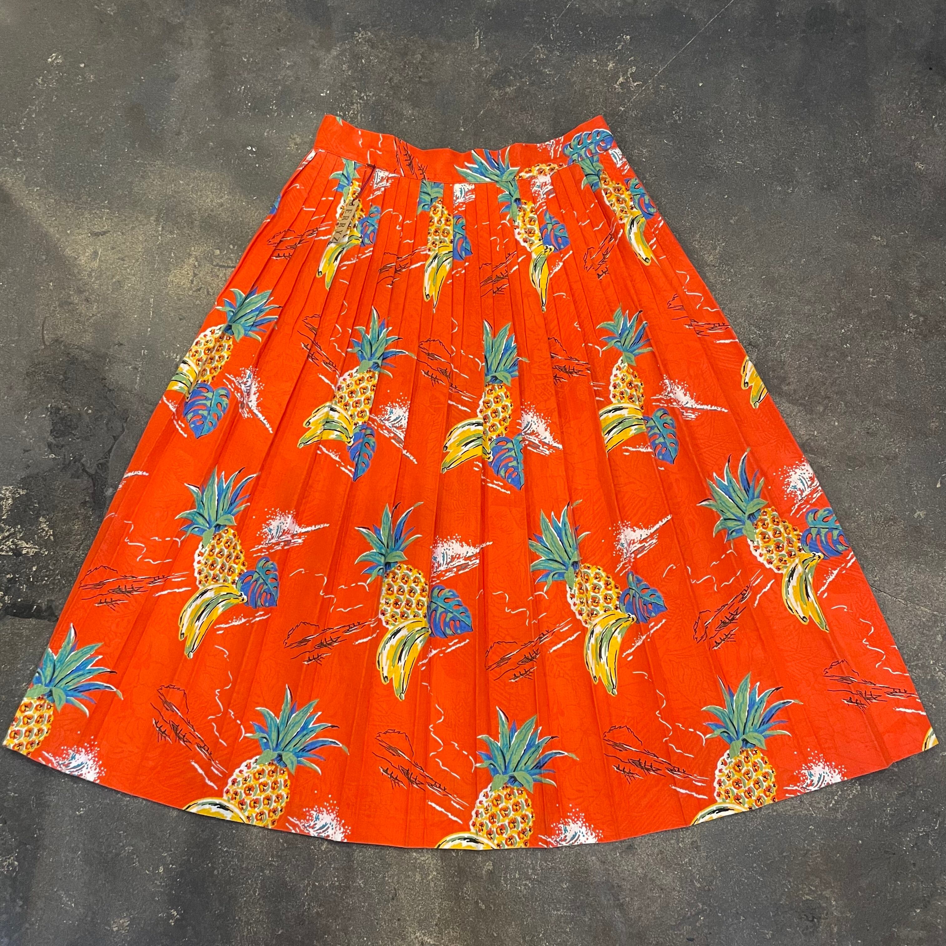 きれいなオレンジベースにパイナップル、バナナ、モンステラの南国感のある模様がとてもかわいいスカートです。