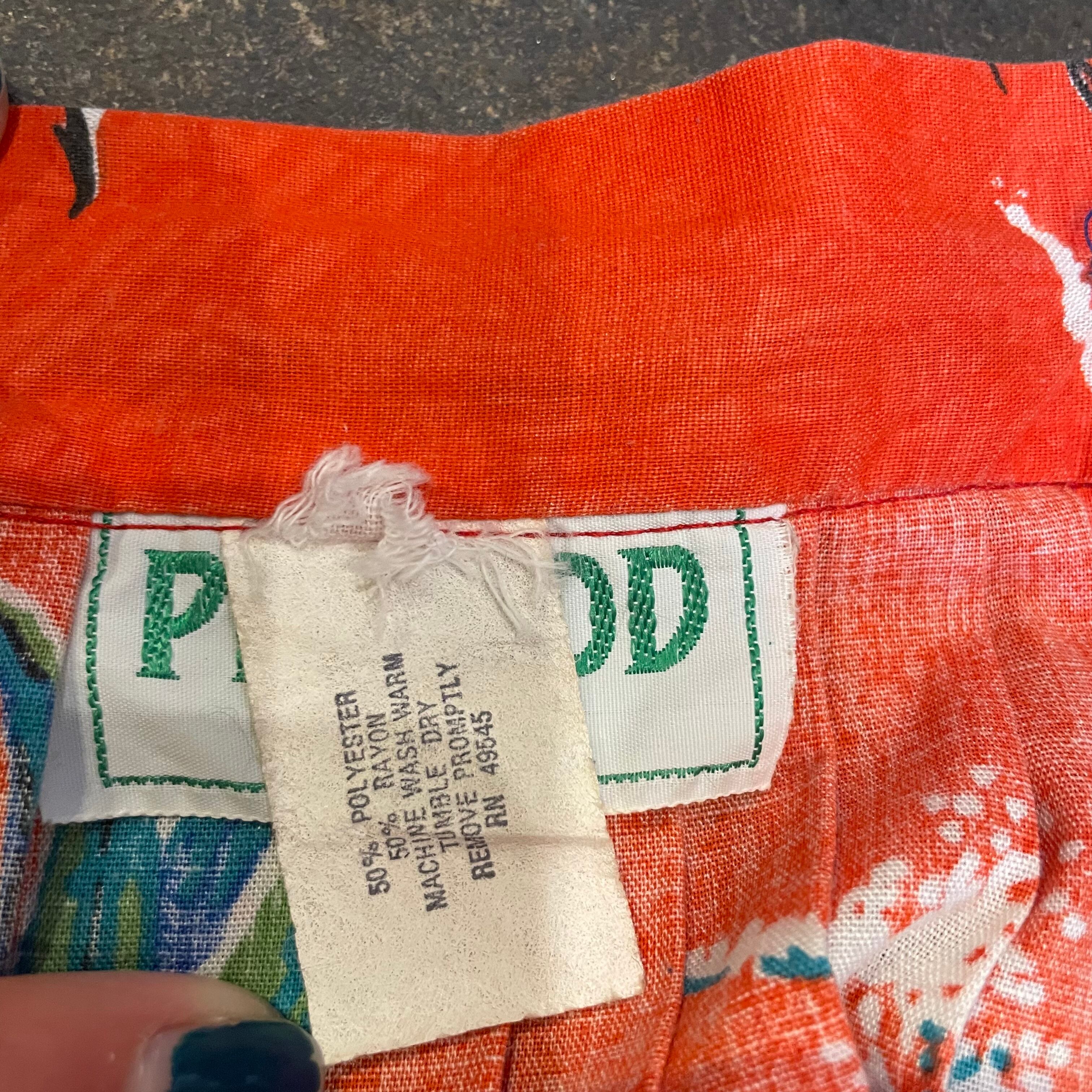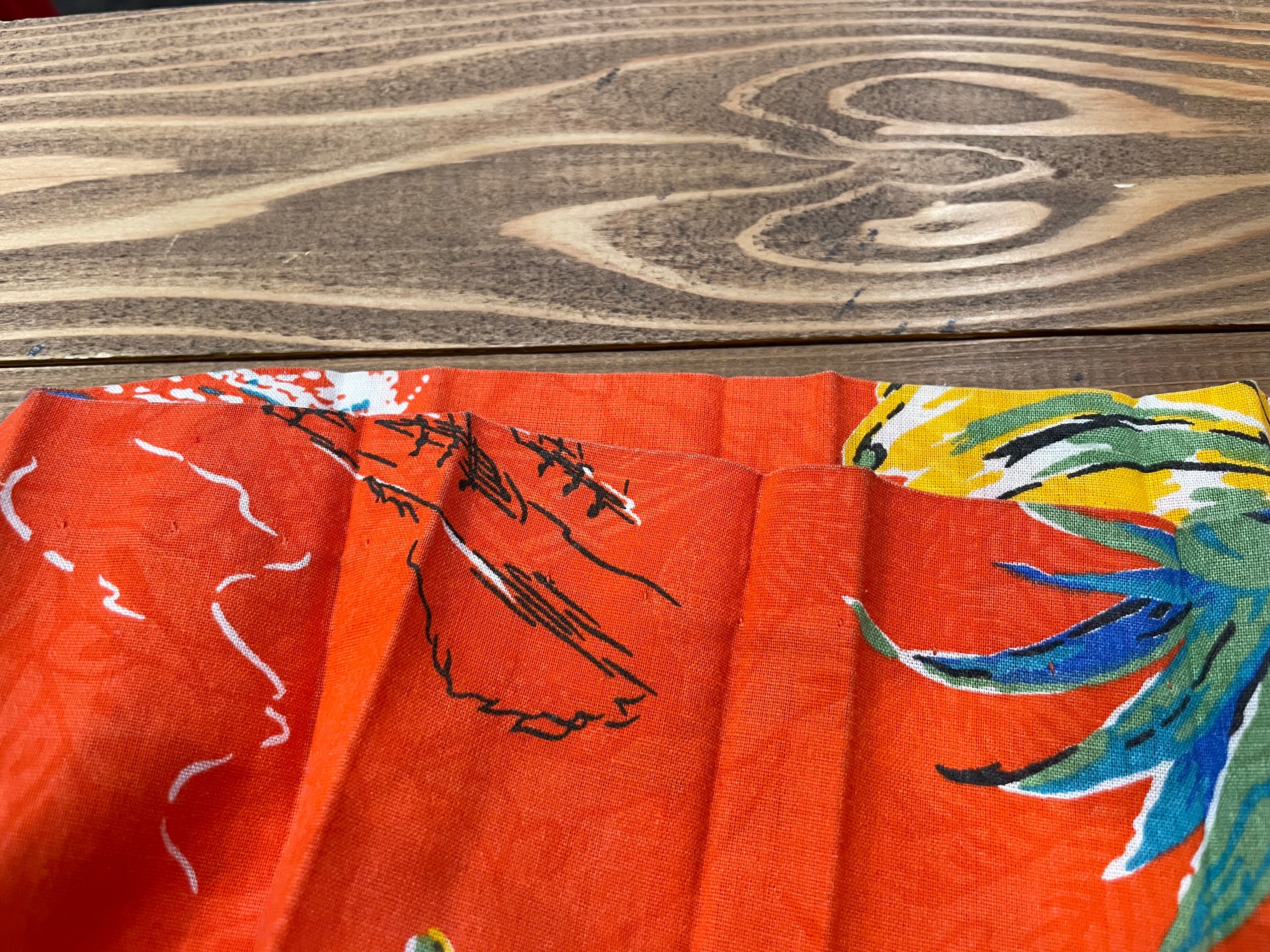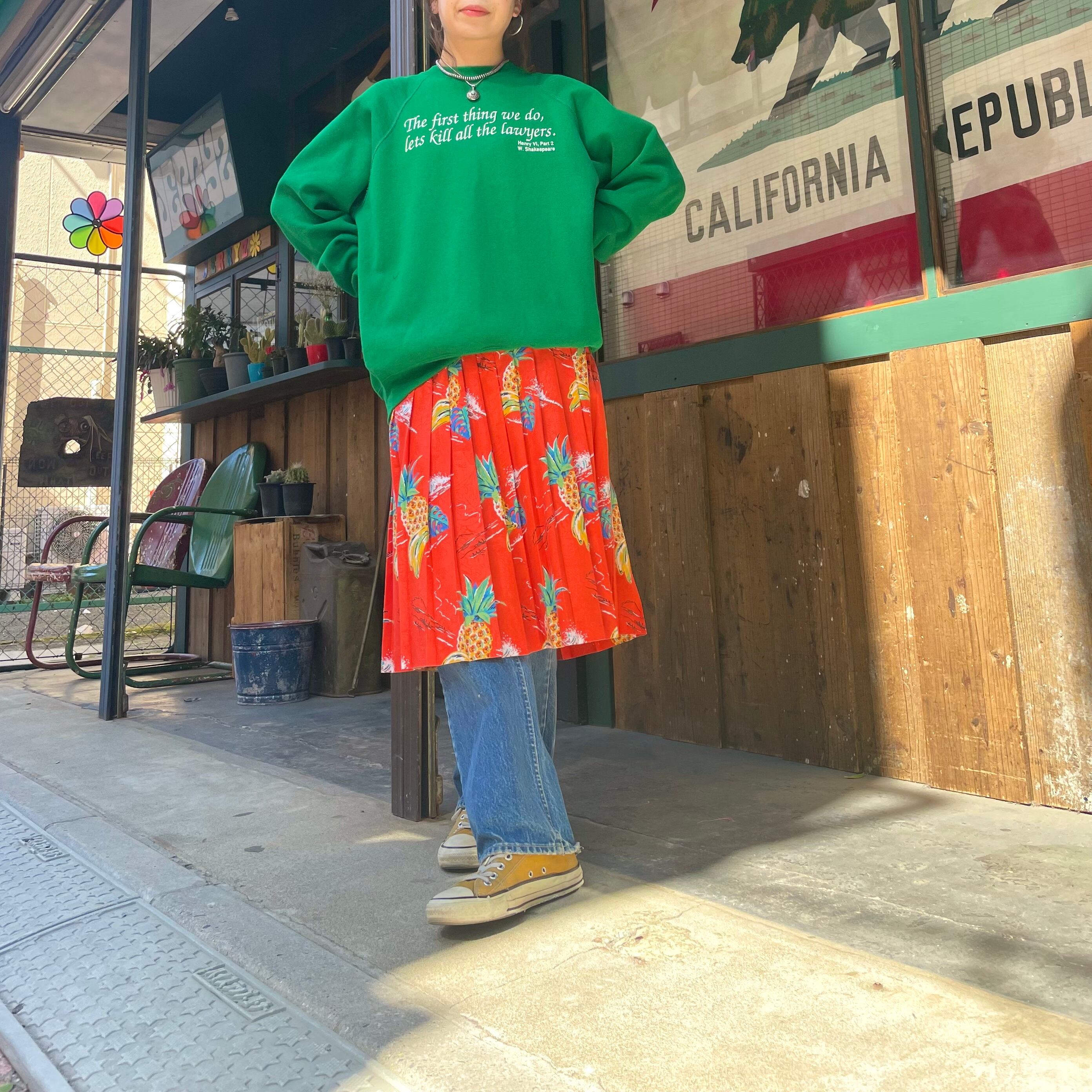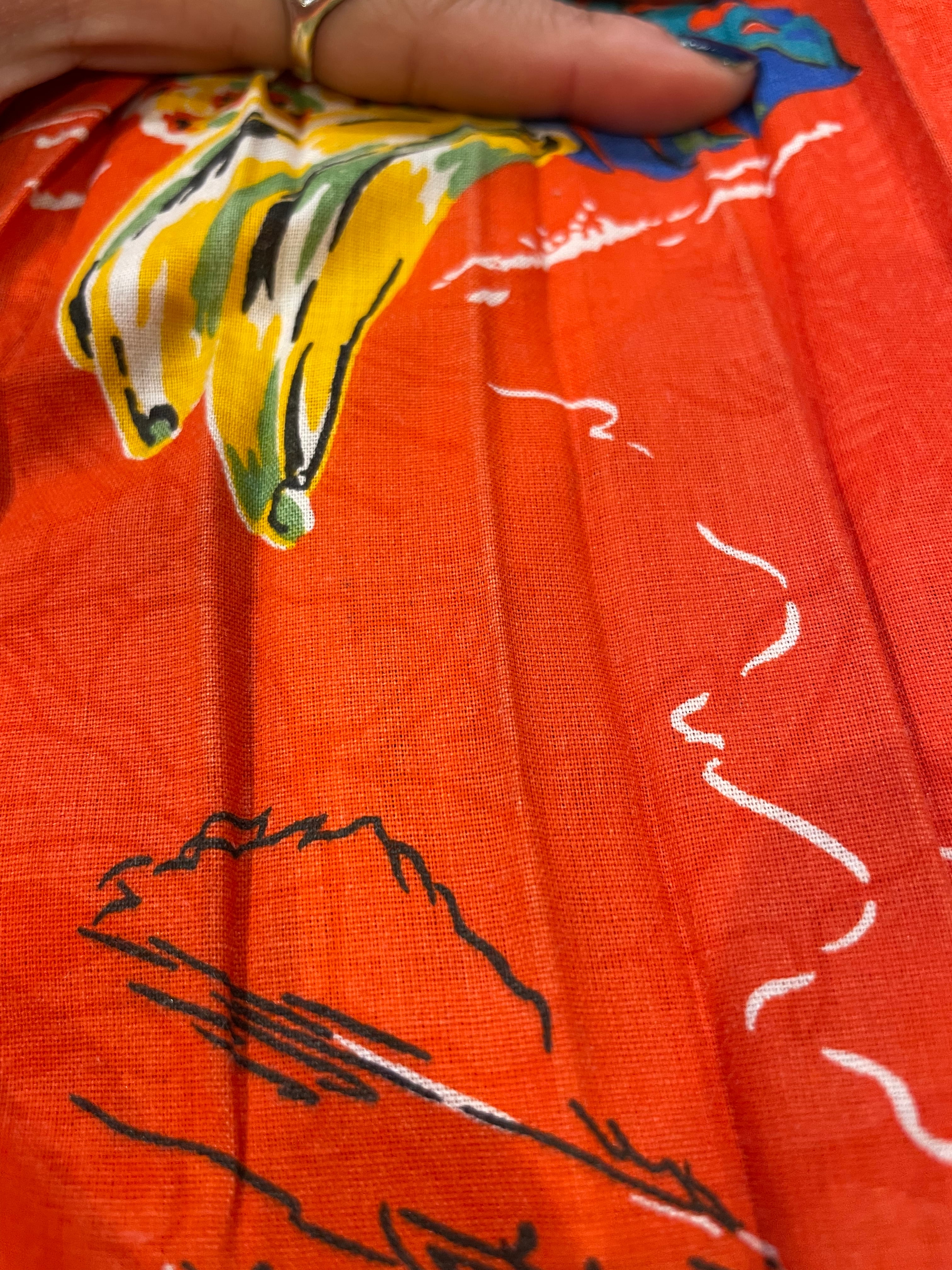 きれいなオレンジベースにパイナップル、バナナ、モンステラの南国感のある模様がとてもかわいいスカートです。
