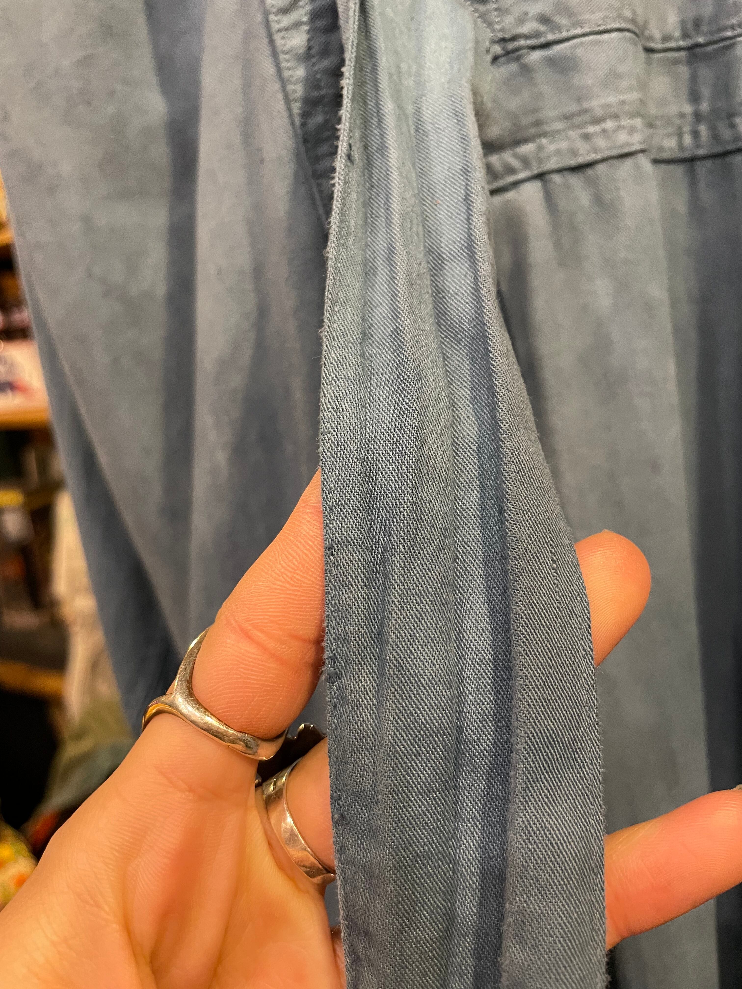 肌触りもとても気持ち良く、落ち着いた青が大人っぽい一枚です。本来はリボン結びの方が背中ですがガウンのように羽織ってもかわいいですし、ロングワンピースの上にエプロンのように重ねてもかわいいと思います。