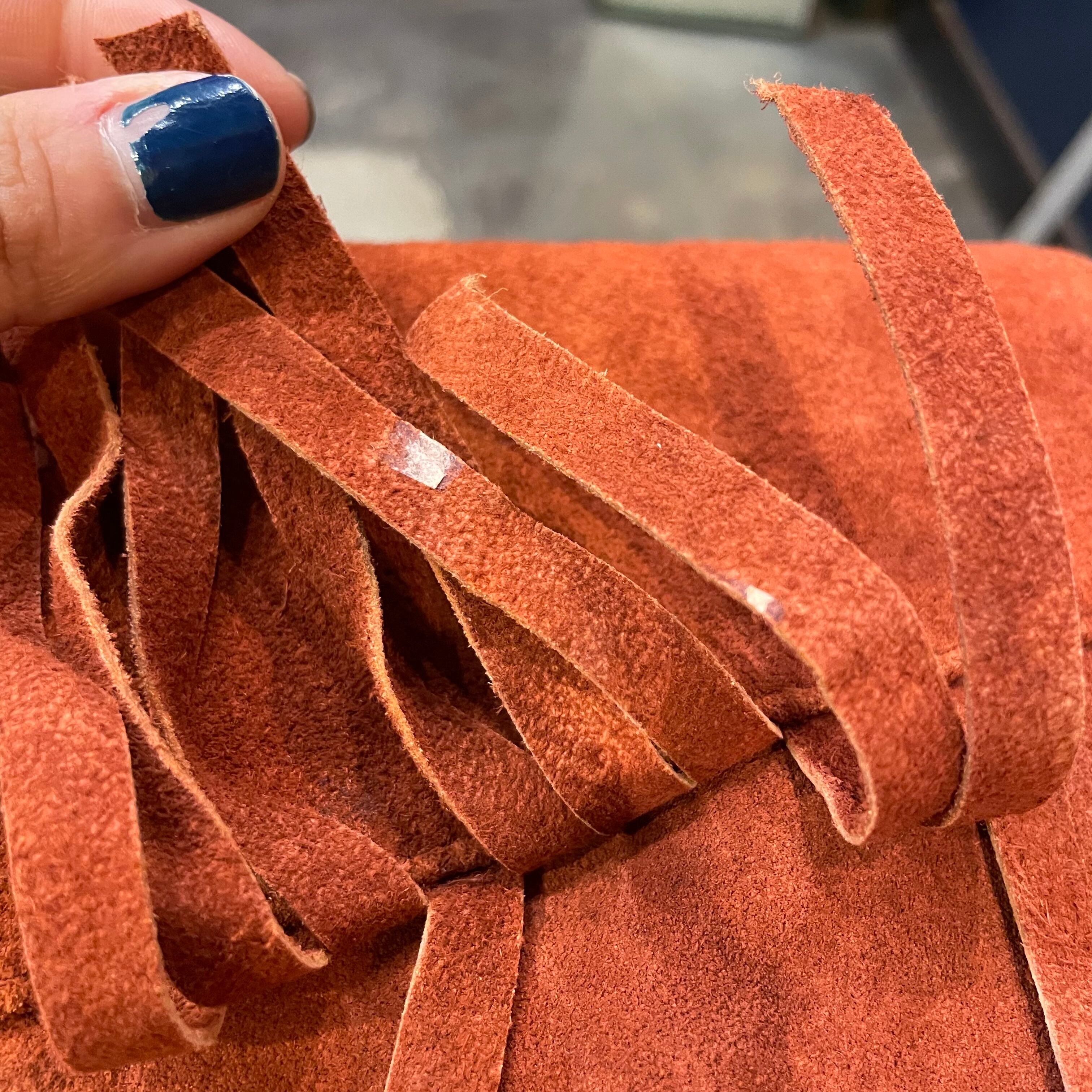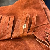 背中のフリンジの欠損部分、シミやキズ、フリンジの裏にシールの貼ってある箇所や剥がれた箇所等ございます。