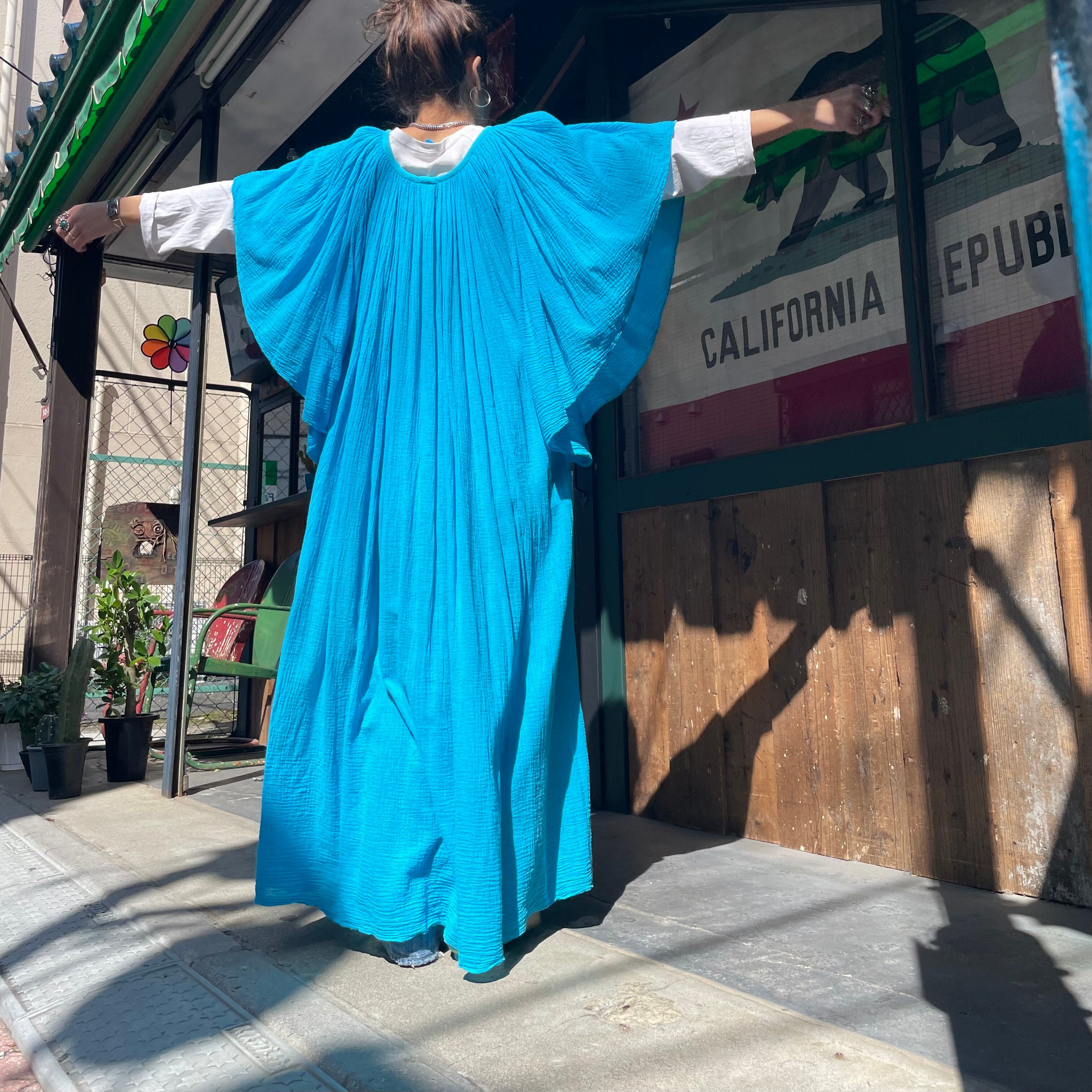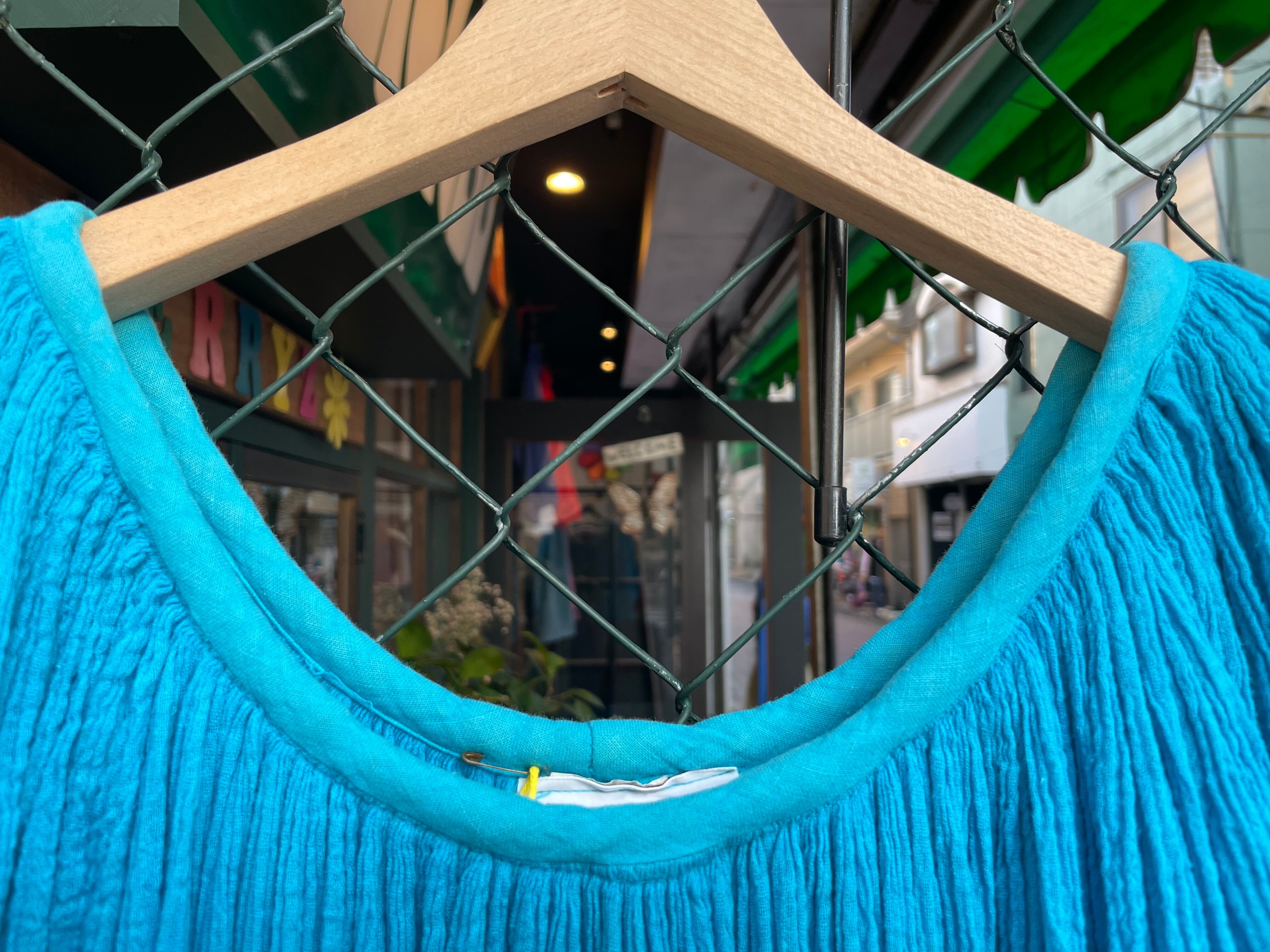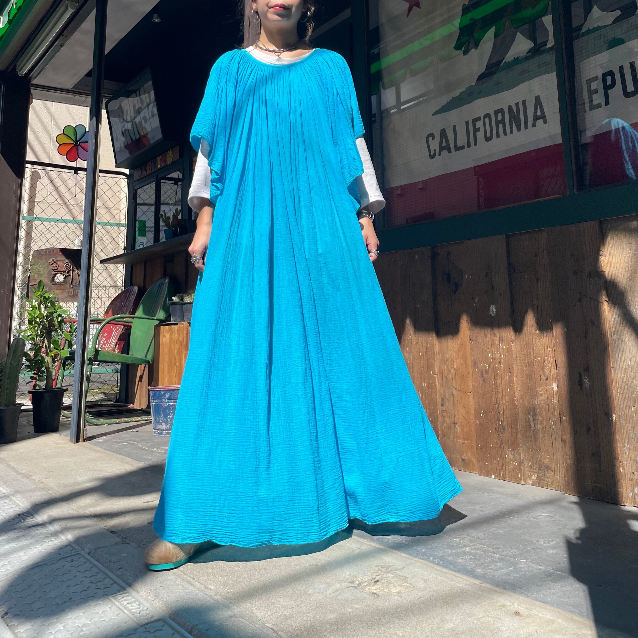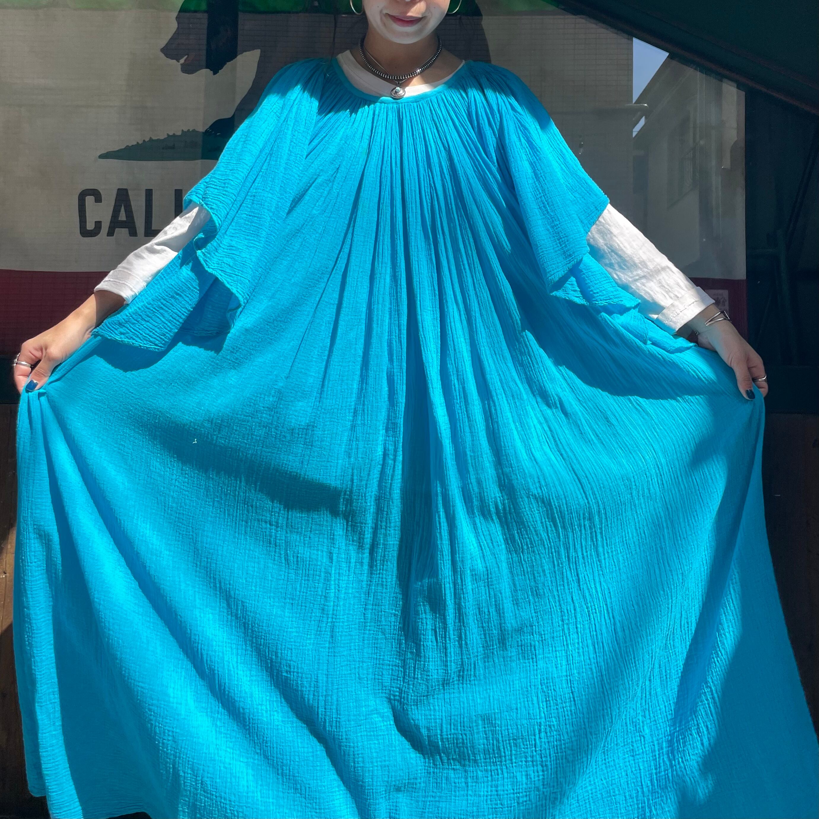 綺麗な水色のコットンガーゼのようなふわっと軽くてボリューミーなシルエットが素敵なワンピースです。
