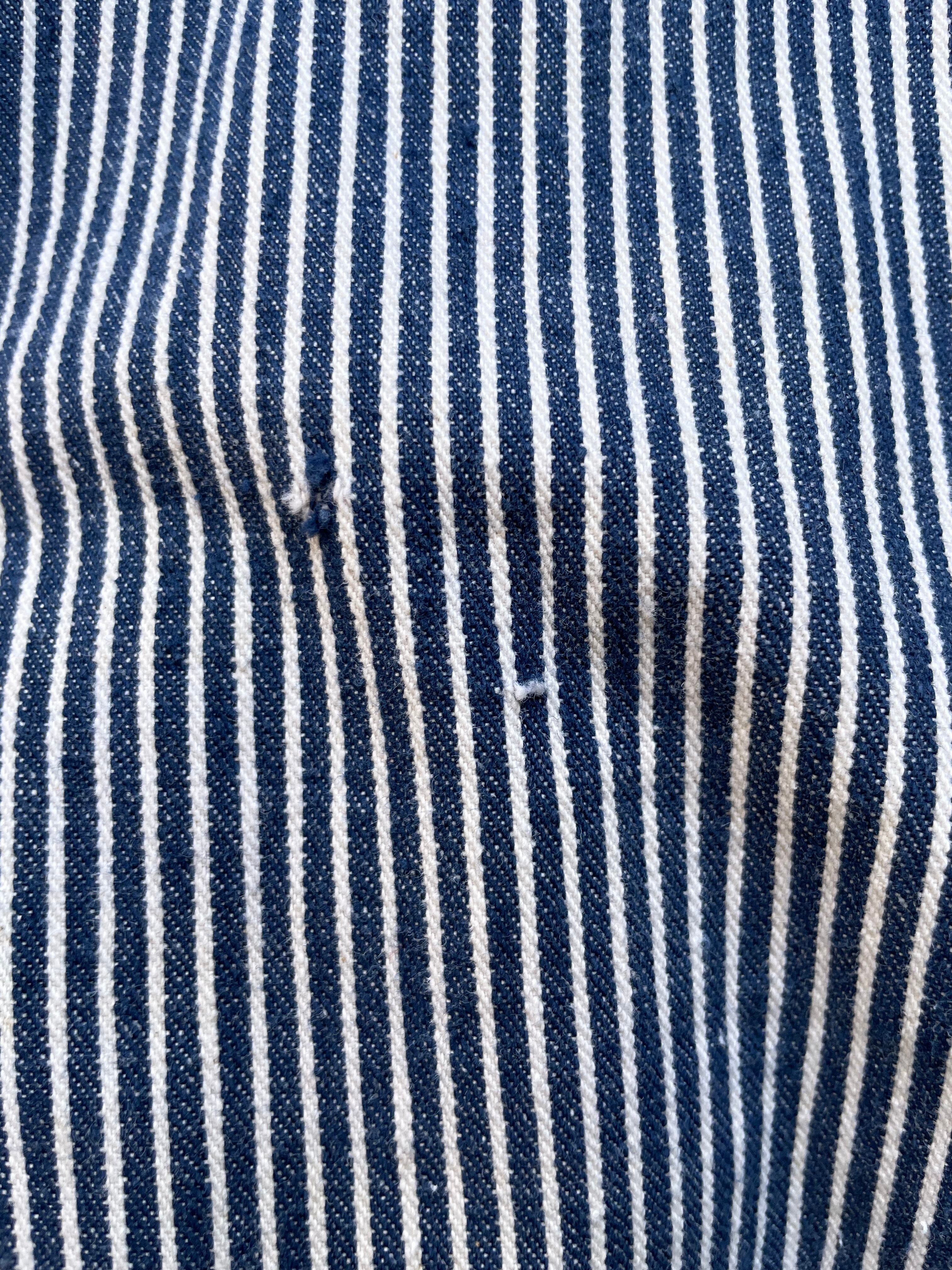 ヒッコリーが爽やかで、これからの時期ちょうど良いですし定番ではありますが、一枚あると一年中着られて使えるアイテムです。